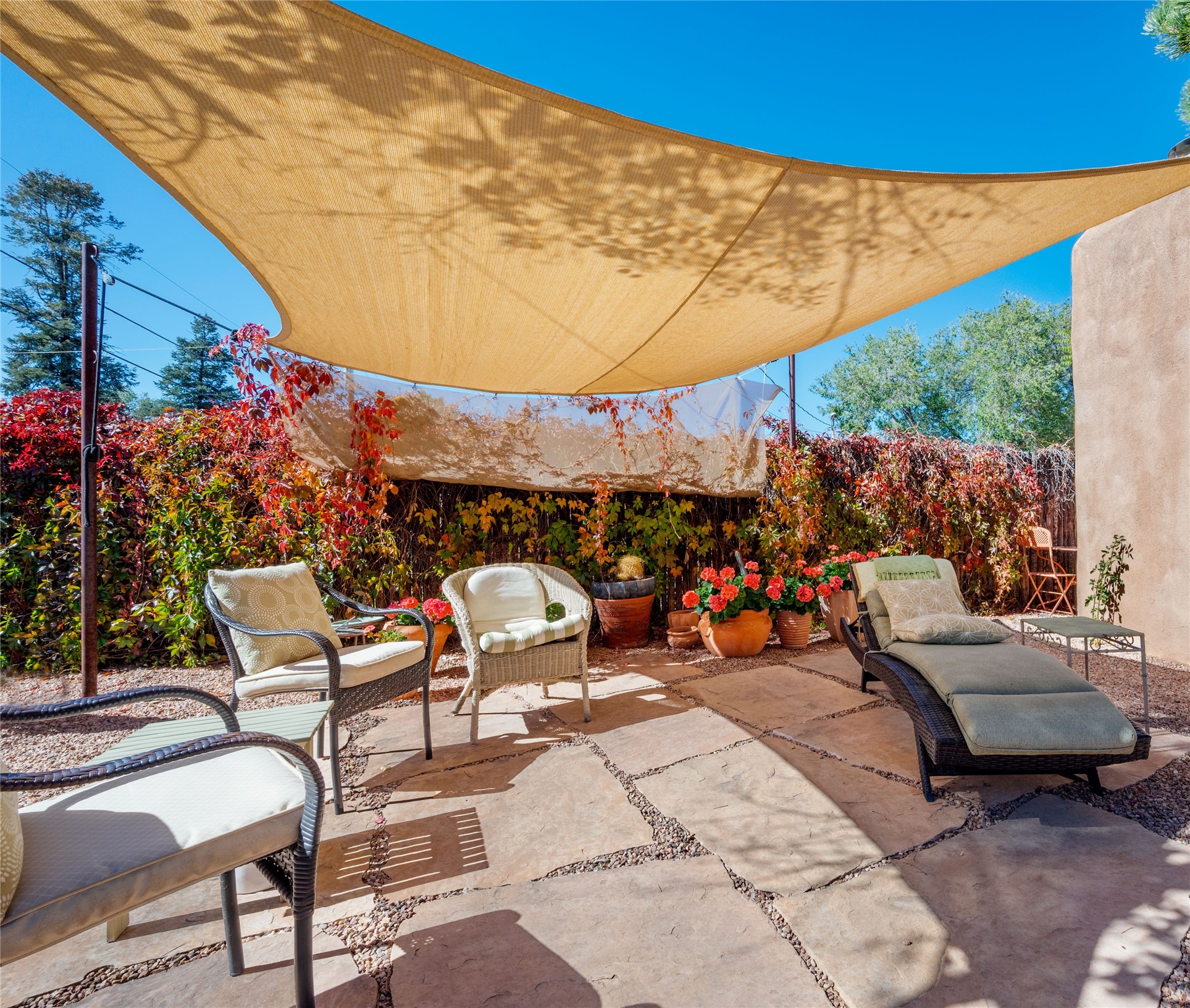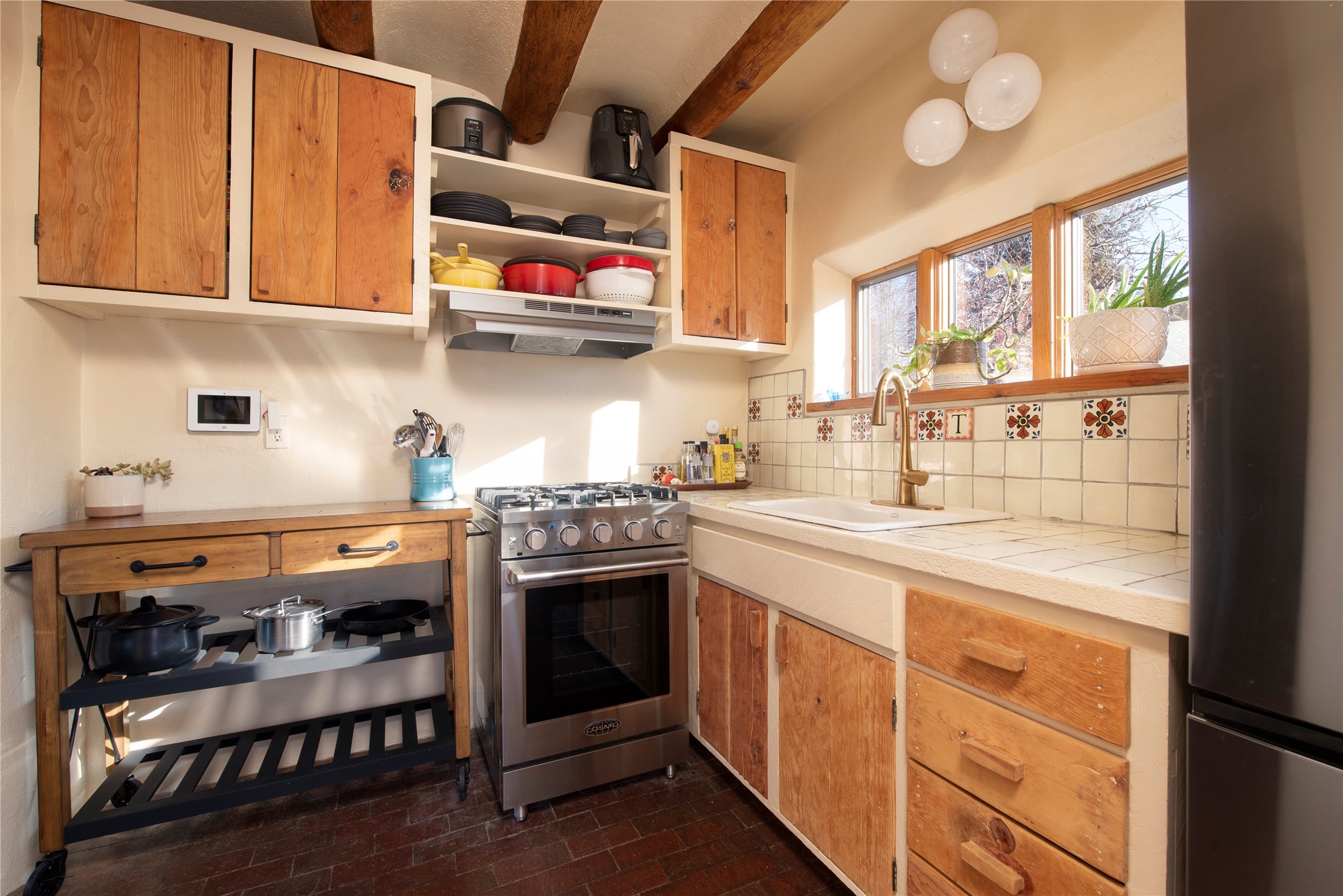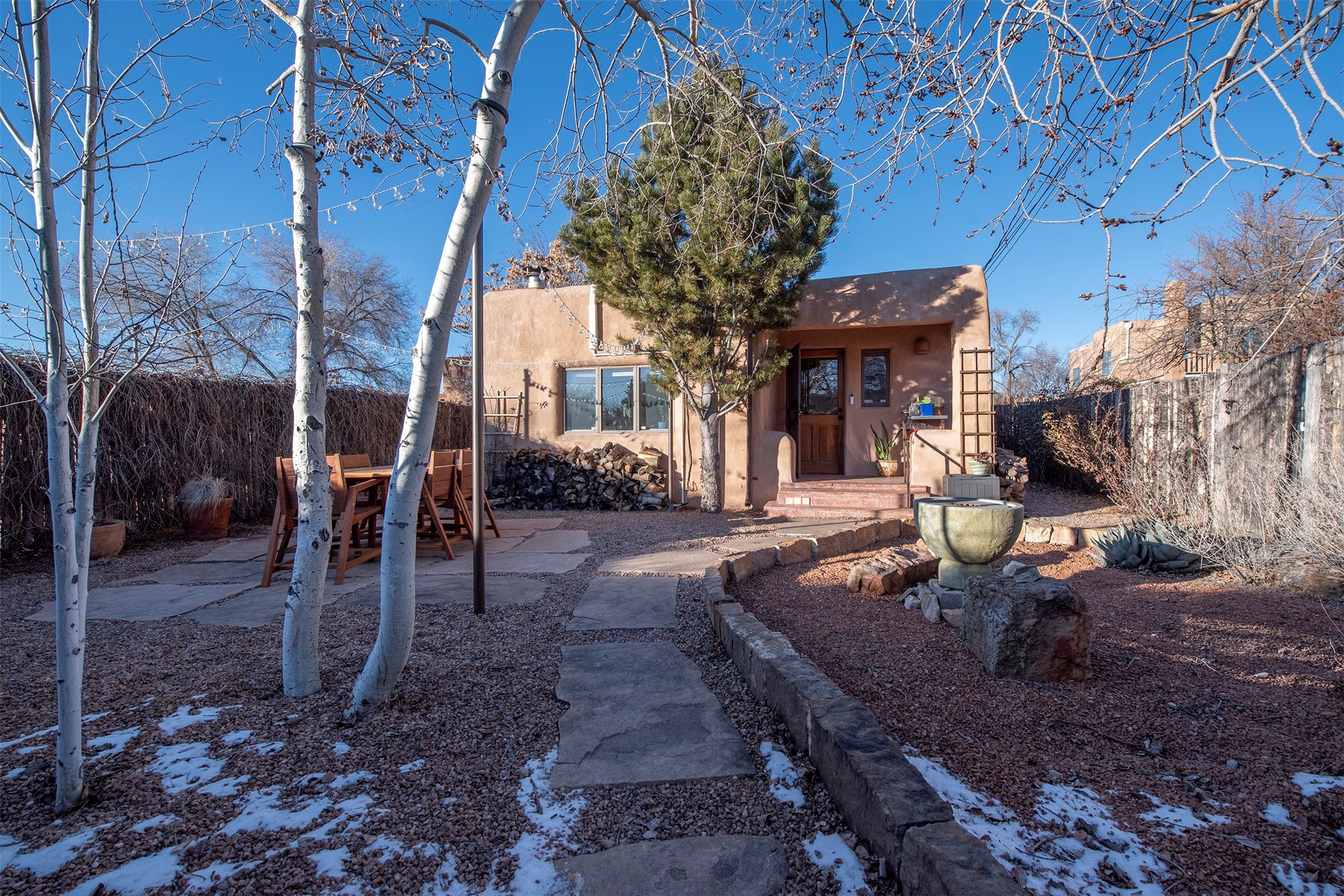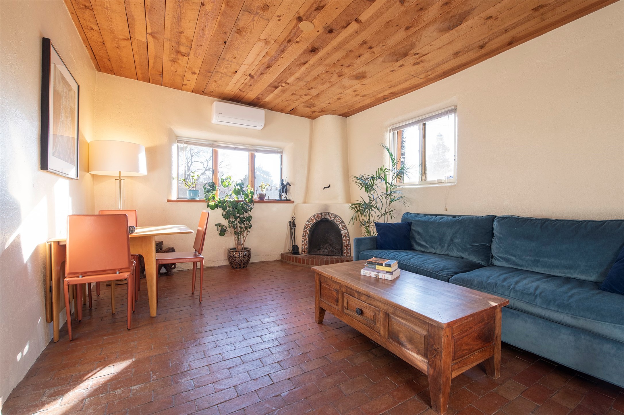 Discover your own private sanctuary in the heart of the Westside Guadalupe Historic District. Tucked behind 6-foot, Virginia creeper-covered coyote fencing, this Pueblo-style condo is a rare historic gem. Step through the stone-walled entrance into a serene garden paradise filled with Aspens, Roses, and Russian Sage, perfectly set for alfresco dining. Inside, the home radiates Southwest warmth with authentic brick floors, rough-cut pine ceilings, and traditional vigas. The light-filled living area features a classic Kiva fireplace accented with Mexican tile and a bright skylight. A thoughtful floor plan includes a cozy bedroom with a wall-to-wall closet and a versatile den/workspace set within thick, traditional adobe walls. With modern upgrades, including new appliances that are all less than a year old. The location is spectacular, just a short stroll to the Santa Fe Plaza, galleries, dining, and the Railyard. This is the ultimate cozy home or perfect little "lock-and-leave" retreat.......Low COA fees were $175 last year......*New Appliances Include LG washer/dryer, Rheem tankless water heater, GE fridge, Cosmo gas range with oven, Broan kitchen hood, Moen garbage disposal, CuZn under sink water filter, Kohler kitchen faucet, Toshiba microwave, Carrier performance series mini-split AC and heating system, Pottery Barn light fixtures in bedroom and the den. Please take our virtual tour.