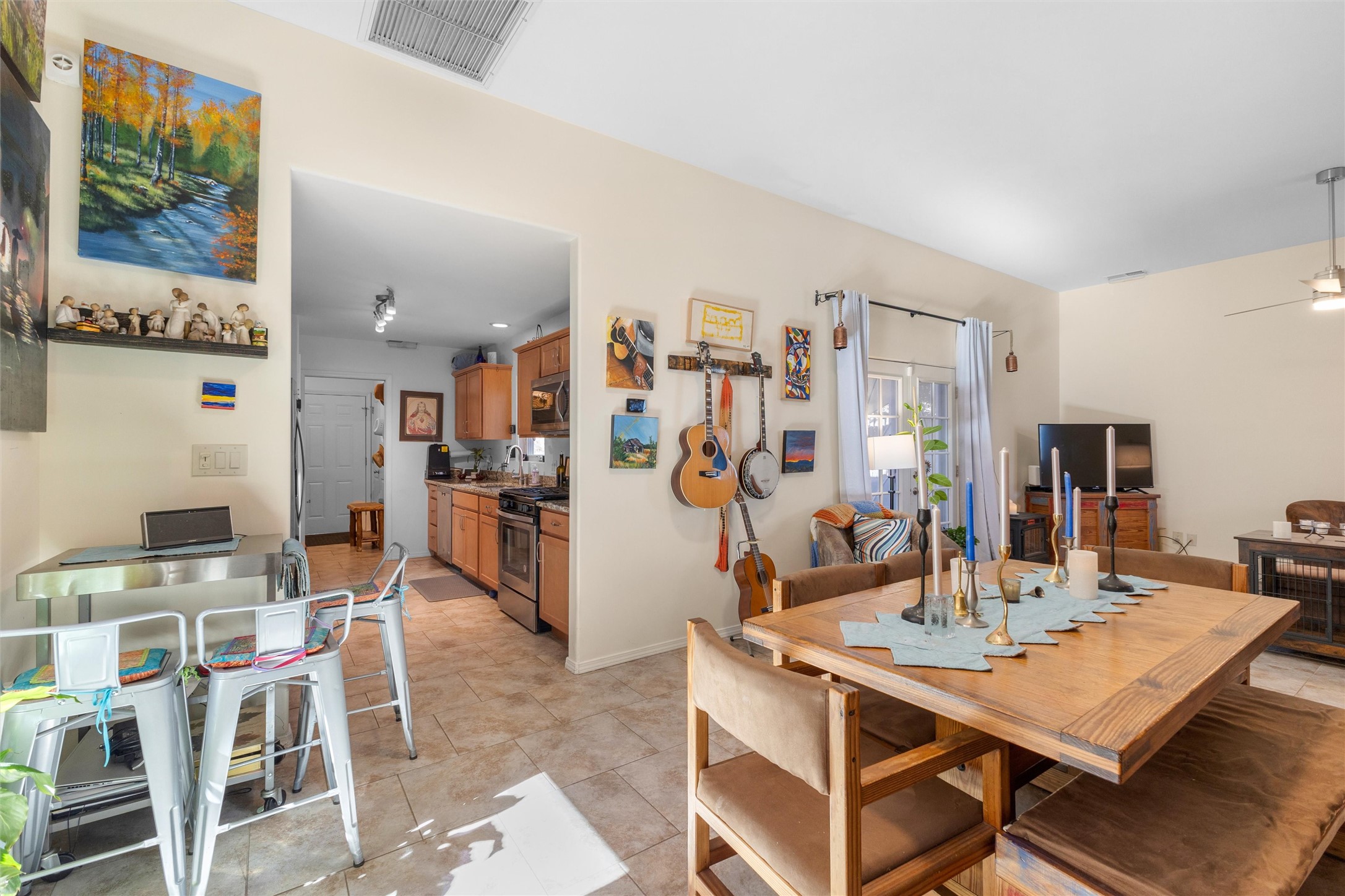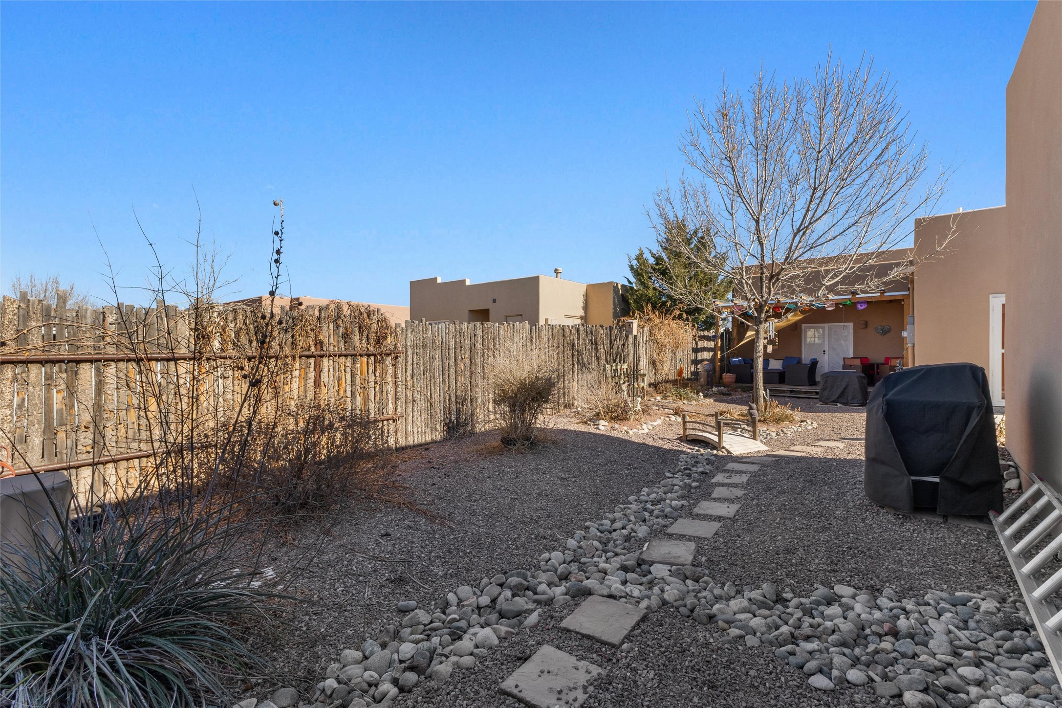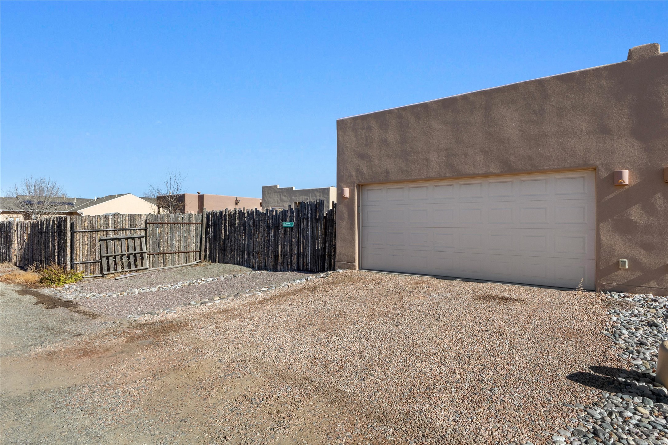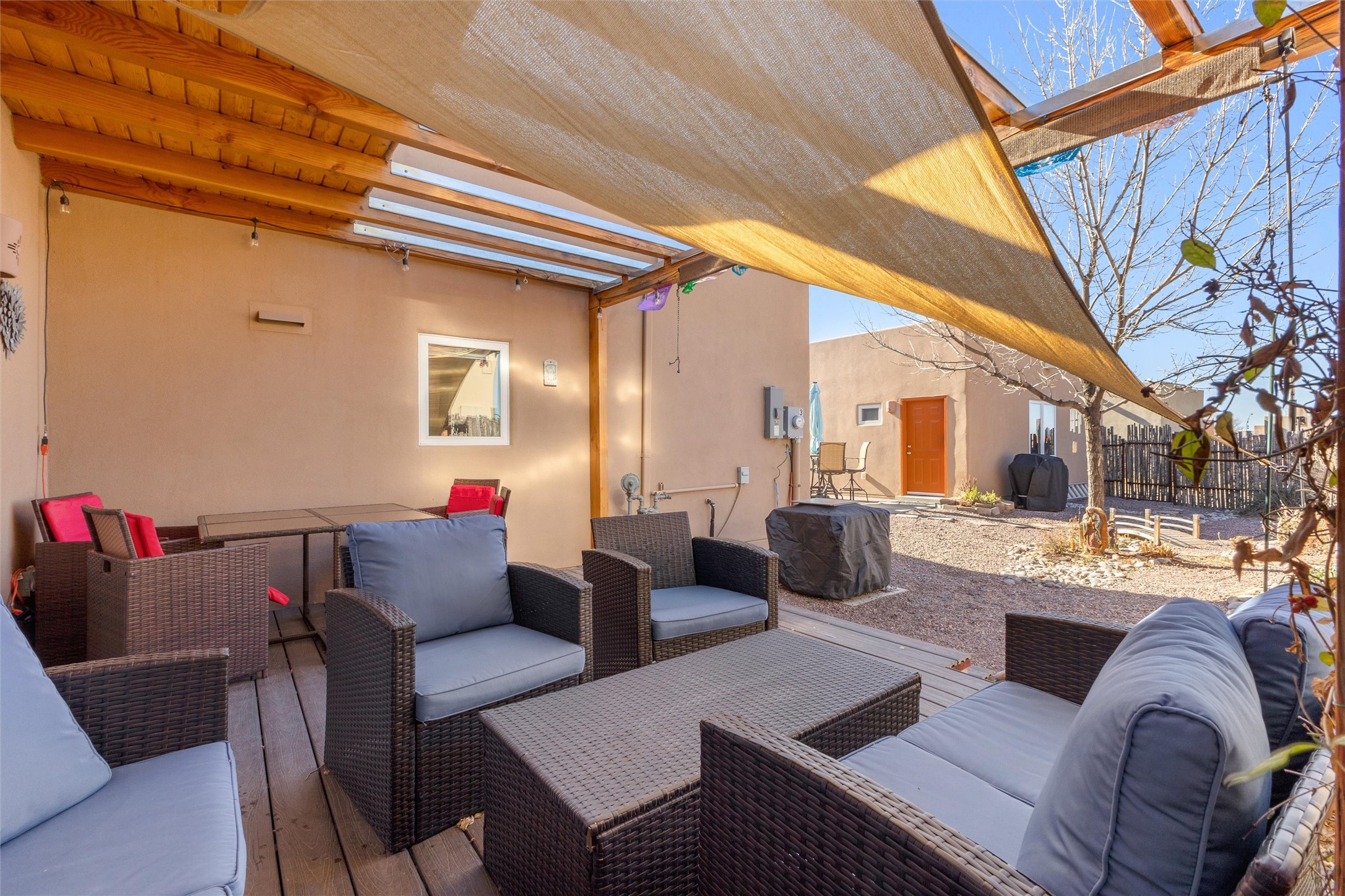 WAKE UP TO SWEEPING MOUNTAIN VIEWS FRONT AND BACK AND END EACH DAY WITH A GOLDEN SANTA FE SUNSET FROM YOUR PORTAL. This 3 bedroom, 2 bath Oshara Village townhouse pairs quality construction with Anderson windows and a TANKLESS water heater plus a modern design with a smart layout that separates the peaceful primary suite from the other bedrooms. Tile floors ground the living spaces, bedrooms are softly carpeted, and a galley kitchen with adjacent dining makes everyday living effortless. A beautiful sitting area overlooks a courtyard, while the xeriscaped backyard and lovely porch invite quiet mornings and serene evenings. Enjoy a walk in closet, double sinks, tiled shower, detached 2-car garage, AND hookup to graywater to water plants! Near Oshara Village Park and minutes to the Plaza via Richards or Rabbit, with favorites like Pantry Dos nearby! This is it! Call today!