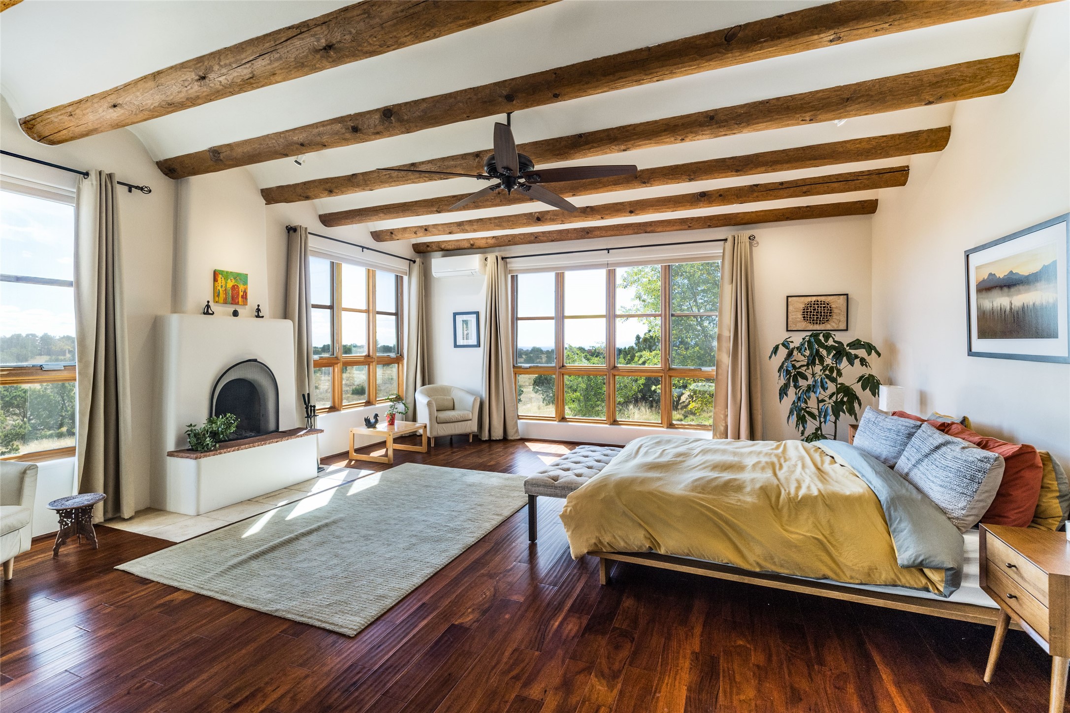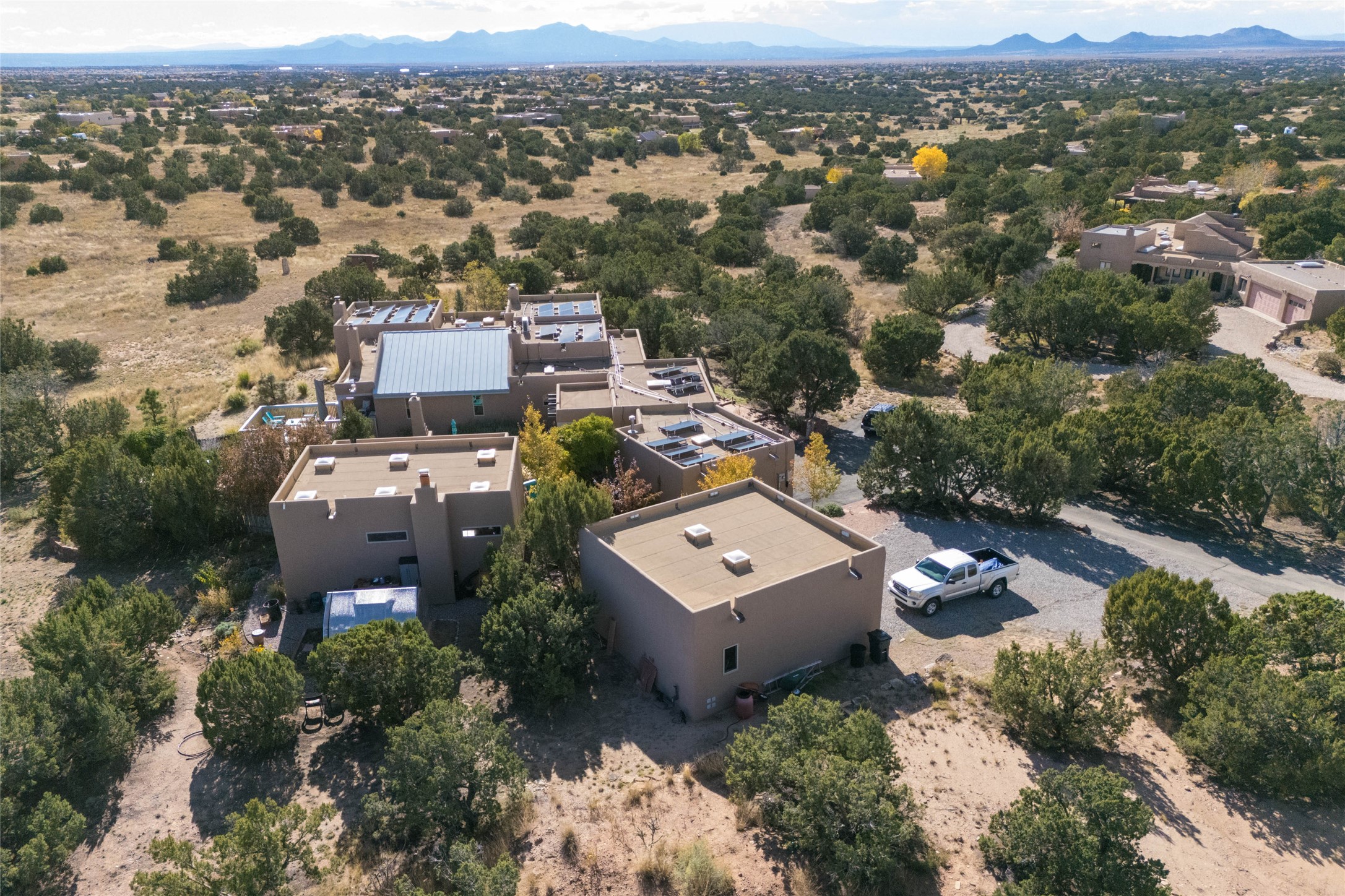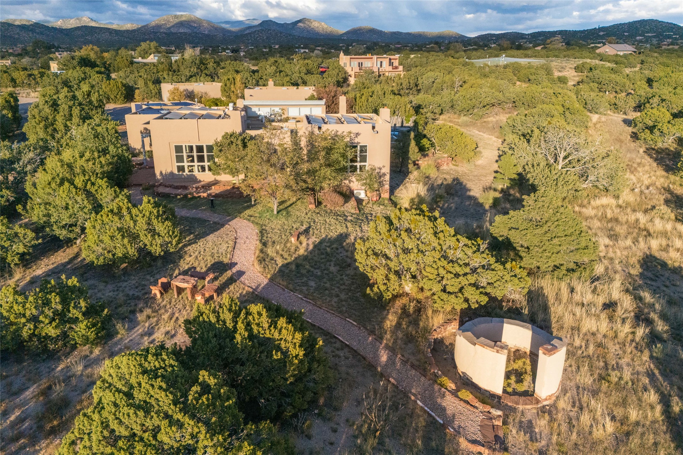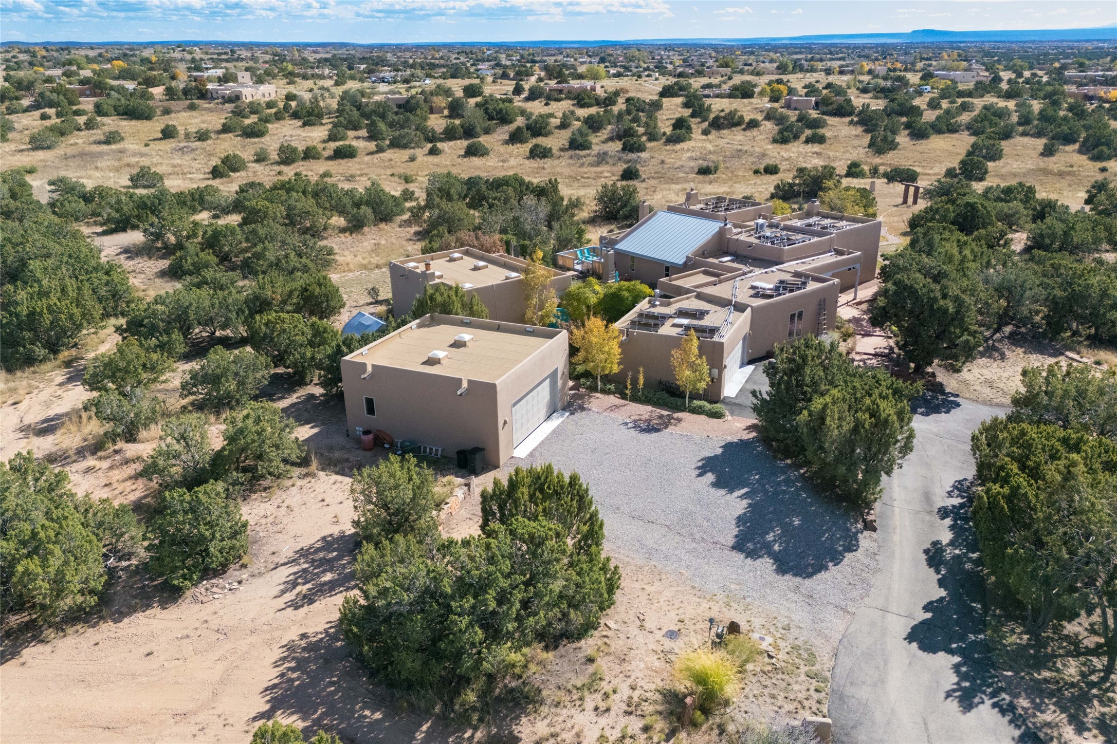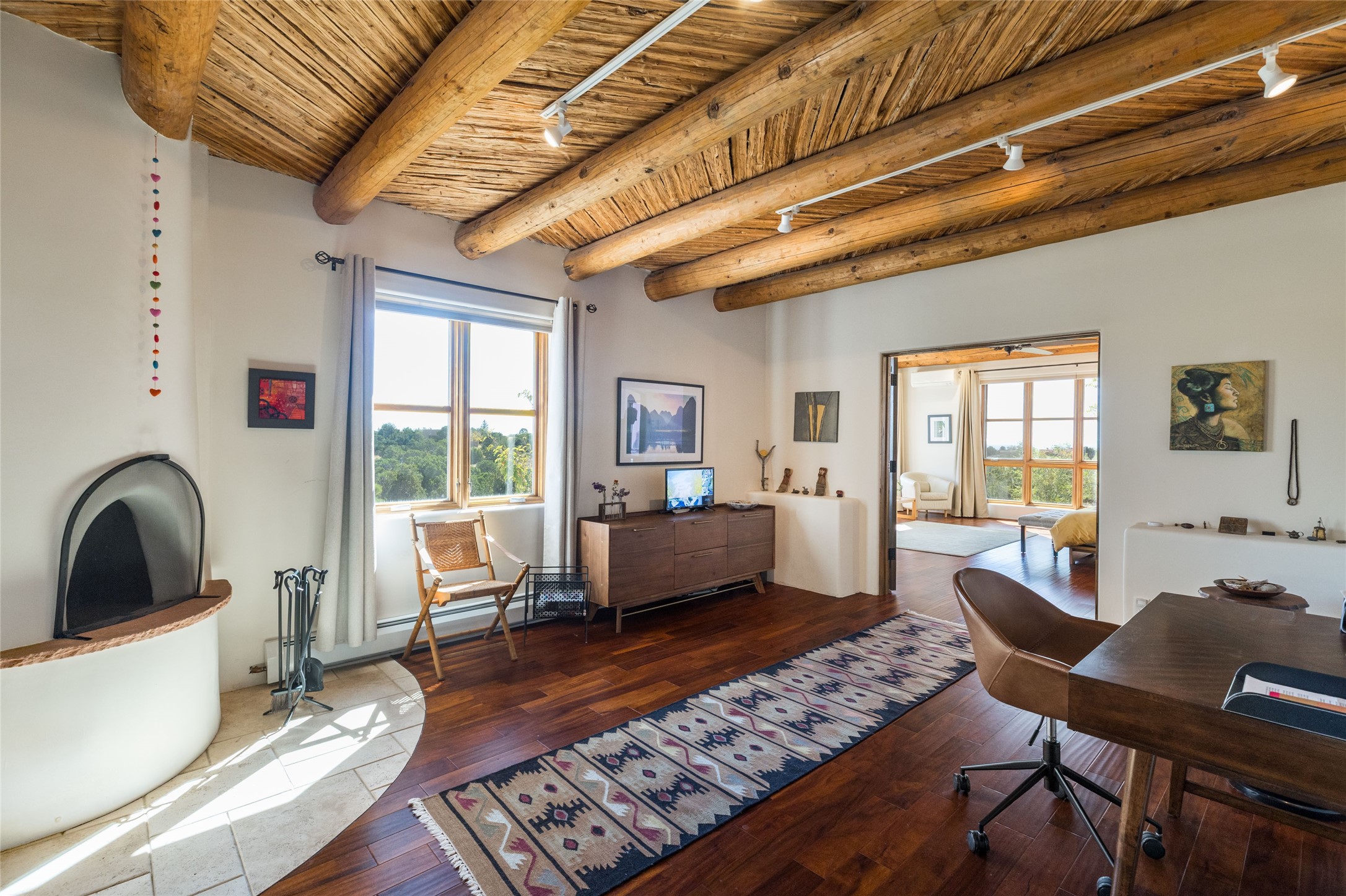 This beautiful estate has 3 bedrooms, 2 baths, dedicated office space, views from nearly every room, with two oversized two-car garages (one detached perfect for a workshop), plus a standalone 600 sf studio/casita with an extra 1 bedroom, 1 bath (previously used as an art studio). True chef's kitchen with Wolf appliances and sub-zero refrigerator, double ovens, granite counters, large island with bar seating.Just off the kitchen is a large bonus room with beautiful built-ins, currently used as a formal dining area. The private suite is entered through a sitting room/office with viga ceilings, kiva fireplace and door to viewing deck. Spa-like primary bath with extra large shower, separate jetted tub, double sinks, and walk in closet.There are a total of 6 fireplaces including one in the entry hall which could also be a formal dining room.Light-filled living room featuring exposed vigas and corbels, kiva fireplace, custom wood built-in shelving and cabinetry, and expansive windows capturing beautiful views. Owned solar system helps reduce utility costs, allowing you to enjoy the space of this home without the typical energy expense. Other amenities include Radiant floor heating, new mini splits, and a greenhouse.