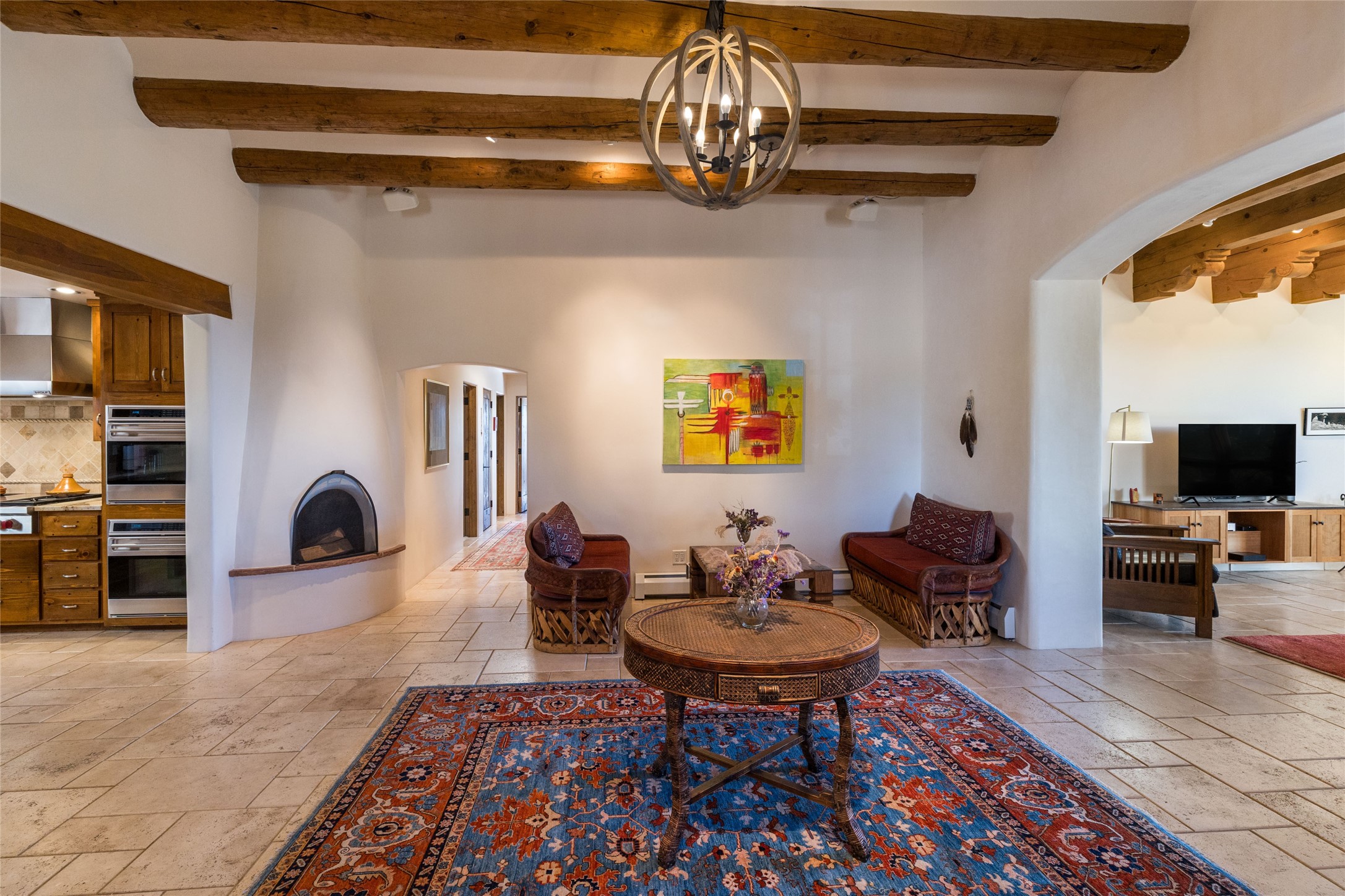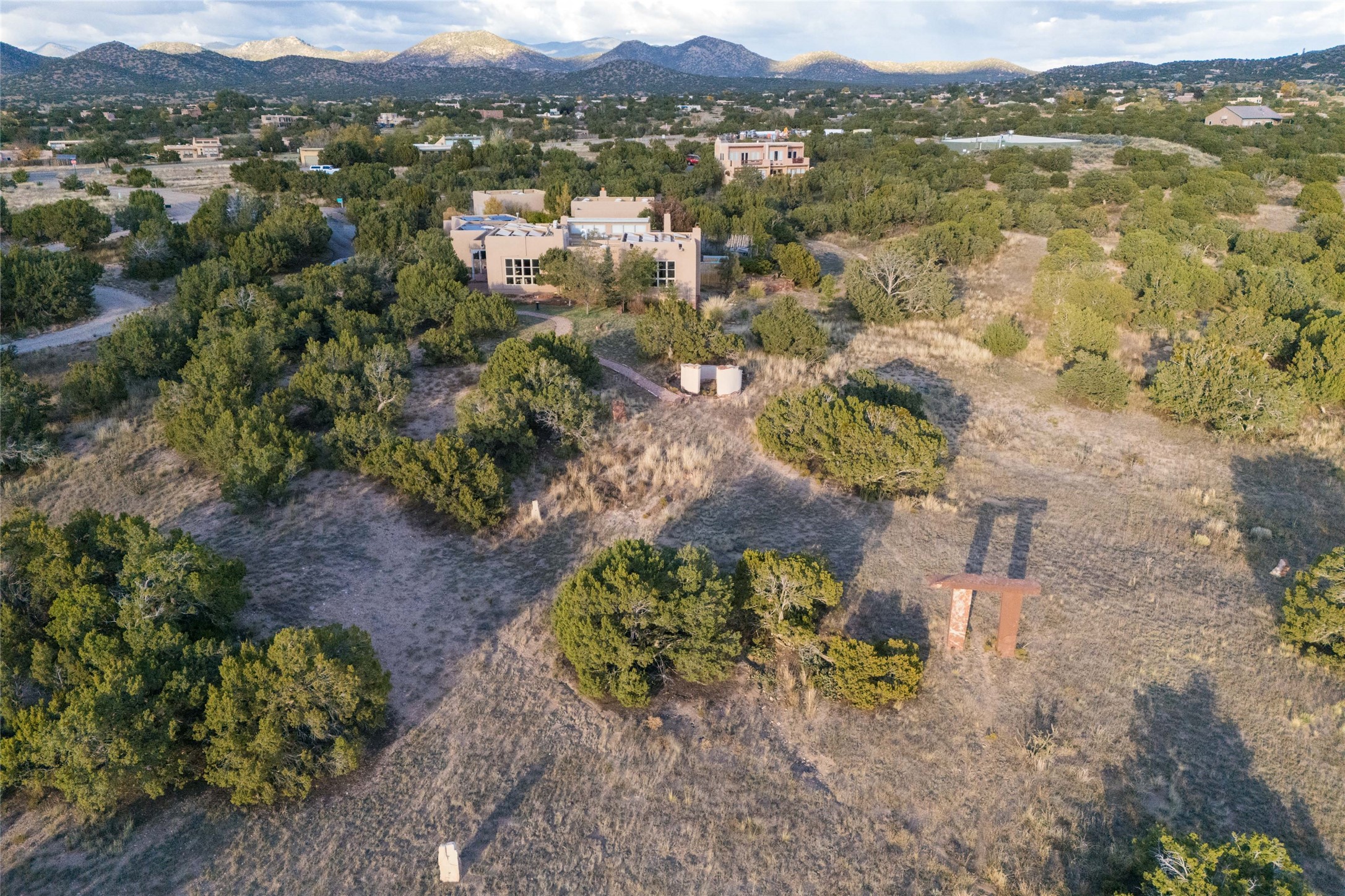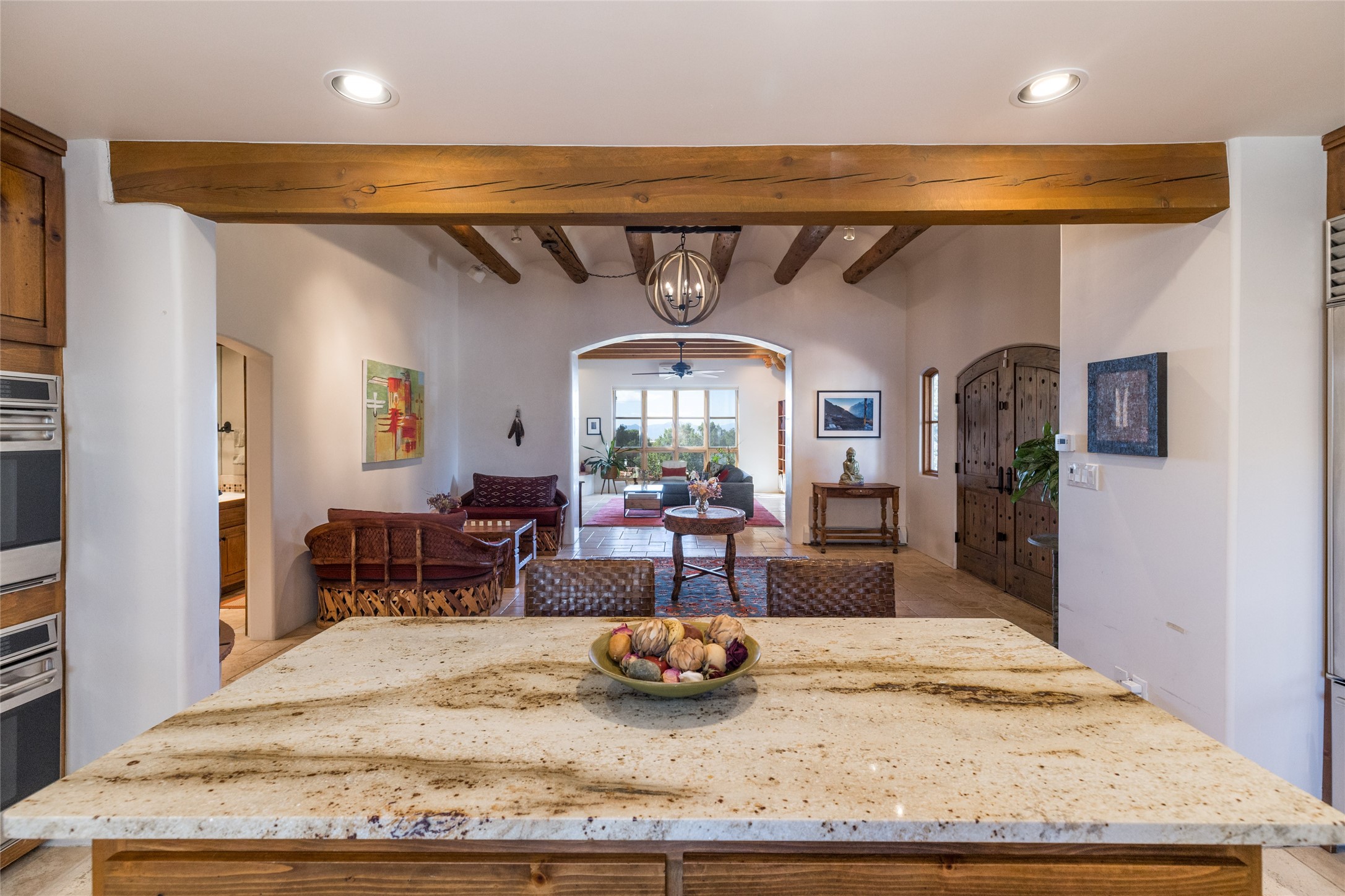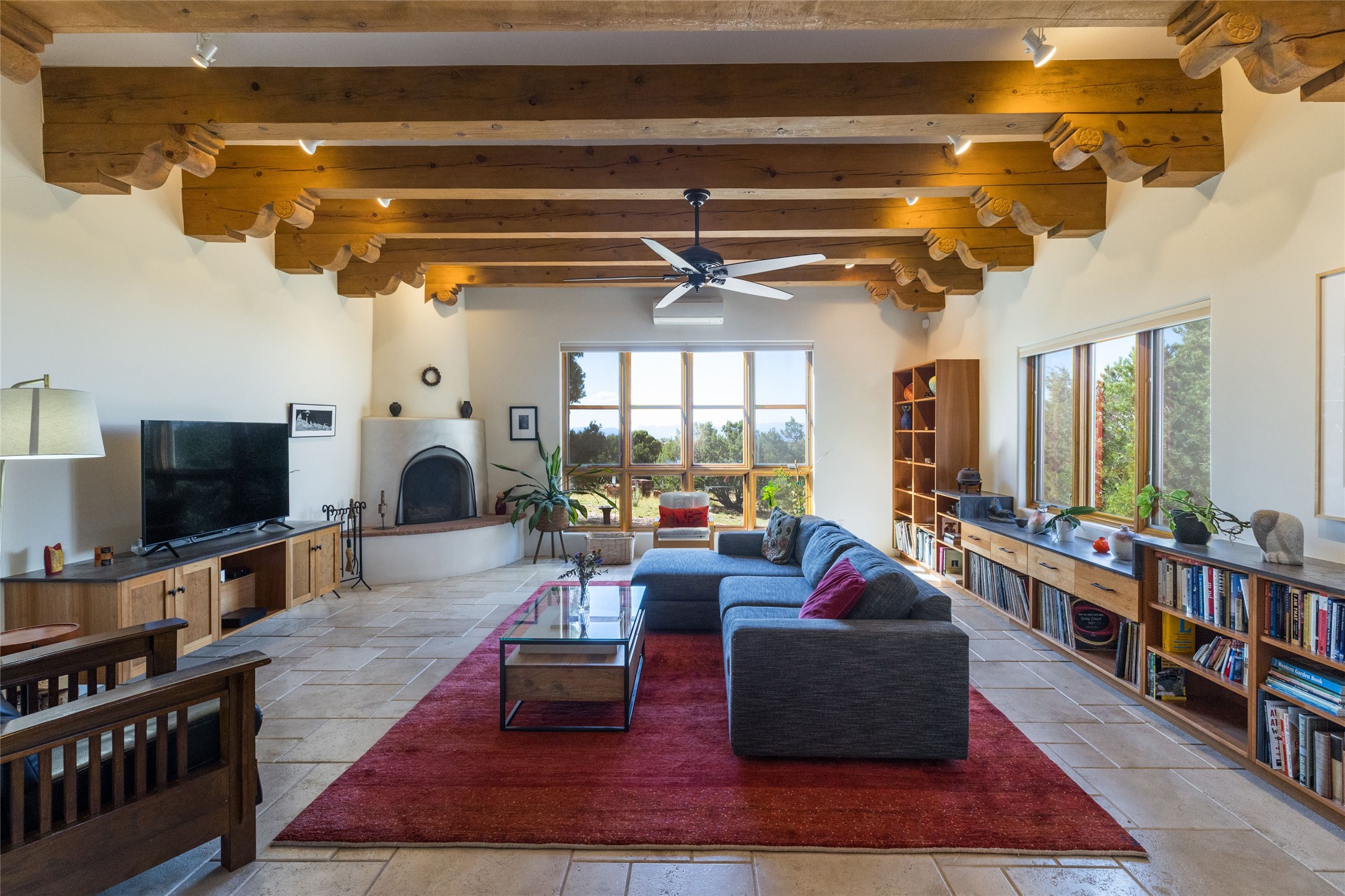 This beautiful estate has 3 bedrooms, 2 baths, dedicated office space, views from nearly every room, with two oversized two-car garages (one detached perfect for a workshop), plus a standalone 600 sf studio/casita with an extra 1 bedroom, 1 bath (previously used as an art studio). True chef's kitchen with Wolf appliances and sub-zero refrigerator, double ovens, granite counters, large island with bar seating.Just off the kitchen is a large bonus room with beautiful built-ins, currently used as a formal dining area. The private suite is entered through a sitting room/office with viga ceilings, kiva fireplace and door to viewing deck. Spa-like primary bath with extra large shower, separate jetted tub, double sinks, and walk in closet.There are a total of 6 fireplaces including one in the entry hall which could also be a formal dining room.Light-filled living room featuring exposed vigas and corbels, kiva fireplace, custom wood built-in shelving and cabinetry, and expansive windows capturing beautiful views. Owned solar system helps reduce utility costs, allowing you to enjoy the space of this home without the typical energy expense. Other amenities include Radiant floor heating, new mini splits, and a greenhouse.