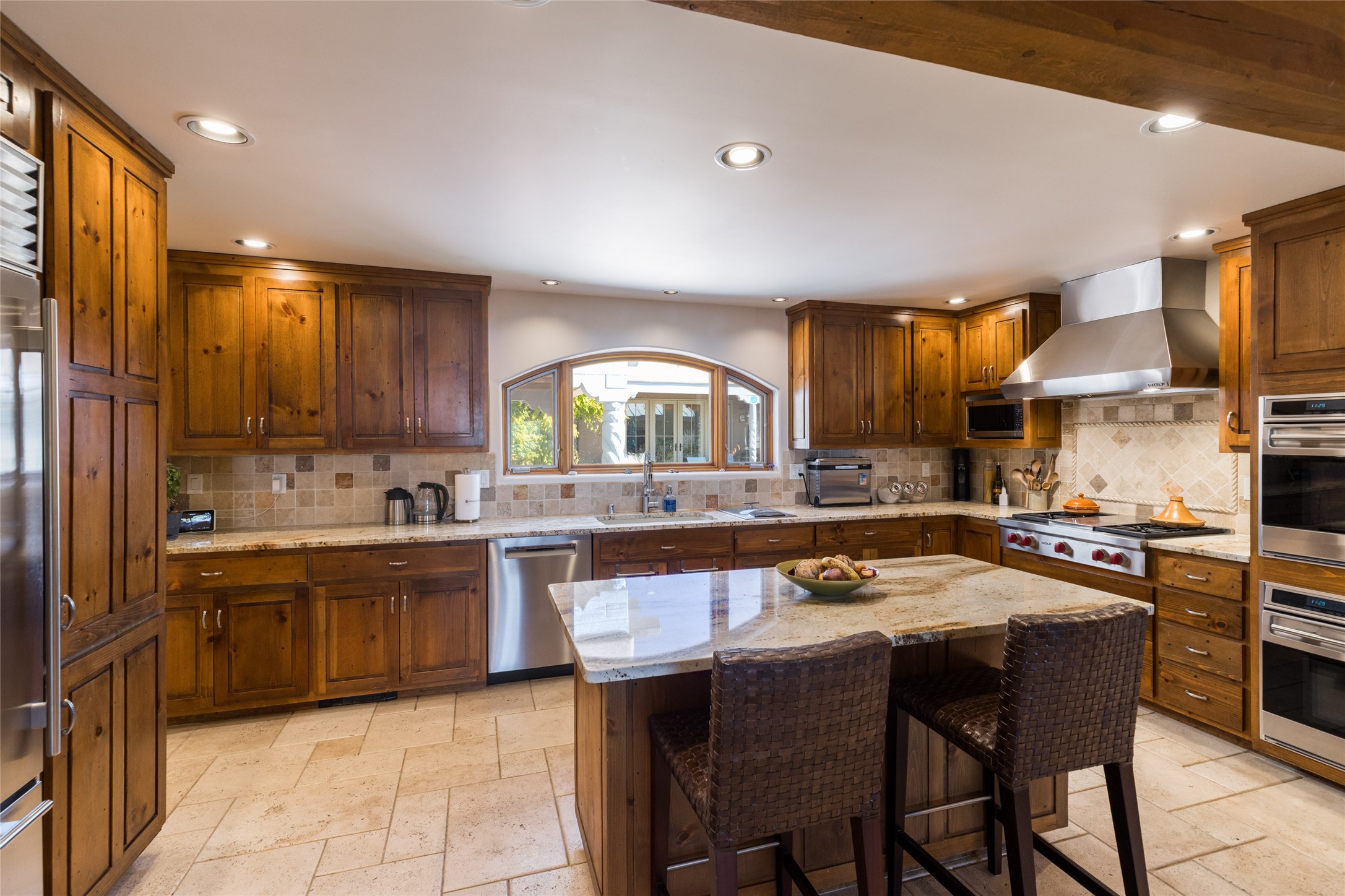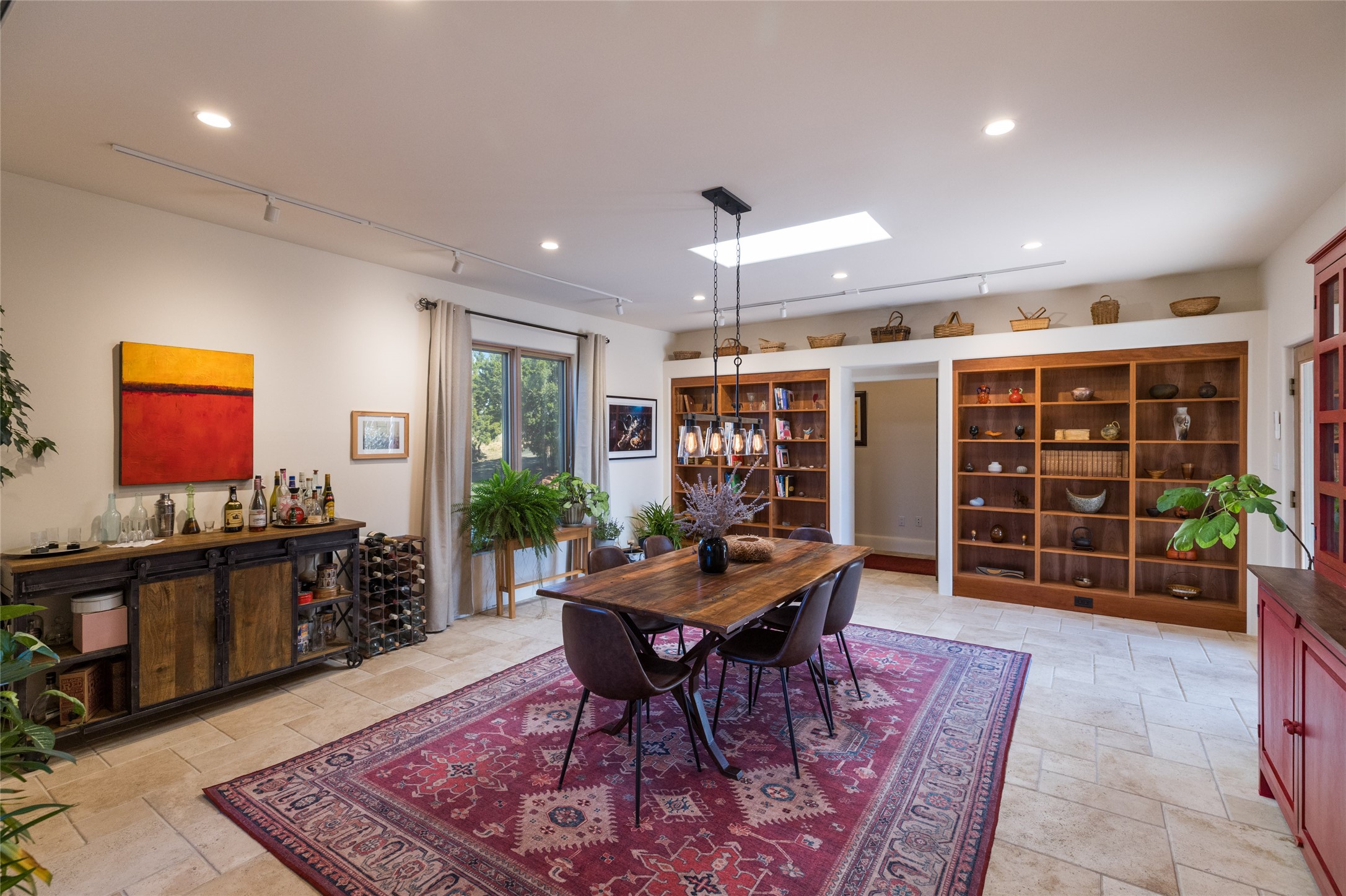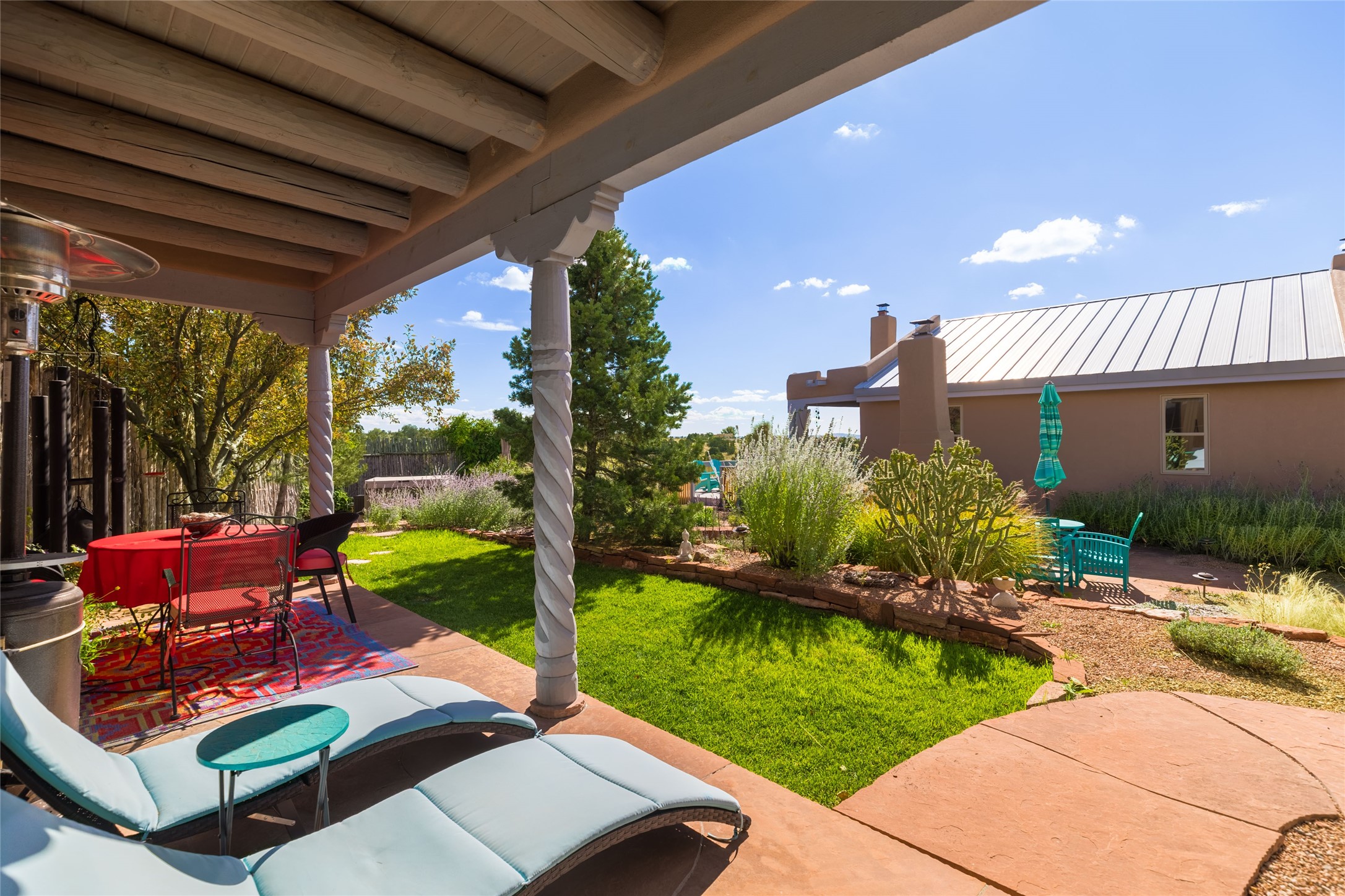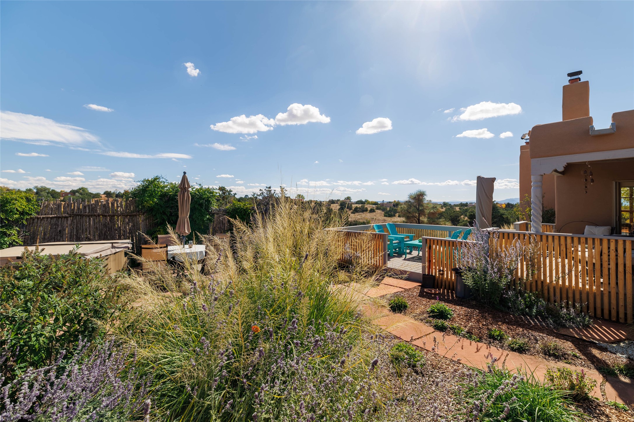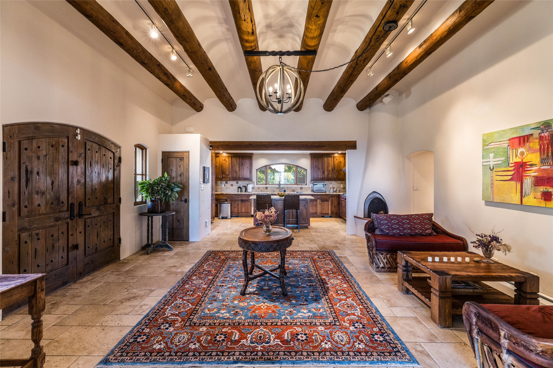This beautiful estate has 3 bedrooms, 2 baths, dedicated office space, views from nearly every room, with two oversized two-car garages (one detached perfect for a workshop), plus a standalone 600 sf studio/casita with an extra 1 bedroom, 1 bath (previously used as an art studio). True chef's kitchen with Wolf appliances and sub-zero refrigerator, double ovens, granite counters, large island with bar seating.Just off the kitchen is a large bonus room with beautiful built-ins, currently used as a formal dining area. The private suite is entered through a sitting room/office with viga ceilings, kiva fireplace and door to viewing deck. Spa-like primary bath with extra large shower, separate jetted tub, double sinks, and walk in closet.There are a total of 6 fireplaces including one in the entry hall which could also be a formal dining room.Light-filled living room featuring exposed vigas and corbels, kiva fireplace, custom wood built-in shelving and cabinetry, and expansive windows capturing beautiful views. Owned solar system helps reduce utility costs, allowing you to enjoy the space of this home without the typical energy expense. Other amenities include Radiant floor heating, new mini splits, and a greenhouse.