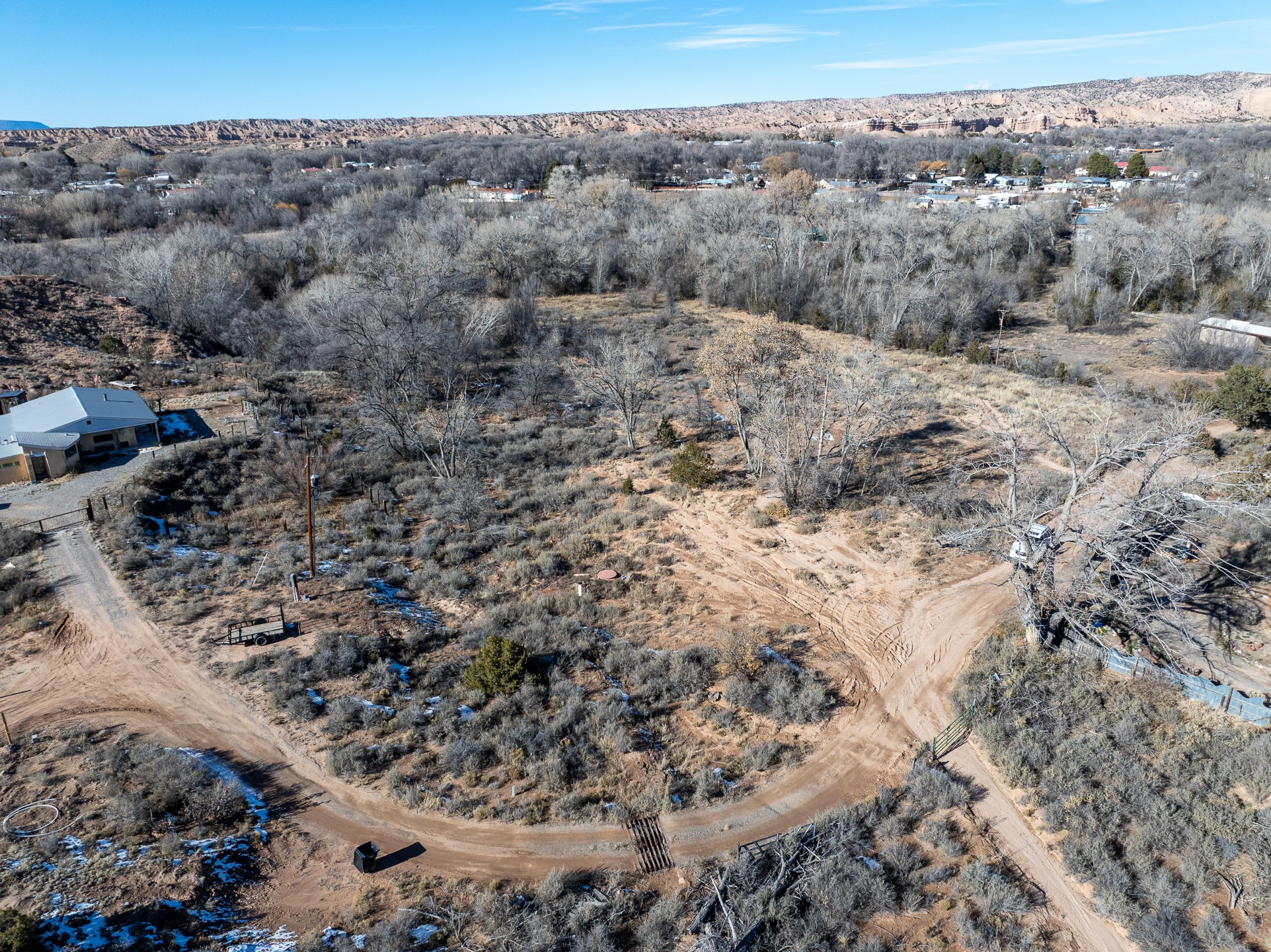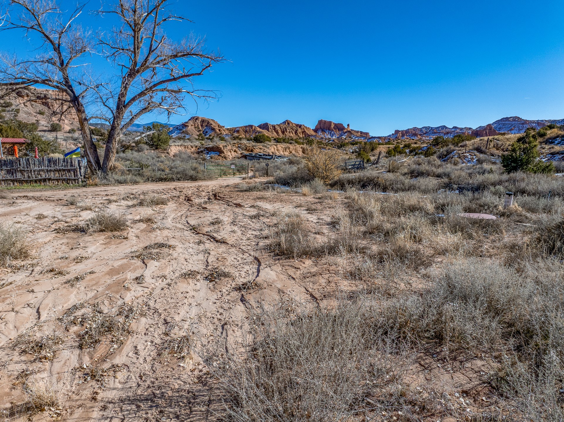 Capture a piece of gorgeous Chimayo land on .95 lush acreage!! Flat land with easy building sites provides for house, guest house and storage buildings! Trees and birds abound! Access to BLM land is available as well. There is a shared well on the property and a gate already provided for access into the property. Water rights also will transfer!! Owner may finance with 20% down at 5% interest, balloon in 5 yrs.