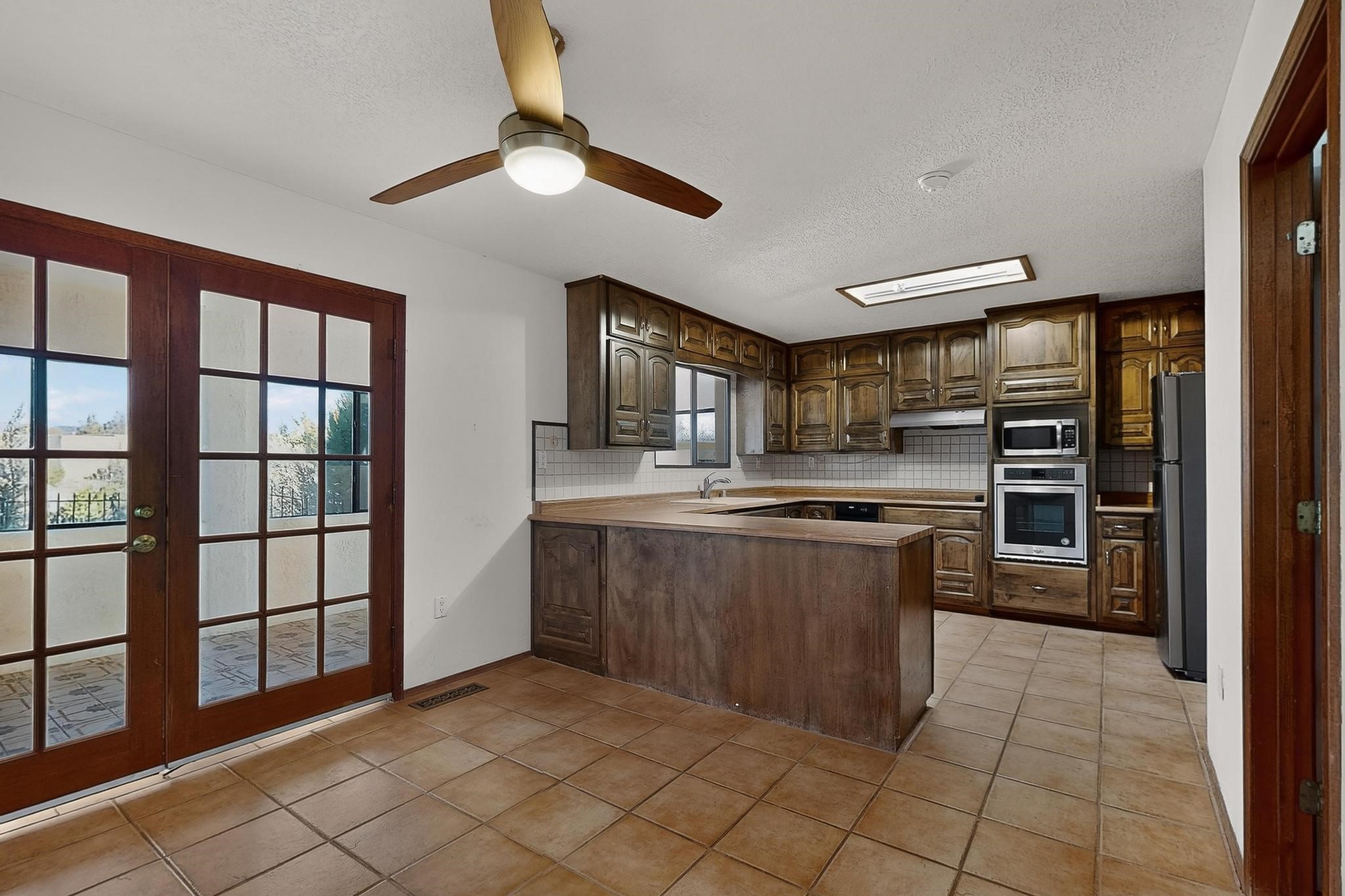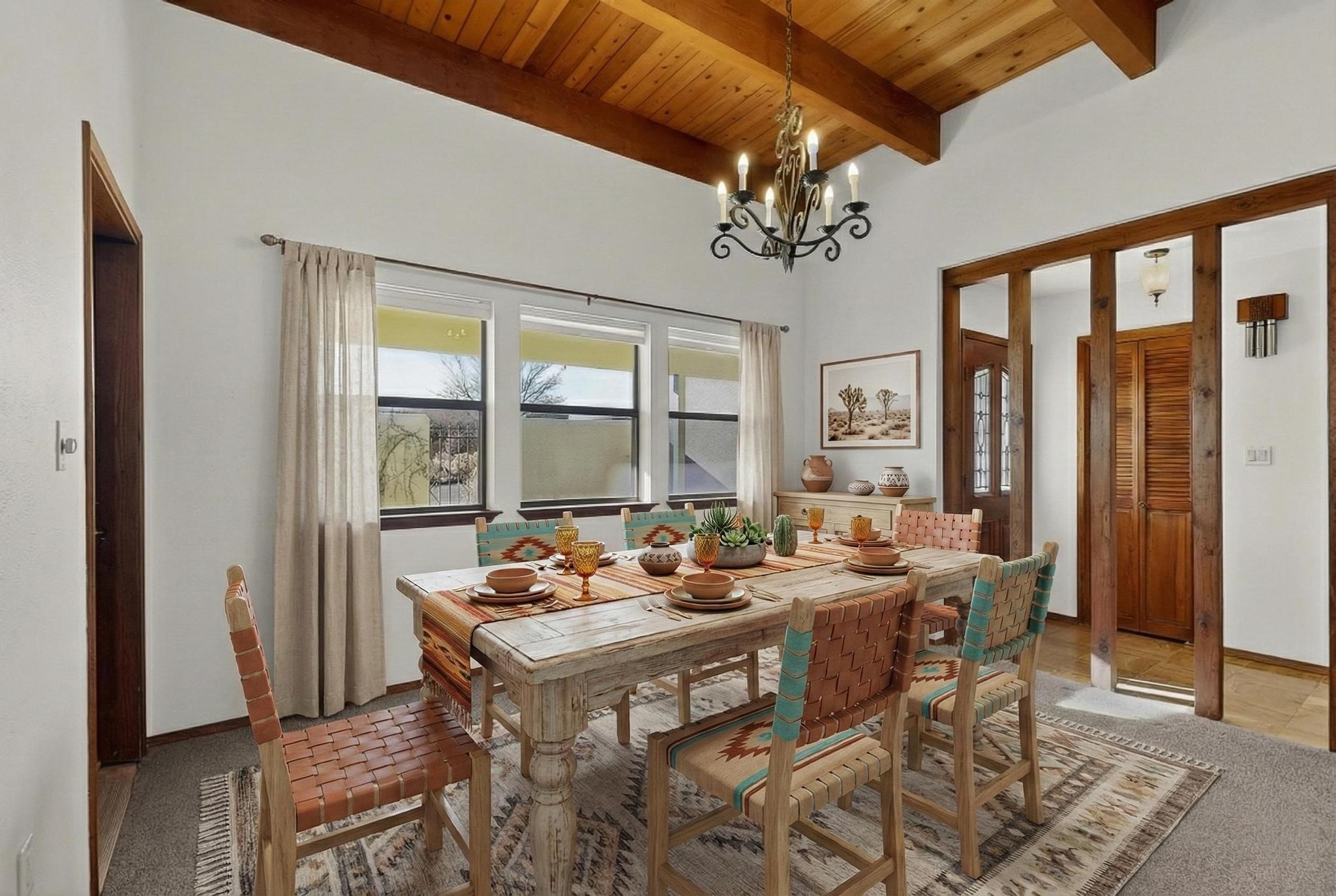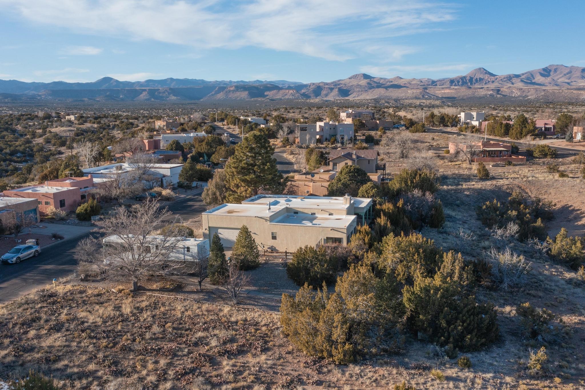 Thoughtfully designed approx. 2,500 sq ft, 3-bedroom plus flex room, 3-bath, 2-car garage home on a desirable double lot backing to open space, offering added privacy and beautiful views. The spacious living area, with room for an office or sitting area, features vaulted wood beam ceilings, a stone gas fireplace updated in 2023, and built-in shelving.The well-planned layout includes two primary bedrooms with en-suite baths, one with a walk-in closet, plus a third bedroom and an additional full bath. Bathrooms have been thoughtfully updated, including a remodeled primary bath with a walk-in shower. A sunroom, small office area off the kitchen, direct-access garage, and dedicated laundry room provide excellent flexibility for daily living.Notable improvements include a new furnace and water heater (2019), updated kitchen appliances and lighting, newer washer and dryer, insulated garage door, updated interior and exterior lighting, ceiling fans, window coverings, replaced window pulleys and screens, UV/heat-filtering window film, and new carpet in the living area and bedrooms. Additional amenities include marble flooring, forced air heating, central evaporative cooling, raised garden beds, fruit trees, and recent exterior updates.A wonderful opportunity to enjoy space, privacy, views, and relaxed Cochiti living. Please see the documents section for a complete list of updates and improvements.