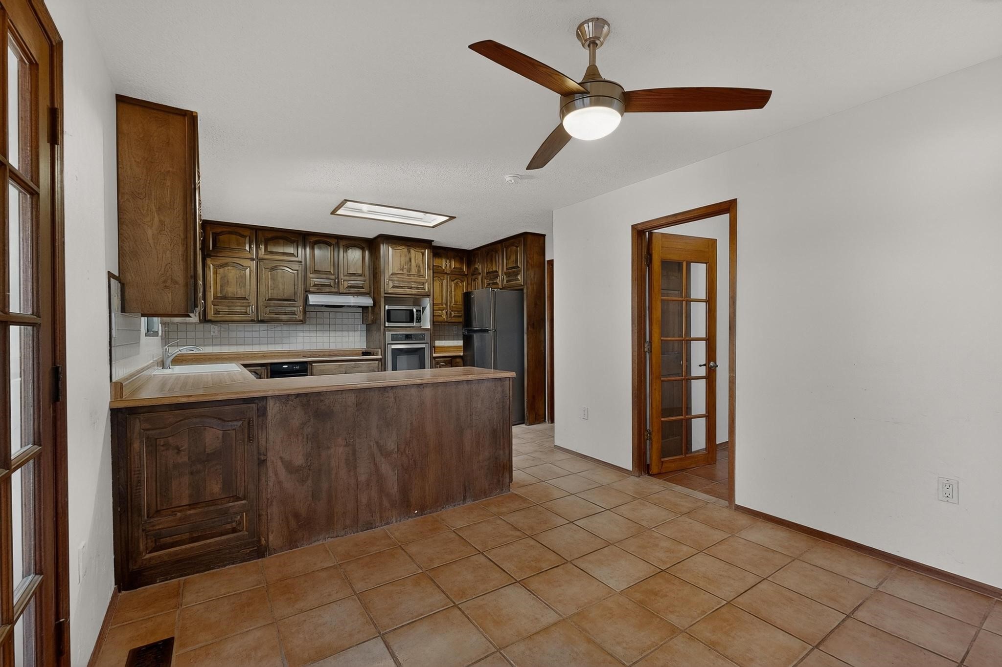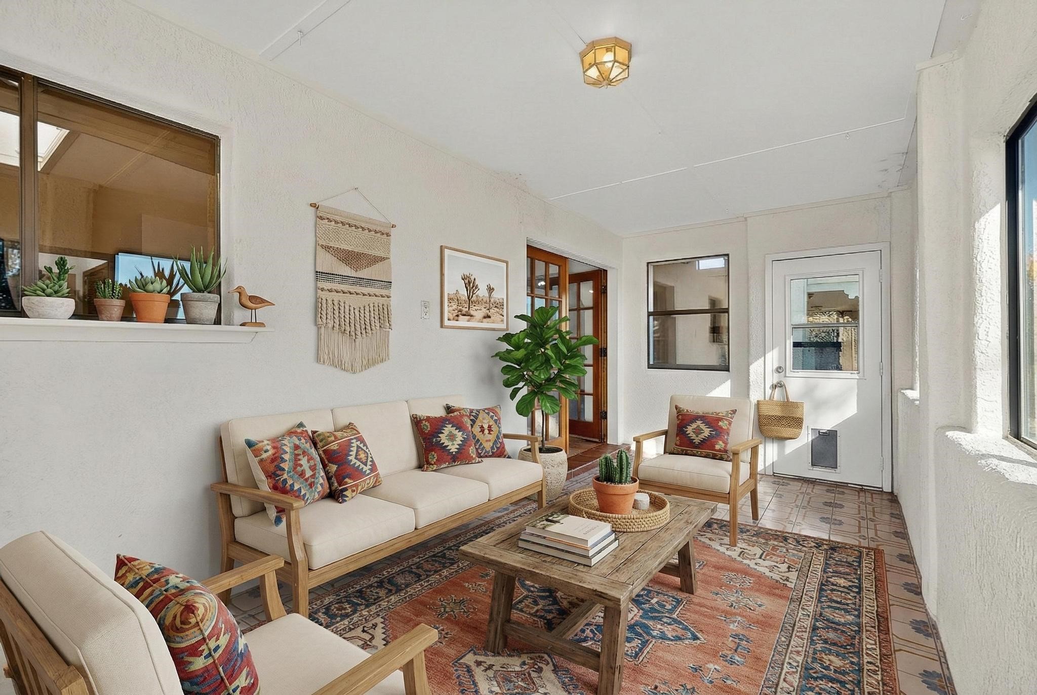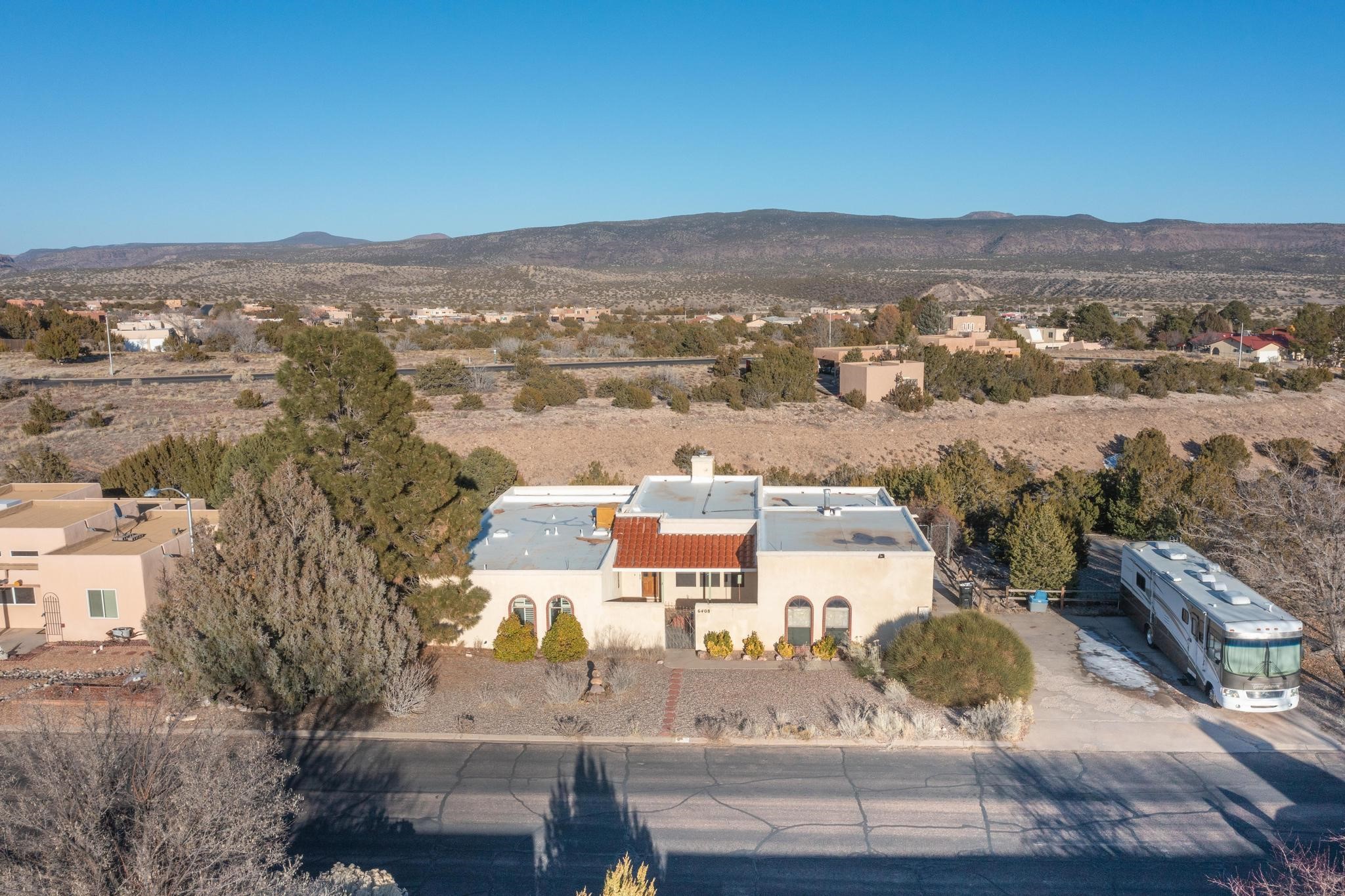 Thoughtfully designed approx. 2,500 sq ft, 3-bedroom plus flex room, 3-bath, 2-car garage home on a desirable double lot backing to open space, offering added privacy and beautiful views. The spacious living area, with room for an office or sitting area, features vaulted wood beam ceilings, a stone gas fireplace updated in 2023, and built-in shelving.The well-planned layout includes two primary bedrooms with en-suite baths, one with a walk-in closet, plus a third bedroom and an additional full bath. Bathrooms have been thoughtfully updated, including a remodeled primary bath with a walk-in shower. A sunroom, small office area off the kitchen, direct-access garage, and dedicated laundry room provide excellent flexibility for daily living.Notable improvements include a new furnace and water heater (2019), updated kitchen appliances and lighting, newer washer and dryer, insulated garage door, updated interior and exterior lighting, ceiling fans, window coverings, replaced window pulleys and screens, UV/heat-filtering window film, and new carpet in the living area and bedrooms. Additional amenities include marble flooring, forced air heating, central evaporative cooling, raised garden beds, fruit trees, and recent exterior updates.A wonderful opportunity to enjoy space, privacy, views, and relaxed Cochiti living. Please see the documents section for a complete list of updates and improvements.