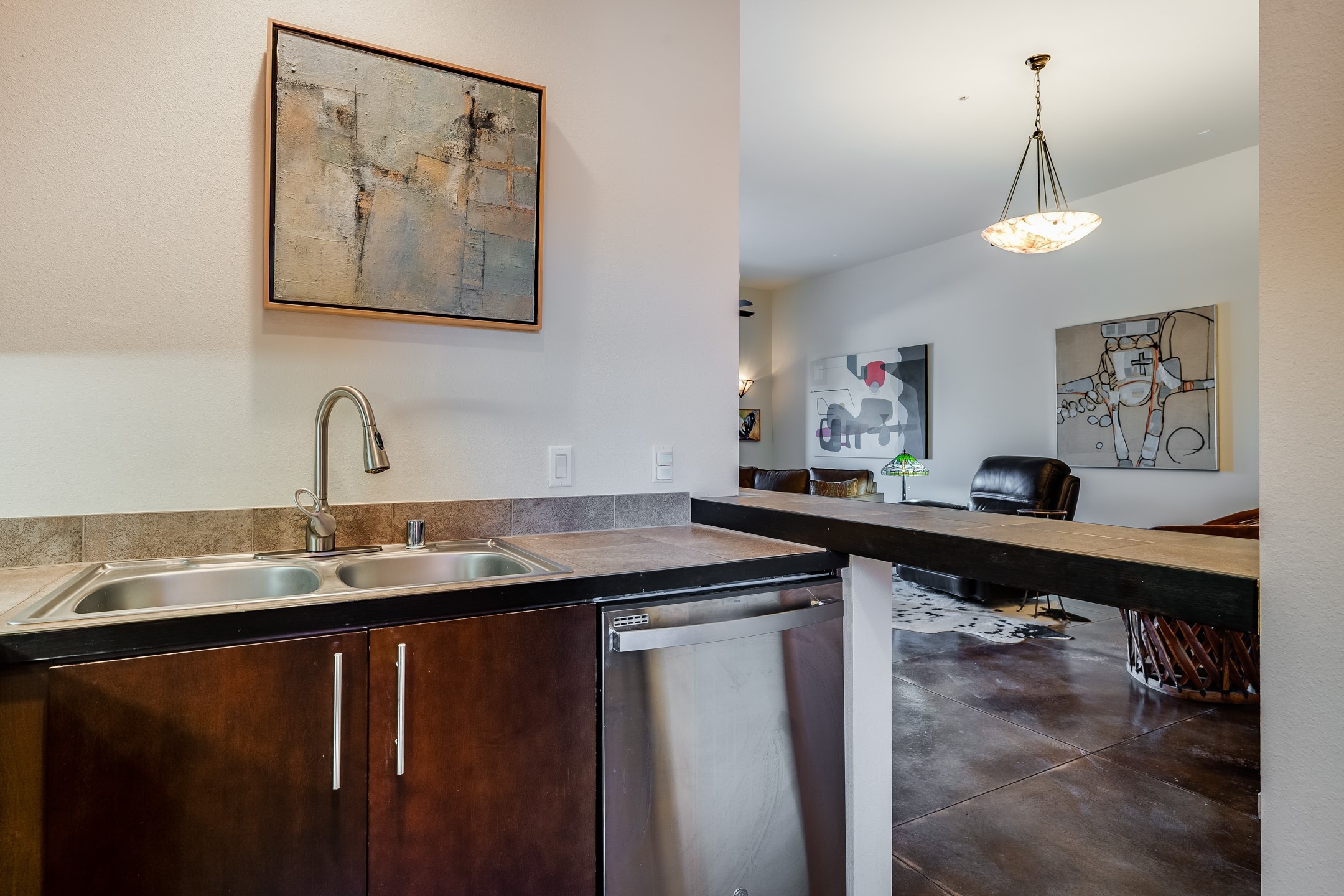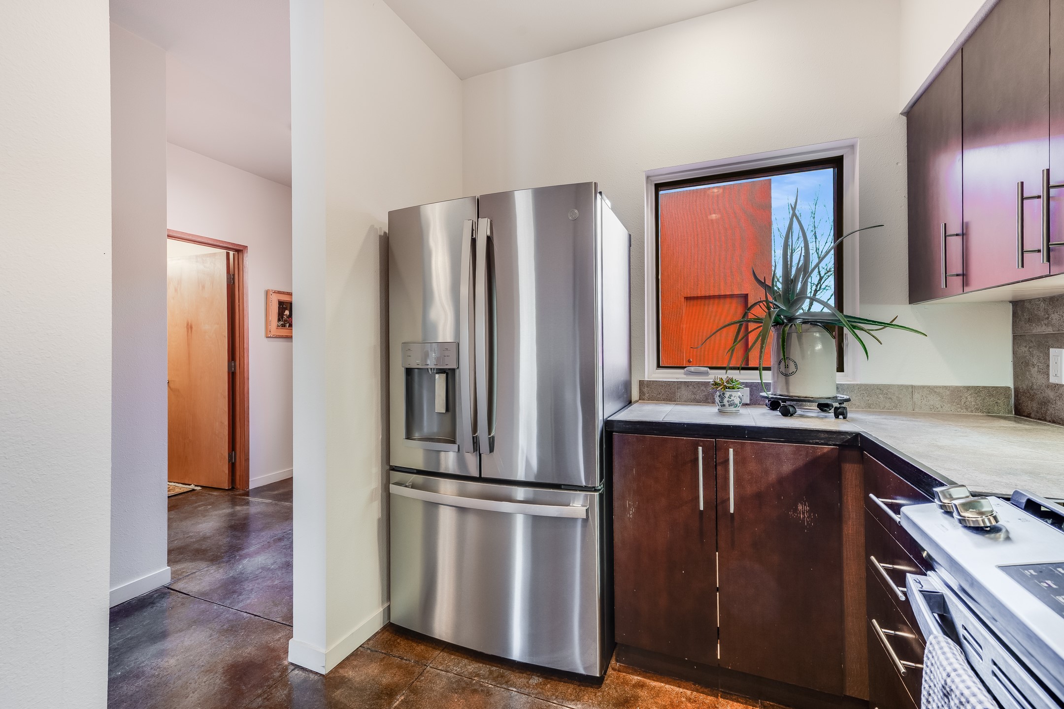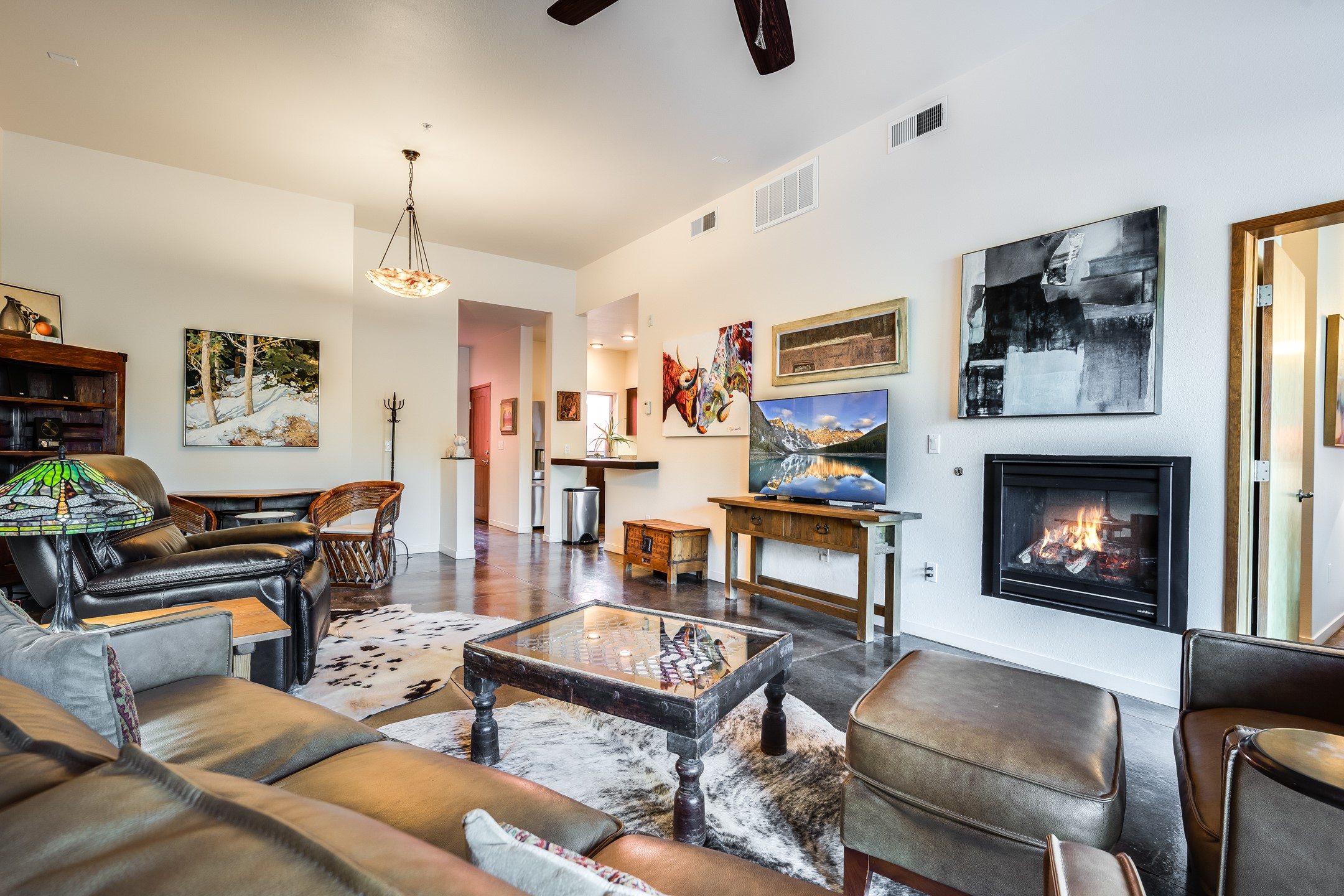 Welcome to Zocalo, a Santa Fe Condominium development offering unmatched convenience and amenities including an outdoor pool and spa, two gyms, a barbecue area and clubhouse. This ground-level unit is a Plaza floor plan designed by Ricardo Legorreta and received multiple awards by the Haciendas Parade of Homes, including an award for best use of space. Featuring easy to care stained concrete flooring throughout, stainless steel appliances, Pella windows, and a well designed, efficient floor plan. The condo has a wonderful orientation with the living room directly accessing the covered north-facing patio. Other desirable features include refrigerated A/C, gas fireplace, and a one-car garage. All of this within a few short minutes to the Plaza, Opera and hiking trails.