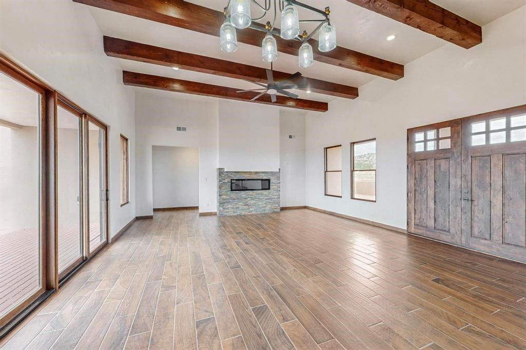 An extraordinary Santa Fe retreat where timeless Pueblo architecture meets modern luxury, just 17 miles from the Historic Plaza. This exceptional property features a stunning 3-bedroom, 2-bath main residence plus a private 1-bedroom, 1-bath casita, offering over 3,000 square feet of beautifully designed living space with exquisite craftsmanship and thoughtful design. The open-concept floor plan creates a seamless flow between the living, dining, and kitchen areas--perfect for both elegant entertaining and everyday living. Large windows bathe the interior in natural light, enhancing the warm and inviting ambiance. The chef's kitchen is a true centerpiece, showcasing quartz countertops, stainless LG appliances, a premium Thor stove and oven range, and abundant A&H custom cabinetry, blending style and functionality with ease. Santa Fe architectural details elevate the home, including hand-troweled plaster walls, soaring 12-foot ceilings, exposed beams and vigas, wood-look tile flooring, and a charming fireplace that adds warmth and character. High-quality Jeld-Wen double-hung wood-metal clad windows further enhance both beauty and efficiency. The private casita offers a wonderful opportunity for guest accommodations, multigenerational living, or rental potential.