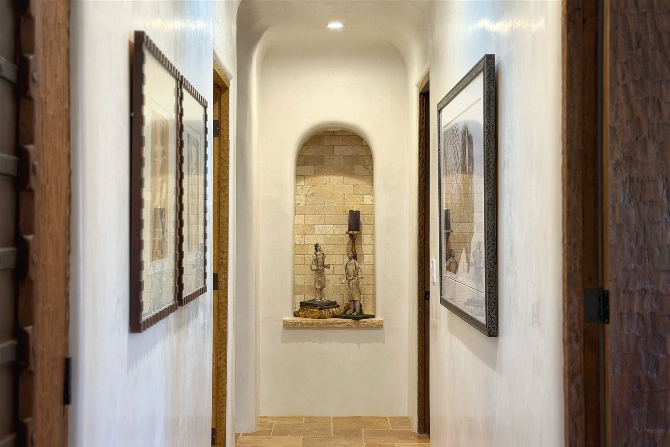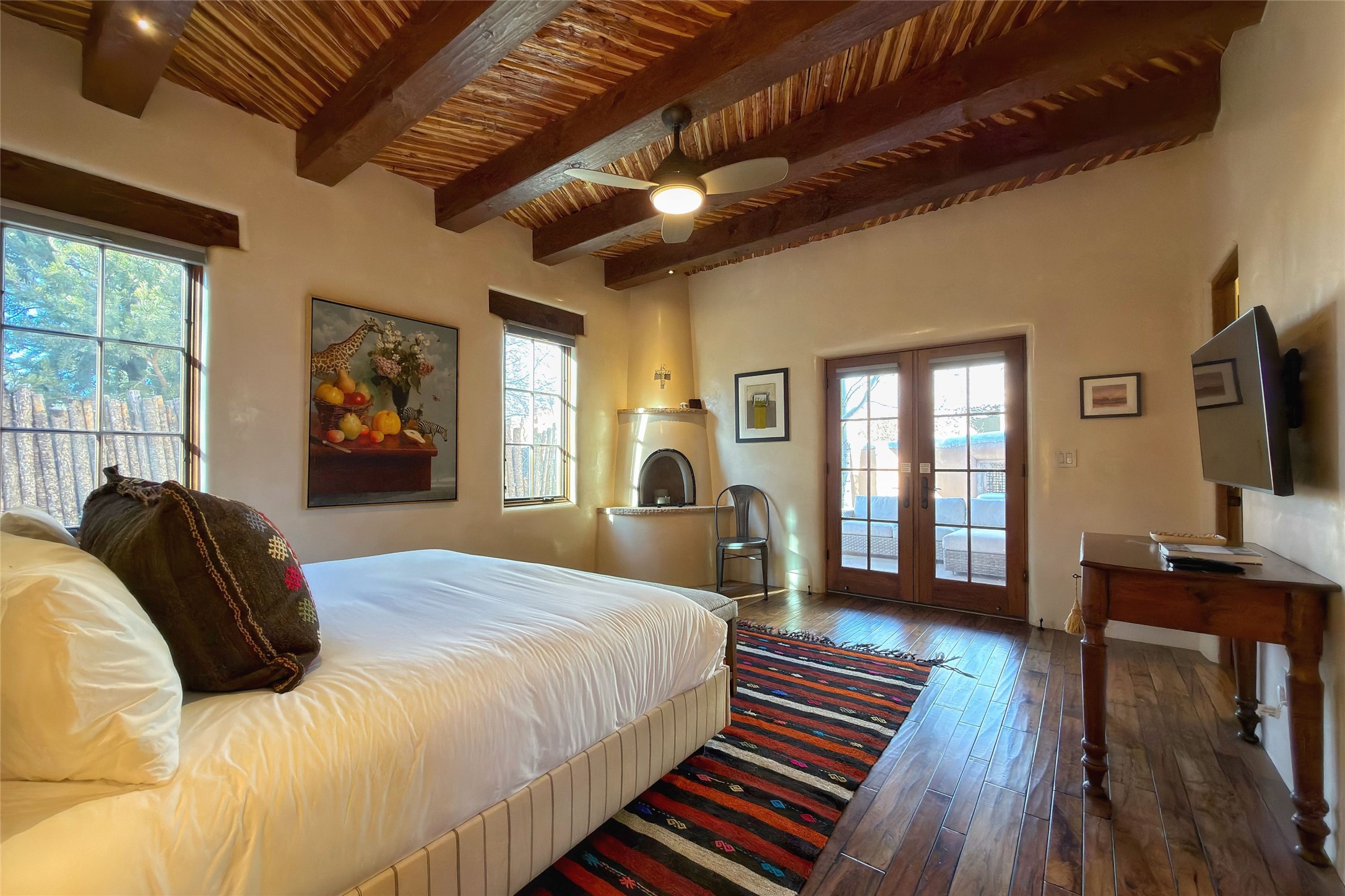 This beautifully crafted 3-bedroom, 3-bath single-family residence with a dedicated office and rare one-car garage showcases exceptional quality throughout. Venetian plaster walls, and refined high-end finishes complement the large stone fireplace in the living room. Thoughtfully designed with radiant heat and central air conditioning, the home features a spacious gourmet kitchen equipped with top-of-the-line Wolf appliances, custom cabinetry, wine fridge, and adjoining dining room.Two private outdoor living spaces create an inviting setting for entertaining or relaxing. Tucked away off of East Alameda between Canyon Road and the Santa Fe River, the property is quietly set back within a secluded end-of-lane compound, offering privacy but just minutes to renowned galleries, fine dining, and museums.