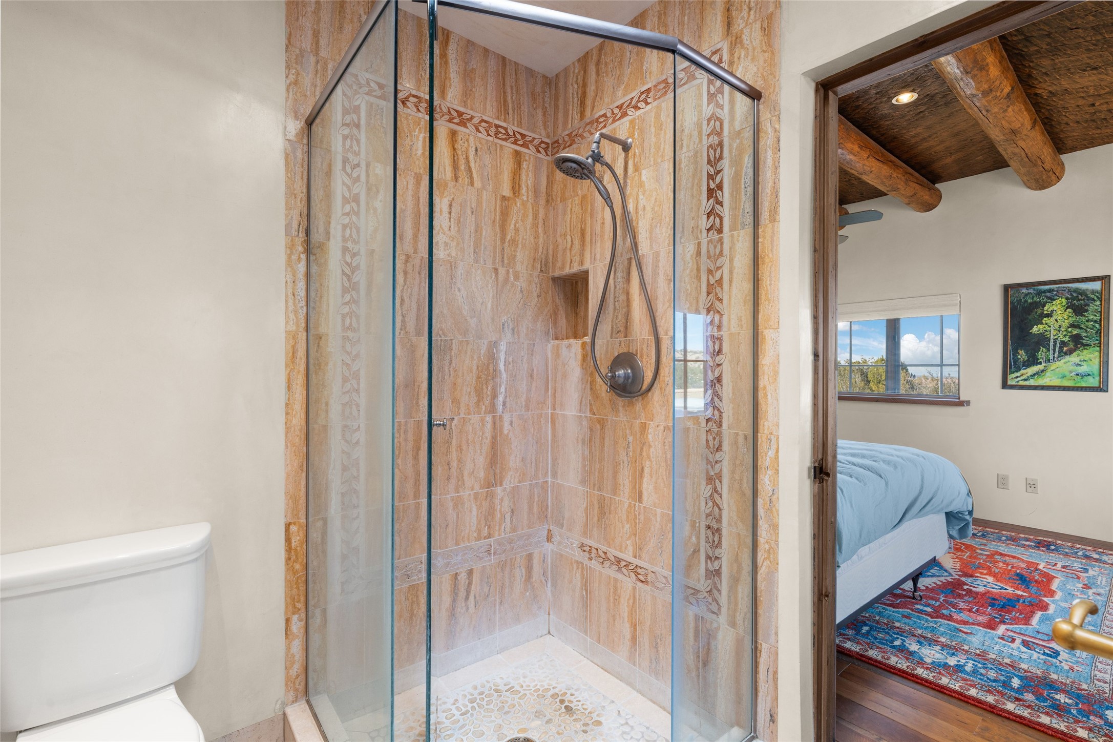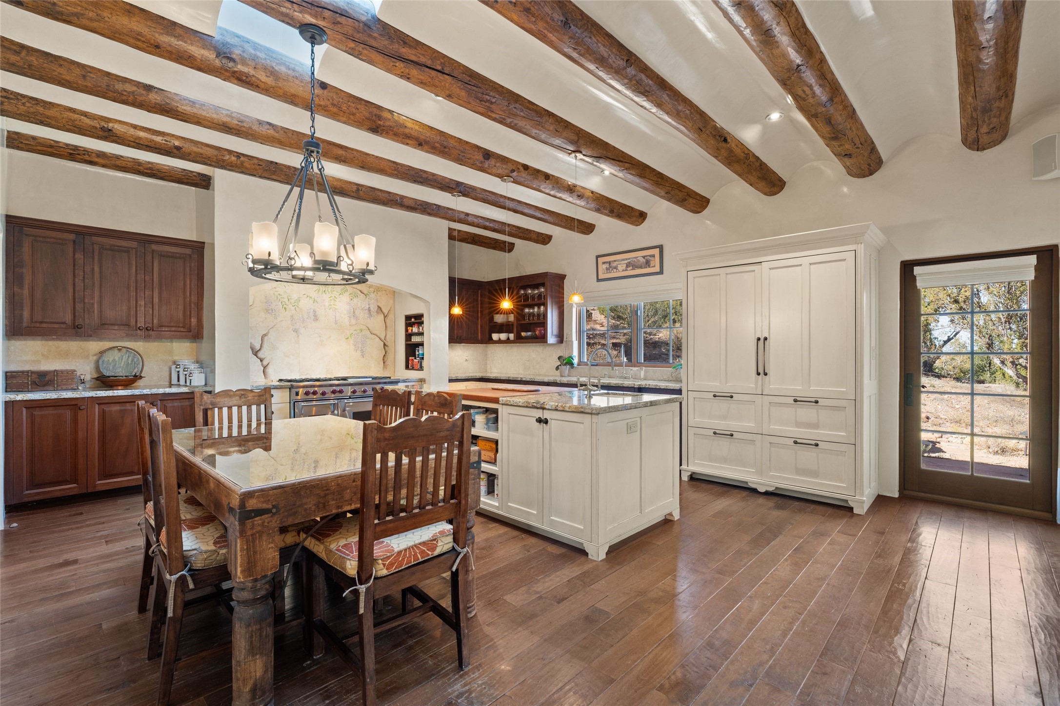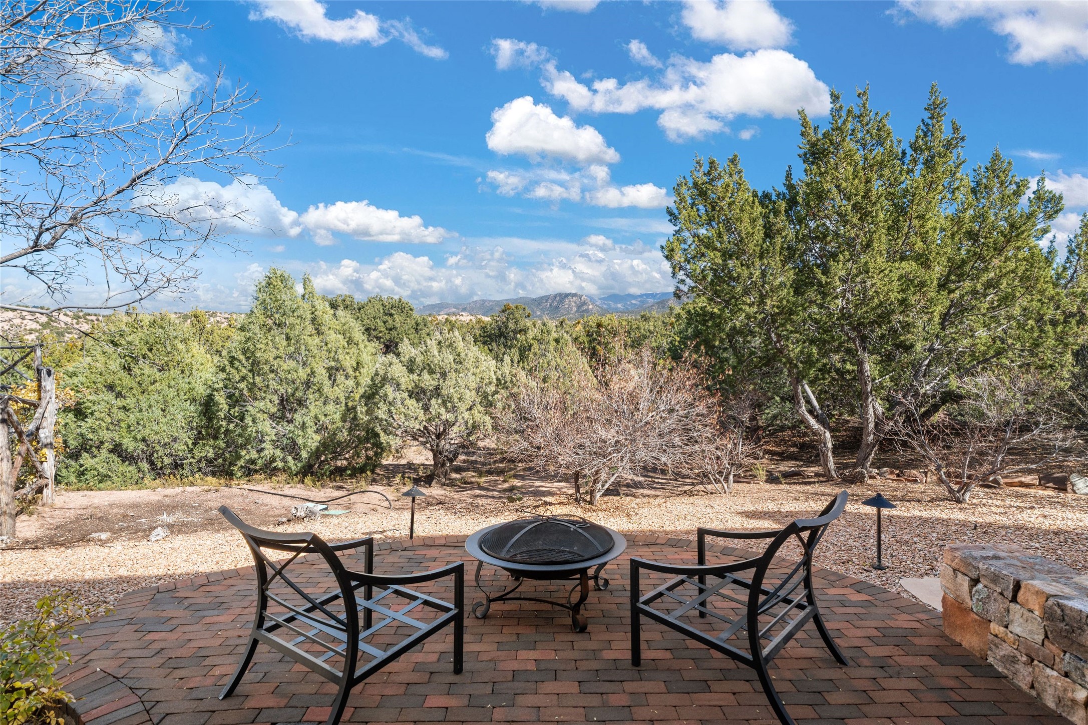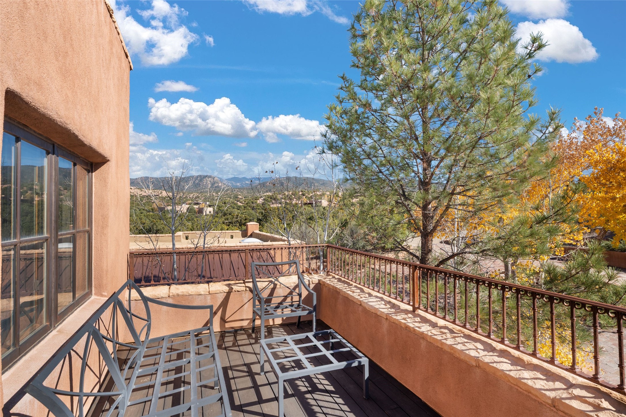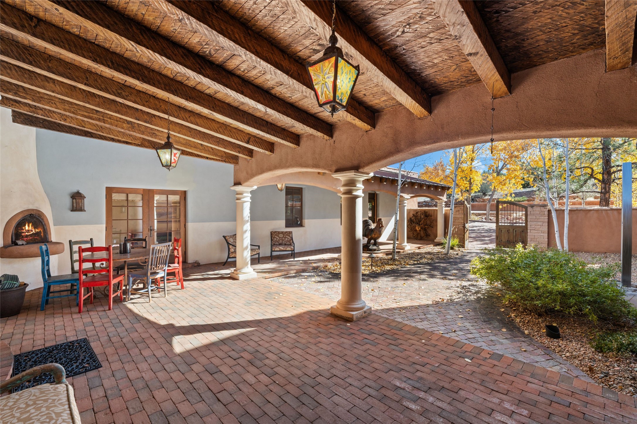 Backing up to breathtaking Tesuque Pueblo tribal land, this private and gated Tesuque property is a short drive to El Nido Restaurant, the famed Tesuque Village Market and the world-renowned Four Seasons Resort and Spa. This 5,112 +/- sq.ft. adobe and frame constructed home exudes classic Santa Fe style and high-end craftsmanship. The home is multi leveled with two bedrooms and one bath upstairs and two bedrooms and two and a half baths on the main level. A separate office space is located near the owners suite with an additional private gallery room near the entry, perfect for quiet reflection. The basement has temperature and humidity controlled art or wine storage. Smooth plaster walls are awash with high desert light and mountain views evolve with the clouds. Formal living spaces open out onto delightful indoor/outdoor entertaining options of spacious portals that weave the beauty of nature into the living environment.This sensuous property was constructed with every attention to detail including hardwood and stone tile floors, vigas and beams, coved ceilings, custom wood doors, wood and copper windows, custom cabinetry, stone countertops, and 6 wood burning fireplaces both inside and outside. An adjacent 6.407 acre vacant lot is also available for sale with it's own well.