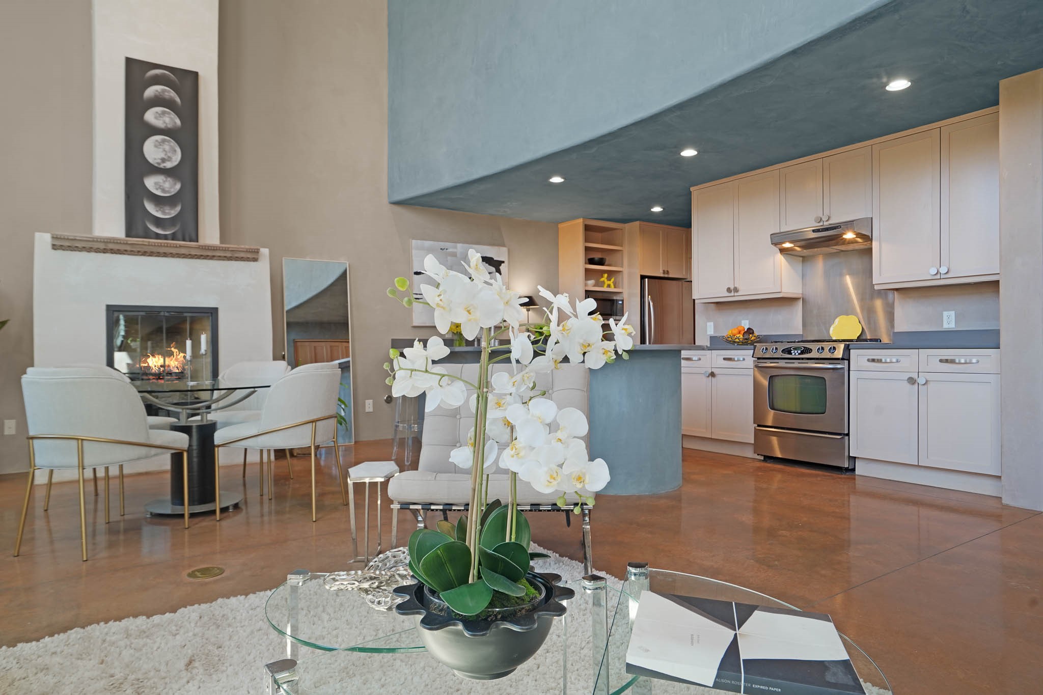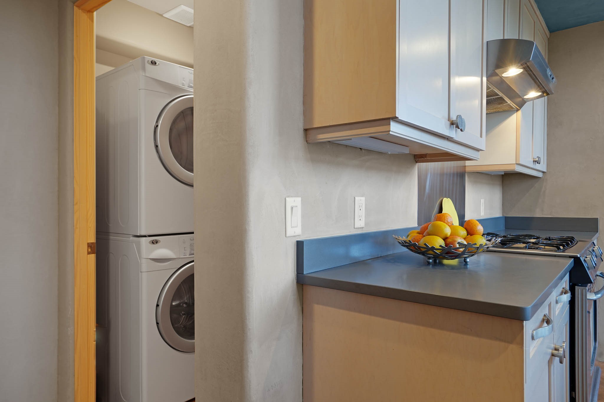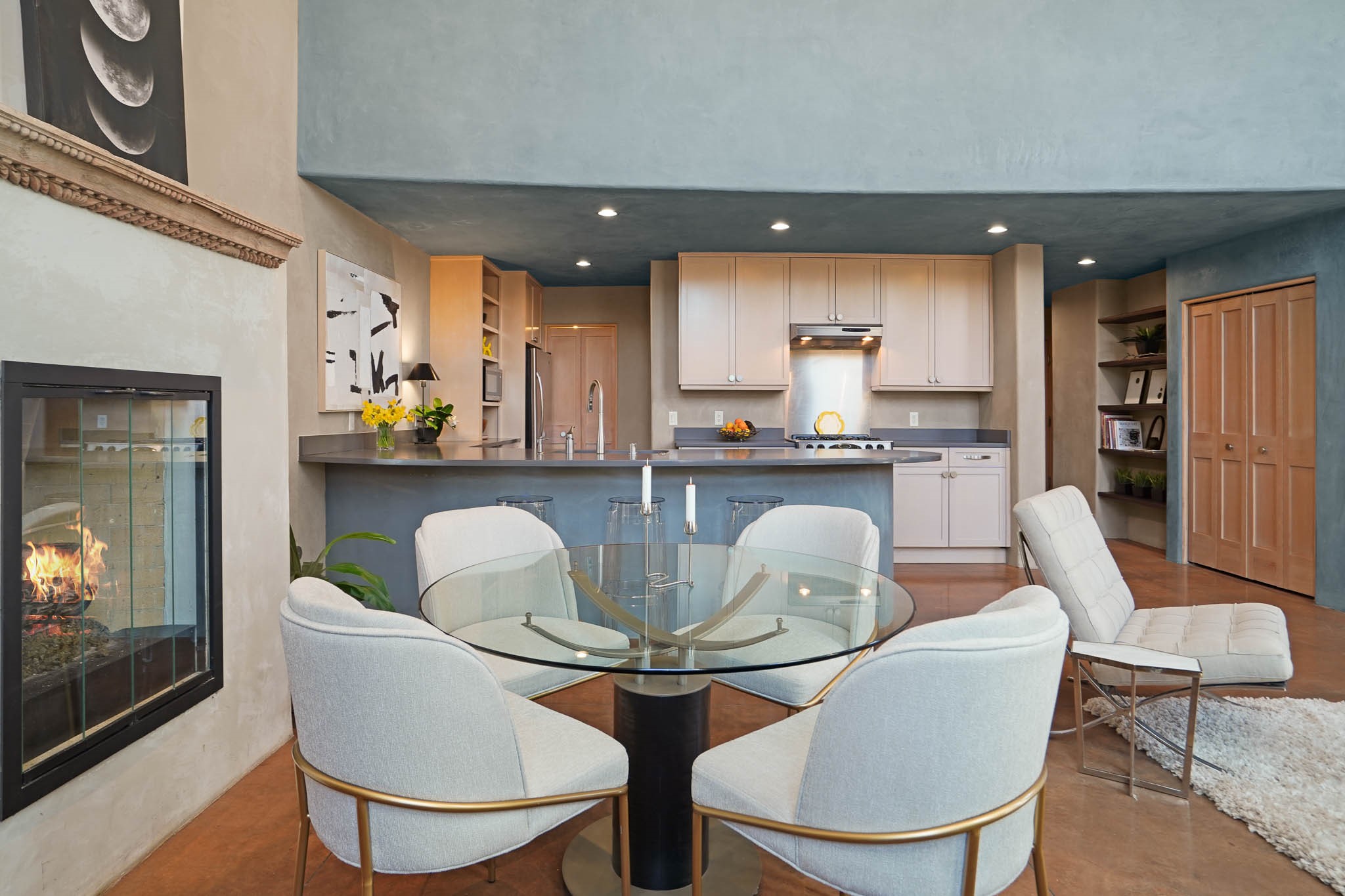 Perfectly located just steps from Kaune's Neighborhood Market and within walking distance of many of Santa Fe's most beloved destinations, this stylish and light-filled condo blends modern comfort with timeless Southwest charm.A private gated front courtyard shaded by graceful Aspen trees creates a peaceful entry and a perfect place to enjoy morning coffee or unwind in the evening. Inside, the main level opens to an airy living space with soaring ceilings, expansive windows, and American clay walls that beautifully reflect the natural light. A gas log fireplace adds warmth and ambiance, while the chef's kitchen features high-end appliances, a spacious island ideal for entertaining, a generous pantry, and a separate laundry room for added convenience. Also on the first floor, a guest bedroom and full bathroom provide comfort and privacy for visitors, while a stylish powder room sits just off the entry. A graceful staircase leads to the upper level, where a bright landing offers a perfect space for a home office or cozy reading nook. The primary suite serves as a tranquil retreat, complete with dual closets, a sleek ensuite bathroom, and beautiful views. Designed for easy living and low maintenance, this home is an ideal lock-and-leave property. Additional features include radiant heat, central air conditioning, and a two-car garage for year-round comfort. Zoned RAC for multi-purpose use, the property offers exceptional flexibility in one of Santa Fe's most desirable locations. Schedule your showing today and experience the very best of Santa Fe living.