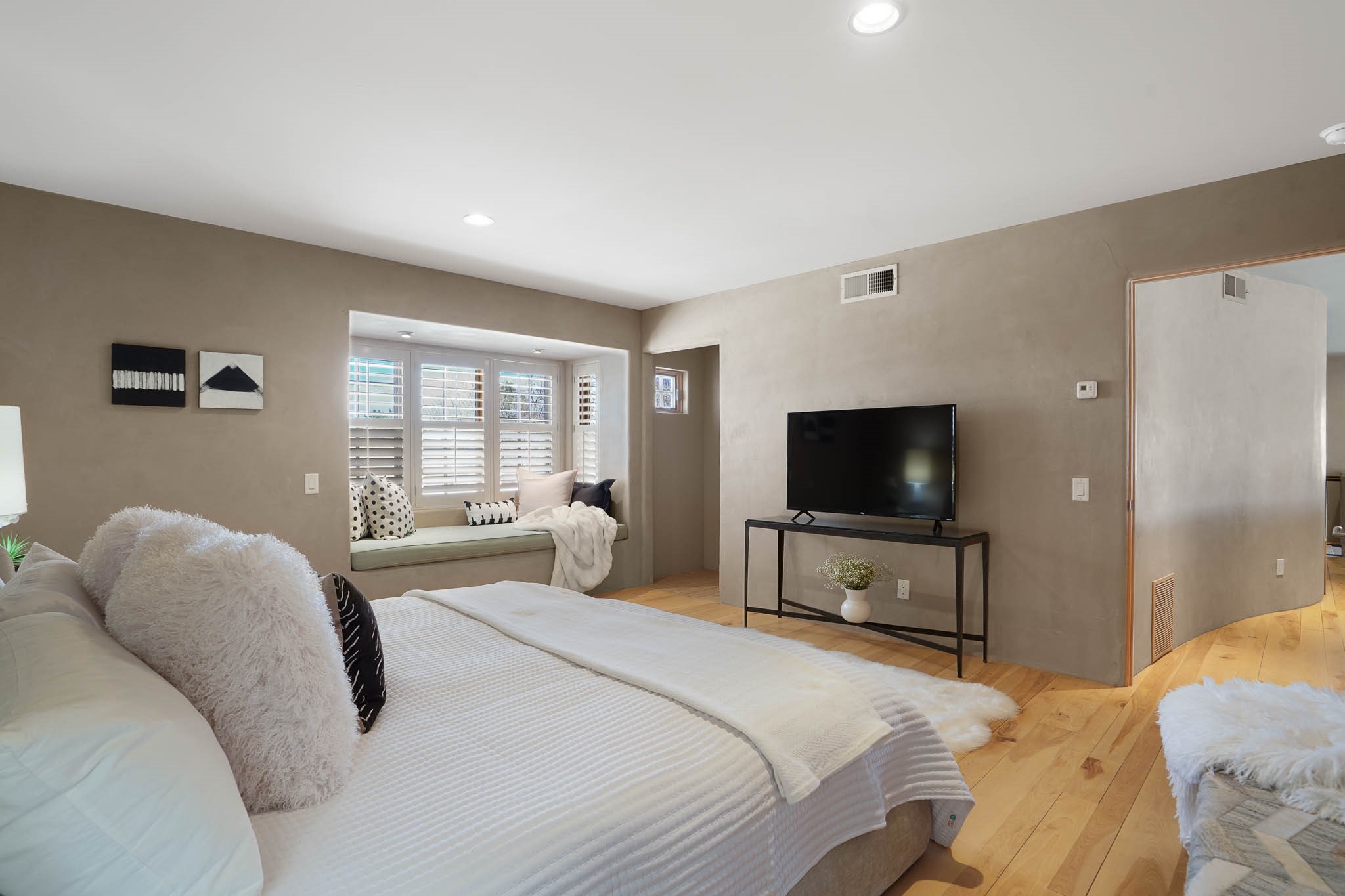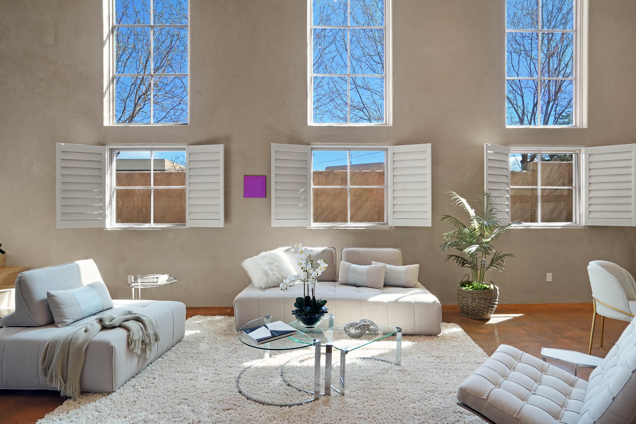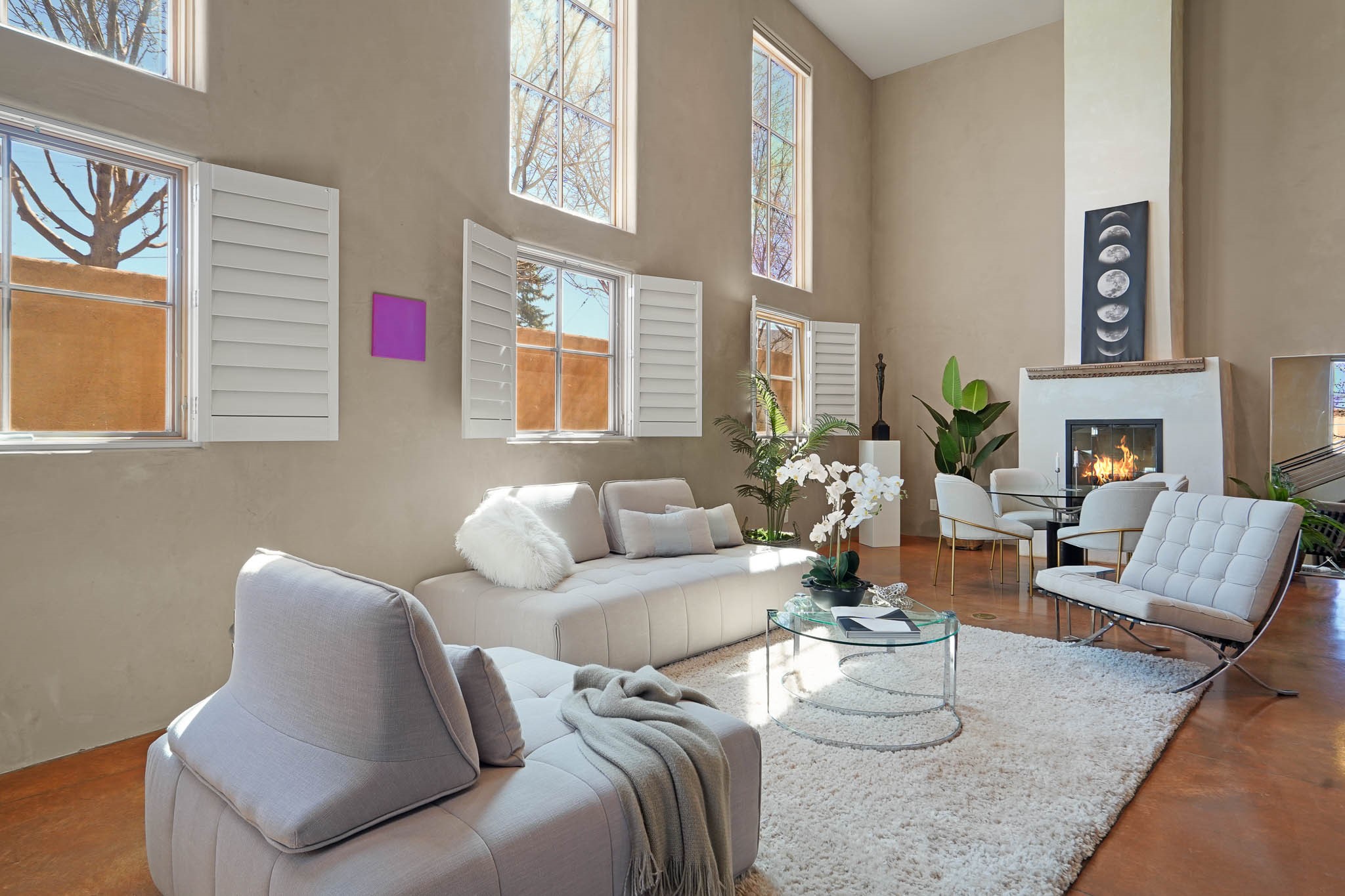 Perfectly located just steps from Kaune's Neighborhood Market and within walking distance of many of Santa Fe's most beloved destinations, this stylish and light-filled condo blends modern comfort with timeless Southwest charm.A private gated front courtyard shaded by graceful Aspen trees creates a peaceful entry and a perfect place to enjoy morning coffee or unwind in the evening. Inside, the main level opens to an airy living space with soaring ceilings, expansive windows, and American clay walls that beautifully reflect the natural light. A gas log fireplace adds warmth and ambiance, while the chef's kitchen features high-end appliances, a spacious island ideal for entertaining, a generous pantry, and a separate laundry room for added convenience. Also on the first floor, a guest bedroom and full bathroom provide comfort and privacy for visitors, while a stylish powder room sits just off the entry. A graceful staircase leads to the upper level, where a bright landing offers a perfect space for a home office or cozy reading nook. The primary suite serves as a tranquil retreat, complete with dual closets, a sleek ensuite bathroom, and beautiful views. Designed for easy living and low maintenance, this home is an ideal lock-and-leave property. Additional features include radiant heat, central air conditioning, and a two-car garage for year-round comfort. Zoned RAC for multi-purpose use, the property offers exceptional flexibility in one of Santa Fe's most desirable locations. Schedule your showing today and experience the very best of Santa Fe living.
