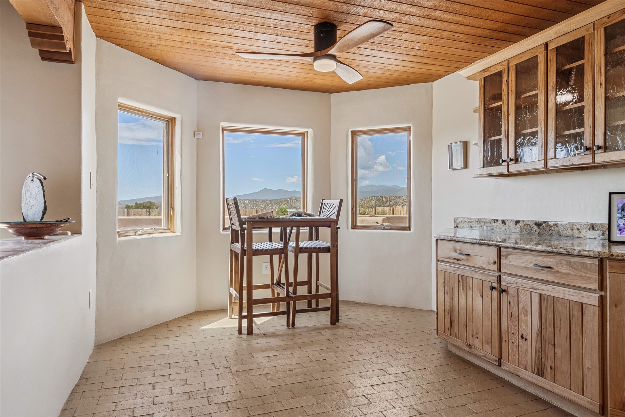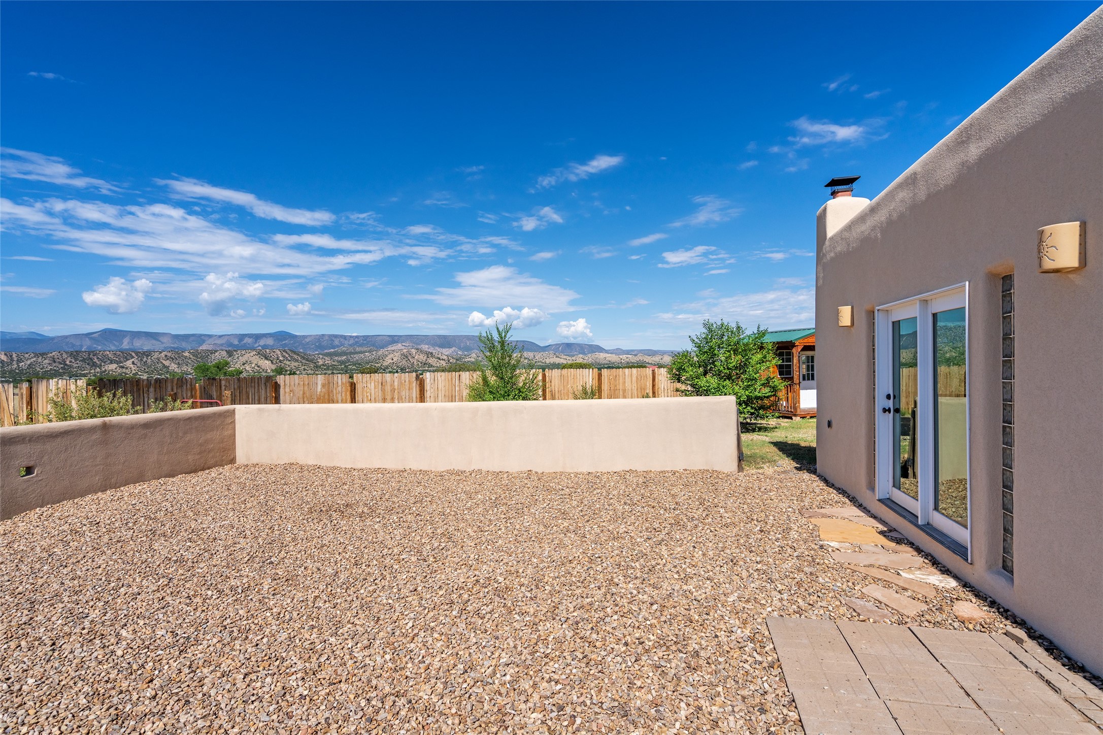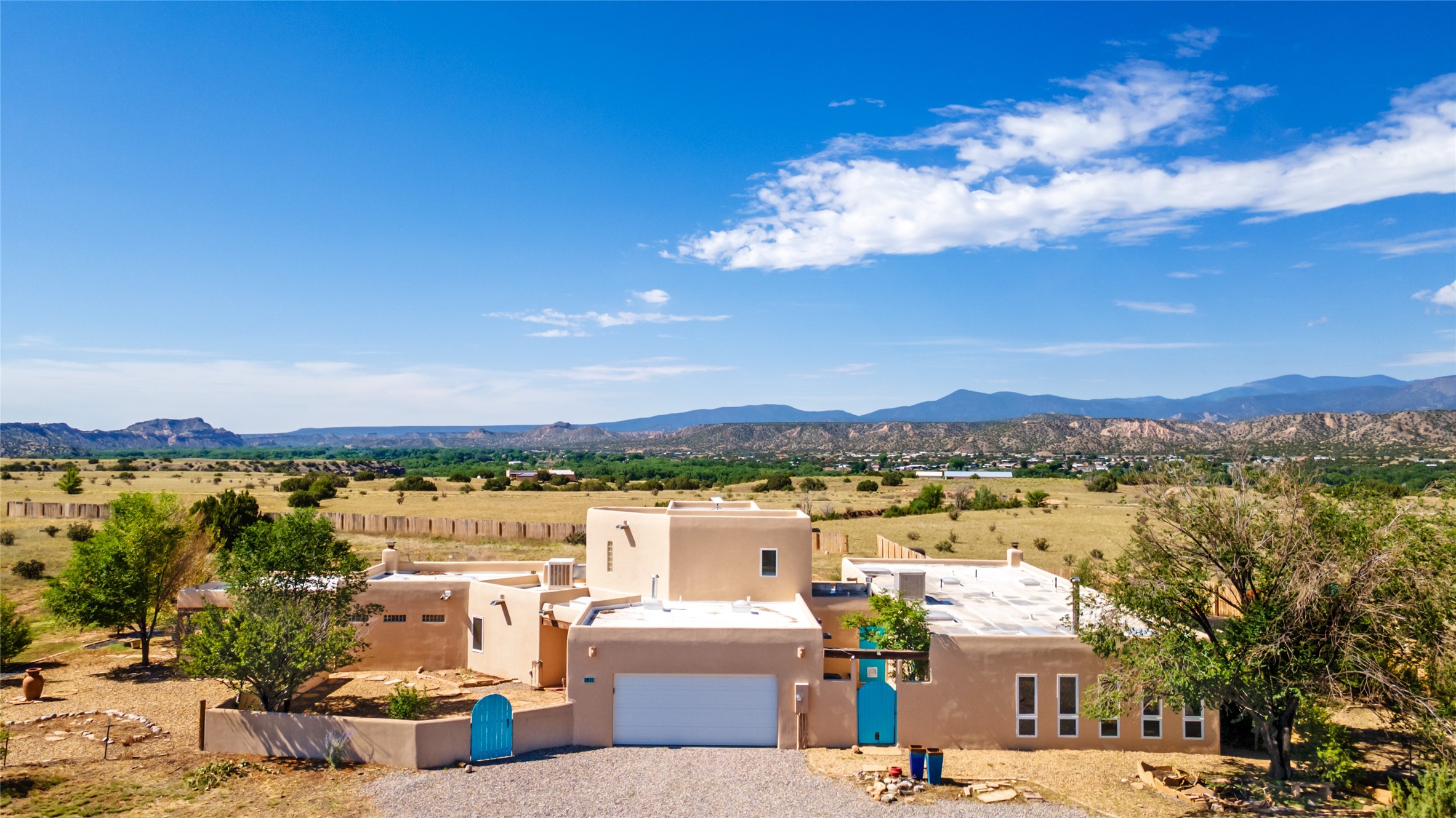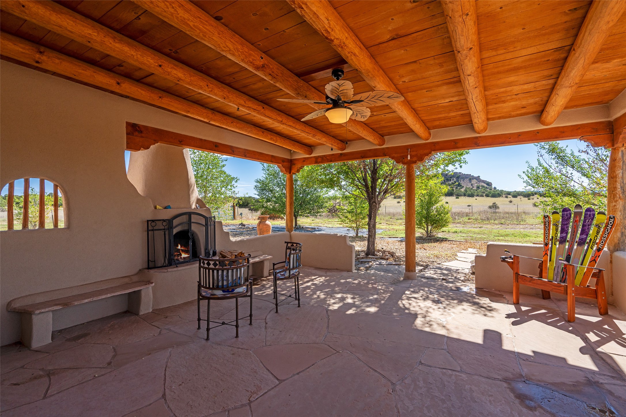 Ideally located for an easy commute to Espanola, Los Alamos and Santa Fe, this classic New Mexico-style home in the Mesa's de Medanales subdivision with No HOA! offers timeless Southwestern character, sweeping mountain views, and exceptional indoor-outdoor living. Set on five peaceful acres with horses welcome and surrounded by open vistas in every direction, the property provides an ideal balance of privacy, space, and convenience just minutes from Abiqui Lake, national forest, and Ojo Caliente Mineral Springs and Spa. At just under 4,000 square feet this mostly single level home features three spacious ensuite bedrooms, a fourth bedroom and a fourth bathroom, making it well suited for multi-generational living, guests, or flexible lifestyle needs. The main-level fourth bedroom is a large, light-filled space complete with a wood stove and cedar closet, offering excellent versatility as a guest suite, studio, or secondary living area. Throughout the home, classic Southwestern details create warmth and authenticity, including brick floors, beamed ceilings, nichos, radiant heat, multiple wood stoves, and three traditional kiva fireplaces. A generous eat-in kitchen serves as the heart of the home and opens to a formal dining room, while a dedicated office or flex space supports remote work, hobbies, or creative pursuits. All bathrooms have been tastefully remodeled with custom finishes and walk-in showers, enhancing both comfort and luxury. Outdoor living is a true highlight, with multiple serene courtyards and expansive exterior spaces designed for year-round enjoyment. A substantial covered portal with a traditional kiva fireplace invites relaxing evenings, entertaining, or simply taking in the remarkable high-desert surroundings. Recent updates add peace of mind and modern convenience, including remodeled bathrooms throughout, new stucco, updated electrical and lighting, fresh driveway gravel, security system and a water filtration and softener system.