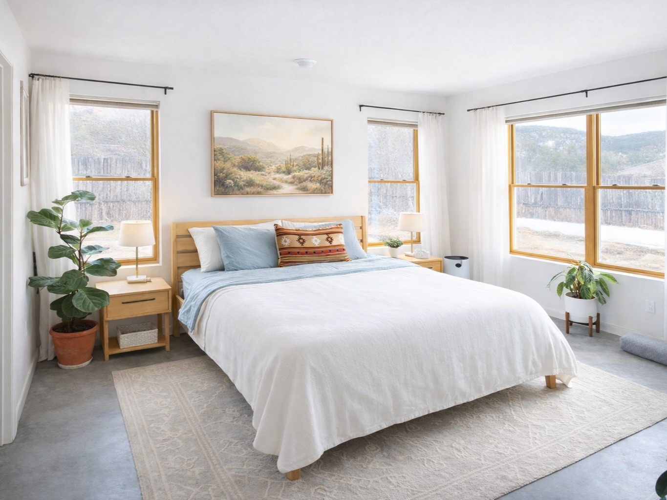 Escape to this enchanting 3-bedroom, 2-bathroom country retreat on 2.6 private acres in Lower Canoncito, just 20 minutes from the Historic Santa Fe Plaza. This sanctuary is defined by its dramatic rock formations and sweeping 360-degree views, offering a rare combination of absolute privacy and immediate access to the 4,100-acre Eldorado Preserve and the Galisteo Basin.The home's interior features an open-concept living area under soaring cathedral ceilings, leading to a large, fully fenced front perennial garden and a back portal with unobstructed "forever views" and no other properties in sight. The layout emphasizes privacy and functionality; the Owner's Suite, complete with an ensuite bathroom and walk-in closet, is situated away from the guest wing. A refreshed gallery kitchen offers ample counter space and a spacious walk-in pantry, complemented by new paint and a brand-new dish washing machine.Infrastructure and lifestyle upgrades are at the forefront of this property. A state-of-the-art NAVIEN system provides both instant hot water and efficient radiant heat, while Starlink is already installed for high-speed connectivity. The land is perfectly equipped for a homestead lifestyle, featuring a massive new livestock corral with a 10x12 barn shed and attached chicken coop. The property is fully fenced with strategic entry gates at the far end for easy access. To support the lush surroundings and water conservancy, the home utilizes a shared 12,000 gallon well with a brand new well pump and 2,000-gallon cistern/grey water systems connected to the roof of the home for rainwater catchment. This is the ultimate refuge for an artist, writer, or family to enjoy the enchanting open skies and inspiration of Northern New Mexico.