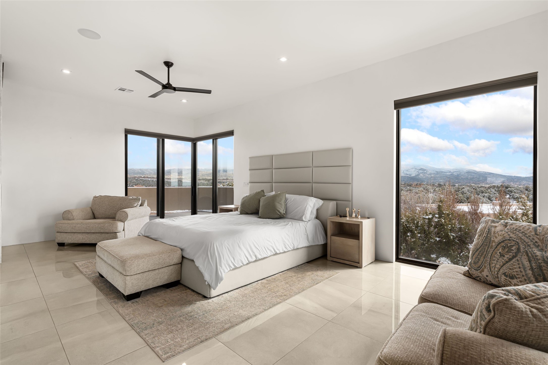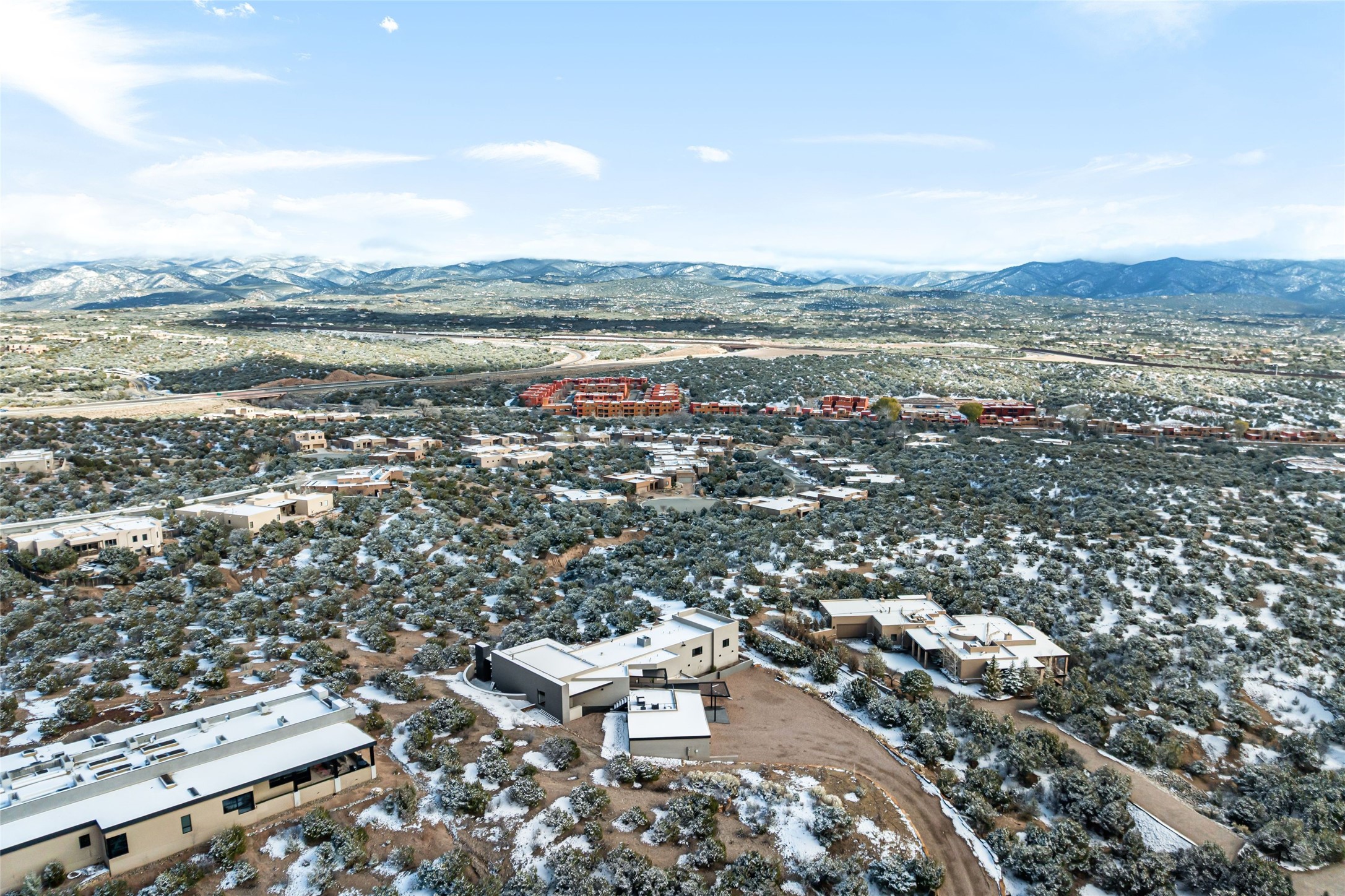 Stunning 3-bedroom custom-built home with awe-inspiring vistas of the Santa Fe's cityscape and the Sangre de Cristo mountains. This 3,500+ sq. ft. Parade of Homes winner for the Award of Excellence (2023) features Boss Builders signature style and luxury finishes throughout. The architectural design respects the traditional historical vernacular of Santa Fe style while layering on a more contemporary interpretation with classic white marble flooring, smooth plaster walls, and crisp corners. Expertly sited on a 1-acre lot, the home offers sweeping 360-degree vistas, with multiple large outdoor spaces that include two covered portals and a rooftop deck (with elevator). Entry opens to a spacious great room with a sleek gas fireplace that flows into a dining area, bar and a walk-out patio with a gas fire pit and panoramic mountain views. Dramatic open gourmet kitchen is appointed with top-of-the-line Sub-Zero and Wolf appliances, black marble counter tops, crisp white cabinetry and a grand center island with room to seat four. With 3 bedrooms, 3 full bathrooms and a flexible studio or media room, the home was designed to adapt to a variety of lifestyles. The primary suite is a private retreat, featuring a corner pocketing slider to its own patio, a spa-like bath with soaking tub, double-sided fireplace, walk-in shower, and generous closet space. Laundry room with sink and plentiful cabinetry. 3 -car garage. Excellent north side location just minutes from the Santa Fe Plaza, Canyon Road and Museum Hill.