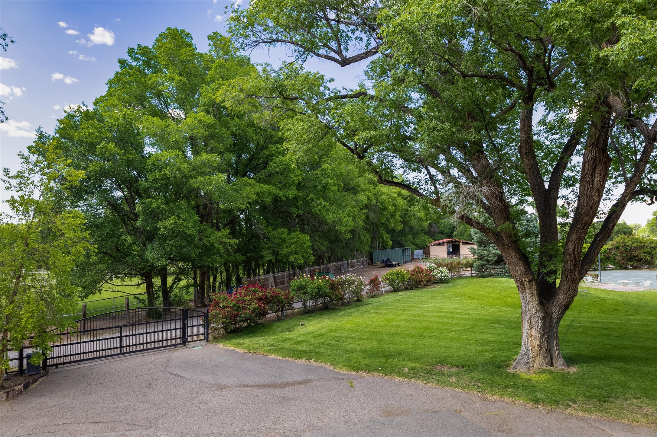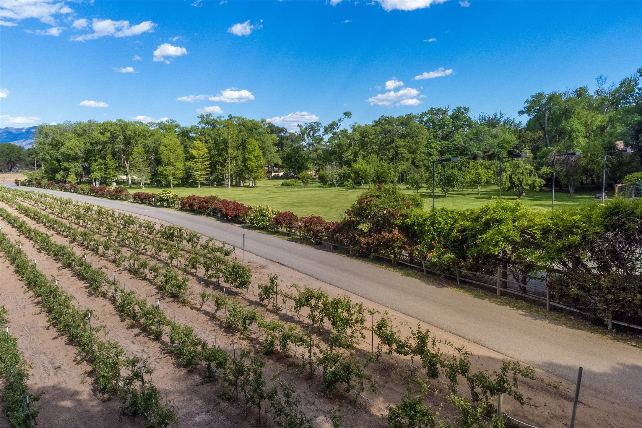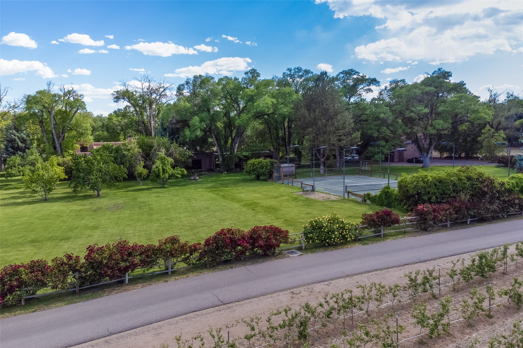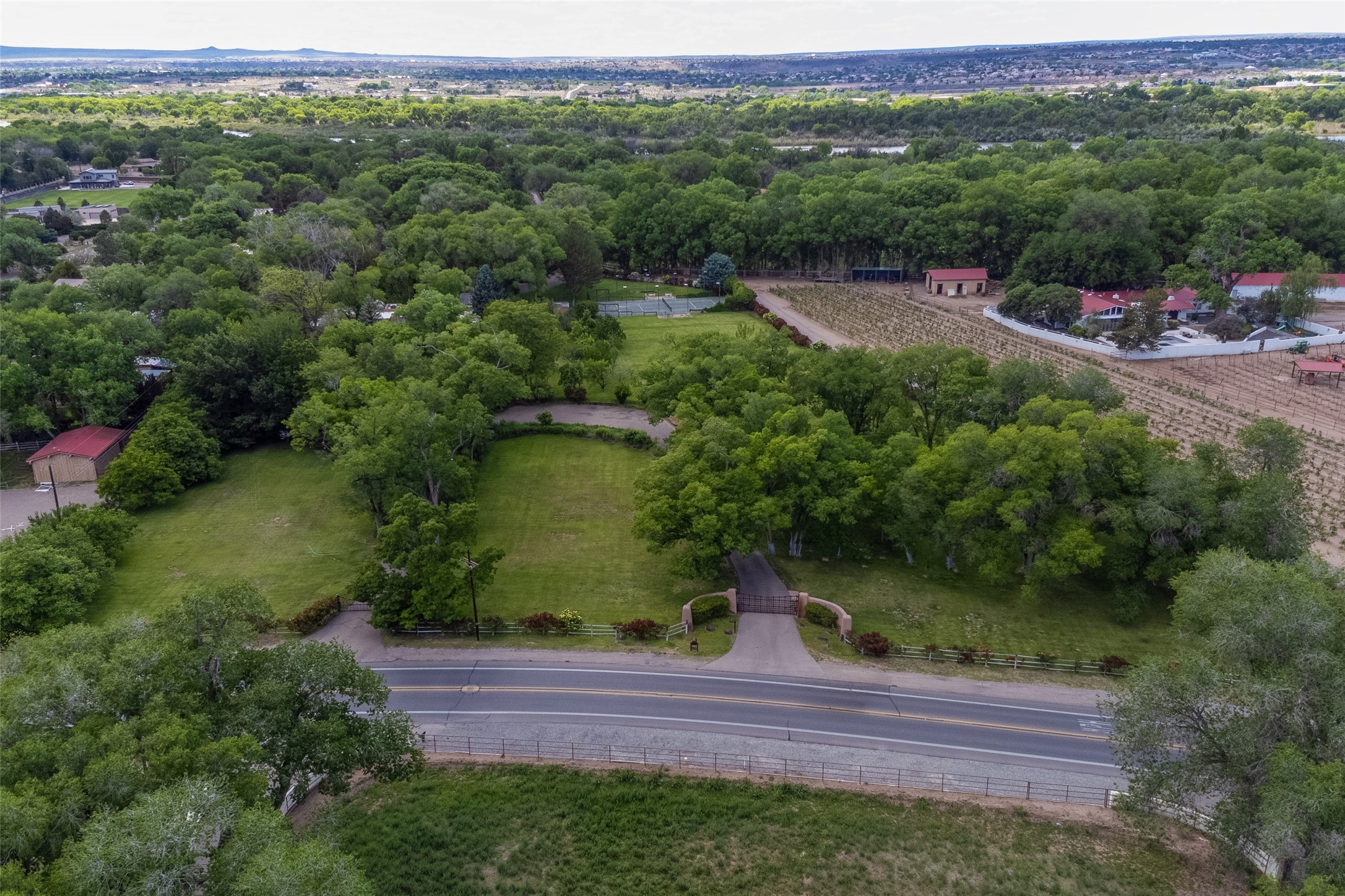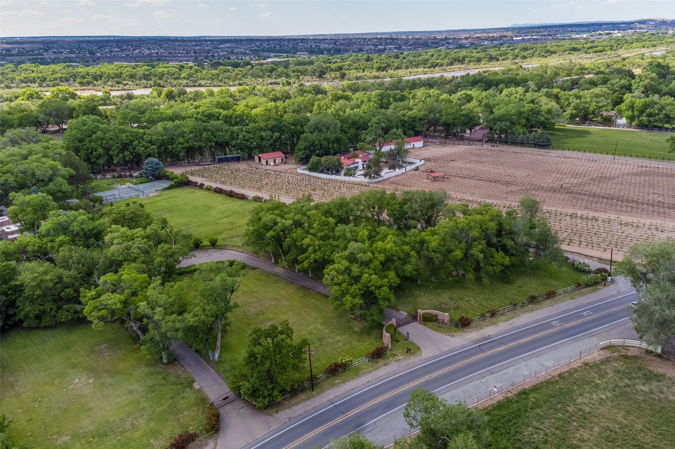 This one of a kind property in the North Valley of Los Ranchos de Albuquerque offers a unique opportunity to own a piece of history and luxury in a picturesque setting. This original 1850s ranch, located in Los Ranchos de Albuquerque, spans over 8 acres of beautifully landscaped yards, adorned with 100-year-old trees. The property also boasts 2 acres of vineyard, producing award-winning grapes for world-class wines. Rare 1906 water rights on the property, but also the connivence of city water to the house.The main house, constructed around the original 19th century ranch house, with over 9000 square feet of Double Adobe, exudes timeless elegance. Its hand-carved wood doors, massive carved wood beams, and soaring ceilings reflect the craftsmanship of a bygone era.The attention to detail is evident in the hand-painted ceiling of the piano room and the dedicated wine room. A Bell tower greets you at the main entrance, with an antique bell and massive carved wood doors. Step back in time as you stroll through the portal with hand carved doors and tapered wood pillars leading to the open patio and garden area.For those who appreciate outdoor activities, the property features one of the only clay tennis courts in New Mexico, offering a unique recreational opportunity. Additionally, a spacious 4-car garage with a workshop, remodeled greenhouse provides ample space for hobbies and storage. A 670sf Casita or Bonus room constructed with the same detail as the main house awaits your vision. A duplex with bedrooms, full baths, fireplaces, sit on top of the 4 car garage with mountain views and private entrances, a very inviting living space.This property is not just a home; it's a testament to history, craftsmanship, and luxury living. It offers a rare combination of natural beauty, historical significance, and modern amenities. Whether you're drawn to the allure of winemaking or seeking a serene retreat in a stunning landscape,