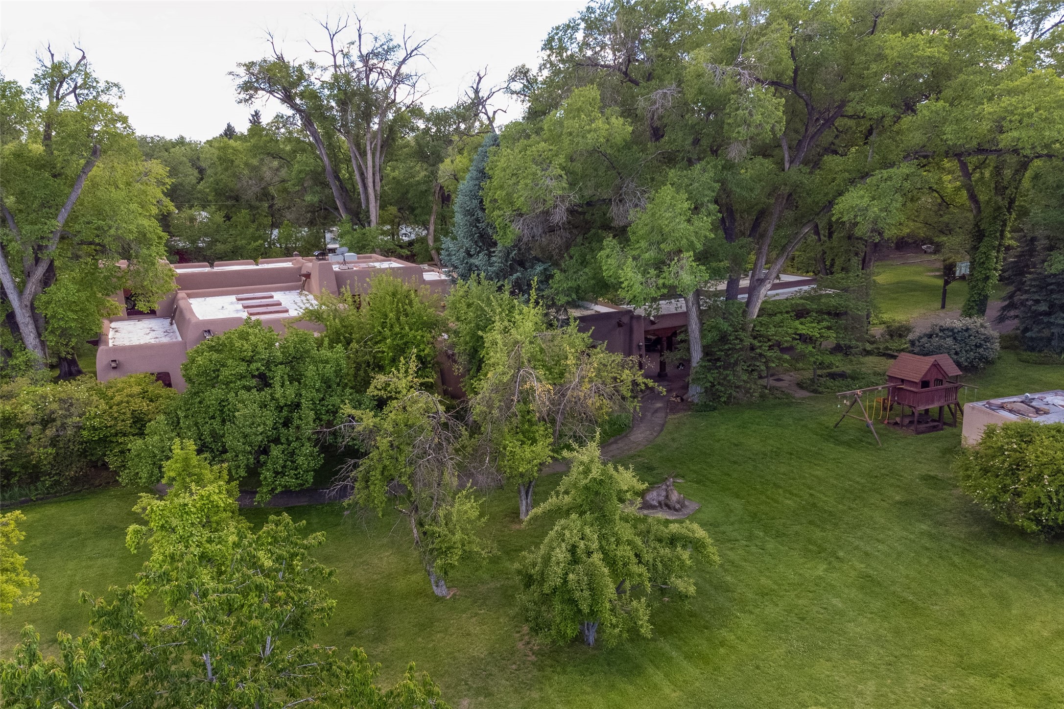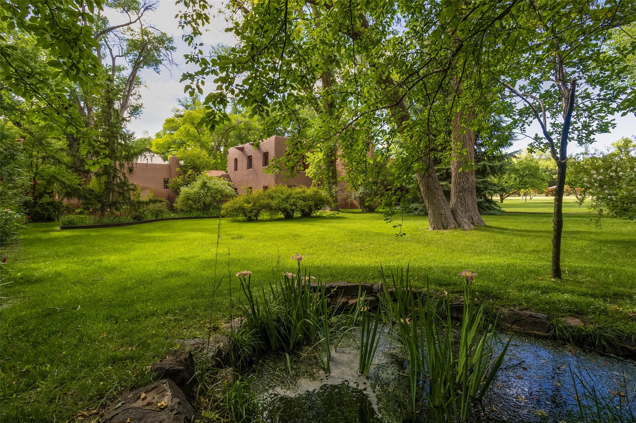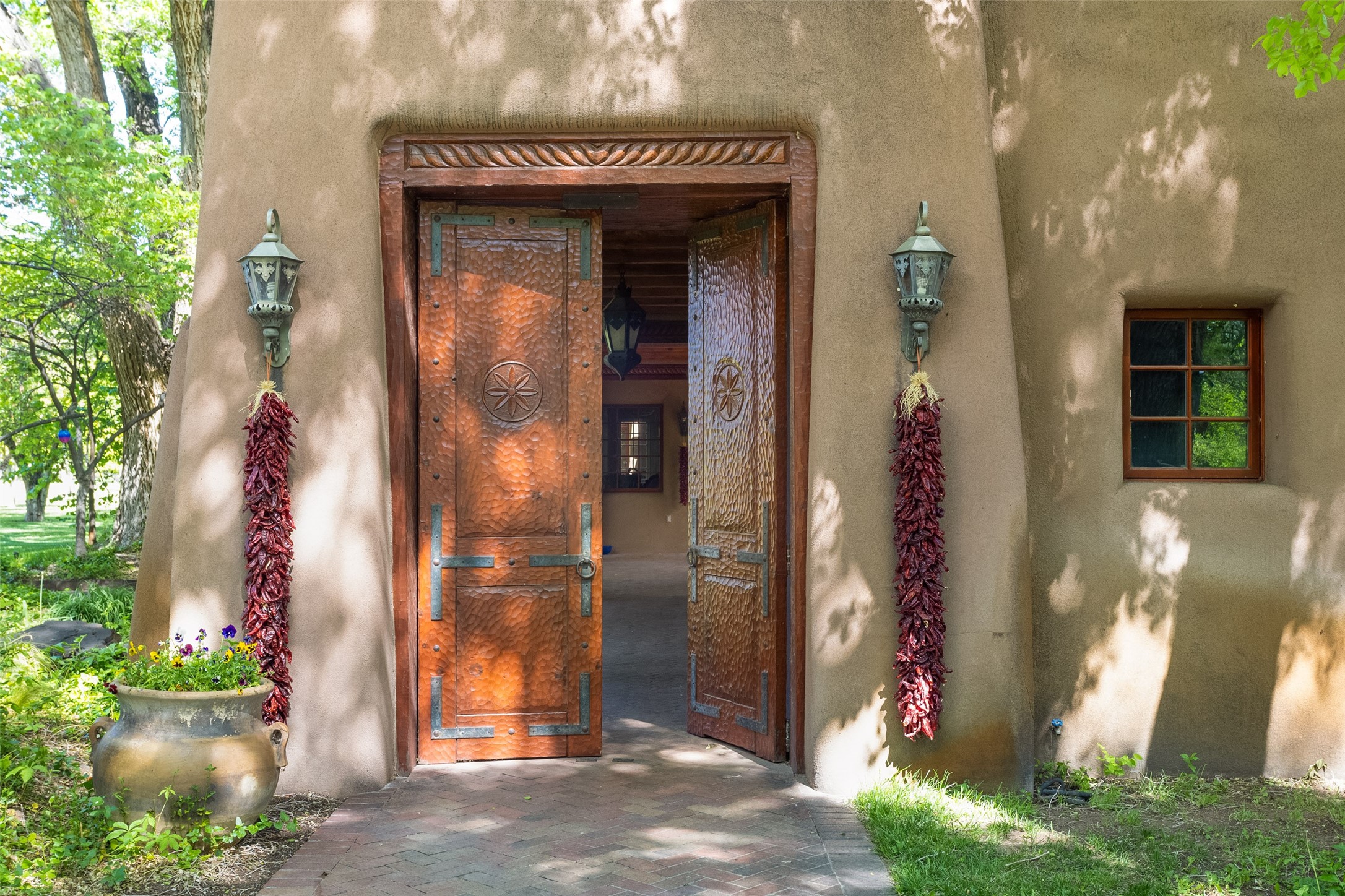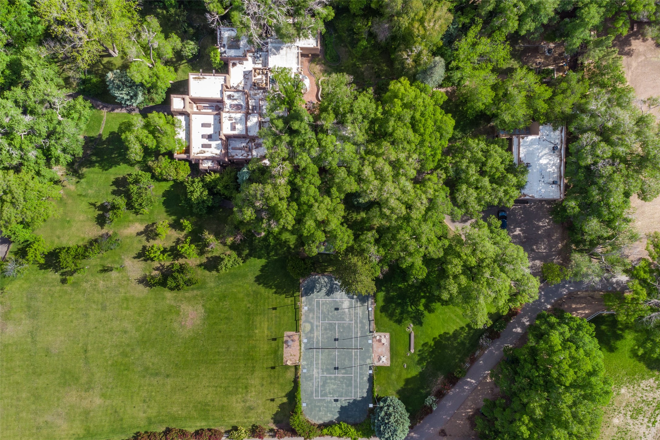 This one of a kind property in the North Valley of Los Ranchos de Albuquerque offers a unique opportunity to own a piece of history and luxury in a picturesque setting. This original 1850s ranch, located in Los Ranchos de Albuquerque, spans over 8 acres of beautifully landscaped yards, adorned with 100-year-old trees. The property also boasts 2 acres of vineyard, producing award-winning grapes for world-class wines. Rare 1906 water rights on the property, but also the connivence of city water to the house.The main house, constructed around the original 19th century ranch house, with over 9000 square feet of Double Adobe, exudes timeless elegance. Its hand-carved wood doors, massive carved wood beams, and soaring ceilings reflect the craftsmanship of a bygone era.The attention to detail is evident in the hand-painted ceiling of the piano room and the dedicated wine room. A Bell tower greets you at the main entrance, with an antique bell and massive carved wood doors. Step back in time as you stroll through the portal with hand carved doors and tapered wood pillars leading to the open patio and garden area.For those who appreciate outdoor activities, the property features one of the only clay tennis courts in New Mexico, offering a unique recreational opportunity. Additionally, a spacious 4-car garage with a workshop, remodeled greenhouse provides ample space for hobbies and storage. A 670sf Casita or Bonus room constructed with the same detail as the main house awaits your vision. A duplex with bedrooms, full baths, fireplaces, sit on top of the 4 car garage with mountain views and private entrances, a very inviting living space.This property is not just a home; it's a testament to history, craftsmanship, and luxury living. It offers a rare combination of natural beauty, historical significance, and modern amenities. Whether you're drawn to the allure of winemaking or seeking a serene retreat in a stunning landscape,