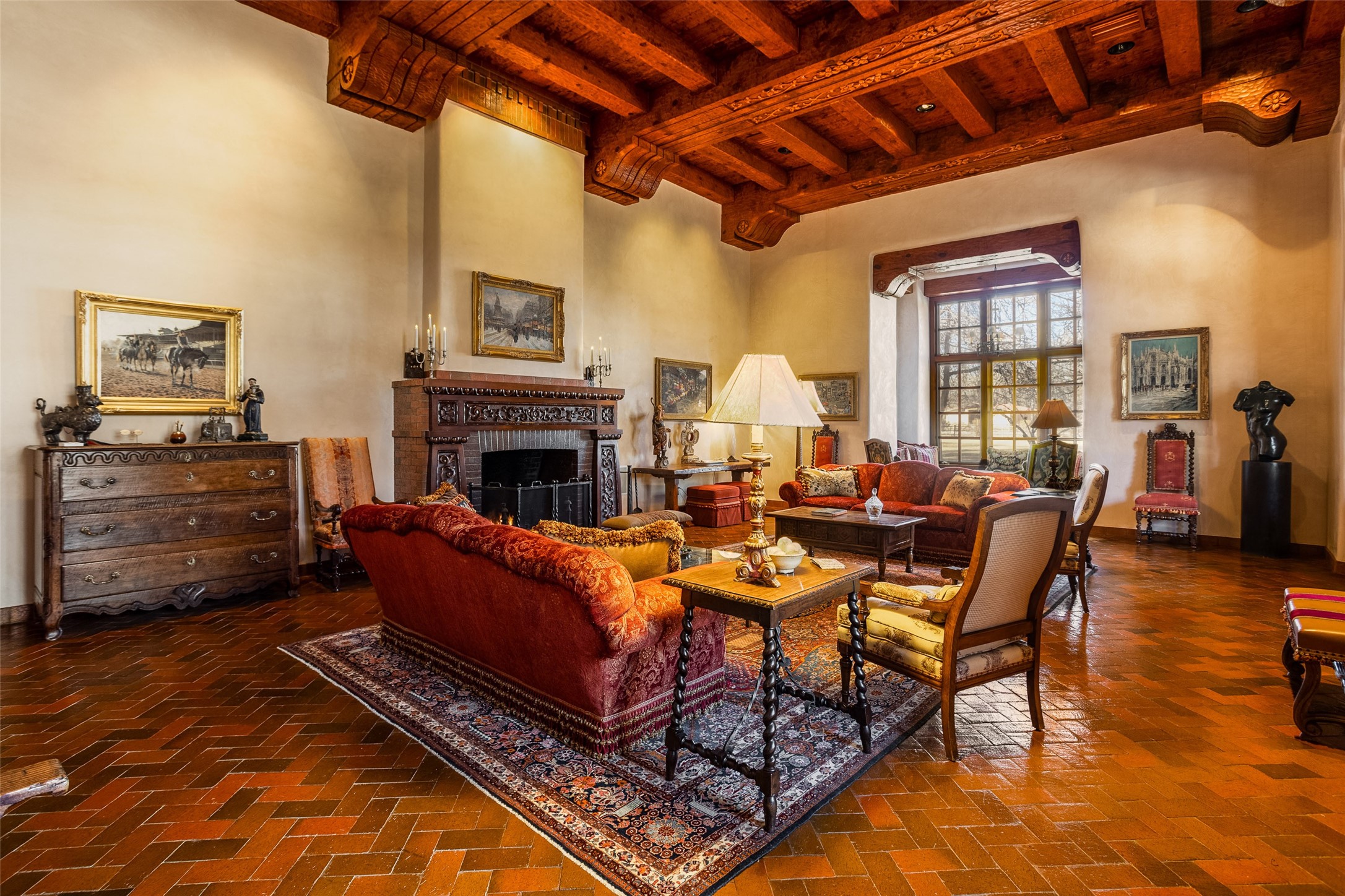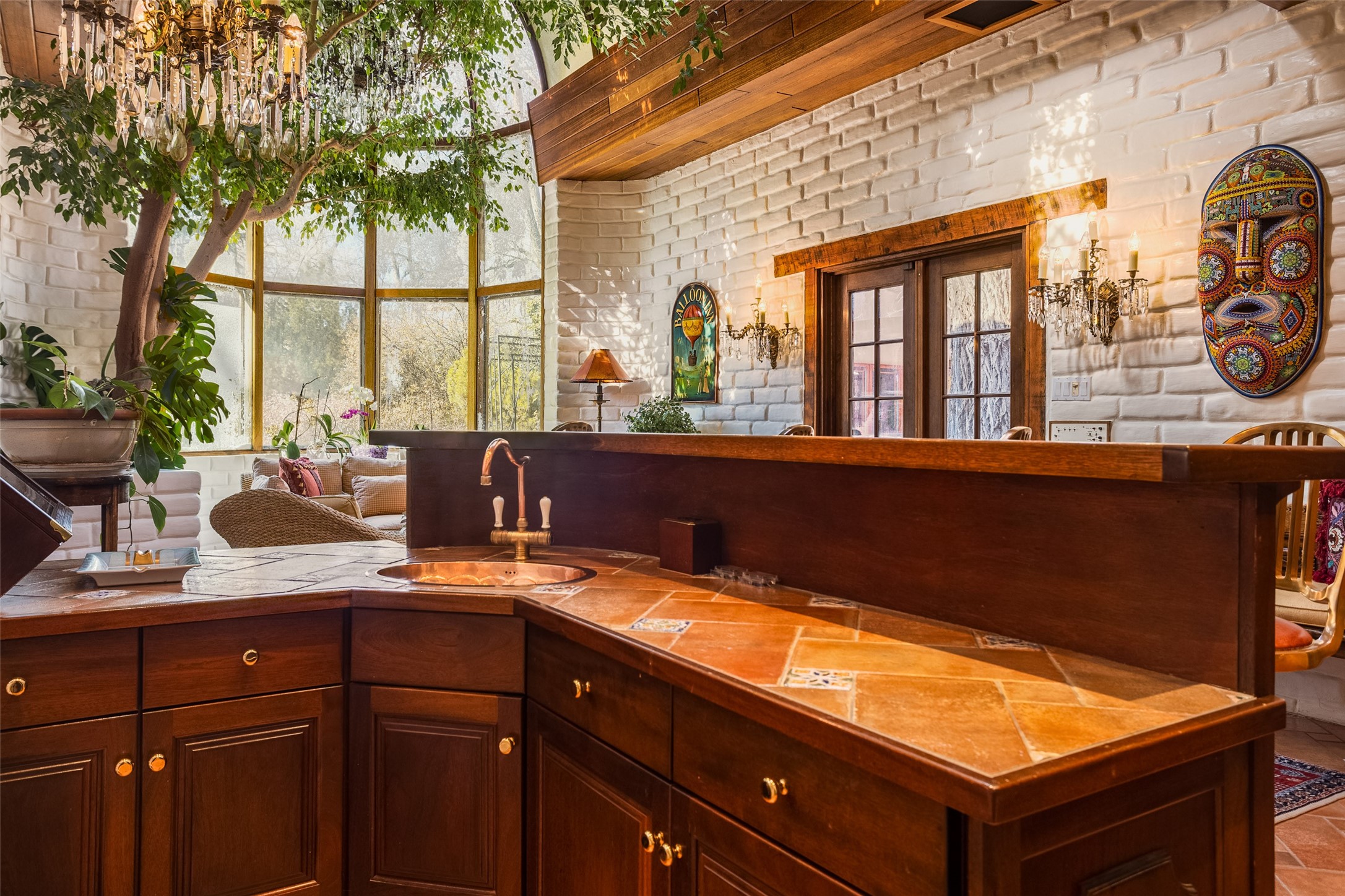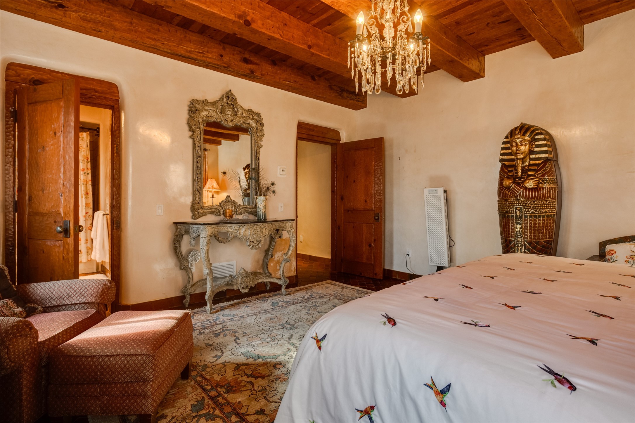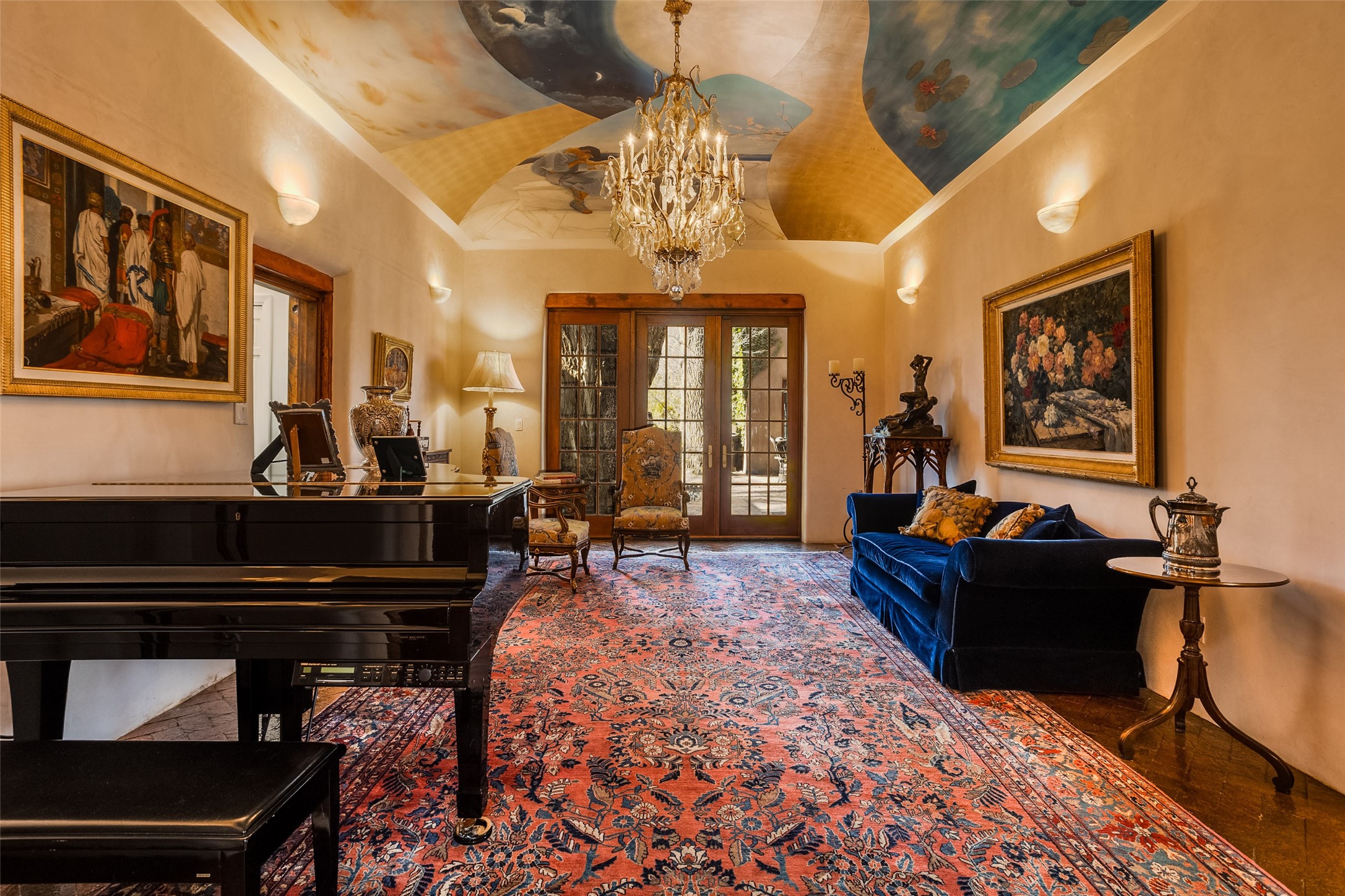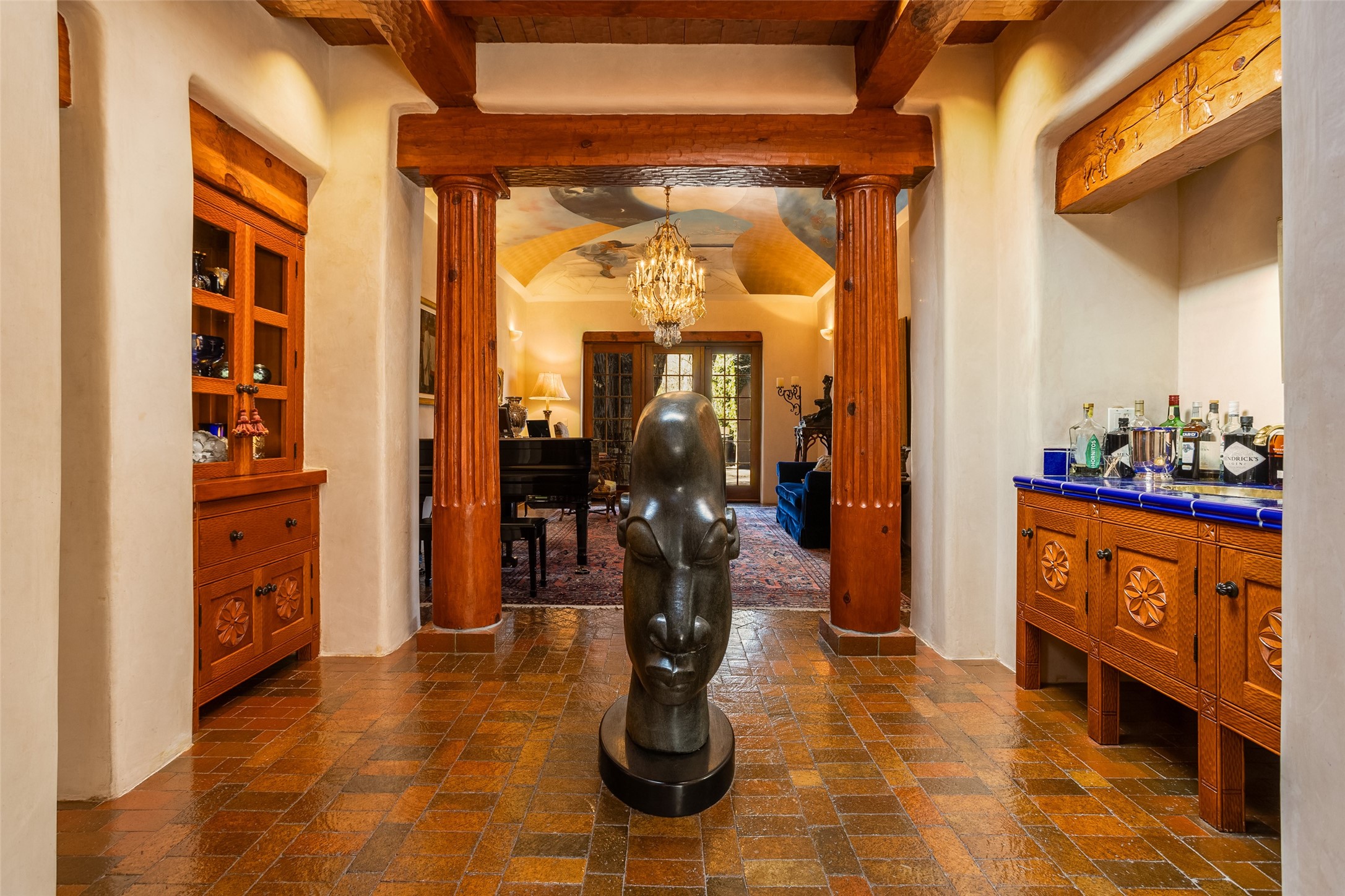 This one of a kind property in the North Valley of Los Ranchos de Albuquerque offers a unique opportunity to own a piece of history and luxury in a picturesque setting. This original 1850s ranch, located in Los Ranchos de Albuquerque, spans over 8 acres of beautifully landscaped yards, adorned with 100-year-old trees. The property also boasts 2 acres of vineyard, producing award-winning grapes for world-class wines. Rare 1906 water rights on the property, but also the connivence of city water to the house.The main house, constructed around the original 19th century ranch house, with over 9000 square feet of Double Adobe, exudes timeless elegance. Its hand-carved wood doors, massive carved wood beams, and soaring ceilings reflect the craftsmanship of a bygone era.The attention to detail is evident in the hand-painted ceiling of the piano room and the dedicated wine room. A Bell tower greets you at the main entrance, with an antique bell and massive carved wood doors. Step back in time as you stroll through the portal with hand carved doors and tapered wood pillars leading to the open patio and garden area.For those who appreciate outdoor activities, the property features one of the only clay tennis courts in New Mexico, offering a unique recreational opportunity. Additionally, a spacious 4-car garage with a workshop, remodeled greenhouse provides ample space for hobbies and storage. A 670sf Casita or Bonus room constructed with the same detail as the main house awaits your vision. A duplex with bedrooms, full baths, fireplaces, sit on top of the 4 car garage with mountain views and private entrances, a very inviting living space.This property is not just a home; it's a testament to history, craftsmanship, and luxury living. It offers a rare combination of natural beauty, historical significance, and modern amenities. Whether you're drawn to the allure of winemaking or seeking a serene retreat in a stunning landscape,
