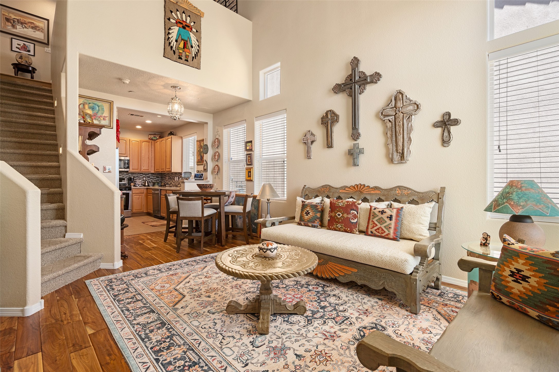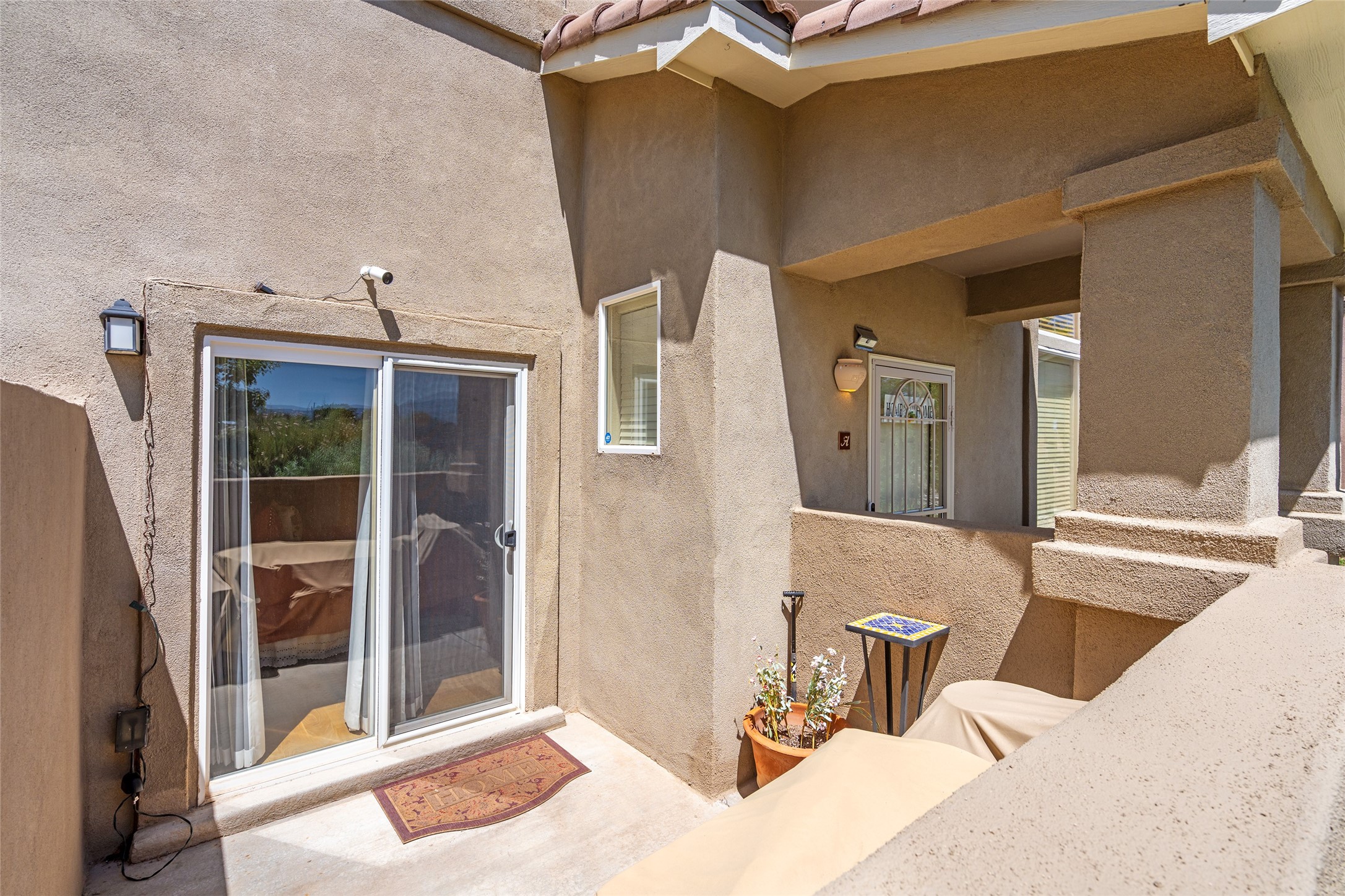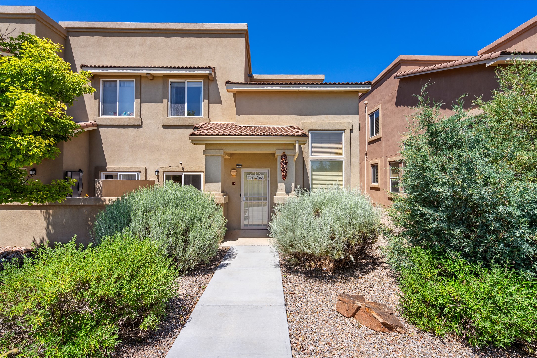 You are going to love this executive-style condo in Santa Fe! Whether you're seeking the perfect starter home or a stylish lock-and-leave retreat, this beautifully upgraded residence offers comfort, convenience, and modern flair. Engineered wood floors and soaring ceilings in the living area create a warm and elegant ambiance, enhanced by abundant natural light from the many windows. The well-appointed kitchen features stainless steel appliances, solid surface Corian countertops, a custom tile backsplash, ample cabinetry, and a generous pantry--ideal for any home chef. The spacious primary suite is conveniently located on the main level and opens to a private, enclosed courtyard--perfect for morning coffee or quiet evenings. The ensuite bath includes a soaking tub, separate shower, and a large walk-in closet for all your storage needs. Upstairs, a flexible loft space offers endless potential as a home office, den, or creative studio. A secondary bedroom enjoys lovely mountain views, and guests will appreciate the separate full bath. Stylish LVT wood flooring continues throughout the upper level, adding warmth and continuity. Additional features include custom blinds, ceiling fans, upgraded lighting, and a high-end Bosch washer and dryer. This turnkey home is ideally located near a variety of shops and restaurants, making day-to-day living effortlessly convenient. HOA dues cover exterior maintenance, roof, and insurance--providing peace of mind and a low-maintenance lifestyle. Some of the furnishings are available for separate bill of sale.