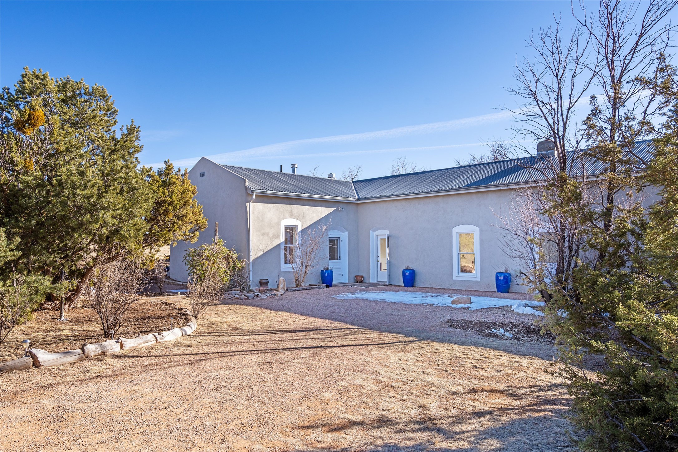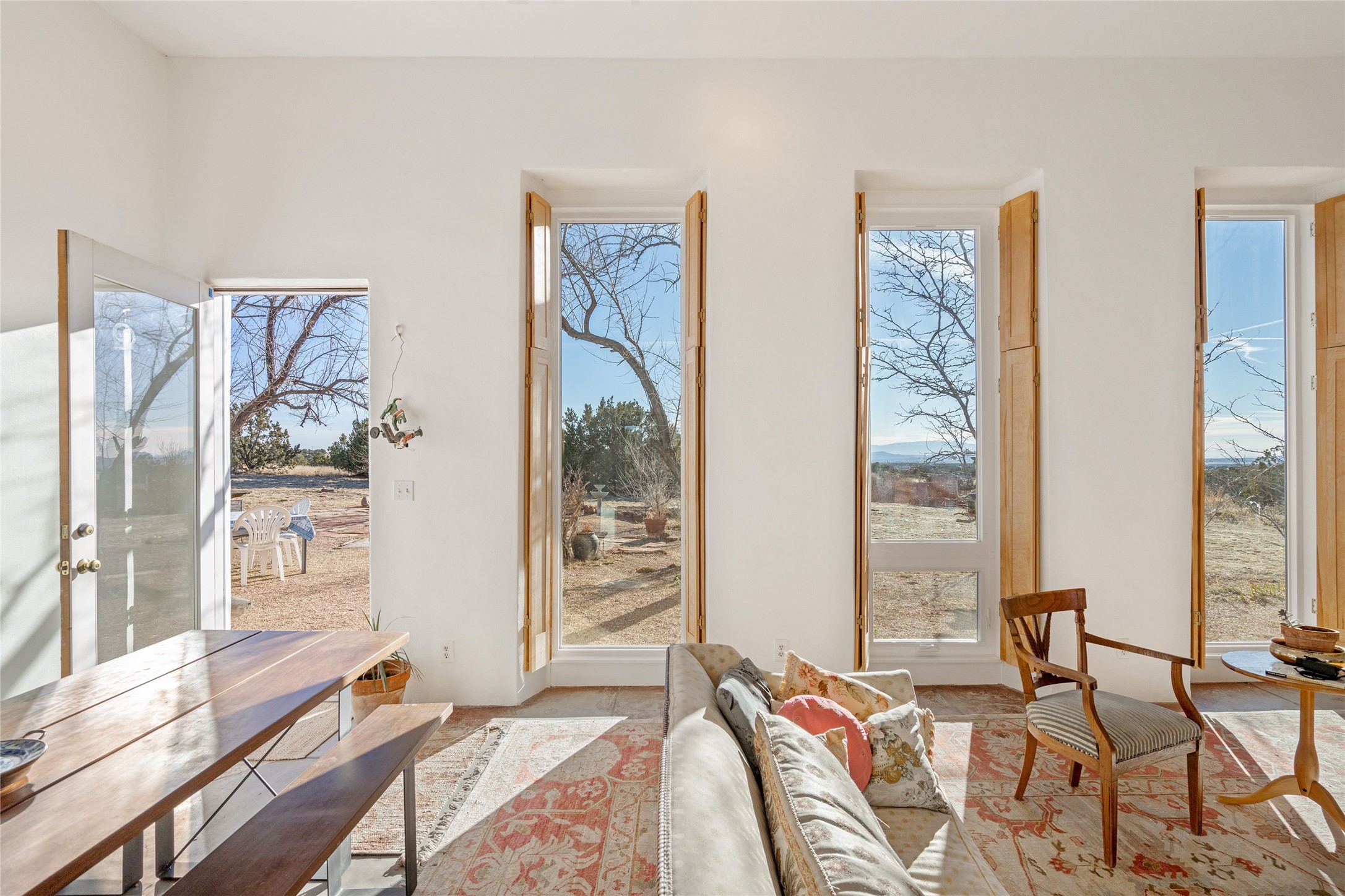 Elegant European-style farmhouse on 5 acres in Arroyo Hondo. This eco-friendly, passive solar residence is built from pumice-crete with flawless proportions and an abundance of light streamingin from the floor to ceiling windows. The country kitchen and gracious living room with Rumford fireplace create a generous separation of space between the two en suite bedrooms. Twelve-to-thirteen-foot ceilings, concrete floors with radiant heat throughout, lime-washed exterior walls, and a classic pitched metal roof make for an understated refined aesthetic. This tranquil property is well sited on a meadow with views of the Sandias, Ortiz, and Sangre de Cristo mountain ranges.
