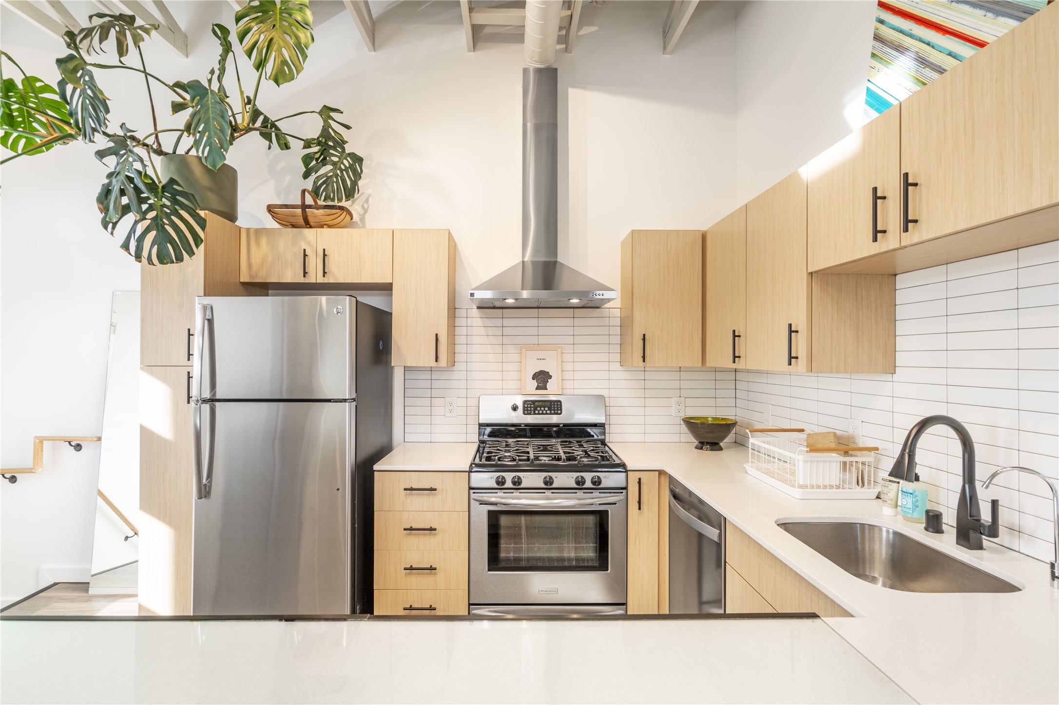 Corner unit with a wraparound balcony and mountain views in central Santa Fe, built in 2022 and lightly used, offering modern loft living and an ideal work-from-home setup. Approximately 1,126 square feet across two levels with an even split between floors, the east- and south-facing orientation fills the space with natural light throughout the day. Upstairs features an open studio-style living area, a luxury bathroom, and access to a private balcony to take in the mountain views. The kitchen is well-appointed with quartz countertops, subway tile backsplash, full-size appliances, and ample space for cooking. Downstairs showcases concrete floors, an ADA-compliant bathroom, large glass roll-up garage door, and useful storage closets, creating flexible space for work, studio, or showroom use. Both floors are equipped with mini-splits, blinds, ceiling fans, track lighting, and smooth drywall. Energy-efficient features include an on-demand water heater and two dedicated grid-tied solar panels. Washer and dryer hookups are in place (existing washer and dryer do not convey), and the Murphy bed conveys, yet mattress does not. Hardwired for high-speed cable. HOA dues are $225 per month and include dumpster service, parking, landscaping, exterior building maintenance, and insurance, with an estimated $700 HOA sign-up fee.