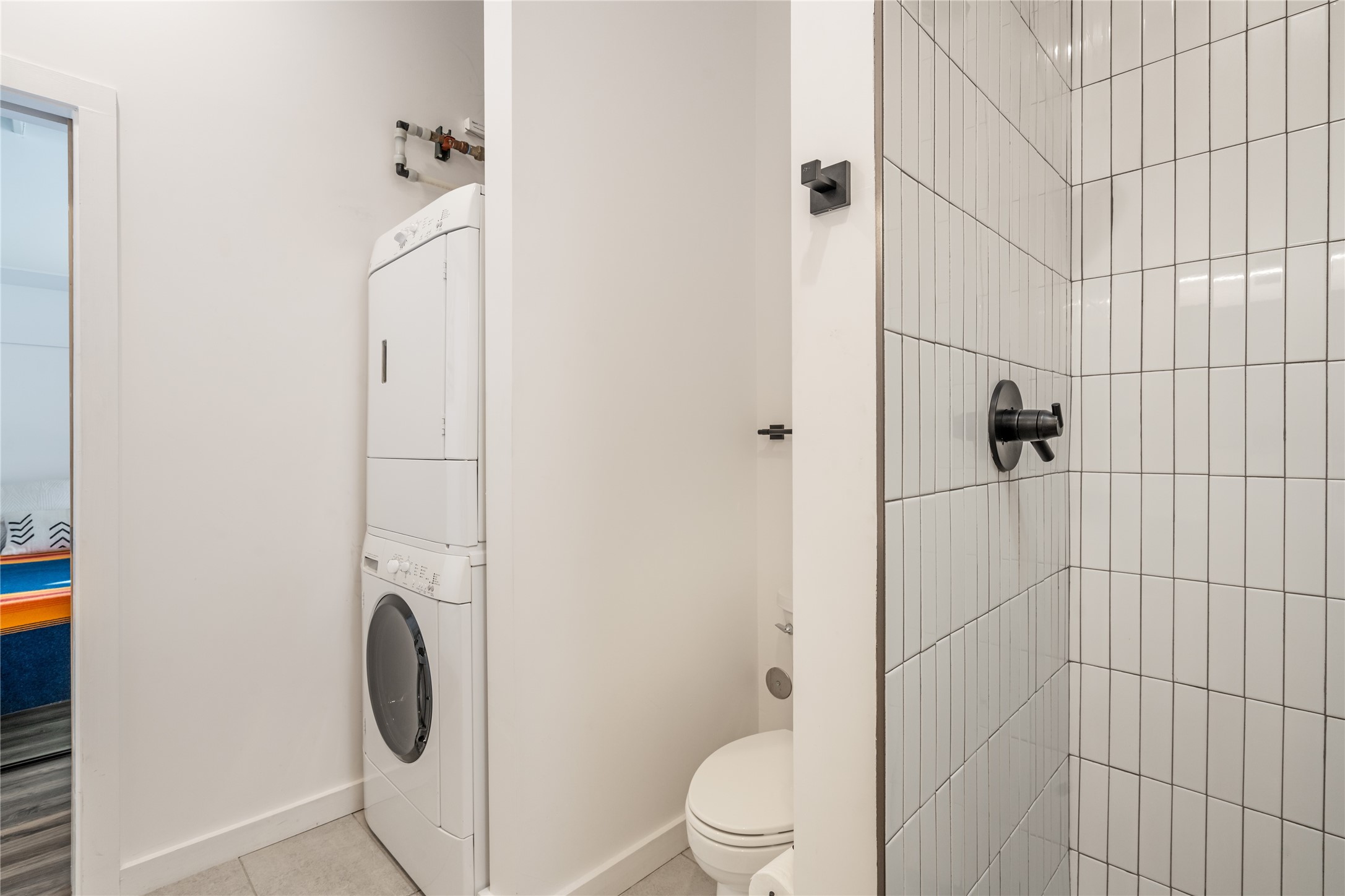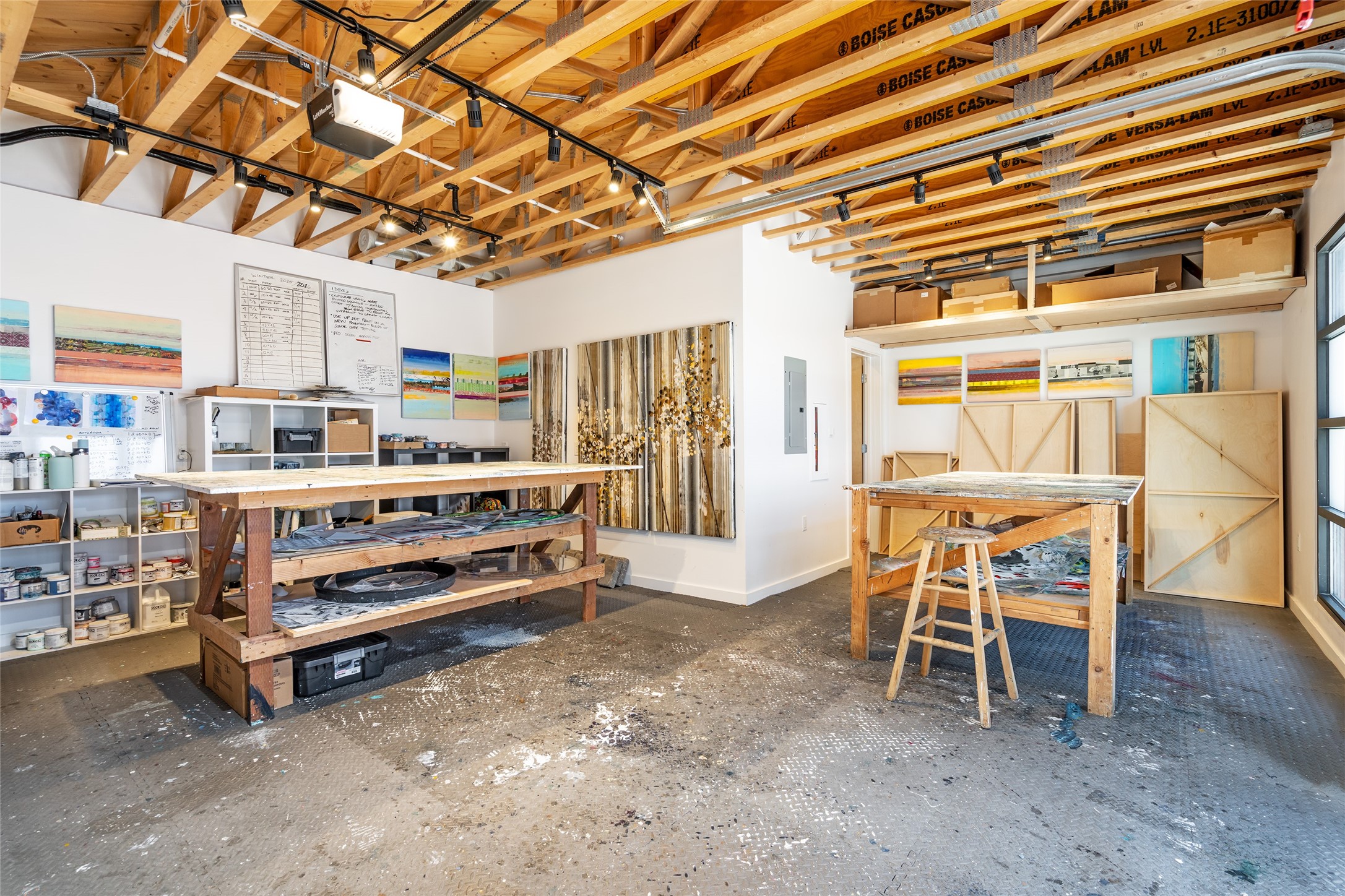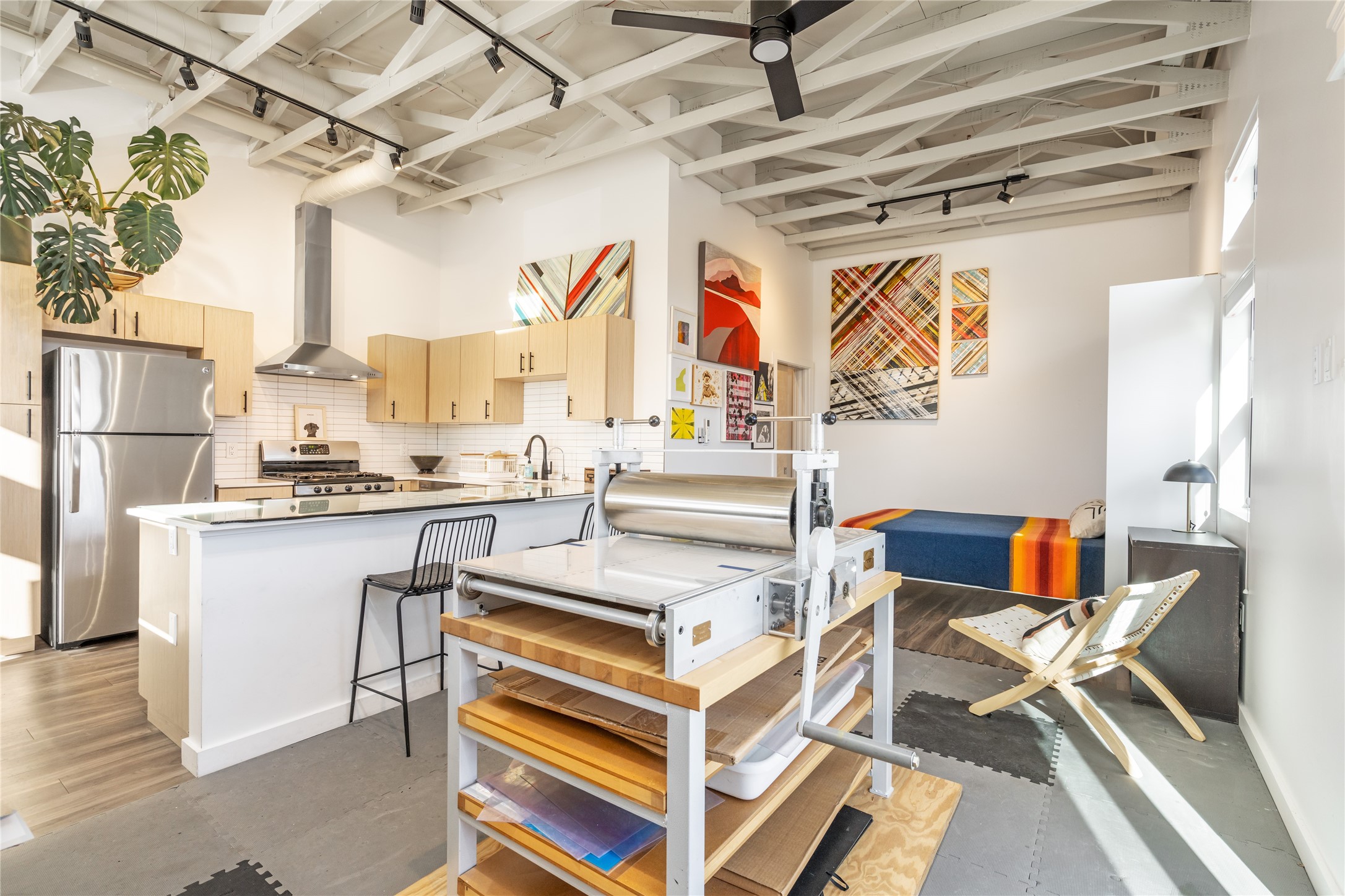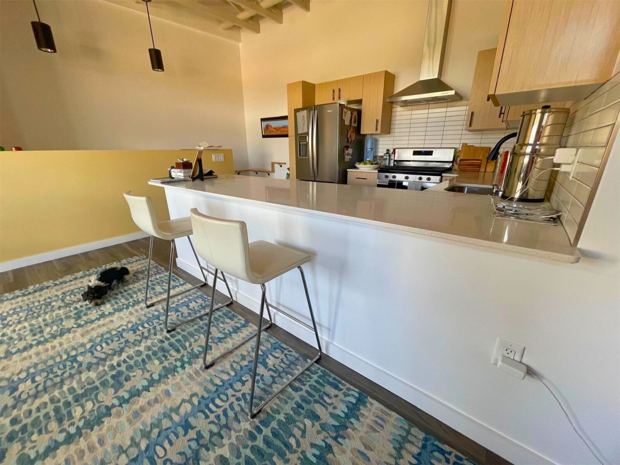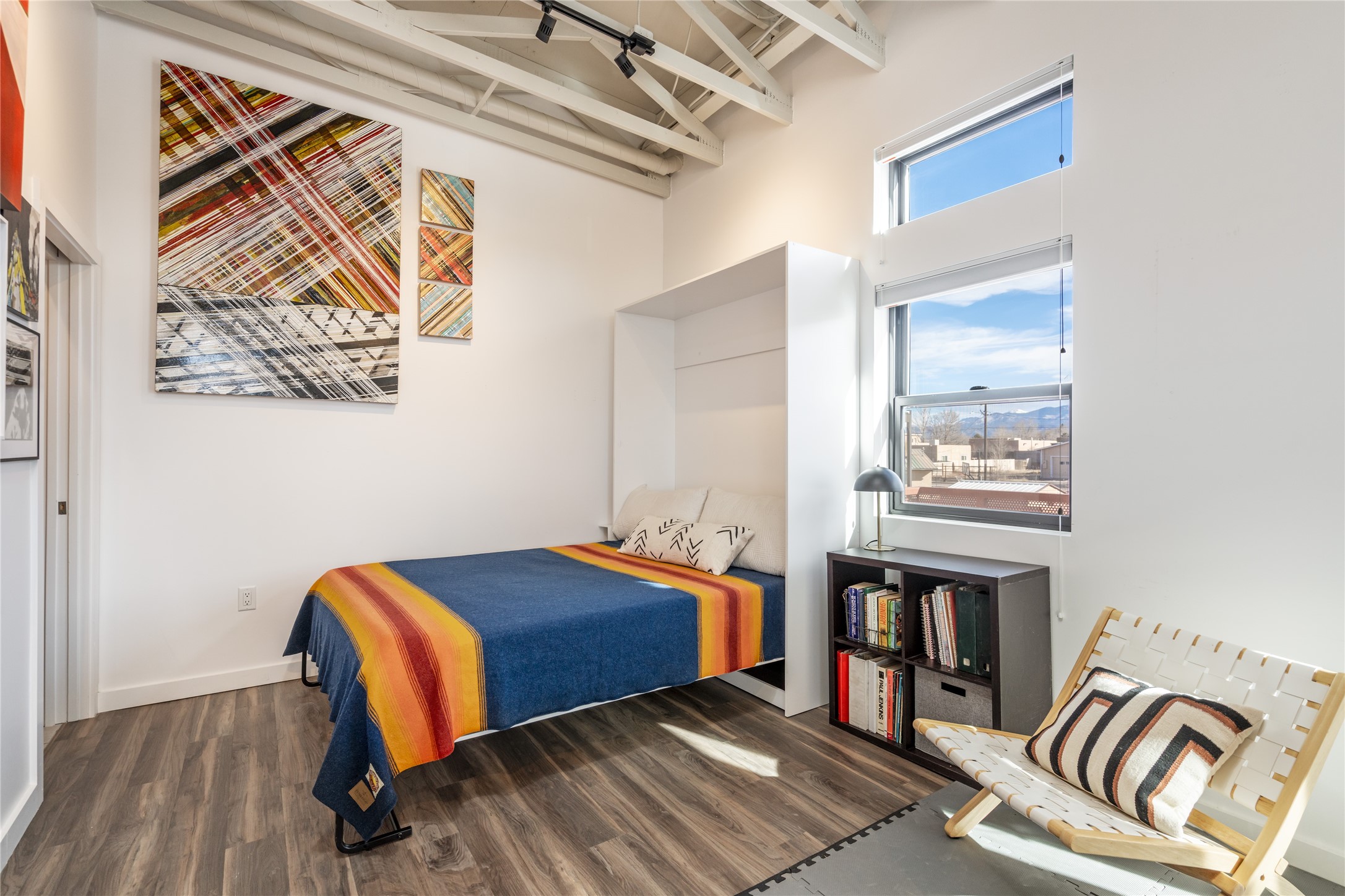Corner unit with a wraparound balcony and mountain views in central Santa Fe, built in 2022 and lightly used, offering modern loft living and an ideal work-from-home setup. Approximately 1,126 square feet across two levels with an even split between floors, the east- and south-facing orientation fills the space with natural light throughout the day. Upstairs features an open studio-style living area, a luxury bathroom, and access to a private balcony to take in the mountain views. The kitchen is well-appointed with quartz countertops, subway tile backsplash, full-size appliances, and ample space for cooking. Downstairs showcases concrete floors, an ADA-compliant bathroom, large glass roll-up garage door, and useful storage closets, creating flexible space for work, studio, or showroom use. Both floors are equipped with mini-splits, blinds, ceiling fans, track lighting, and smooth drywall. Energy-efficient features include an on-demand water heater and two dedicated grid-tied solar panels. Washer and dryer hookups are in place (existing washer and dryer do not convey), and the Murphy bed conveys, yet mattress does not. Hardwired for high-speed cable. HOA dues are $225 per month and include dumpster service, parking, landscaping, exterior building maintenance, and insurance, with an estimated $700 HOA sign-up fee.