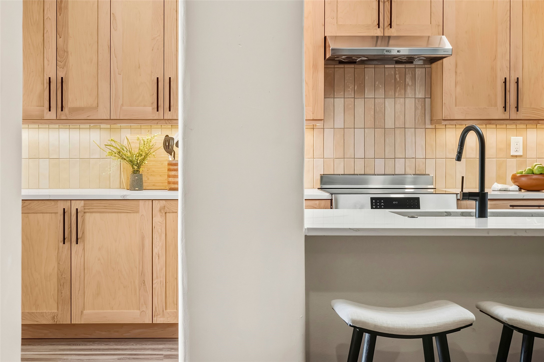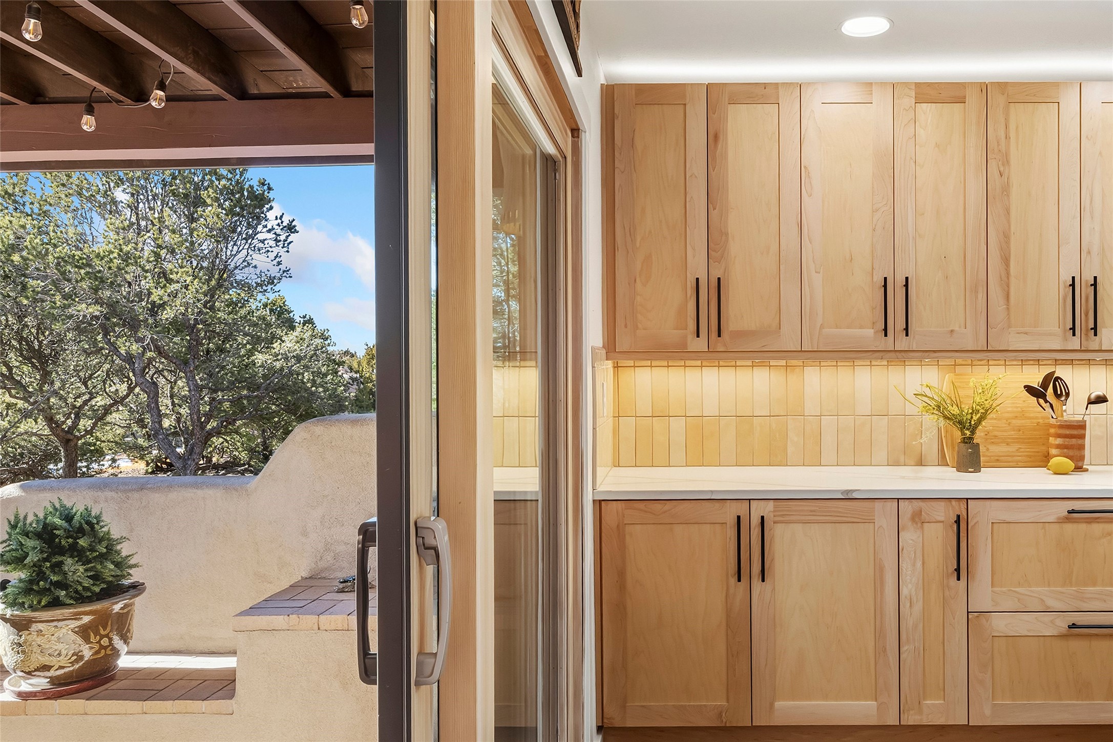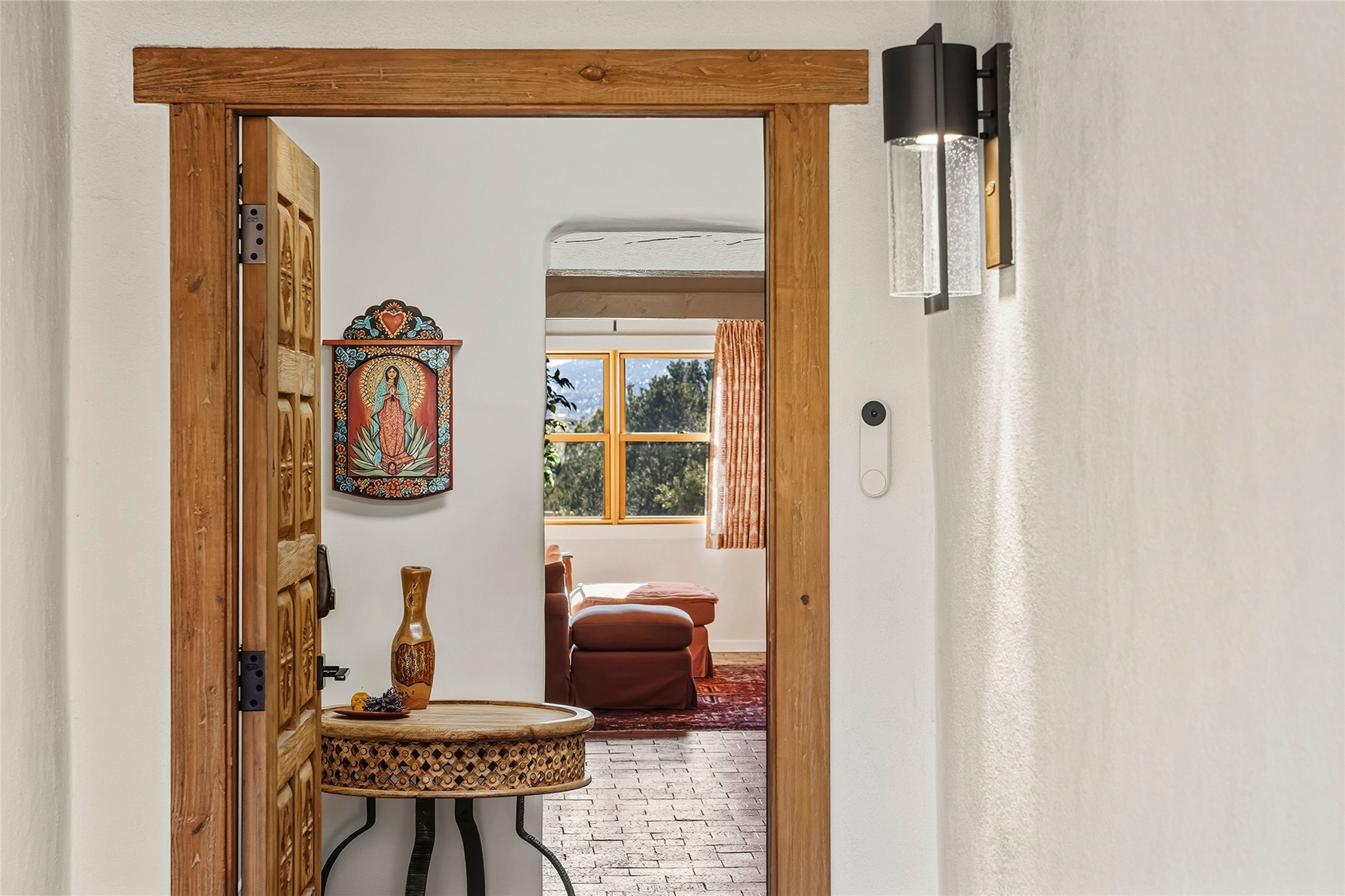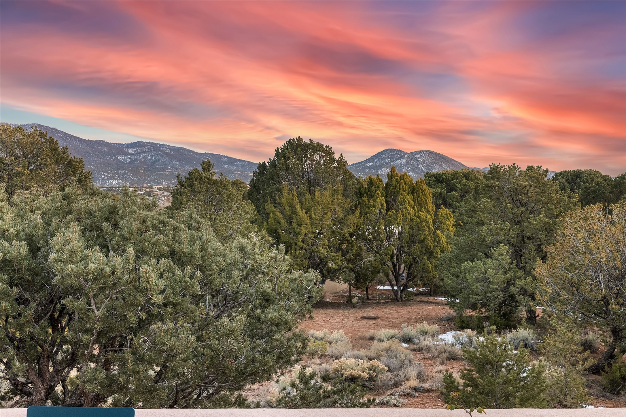 Perched at the top of the hill, this exceptionally renovated single-level end-unit condominium offers privacy and breathtaking Sangre de Cristo Mountain views. This three-bedroom, two-bath residence on the desirable north side provides convenient access to downtown Santa Fe (approximately one mile away), nearby arroyo trails, the Ski Basin, mountain recreation, and Los Alamos. Thoughtfully and extensively updated inside and out by the current owner with over $350,000 in upgrades since 2022 which includes stucco, HVAC, bathrooms, kitchen and much more. This home blends classic Santa Fe charm with modern comfort with a locally sourced custom carved wood front door, wood beamed ceilings, a corner Kiva fireplace and brick floors. A proper foyer welcomes you inside, and the well-designed floor plan offers comfortable flow, excellent bedroom separation and generous use of skylights that fill the home with natural light. The spacious primary suite features greenbelt and mountain top views, a large walk-in closet, LVP flooring, a renovated bathroom with dual sinks and a soaking tub/shower combo.The renovated kitchen showcases updated cabinetry, quartz countertops, Bosch stainless steel induction cooktop/oven, upgraded lighting, laundry room and direct access to the one car garage. The rear portal opens to a peaceful greenbelt creating a tranquil setting for relaxing while enjoying sunset, mountain and city views. This condo offers a rare combination of location, privacy, views, and quality updates.