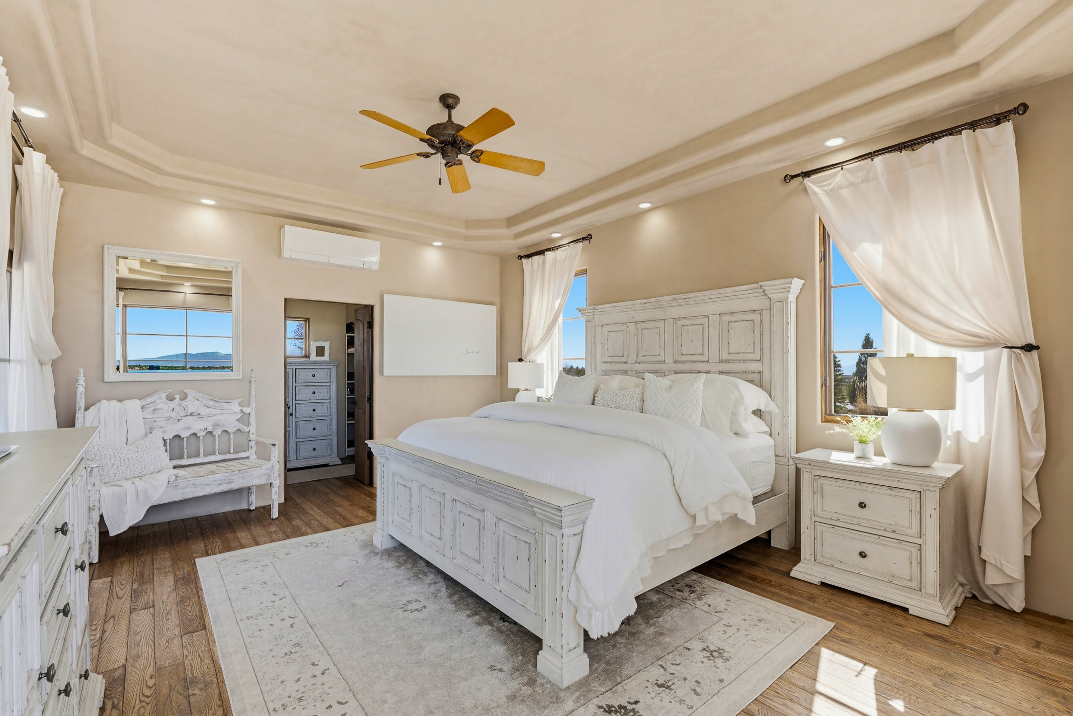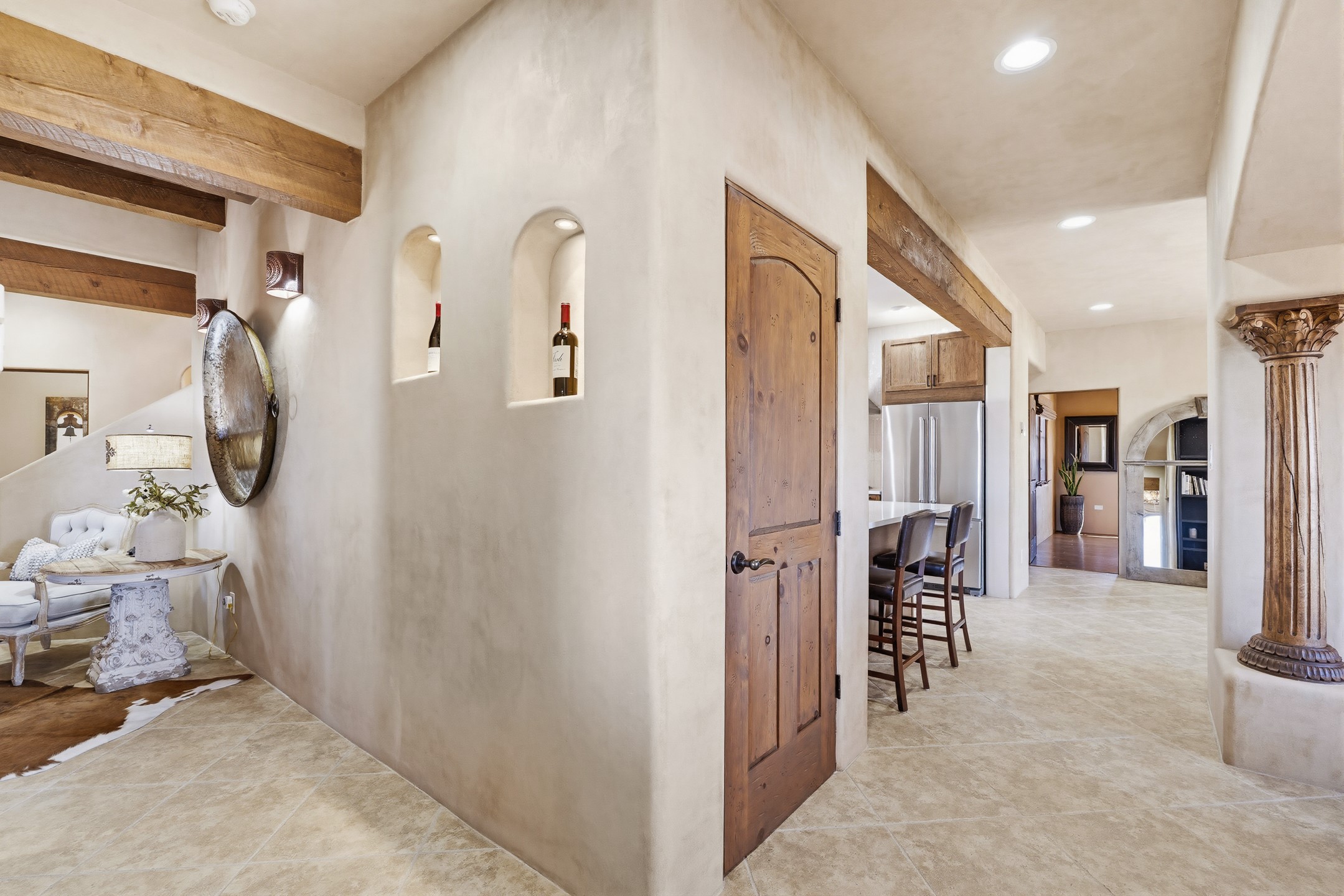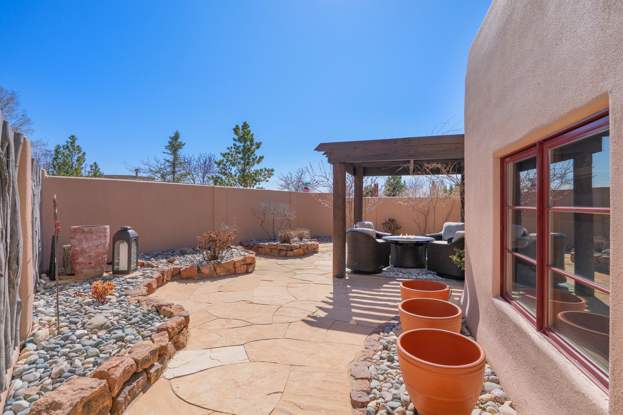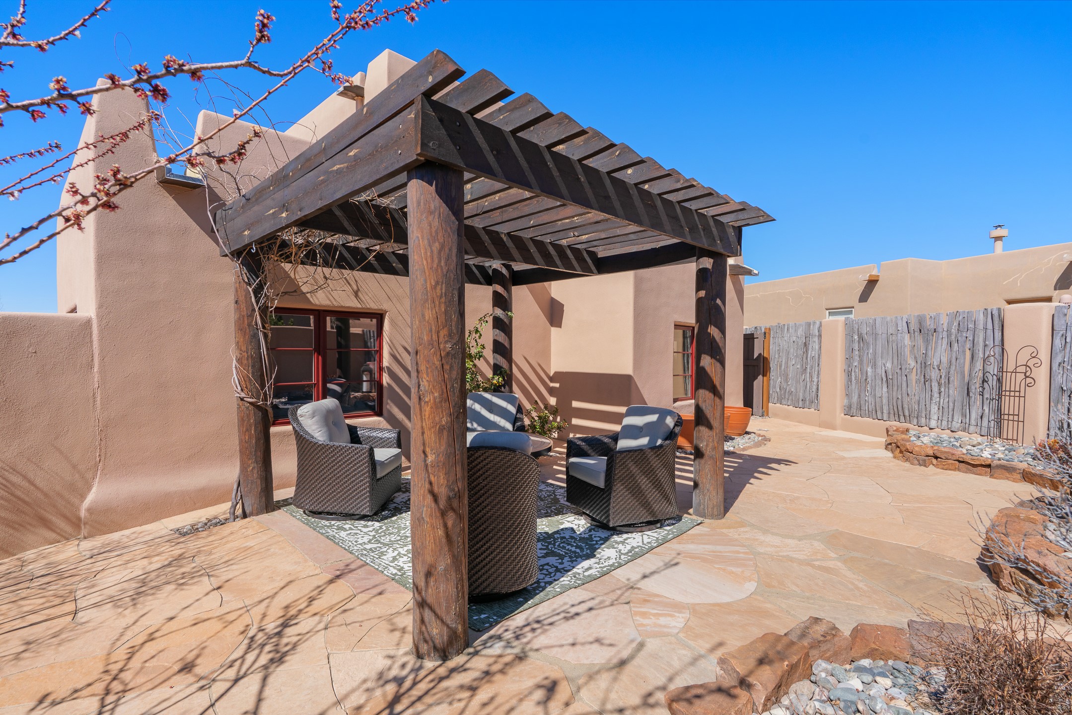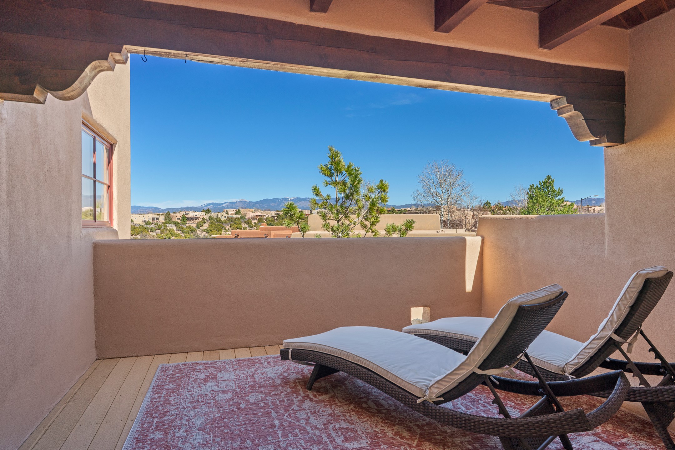 Experience refined Santa Fe living in this beautifully updated 3-bedroom, 2.5-bath Pueblo-style home in Aldea de Santa Fe. Perfectly positioned to capture sweeping views of the Jemez, Sangre de Cristo, and Sandia Mountains, this home offers a warm and sophisticated atmosphere with classic viga ceilings, lovely earth-colored plastered walls, and view-filled windows throughout. The welcoming living room is anchored by a corner kiva fireplace, creating an inviting space to relax and entertain.The reimagined and fully remodeled kitchen features new cabinetry, countertops, appliances, tile, and fixtures, blending style and functionality. It opens to a cozy library/media room with built-in bookcases and an entertainment center--an ideal space for gathering or quiet evenings at home.The entire second floor is dedicated to the spacious primary suite, complete with a spa-like bathroom featuring a soaking tub, walk-in shower, and French doors that open to a private balcony with breathtaking mountain views.Recent upgrades throughout the home enhance both beauty and comfort, including refreshed interior doors finished with a modern stain, updated lighting, and thoughtful aesthetic improvements. Outdoor living spaces are equally inviting, featuring a remodeled patio and refreshed landscaping with a flagstone patio and raised flower beds, perfect for enjoying Santa Fe's spectacular sunsets and outdoor lifestyle. The front portal features an outdoor kiva fireplace for cozy evenings.Additional features include radiant floor heating, mini-split AC for year-round comfort, a new 2024 GacoFlex silicone membrane roof, freshly painted elastomeric stucco exterior, and a spacious two-car attached garage with ample storage.Located in the desirable Aldea community, residents enjoy walking trails, parks, tennis, pickleball and basketball courts, and abundant open space in this peaceful, nature-filled setting just minutes from downtown Santa Fe.