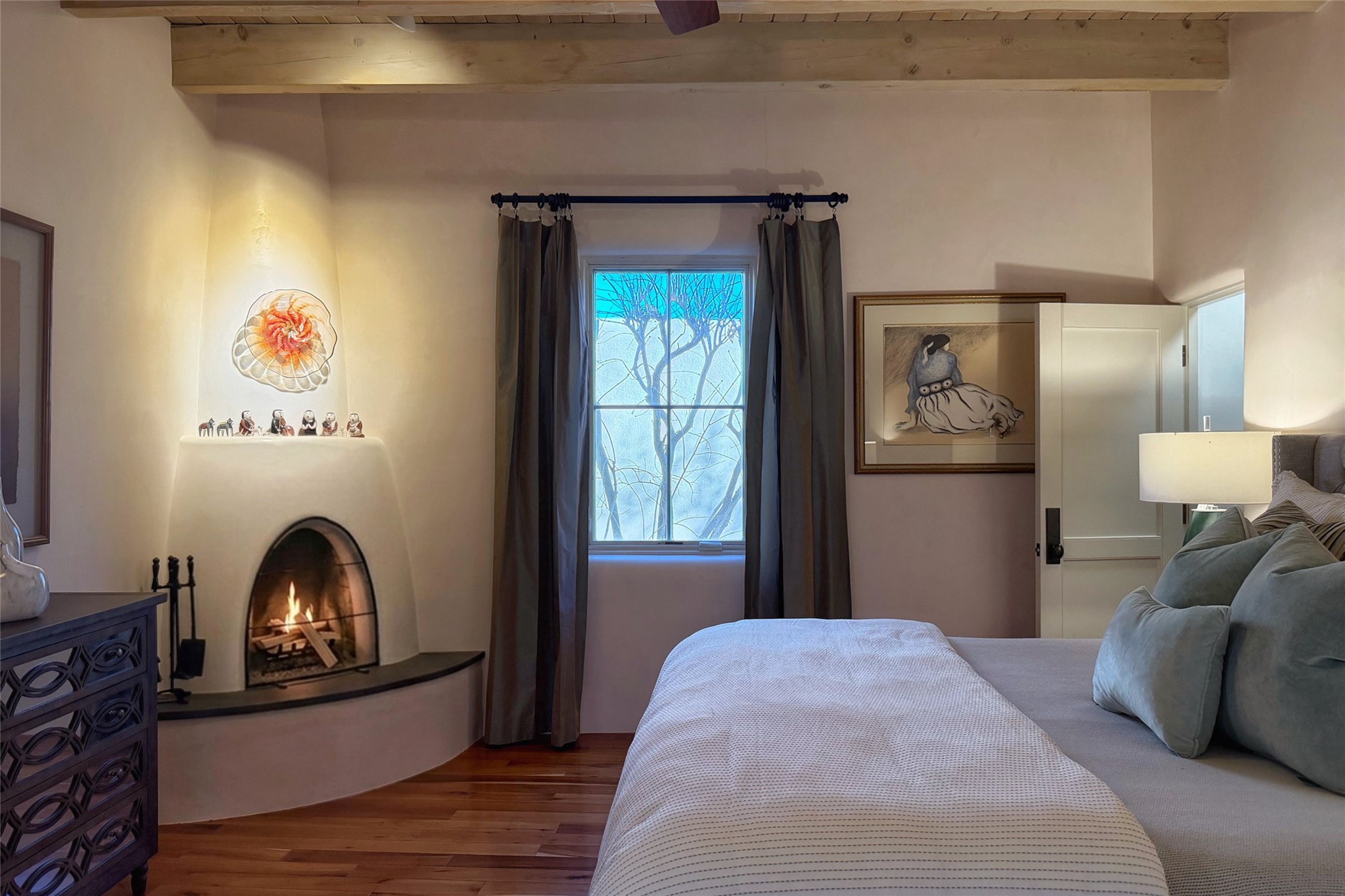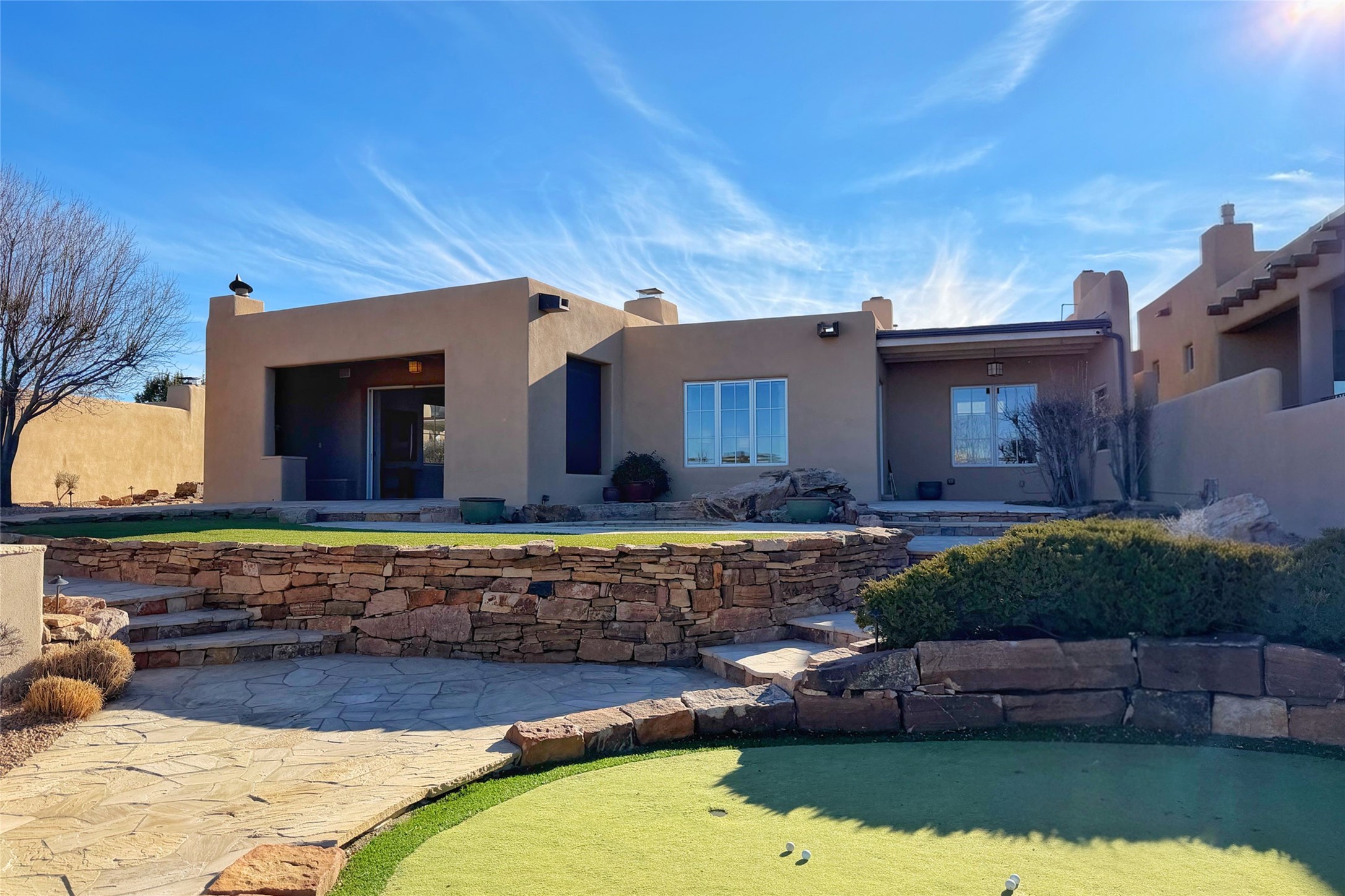Welcome to this soft contemporary gem tucked behind the gates of Las Campanas. 4 glass doors in the living room don't merely open -- they vanish into the walls entirely, conjuring a 16-foot portal between indoors and the glorious New Mexico sky. A distinctive fireplace anchors the room while a wet bar stands ready for cocktails. The Gourmet Kitchen reads like a love letter to serious cooking: a Wolf gas range, Sub-Zero refrigerator, double dishwashers, and a 4' x 9' island with its own prep sink and Insta-Hot water. Just around the corner, a cozy nook with a wood-burning fireplace invites you to linger over morning coffee.The Main Bedroom Suite is its own private sanctuary, complete with a wood-burning fireplace, a 16-foot closet, a walk-in shower, and a jetted tub positioned to soak in the golf course views. A 2nd bedroom wing offers quiet separation, nestled near the Den/Office. And standing entirely on its own, a Guest House with kitchen, living area, bedroom, and washer/dryer, offering your visitors the luxury of privacy.The Media Room arrives with serious credentials: an 11.2 surround sound system, a dedicated refrigerator, and a reclining sectional that makes every screening feel like opening night. Outside, 6 fireplaces, a synthetic putting green, a fire pit, a portal built for BBQ, and those endless golf-and-mountain views transform the outdoors into a self-contained resort. With recent major stucco maintenance and a GACO Roof Coating, this home is as well-cared-for as it is captivating.
