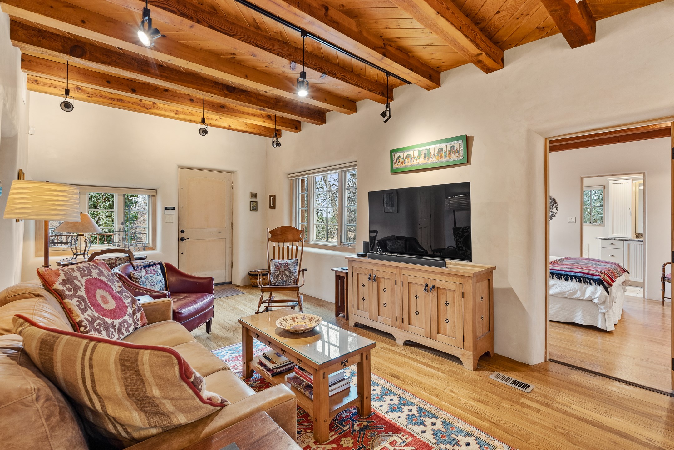 Beautifully sited in the heart of Santa Fe's coveted Historic Eastside, this well maintained 3-bedroom, 3-bath adobe/frame home offers approximately 2,023 square feet of classic charm and serene privacy. Tucked away at the quiet end of aprivate late just off beloved Garcia Street, the property enjoys rare peace and seclusion while remaining moments from downtown, Canyon Road, and local favorites. The light-filled living and dining areas feature exposed wood beamceilings and elegant plaster walls, creating a warm and inviting atmosphere. The spacious, well-appointed kitchen offers abundant storage, solid stone countertops, a central island, and striking tile accents that add both character and functionality throughout the house. Two guest bedrooms open to a lovely exterior portal, complete with a Jtul gas fireplace--ideal for year-round enjoyment. Interior comfort is assured with a recently replaced HVAC system and a new water heater. The property also boasts an exceptional short-term rental history, grossing approximately $80,000 annually for each of the past three years. A special Eastside retreat that seamlessly blends timeless Santa Fe style with modern comfort and proven income potential.