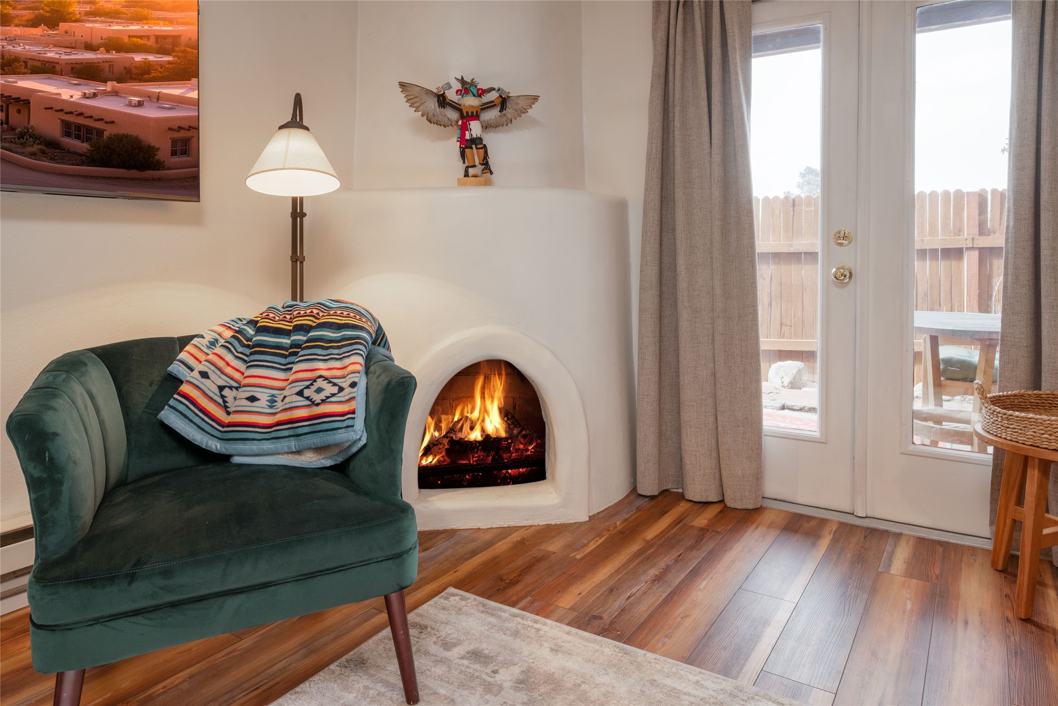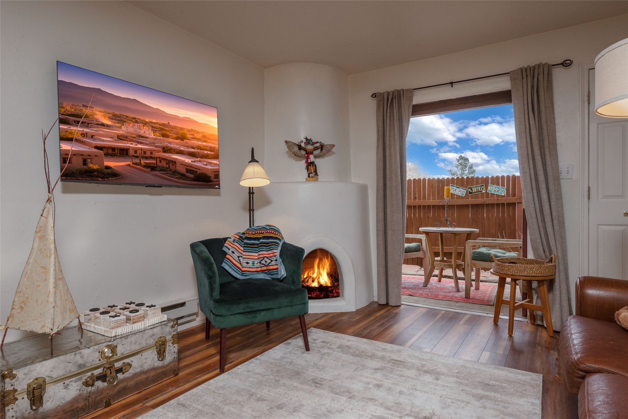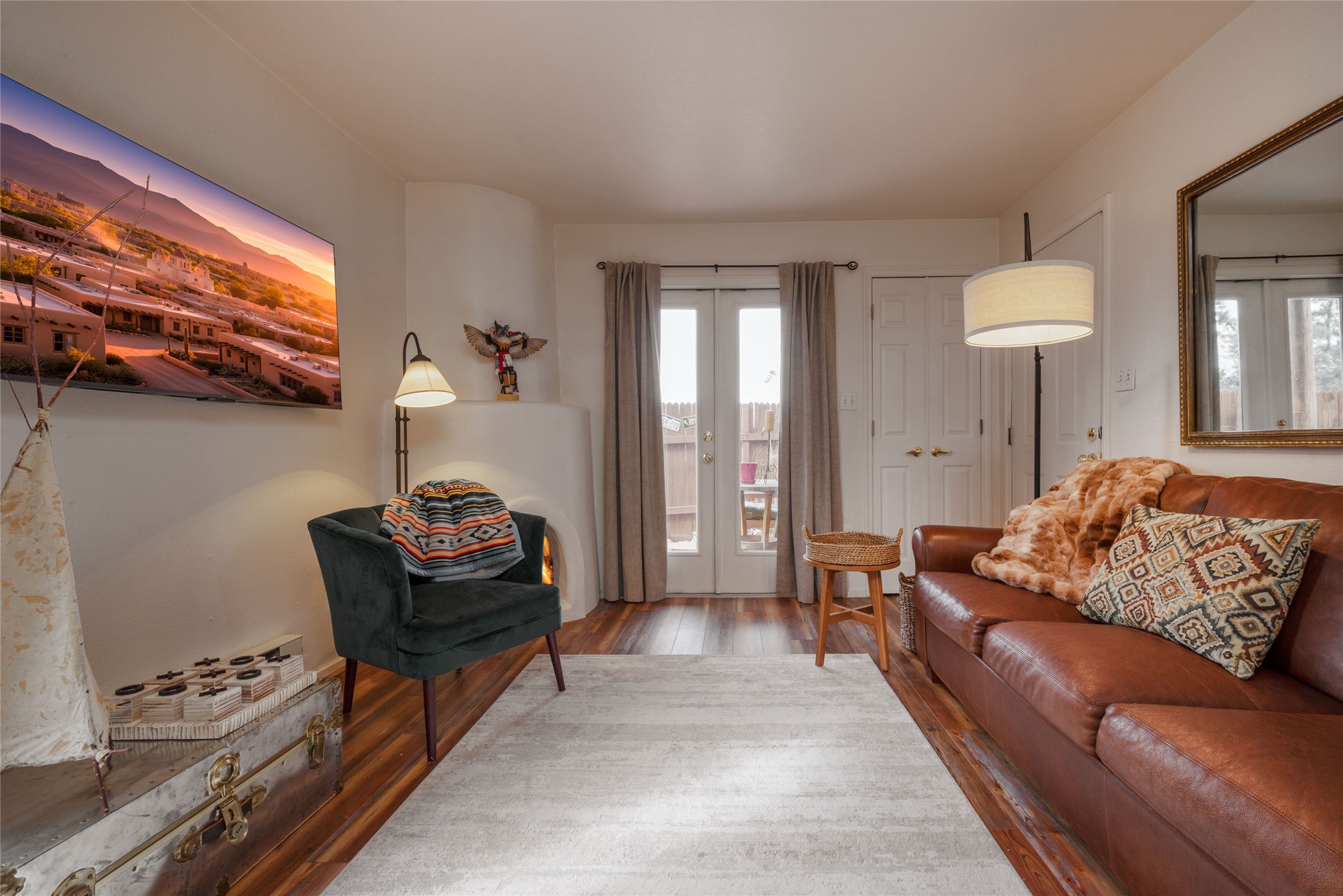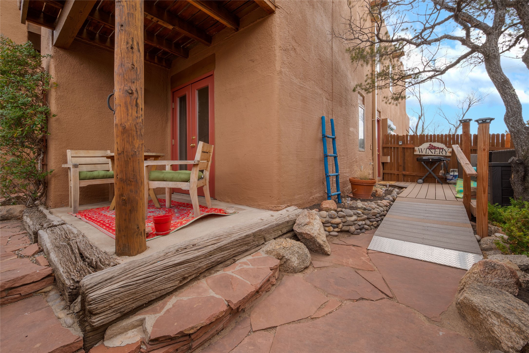 TURNKEY! Are you looking for the perfect condo to live full time, as a pied-a-terre, or an investment property? Here it is, completely furnished, at the sought after Tierra de Zia condo gated community in mid-town Santa Fe! A corner, ground level unit with a beautiful private deck, patio and gardens. Living room with french doors, lots of light, and a kiva fireplace. Kitchen complete with washer and dryer and double door refrigerator with ice and water dispenser. Maple cabinetry. Ensuite bedroom with walk-in closet off the bathroom. Wood/vinyl wide plank flooring throughout. Designated parking directly in front of the unit. Sunset views! Beautiful grounds with ponds, fountains and walking trails through a natural setting. On-site management.
