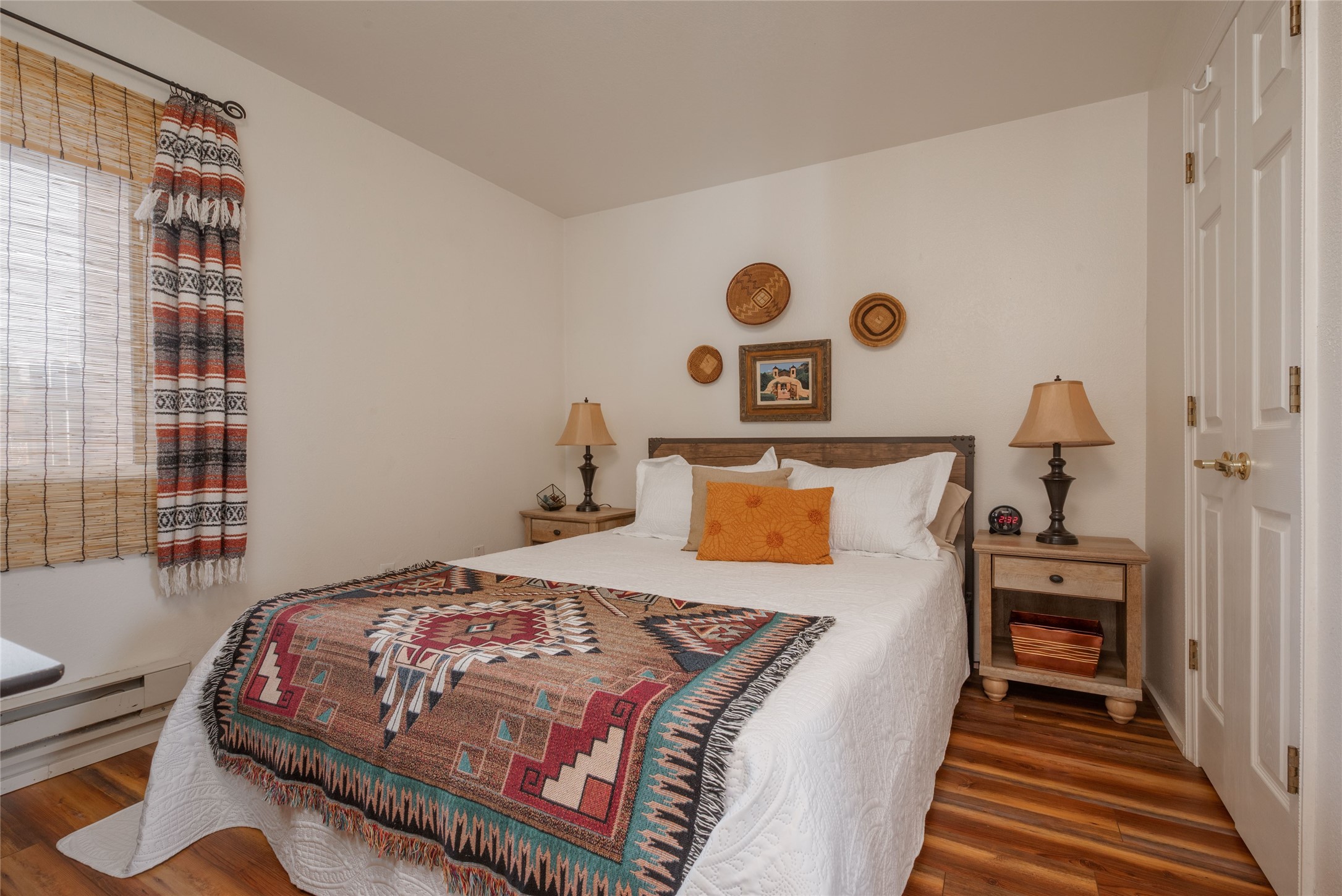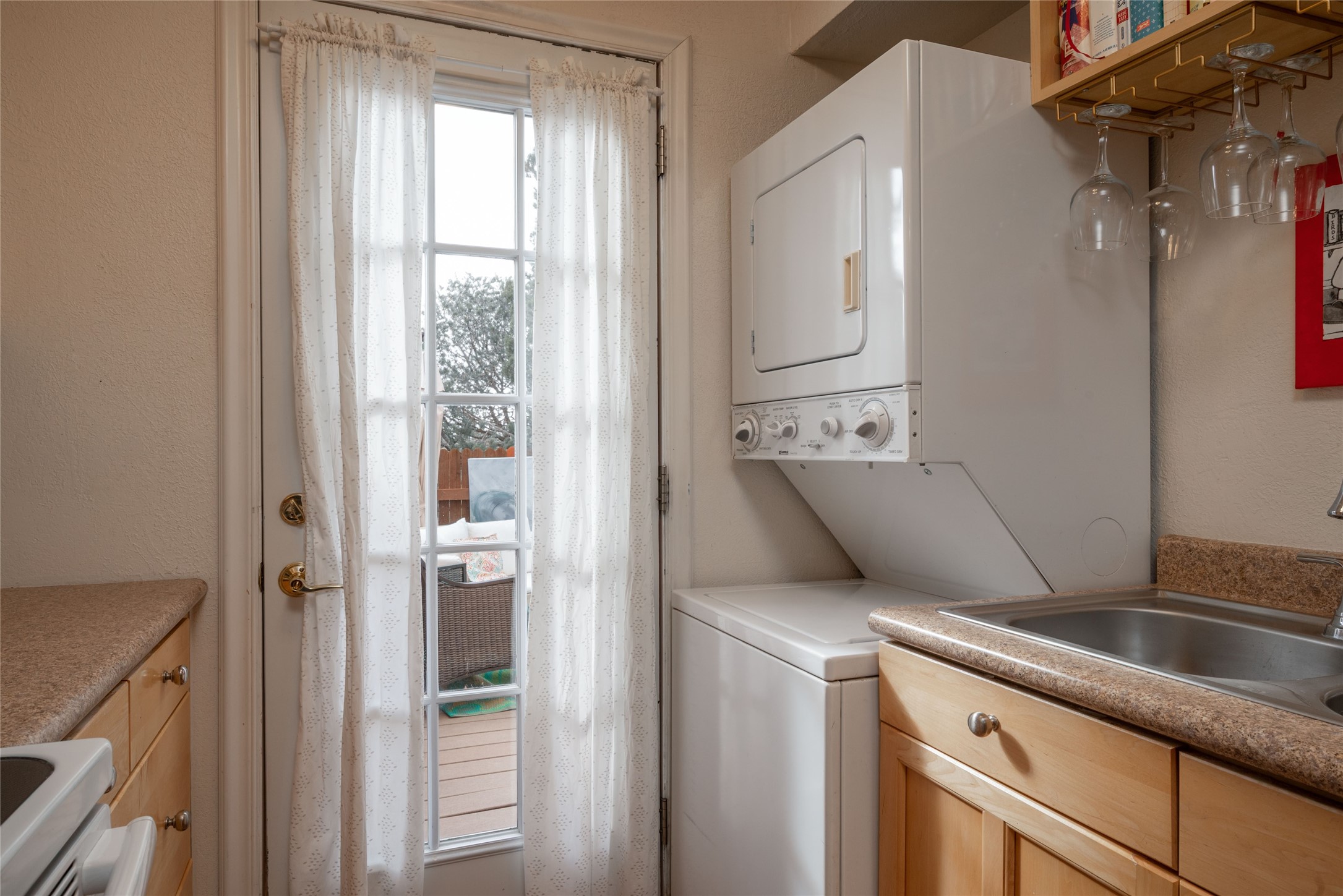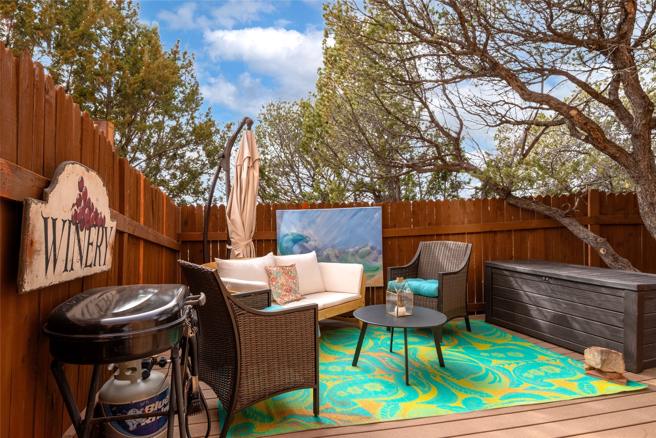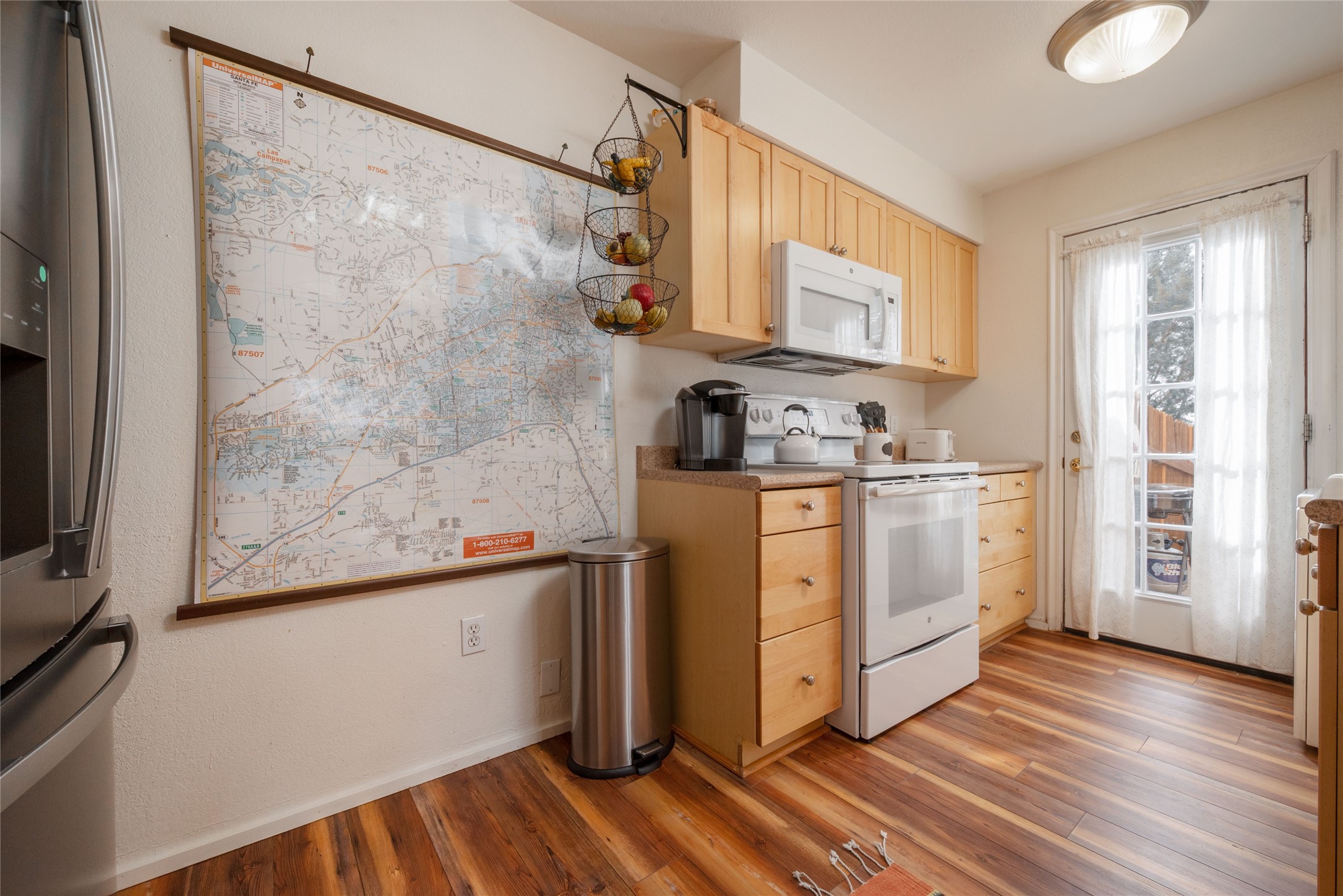 TURNKEY! Are you looking for the perfect condo to live full time, as a pied-a-terre, or an investment property? Here it is, completely furnished, at the sought after Tierra de Zia condo gated community in mid-town Santa Fe! A corner, ground level unit with a beautiful private deck, patio and gardens. Living room with french doors, lots of light, and a kiva fireplace. Kitchen complete with washer and dryer and double door refrigerator with ice and water dispenser. Maple cabinetry. Ensuite bedroom with walk-in closet off the bathroom. Wood/vinyl wide plank flooring throughout. Designated parking directly in front of the unit. Sunset views! Beautiful grounds with ponds, fountains and walking trails through a natural setting. On-site management.