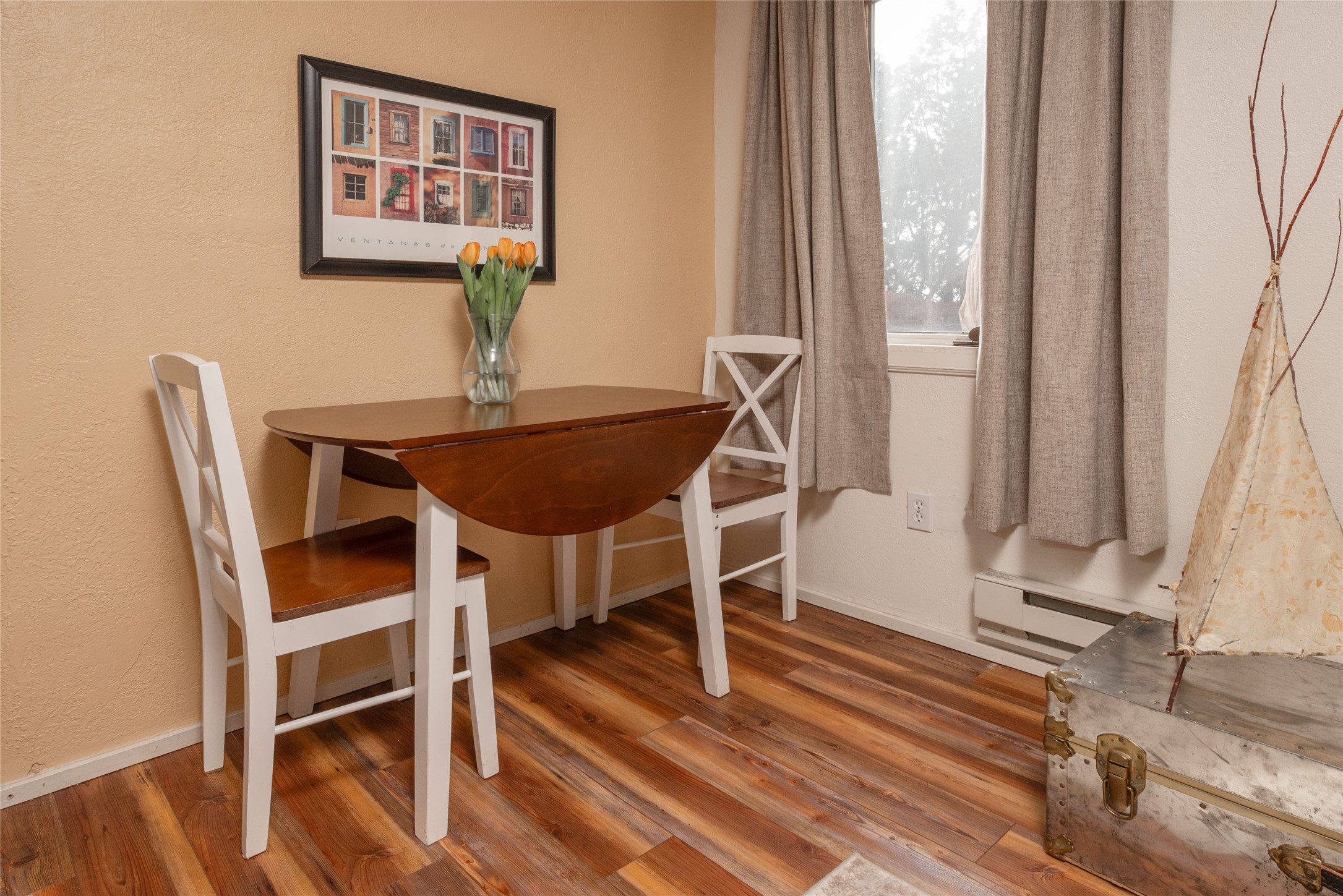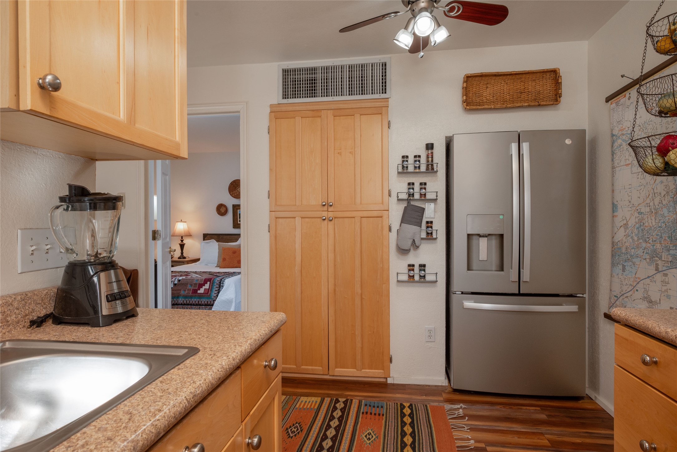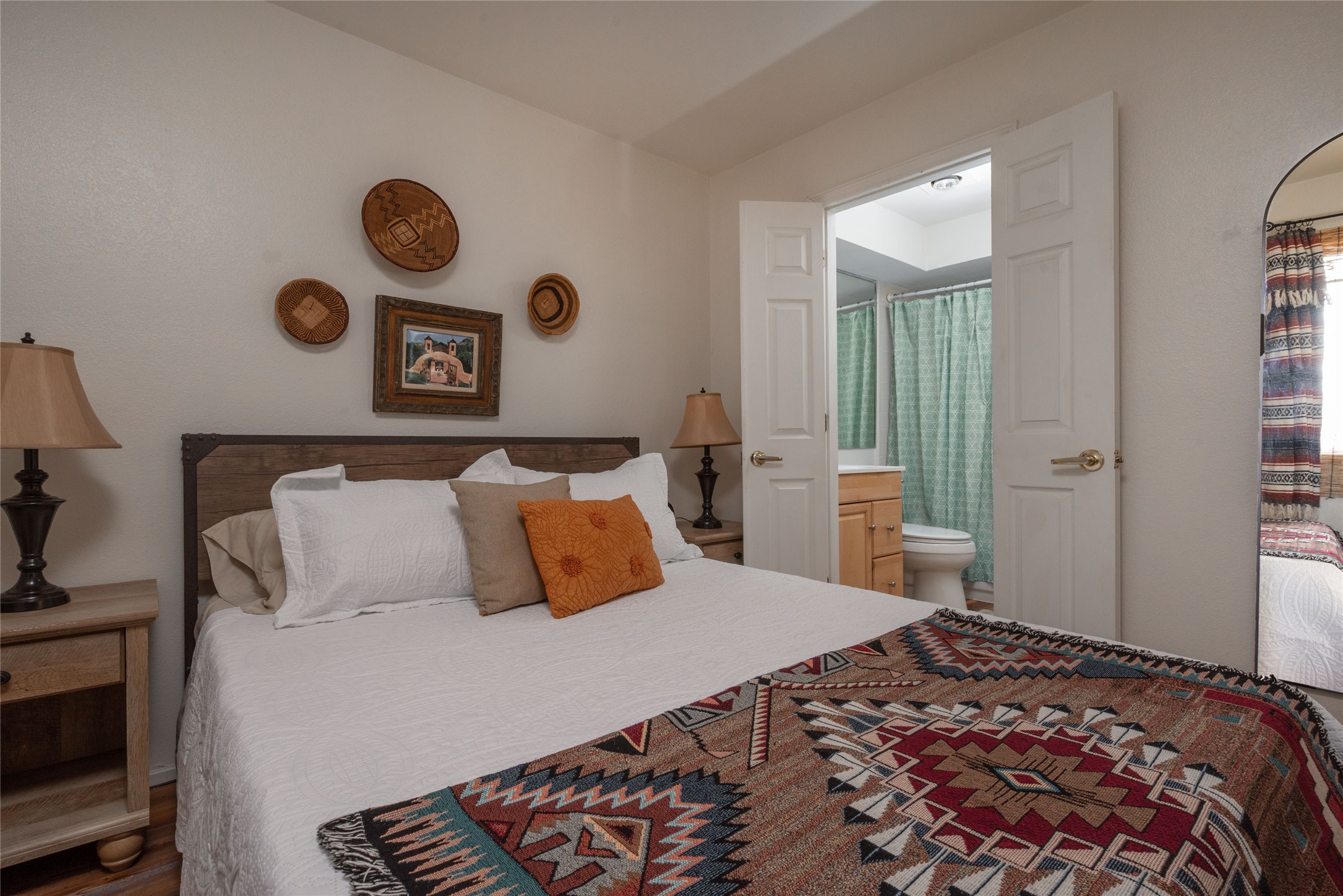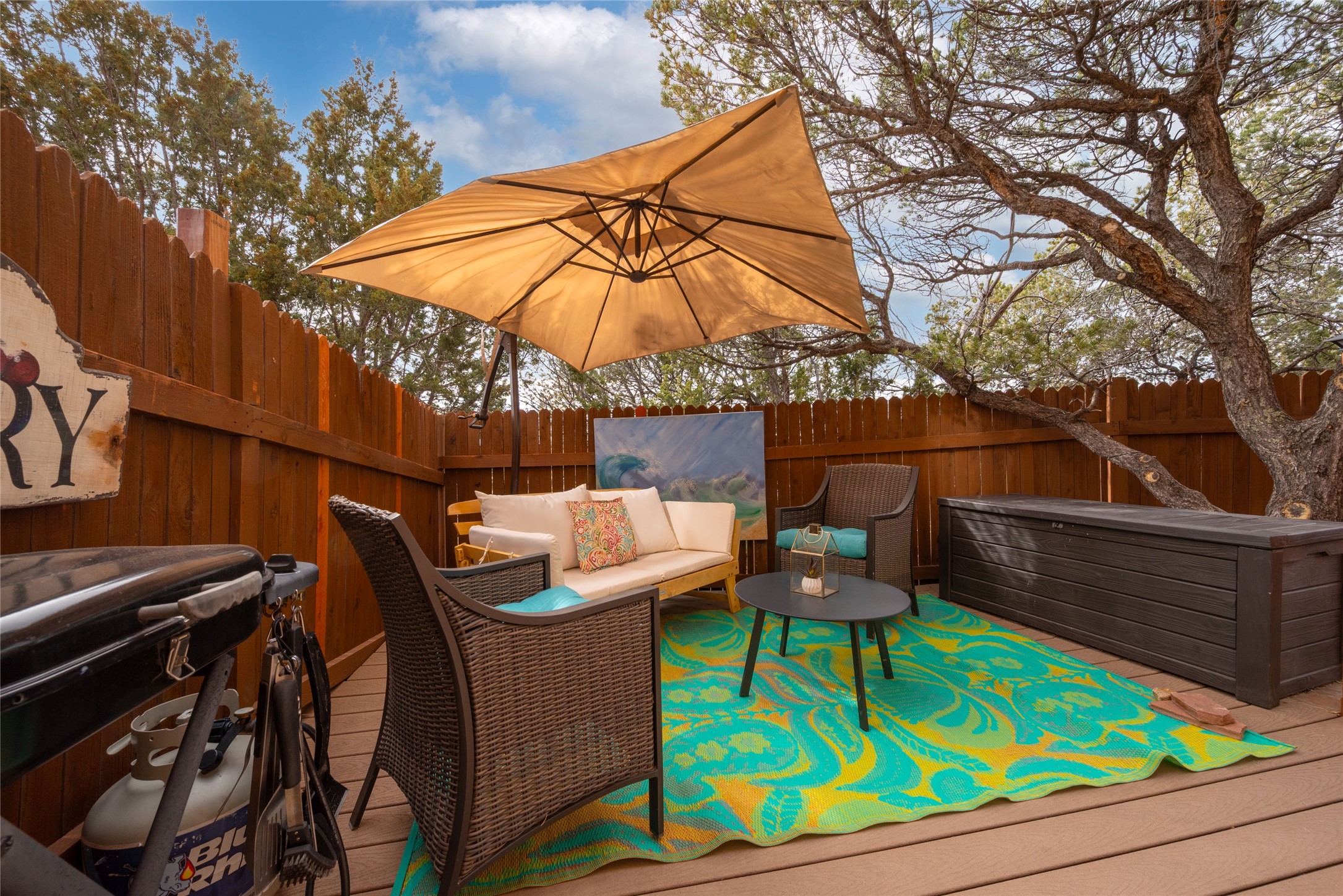 TURNKEY! Are you looking for the perfect condo to live full time, as a pied-a-terre, or an investment property? Here it is, completely furnished, at the sought after Tierra de Zia condo gated community in mid-town Santa Fe! A corner, ground level unit with a beautiful private deck, patio and gardens. Living room with french doors, lots of light, and a kiva fireplace. Kitchen complete with washer and dryer and double door refrigerator with ice and water dispenser. Maple cabinetry. Ensuite bedroom with walk-in closet off the bathroom. Wood/vinyl wide plank flooring throughout. Designated parking directly in front of the unit. Sunset views! Beautiful grounds with ponds, fountains and walking trails through a natural setting. On-site management.