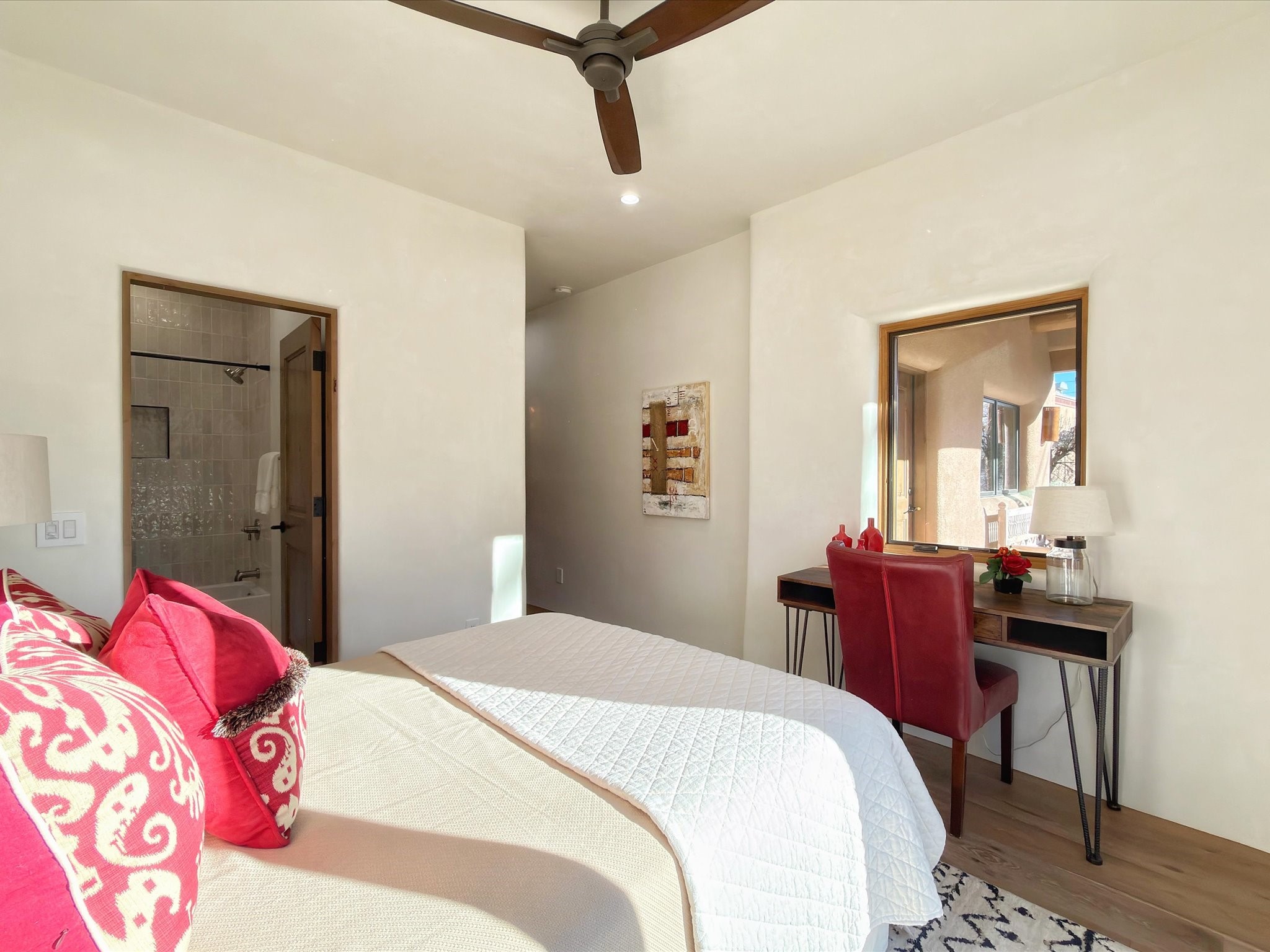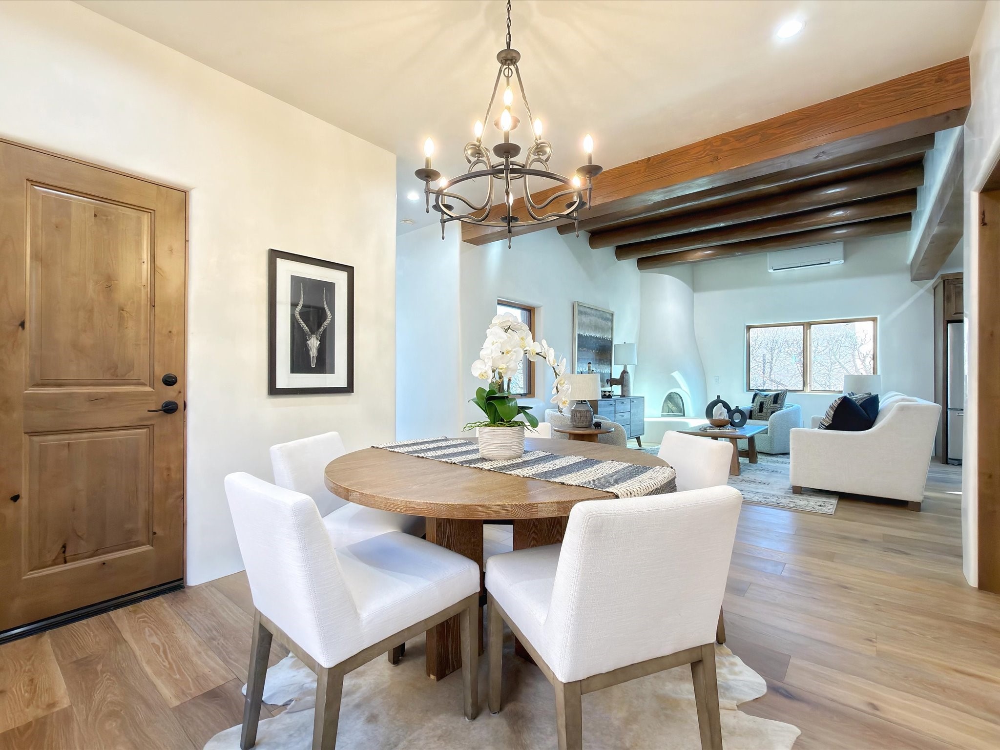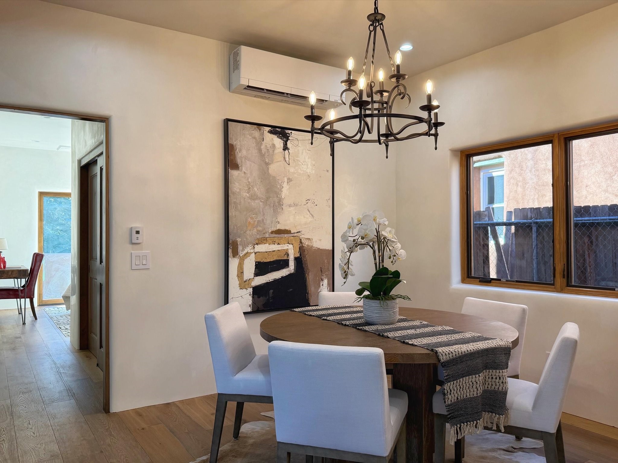 Extravagant renovated ADOBE HOME just minutes from the Railyard and downtown Santa Fe. This beautifully crafted 3-bedroom, 2-bath residence offers approximately 1,845 sq ft of authentic Southwestern style paired with modern comfort.Inside, warm wood floors, hand-applied diamond plaster walls, and striking viga-and-beam wood ceilings create a timeless Santa Fe aesthetic. The open living area features a classic kiva fireplace, perfect for cozy evenings and entertaining.The home is designed for year-round comfort with radiant in-floor heating and efficient mini-split systems for heating and air conditioning. Bathrooms showcase custom tile showers, and quality finishes are found throughout.Enjoy multiple outdoor living areas ideal for relaxing, dining, or soaking up Santa Fe's beautiful climate.Located just minutes from the Railyard's farmers market, galleries, restaurants, and entertainment -- with easy access to downtown and the Plaza -- this home offers the perfect blend of charm, convenience, and modern construction. Not to mention the huge potential of a short-term rental.
