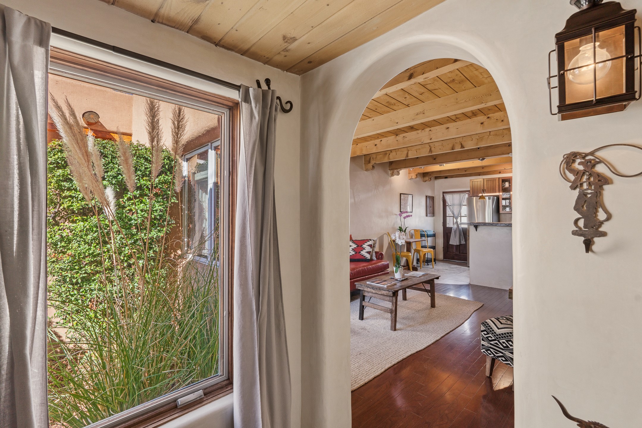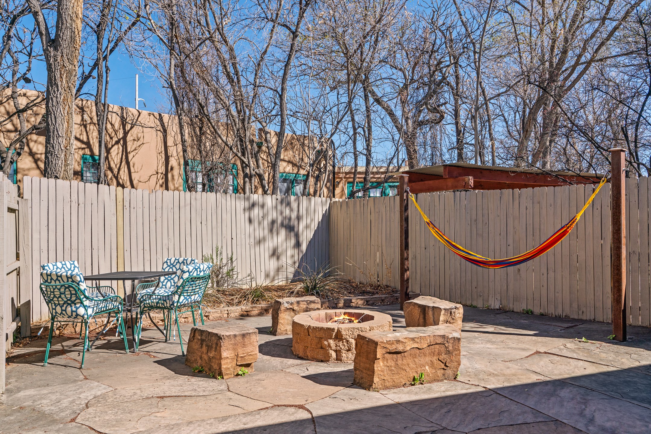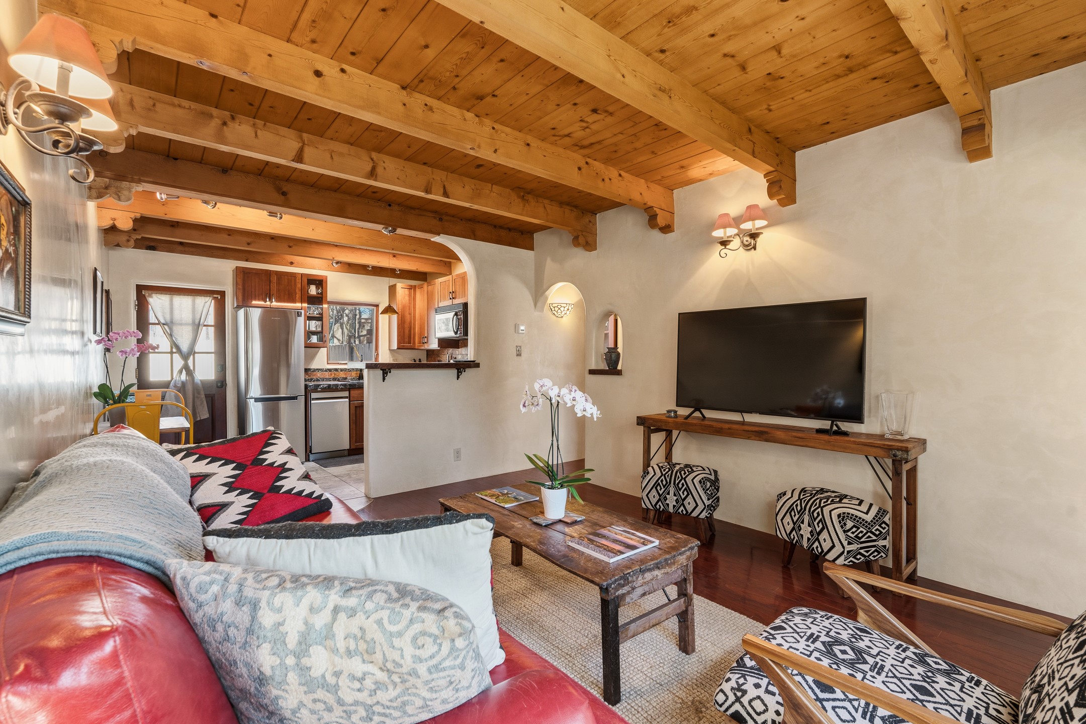 Charming and elegant, this quintessential Santa Fe-style condo is ideally located in the heart of South Capitol. Exceptionally well maintained, the home features thoughtful updates including a flagstone fire pit in the private backyard and a newer TPO roof completed in 2018. The single-level layout offers two bedrooms and one bath, with an open-concept kitchen designed for effortless entertaining. A bar overlooks the living area, creating an inviting flow betweenspaces. The kitchen is well equipped with stainless steel appliances--including refrigerator, oven/range, dishwasher, microwave, and an efficient washer/dryer--and features a delightful window overlooking the private exterior patio. South-facing living room windows fill the home with natural light and warmth throughout the day. Multiple skylights, graceful archways, exposed beams, hardwood floors, and traditional nichos beautifully complement the classic plaster walls. The primary bedroom is a serene retreat, featuring a cozy nook with a wood-burning kiva fireplace and multiple windows that enhance the natural light. Additional amenities include a dedicated storage unit, access to a communal washer/dryer room, and an outdoor gathering space. Located within a gated community offering privacy/security and one off street parking space all just footsteps from Downtown Santa Fe!