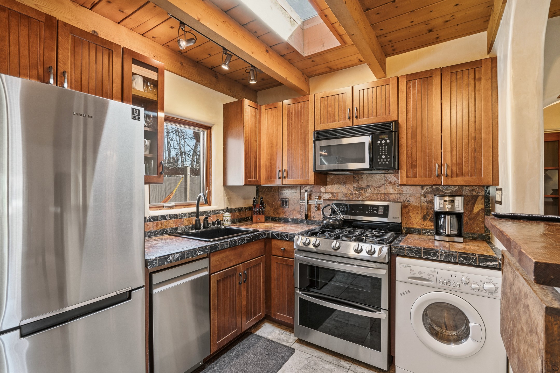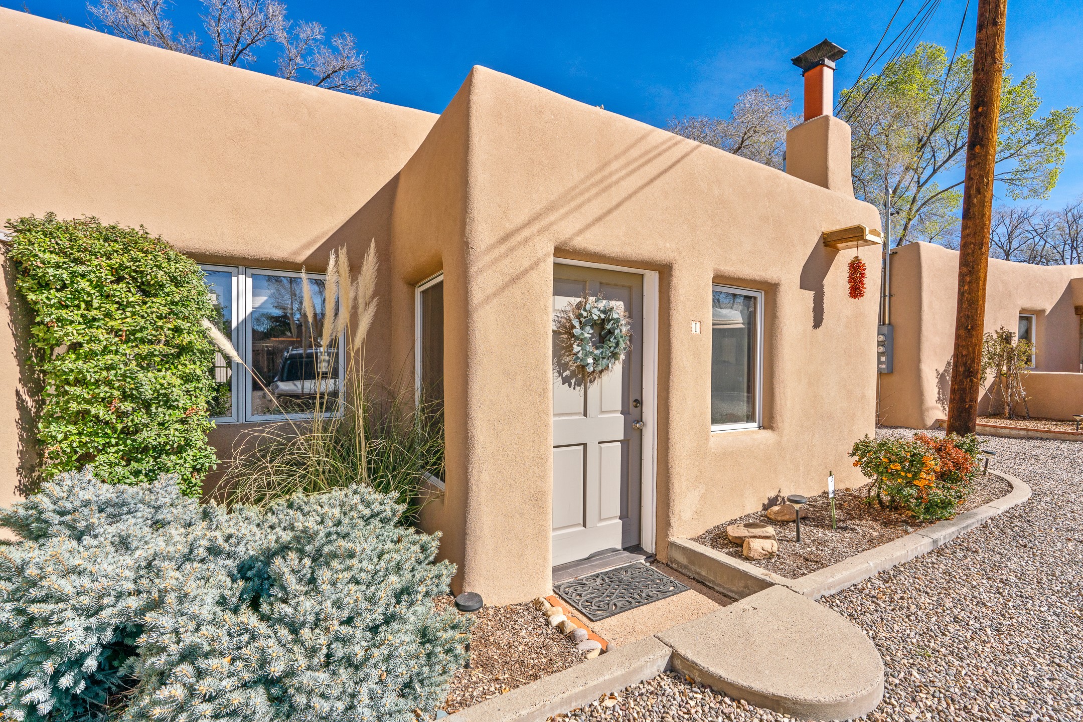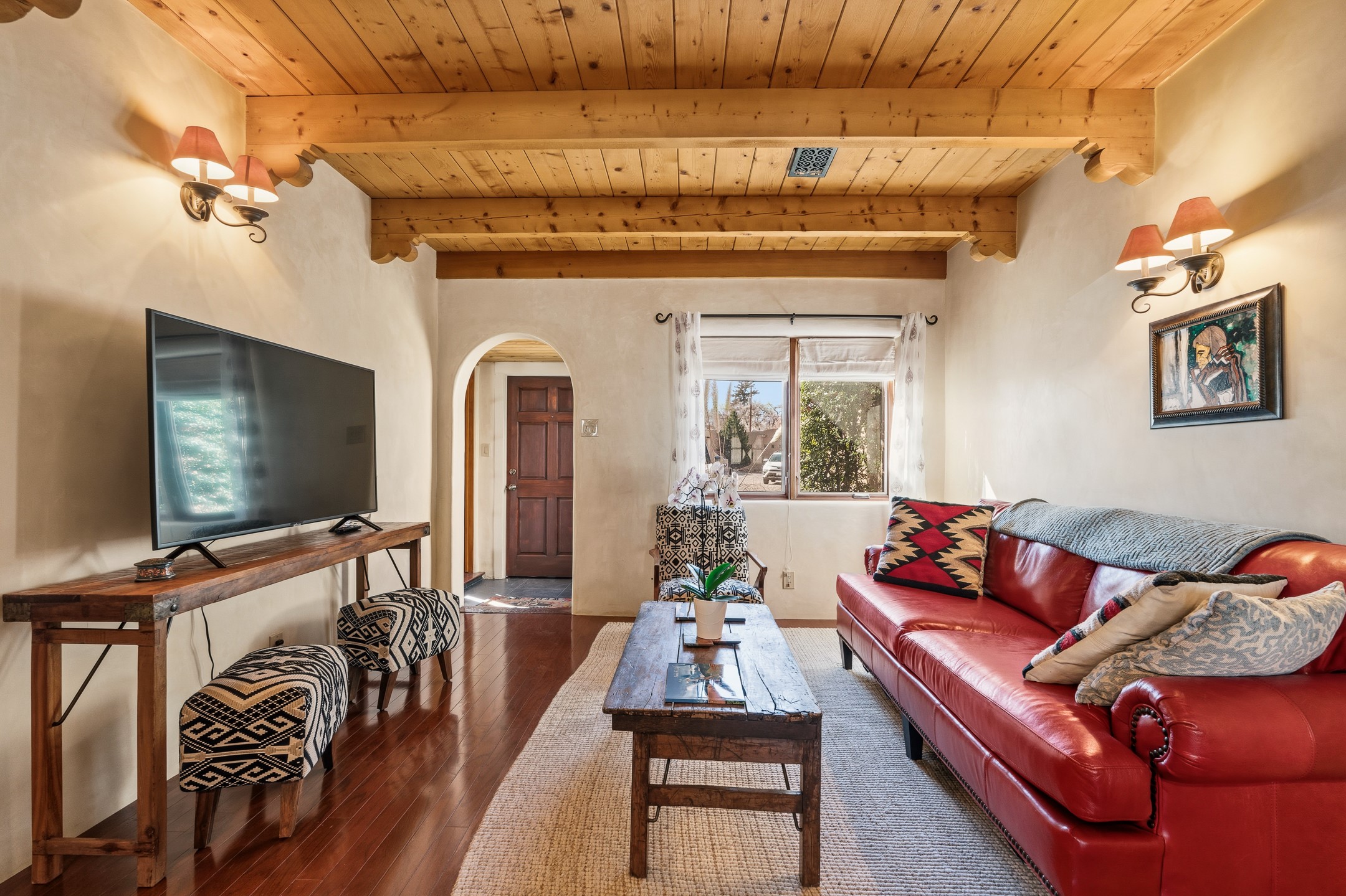 Charming and elegant, this quintessential Santa Fe-style condo is ideally located in the heart of South Capitol. Exceptionally well maintained, the home features thoughtful updates including a flagstone fire pit in the private backyard and a newer TPO roof completed in 2018. The single-level layout offers two bedrooms and one bath, with an open-concept kitchen designed for effortless entertaining. A bar overlooks the living area, creating an inviting flow betweenspaces. The kitchen is well equipped with stainless steel appliances--including refrigerator, oven/range, dishwasher, microwave, and an efficient washer/dryer--and features a delightful window overlooking the private exterior patio. South-facing living room windows fill the home with natural light and warmth throughout the day. Multiple skylights, graceful archways, exposed beams, hardwood floors, and traditional nichos beautifully complement the classic plaster walls. The primary bedroom is a serene retreat, featuring a cozy nook with a wood-burning kiva fireplace and multiple windows that enhance the natural light. Additional amenities include a dedicated storage unit, access to a communal washer/dryer room, and an outdoor gathering space. Located within a gated community offering privacy/security and one off street parking space all just footsteps from Downtown Santa Fe!