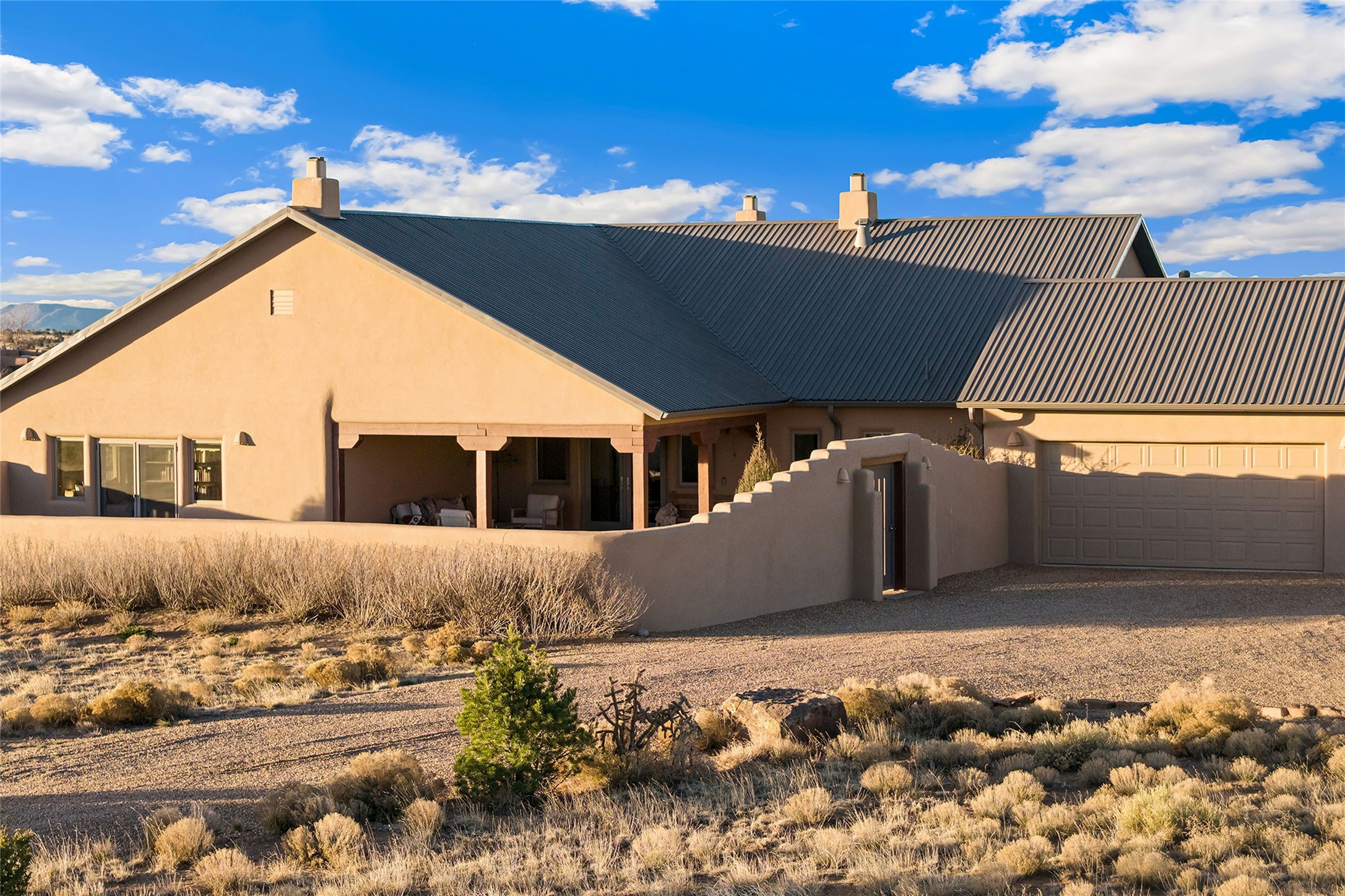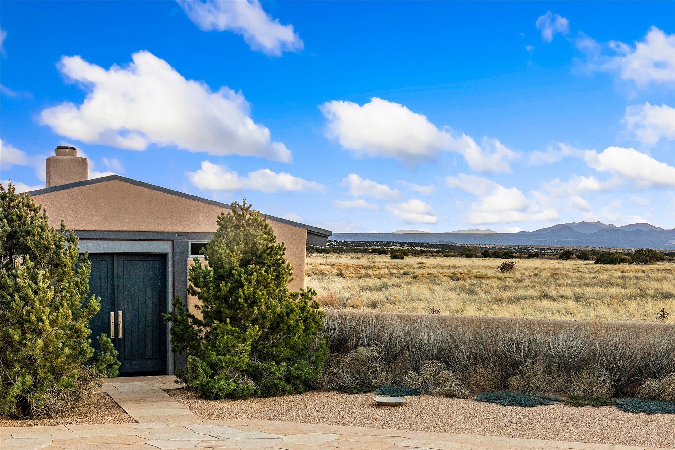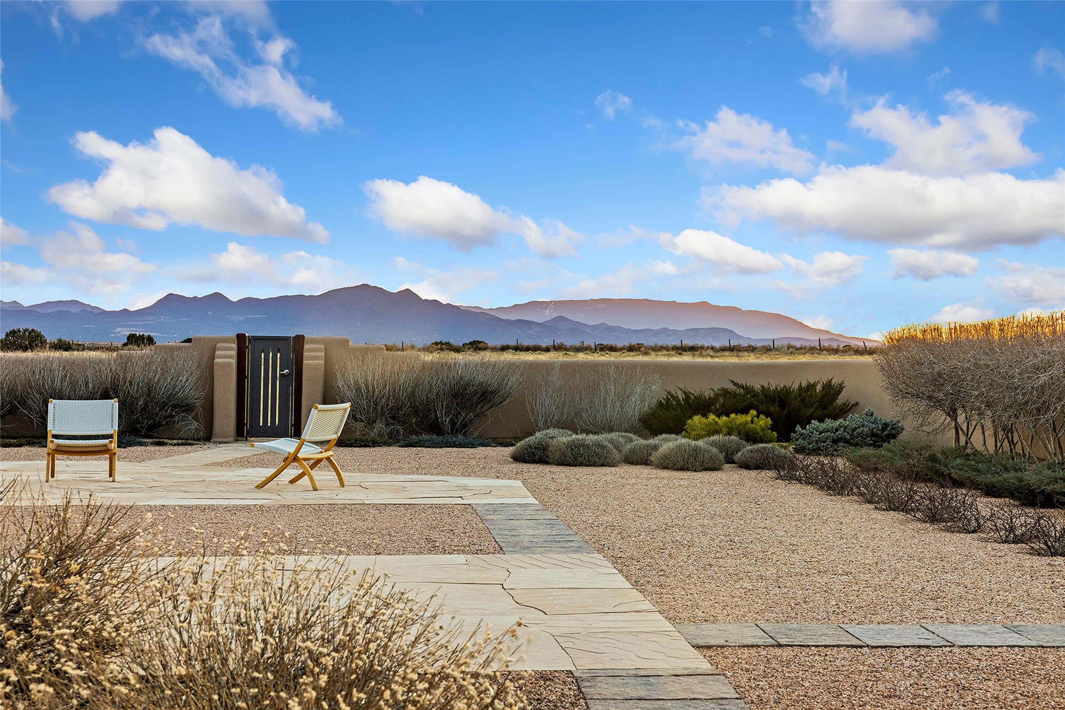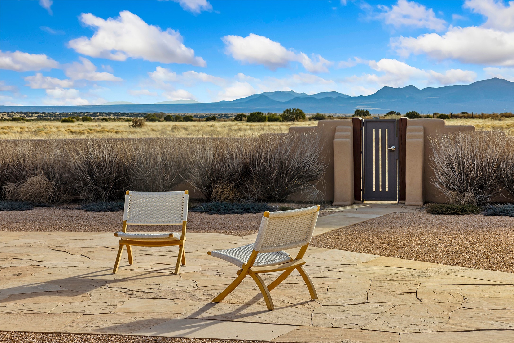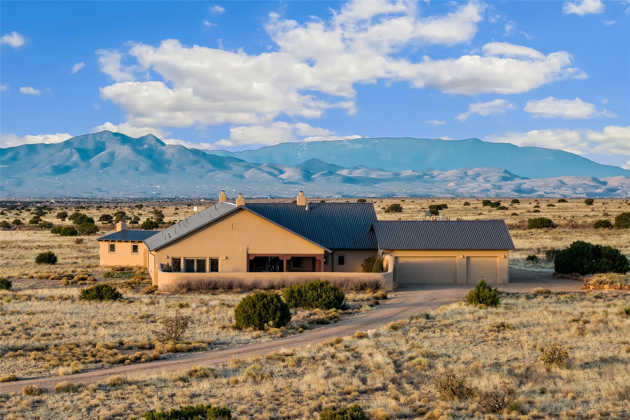Inspired by the minimalist excellence of the famed Georgia O'Keefe, this 12.5-acre northern New Mexico estate, with horse privileges, is a living canvas where over 3,800 square feet of authentic Santa Fe architecture with an impressive main house and detached studio, captivates with one of most vibrant backdrops of vast mountain ranges and magnificent sunsets. Recently upgraded with quality improvements, this exceptional adobe-built Santa Fe sanctuary with 3 bedrooms and 2 baths within the main house and a private detached studio, sets itself apart with its quality craftsmanship, views, vast acreage, a superior outdoor living experience and flexible use of space. Design features include a stunning living room, anchored by a substantial fireplace, framed mountain views, endless walls for art and dual outdoor access to both courtyards. At its heart lies a professional epicurean kitchen which is well-appointed with Wolf and Sub-Zero appliances, excellent storage and a breakfast bar, all of which opens to the intimate dining room which overlooks the courtyard with expansive views. The luxurious, private owner's suite delights with a Kiva fireplace, French doors leading to the back portal, views and a spa-like bath. Two additional spacious guest bedrooms offer privacy, comfort and views and share an elegant full bath. The property's creative pulse is found in the custom detached studio which offers a light-drenched space with scored concrete floors, a wood-burning fireplace and offers endless possibilities for use. Additional highlights include quality windows which frame long-range mountain views, no interiors steps, warm plaster walls, authentic vigas and wood planked ceilings, neutral finishes throughout, fully enclosed front and back courtyards, a large 3-car garage, vibrant landscape and updated hardscape. ThisSanta Fe home is a rare find and offers a seamless blend of high desert luxury and the rugged, artistic spirit of the land.