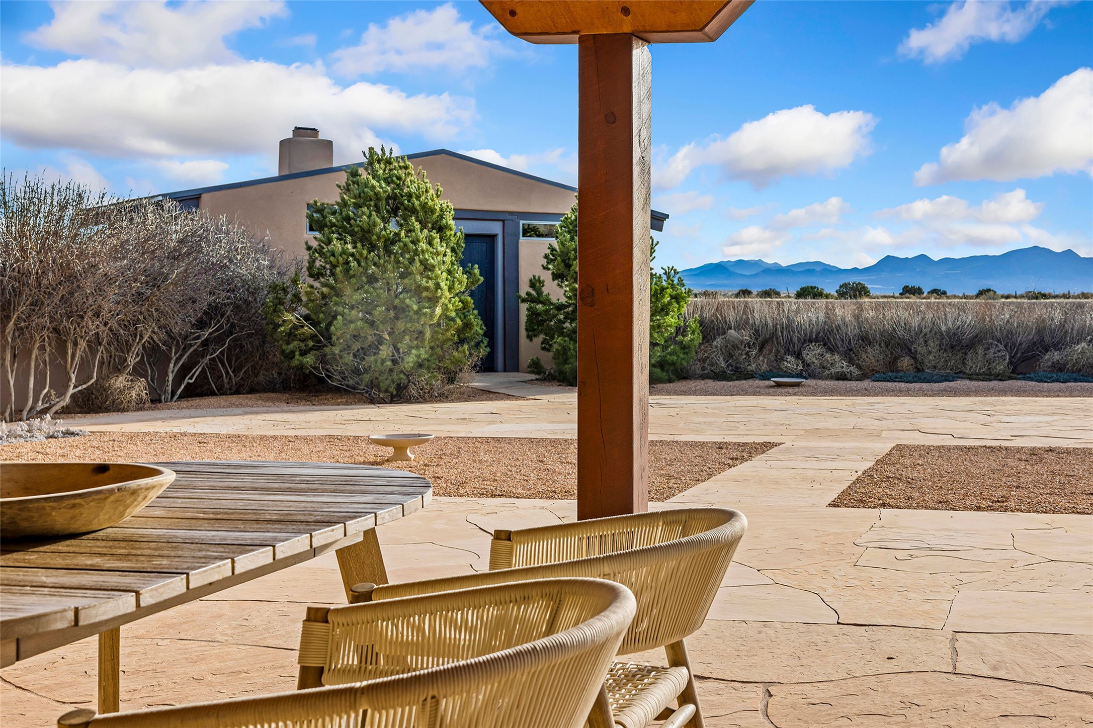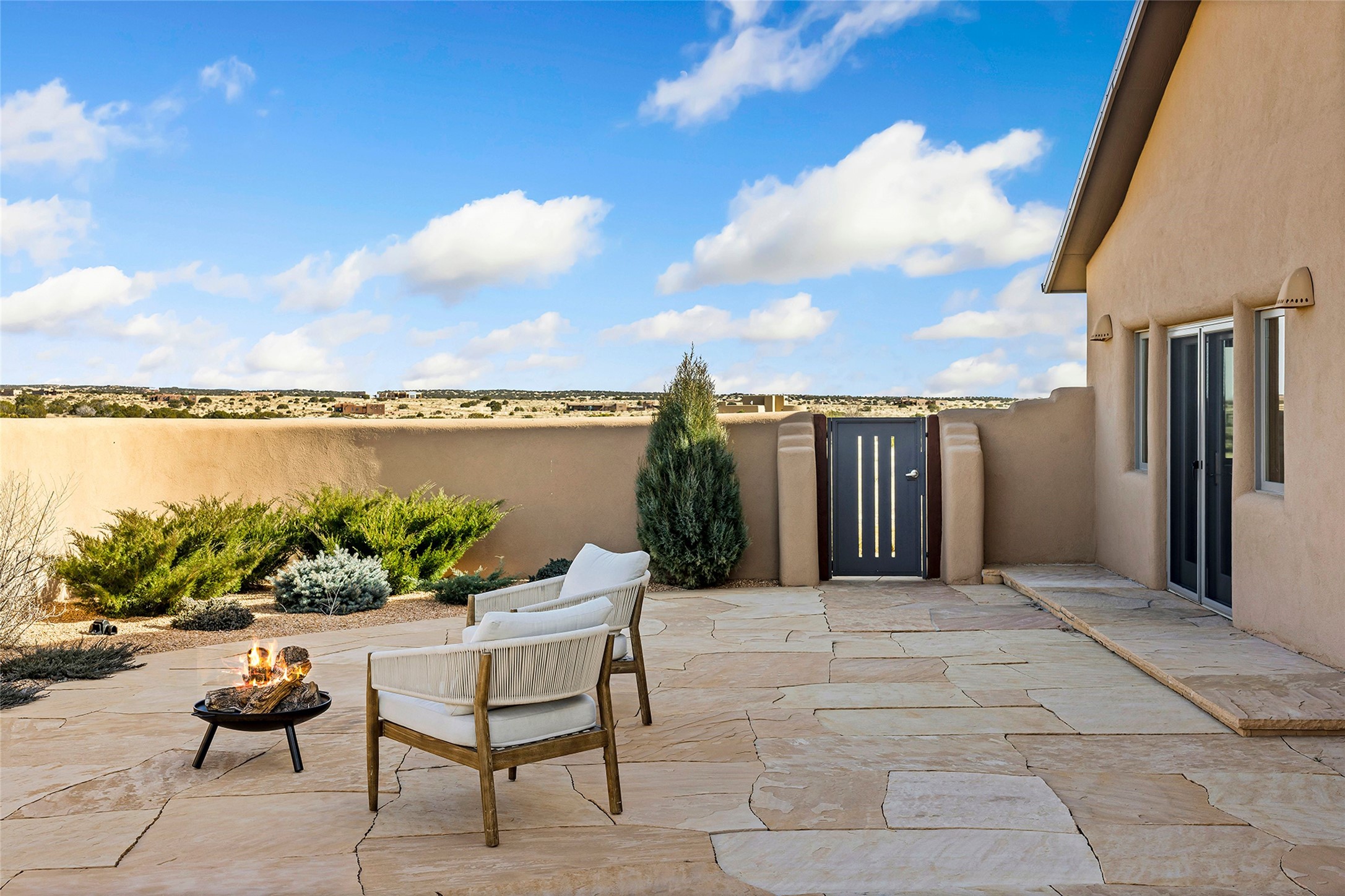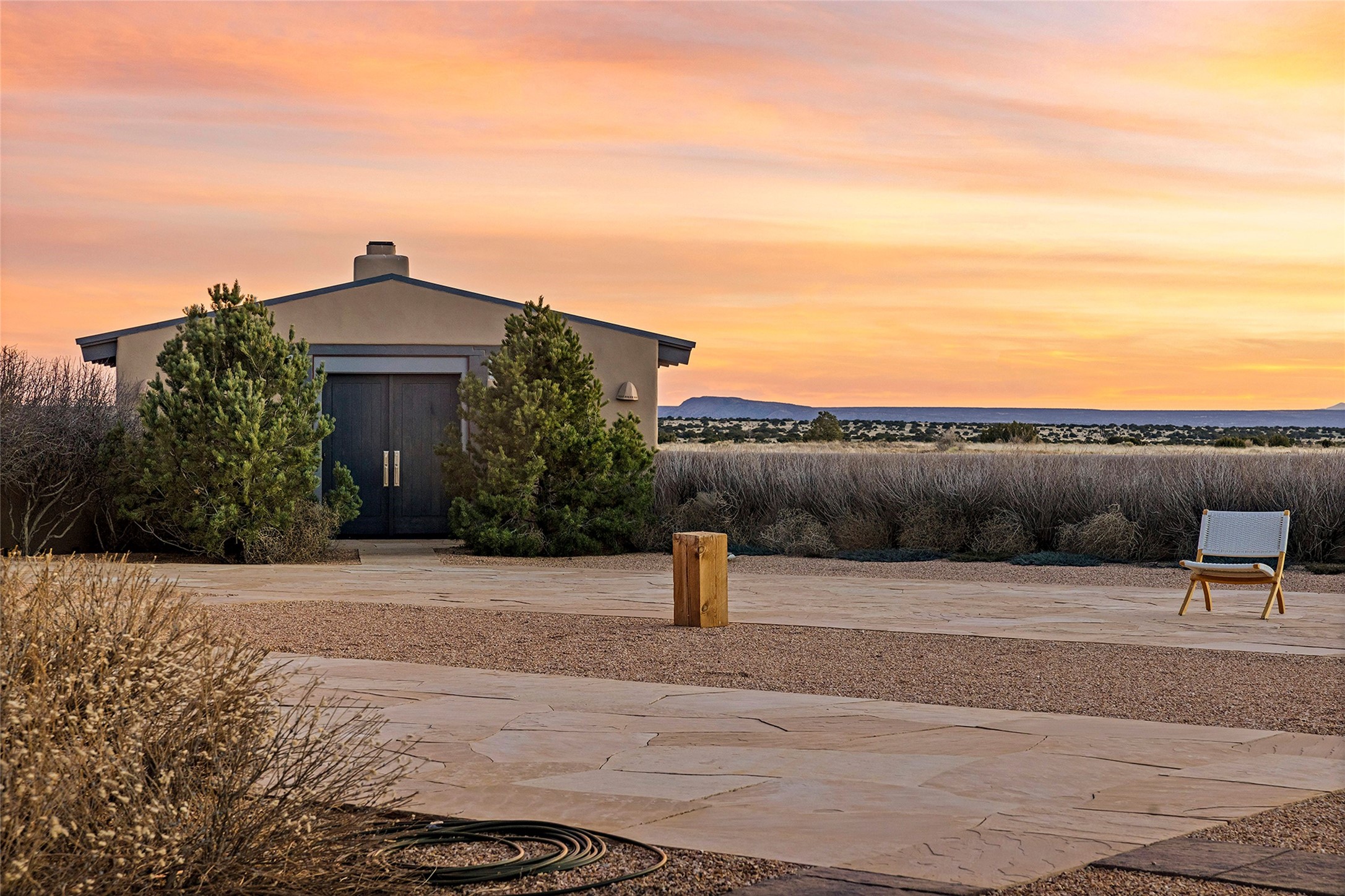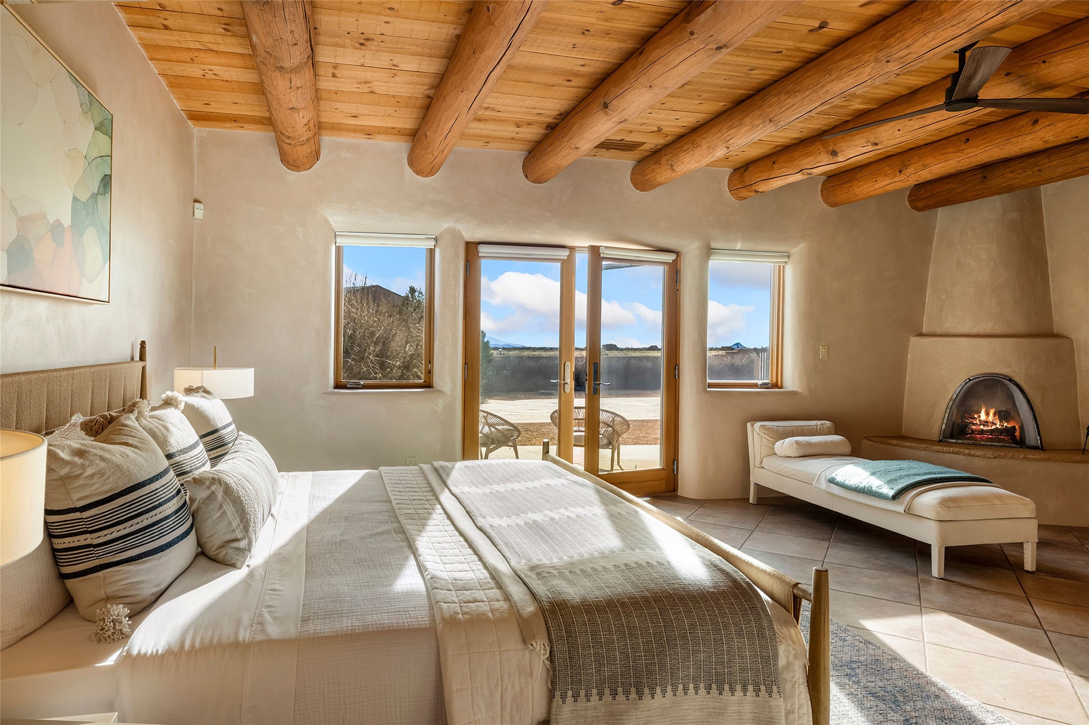 Inspired by the minimalist excellence of the famed Georgia O'Keefe, this 12.5-acre northern New Mexico estate, with horse privileges, is a living canvas where over 3,800 square feet of authentic Santa Fe architecture with an impressive main house and detached studio, captivates with one of most vibrant backdrops of vast mountain ranges and magnificent sunsets. Recently upgraded with quality improvements, this exceptional adobe-built Santa Fe sanctuary with 3 bedrooms and 2 baths within the main house and a private detached studio, sets itself apart with its quality craftsmanship, views, vast acreage, a superior outdoor living experience and flexible use of space. Design features include a stunning living room, anchored by a substantial fireplace, framed mountain views, endless walls for art and dual outdoor access to both courtyards. At its heart lies a professional epicurean kitchen which is well-appointed with Wolf and Sub-Zero appliances, excellent storage and a breakfast bar, all of which opens to the intimate dining room which overlooks the courtyard with expansive views. The luxurious, private owner's suite delights with a Kiva fireplace, French doors leading to the back portal, views and a spa-like bath. Two additional spacious guest bedrooms offer privacy, comfort and views and share an elegant full bath. The property's creative pulse is found in the custom detached studio which offers a light-drenched space with scored concrete floors, a wood-burning fireplace and offers endless possibilities for use. Additional highlights include quality windows which frame long-range mountain views, no interiors steps, warm plaster walls, authentic vigas and wood planked ceilings, neutral finishes throughout, fully enclosed front and back courtyards, a large 3-car garage, vibrant landscape and updated hardscape. ThisSanta Fe home is a rare find and offers a seamless blend of high desert luxury and the rugged, artistic spirit of the land.