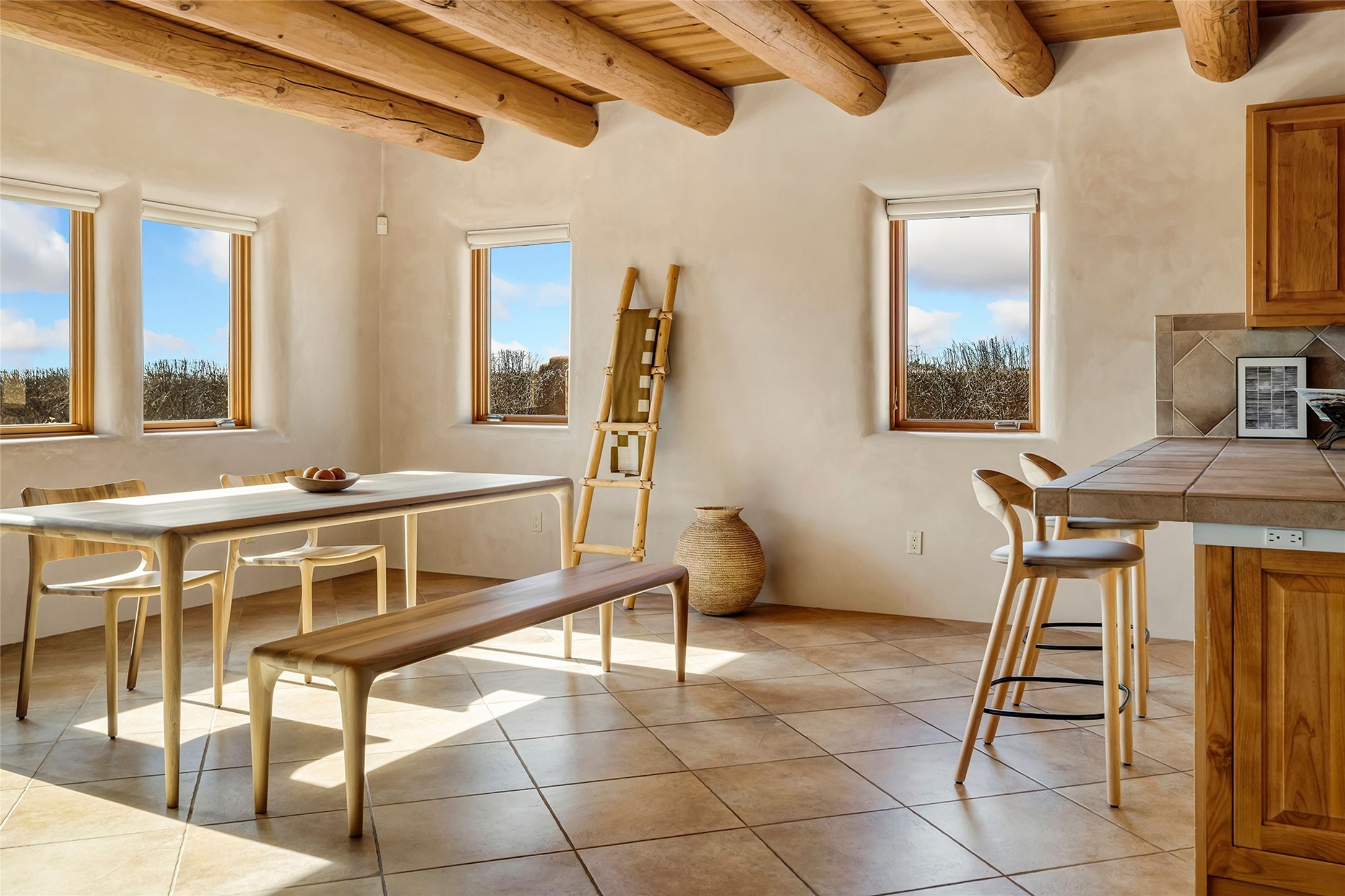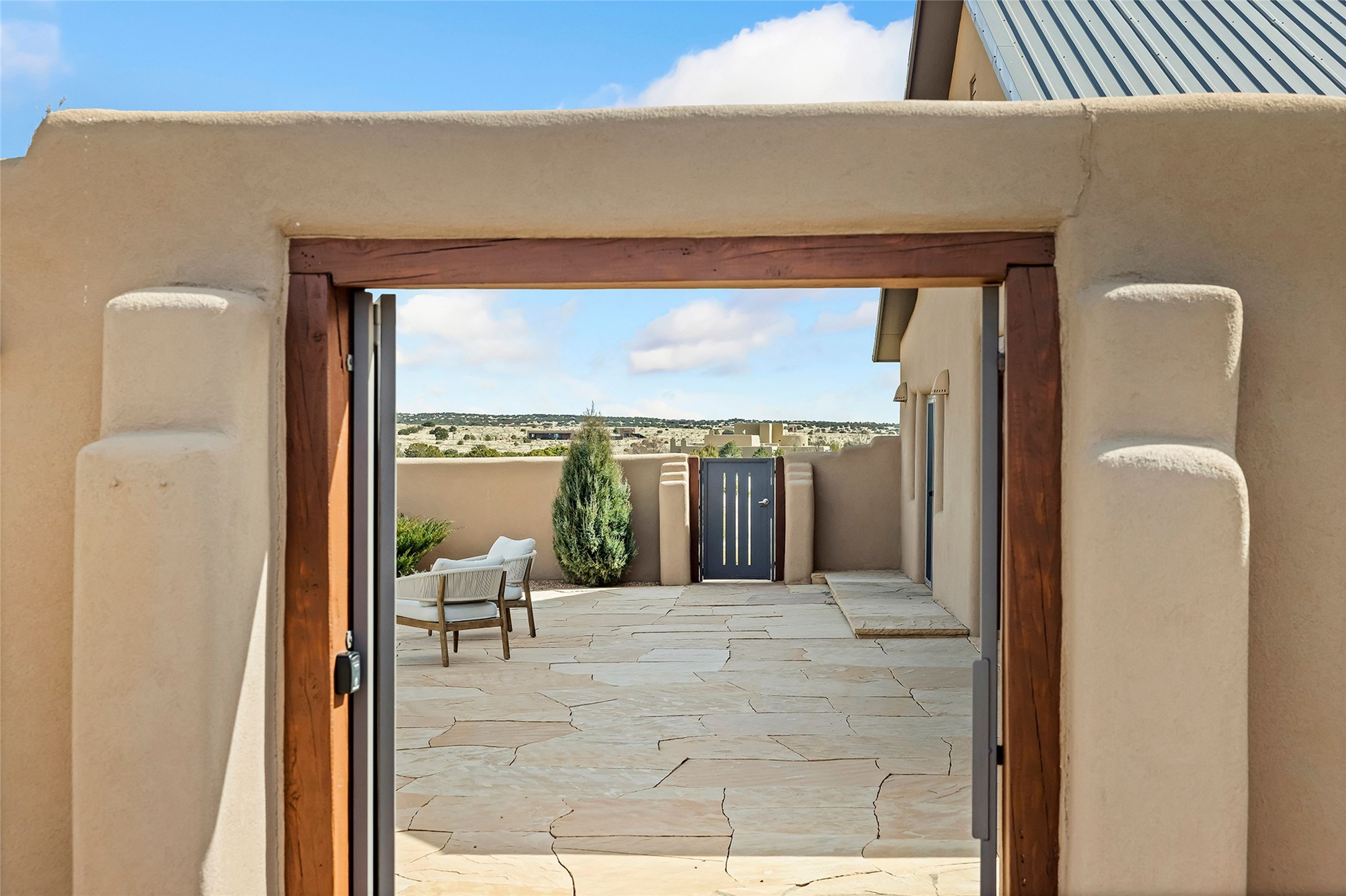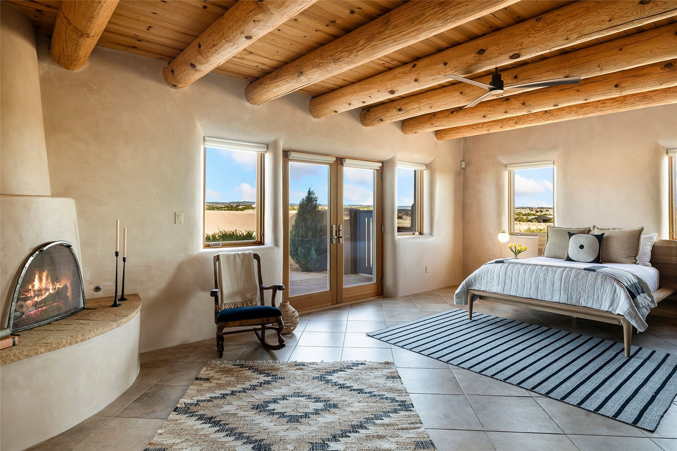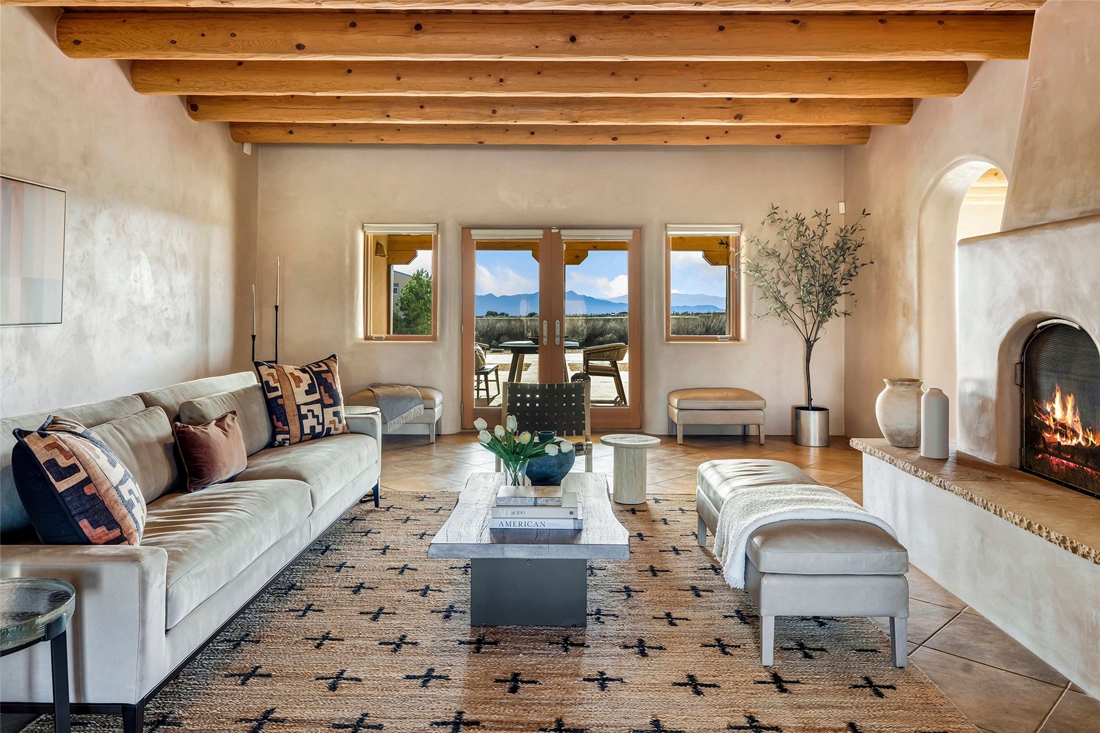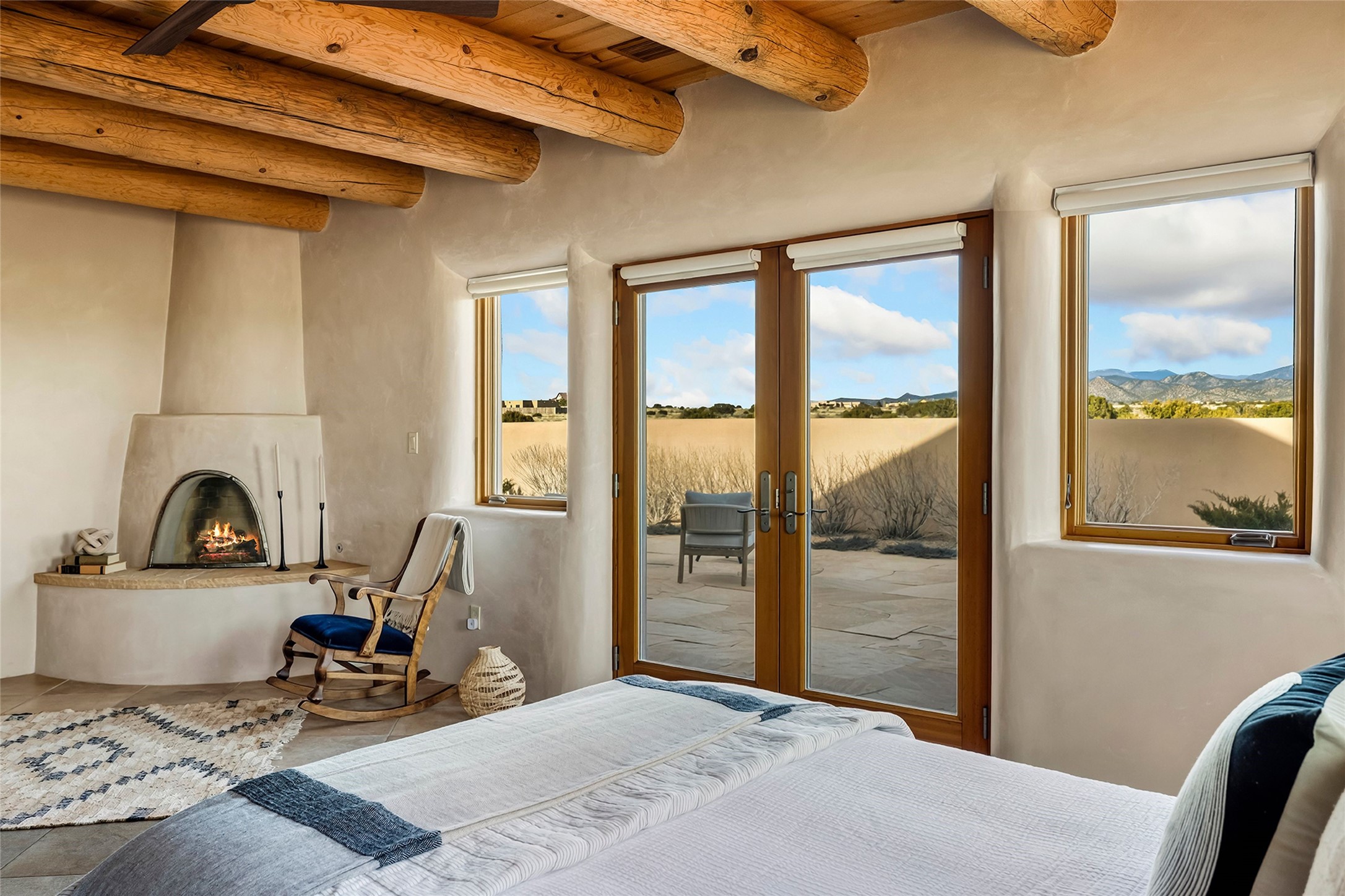 Inspired by the minimalist excellence of the famed Georgia O'Keefe, this 12.5-acre northern New Mexico estate, with horse privileges, is a living canvas where over 3,800 square feet of authentic Santa Fe architecture with an impressive main house and detached studio, captivates with one of most vibrant backdrops of vast mountain ranges and magnificent sunsets. Recently upgraded with quality improvements, this exceptional adobe-built Santa Fe sanctuary with 3 bedrooms and 2 baths within the main house and a private detached studio, sets itself apart with its quality craftsmanship, views, vast acreage, a superior outdoor living experience and flexible use of space. Design features include a stunning living room, anchored by a substantial fireplace, framed mountain views, endless walls for art and dual outdoor access to both courtyards. At its heart lies a professional epicurean kitchen which is well-appointed with Wolf and Sub-Zero appliances, excellent storage and a breakfast bar, all of which opens to the intimate dining room which overlooks the courtyard with expansive views. The luxurious, private owner's suite delights with a Kiva fireplace, French doors leading to the back portal, views and a spa-like bath. Two additional spacious guest bedrooms offer privacy, comfort and views and share an elegant full bath. The property's creative pulse is found in the custom detached studio which offers a light-drenched space with scored concrete floors, a wood-burning fireplace and offers endless possibilities for use. Additional highlights include quality windows which frame long-range mountain views, no interiors steps, warm plaster walls, authentic vigas and wood planked ceilings, neutral finishes throughout, fully enclosed front and back courtyards, a large 3-car garage, vibrant landscape and updated hardscape. ThisSanta Fe home is a rare find and offers a seamless blend of high desert luxury and the rugged, artistic spirit of the land.