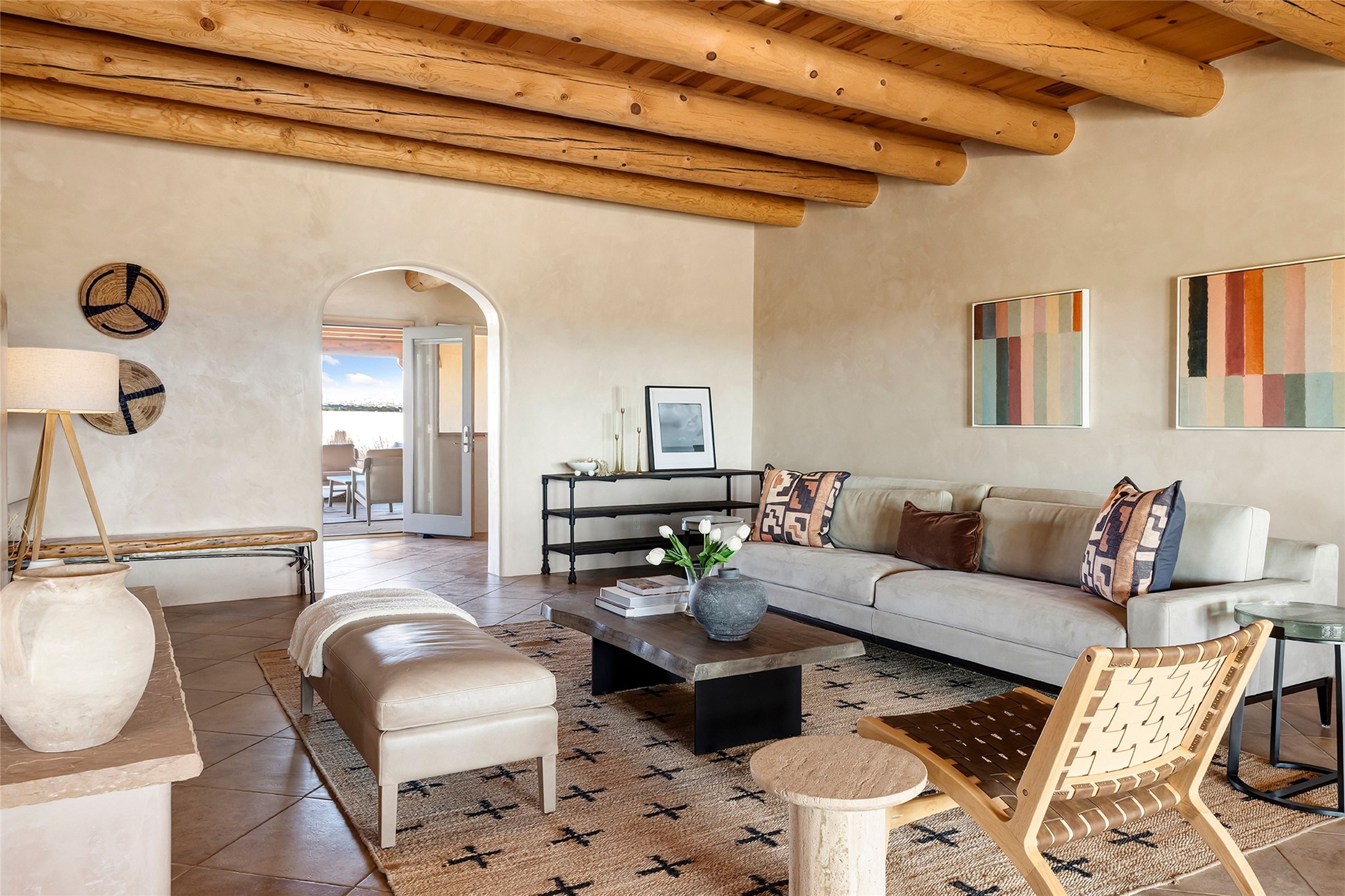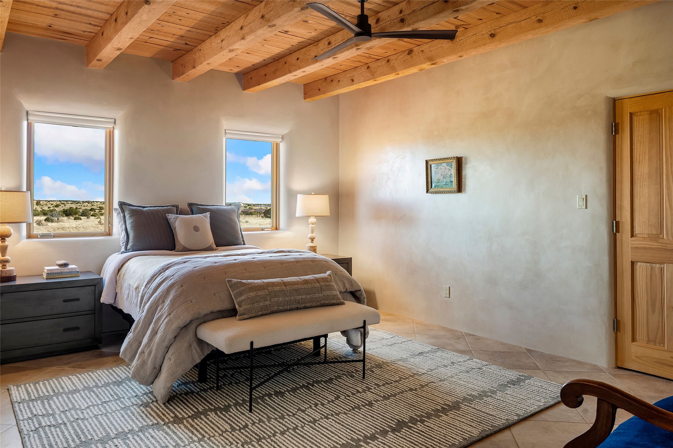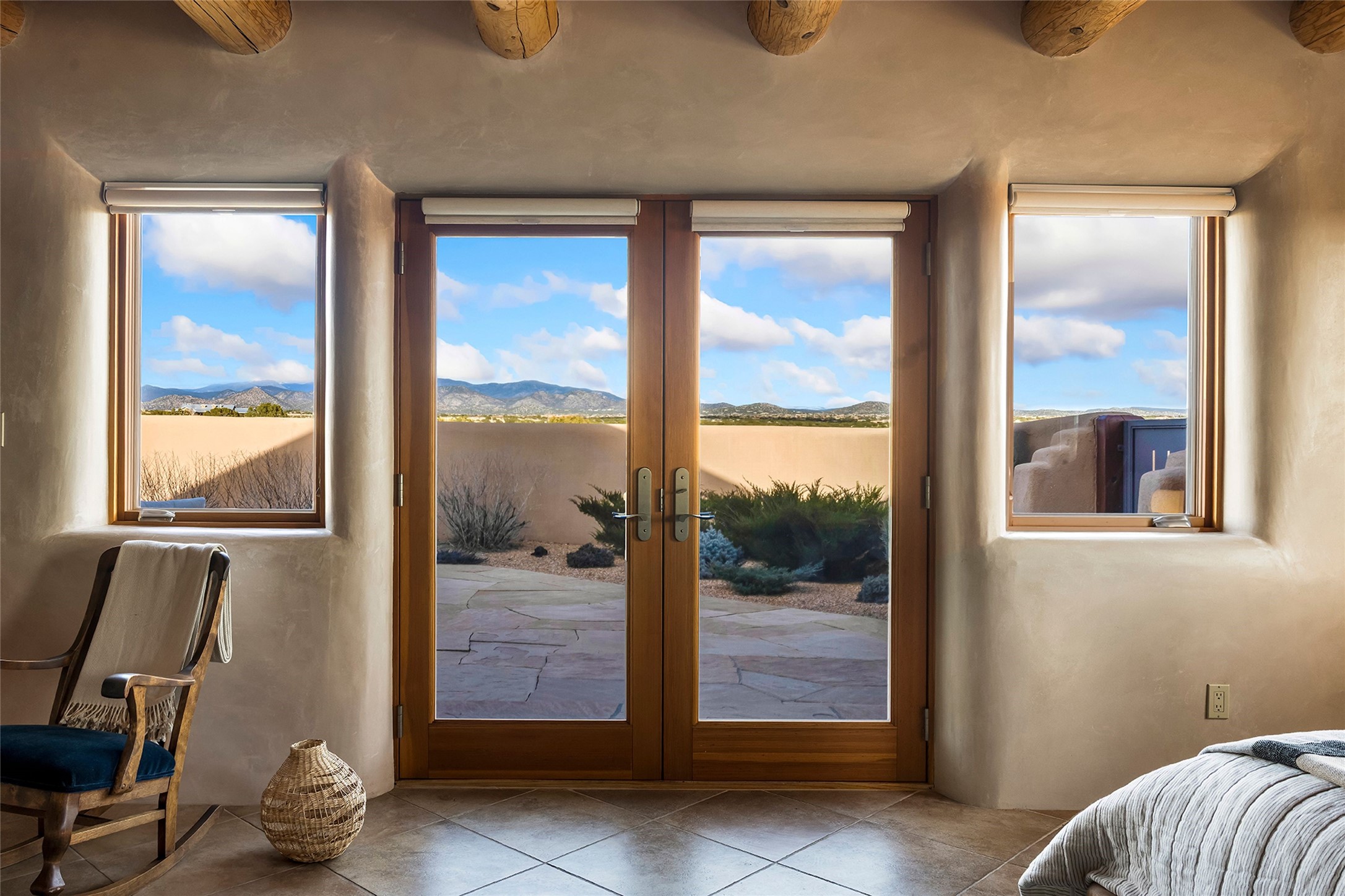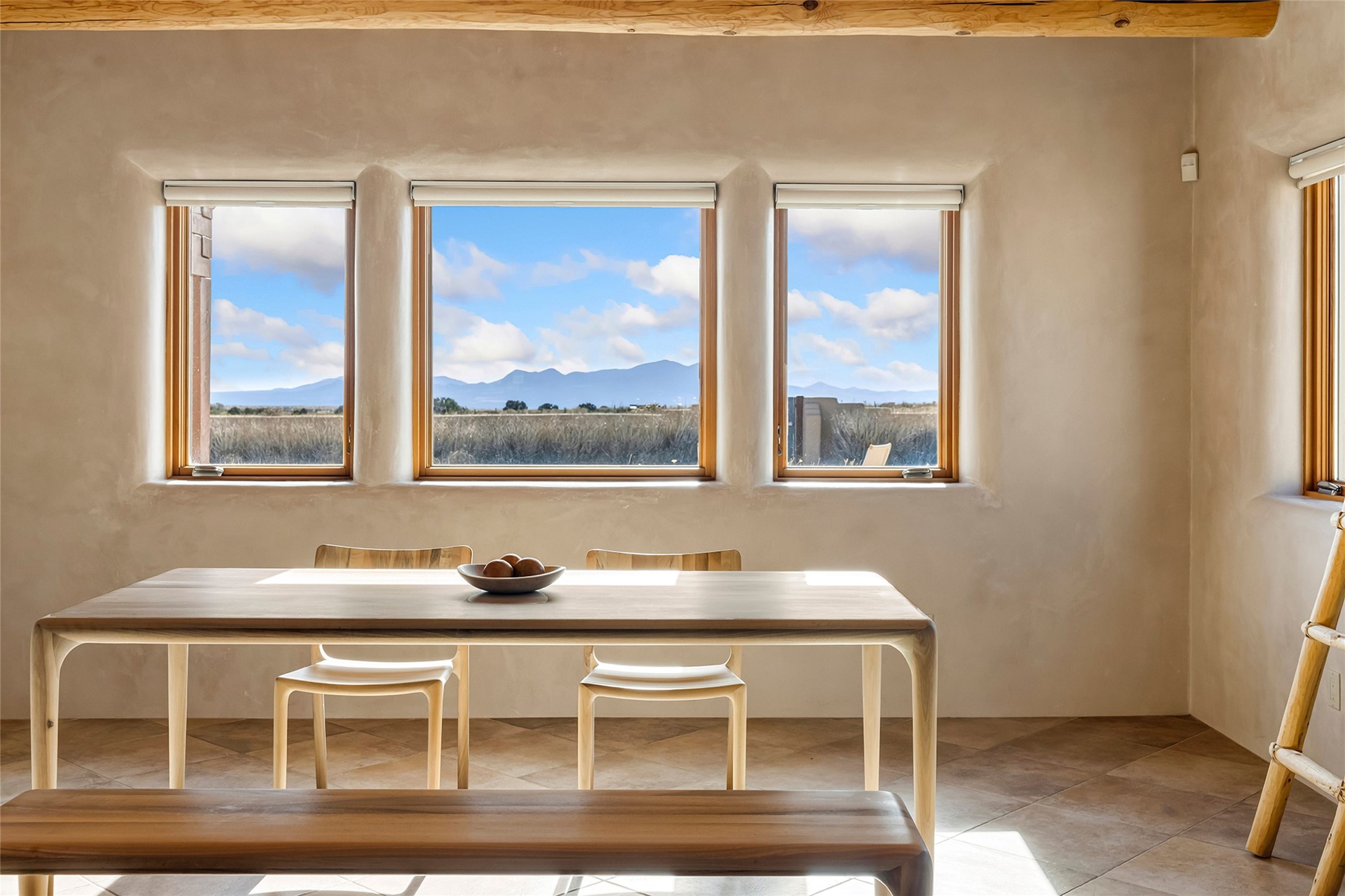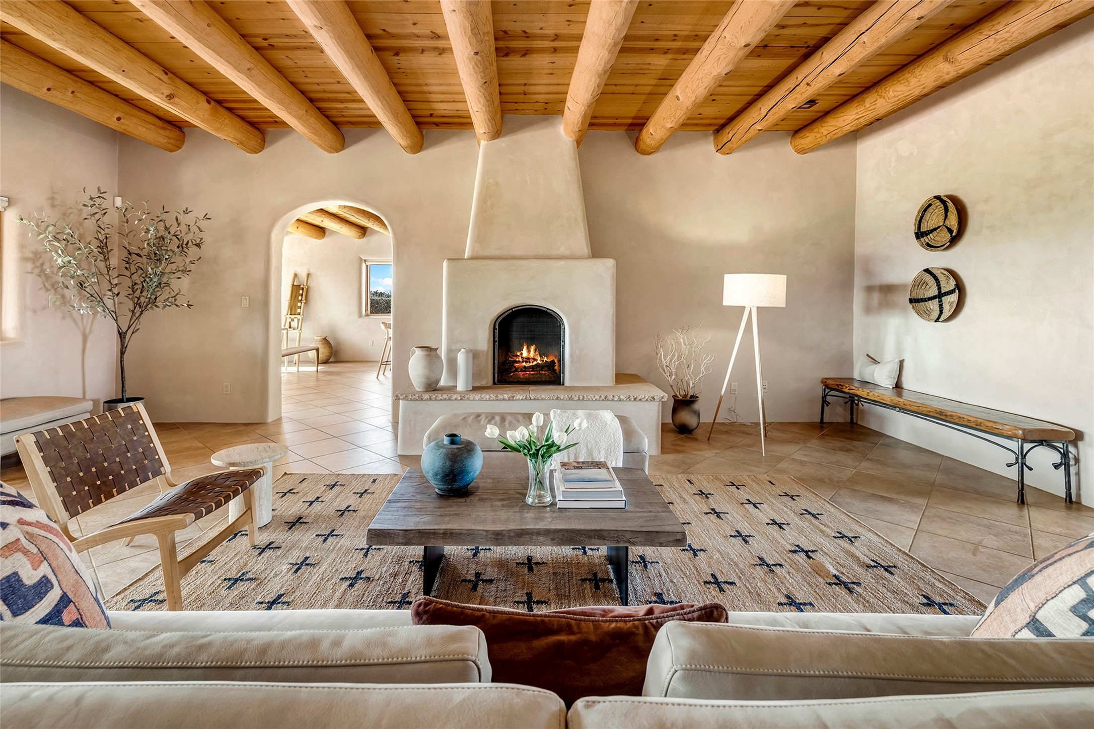 Inspired by the minimalist excellence of the famed Georgia O'Keefe, this 12.5-acre northern New Mexico estate, with horse privileges, is a living canvas where over 3,800 square feet of authentic Santa Fe architecture with an impressive main house and detached studio, captivates with one of most vibrant backdrops of vast mountain ranges and magnificent sunsets. Recently upgraded with quality improvements, this exceptional adobe-built Santa Fe sanctuary with 3 bedrooms and 2 baths within the main house and a private detached studio, sets itself apart with its quality craftsmanship, views, vast acreage, a superior outdoor living experience and flexible use of space. Design features include a stunning living room, anchored by a substantial fireplace, framed mountain views, endless walls for art and dual outdoor access to both courtyards. At its heart lies a professional epicurean kitchen which is well-appointed with Wolf and Sub-Zero appliances, excellent storage and a breakfast bar, all of which opens to the intimate dining room which overlooks the courtyard with expansive views. The luxurious, private owner's suite delights with a Kiva fireplace, French doors leading to the back portal, views and a spa-like bath. Two additional spacious guest bedrooms offer privacy, comfort and views and share an elegant full bath. The property's creative pulse is found in the custom detached studio which offers a light-drenched space with scored concrete floors, a wood-burning fireplace and offers endless possibilities for use. Additional highlights include quality windows which frame long-range mountain views, no interiors steps, warm plaster walls, authentic vigas and wood planked ceilings, neutral finishes throughout, fully enclosed front and back courtyards, a large 3-car garage, vibrant landscape and updated hardscape. ThisSanta Fe home is a rare find and offers a seamless blend of high desert luxury and the rugged, artistic spirit of the land.