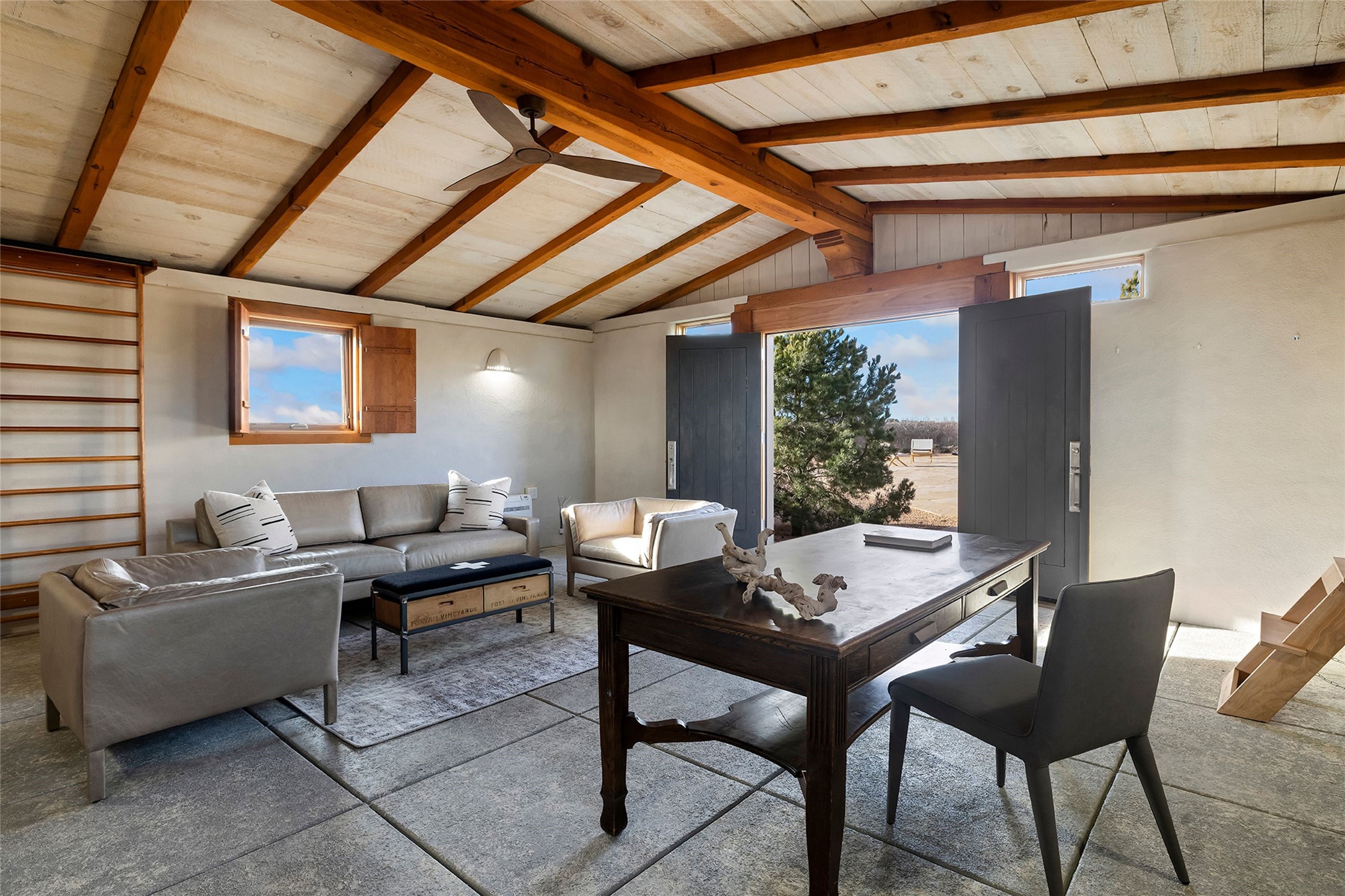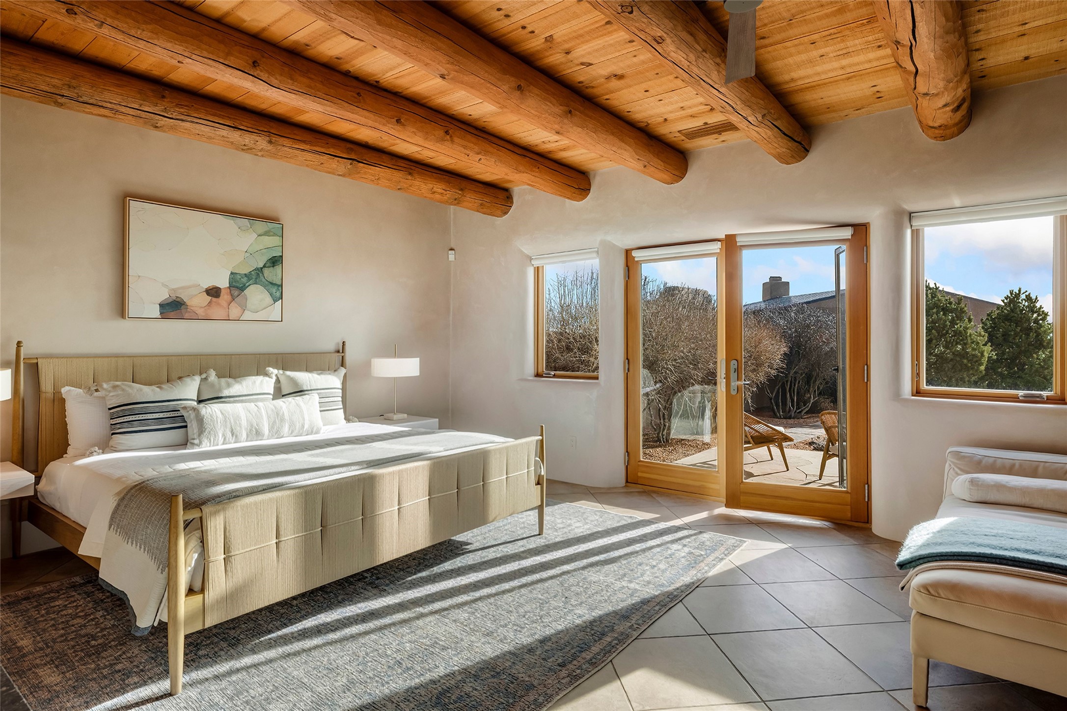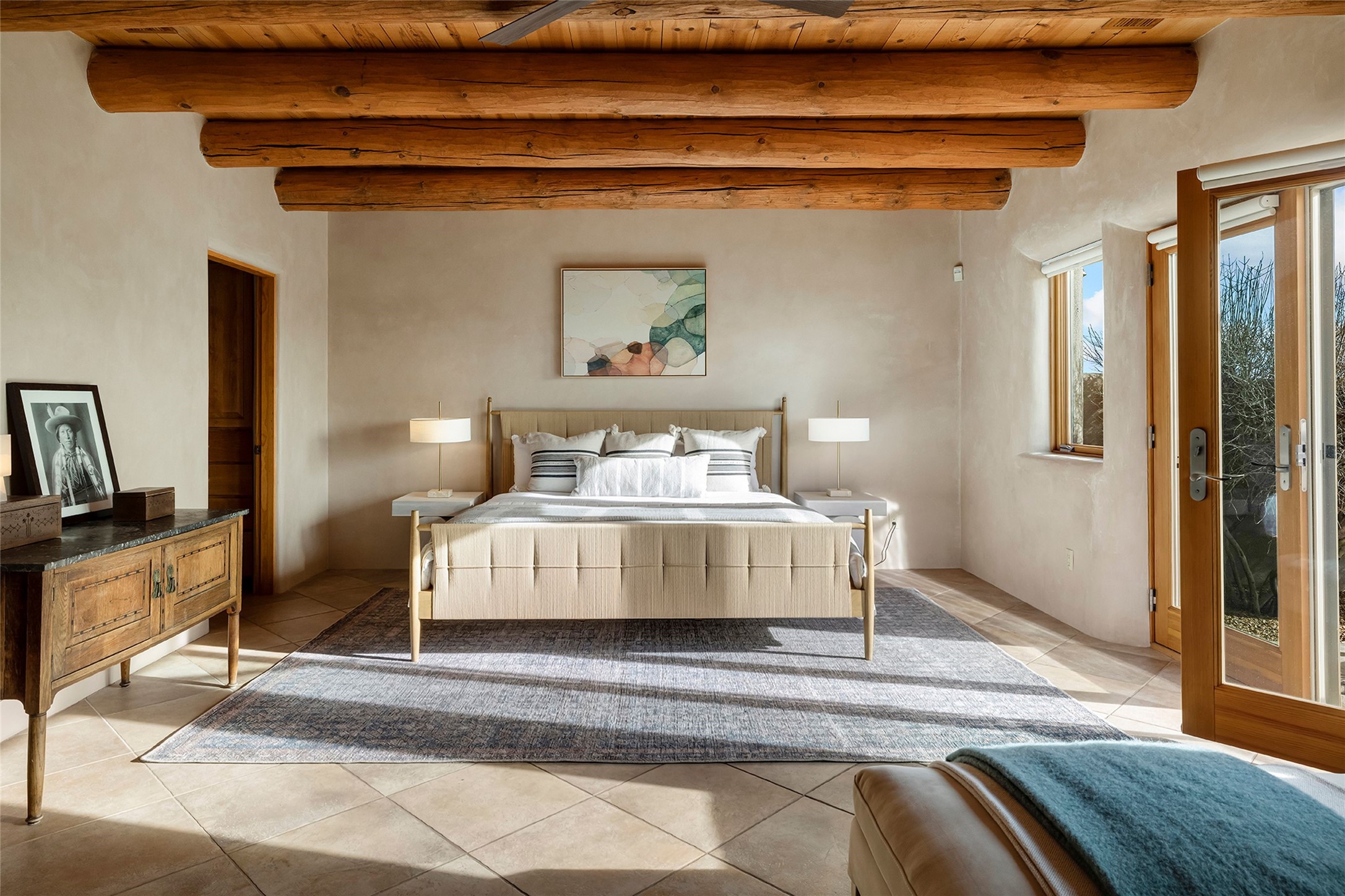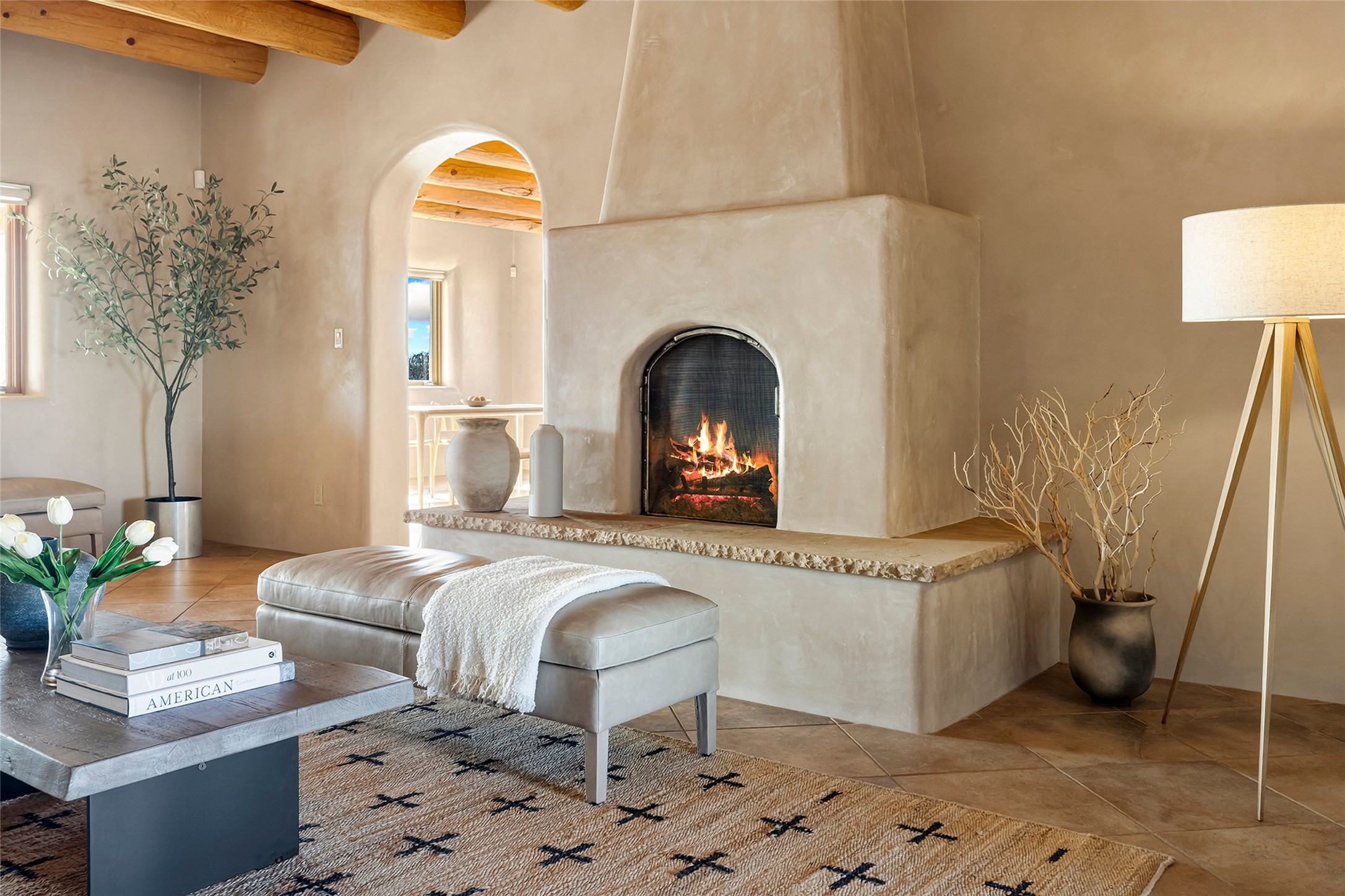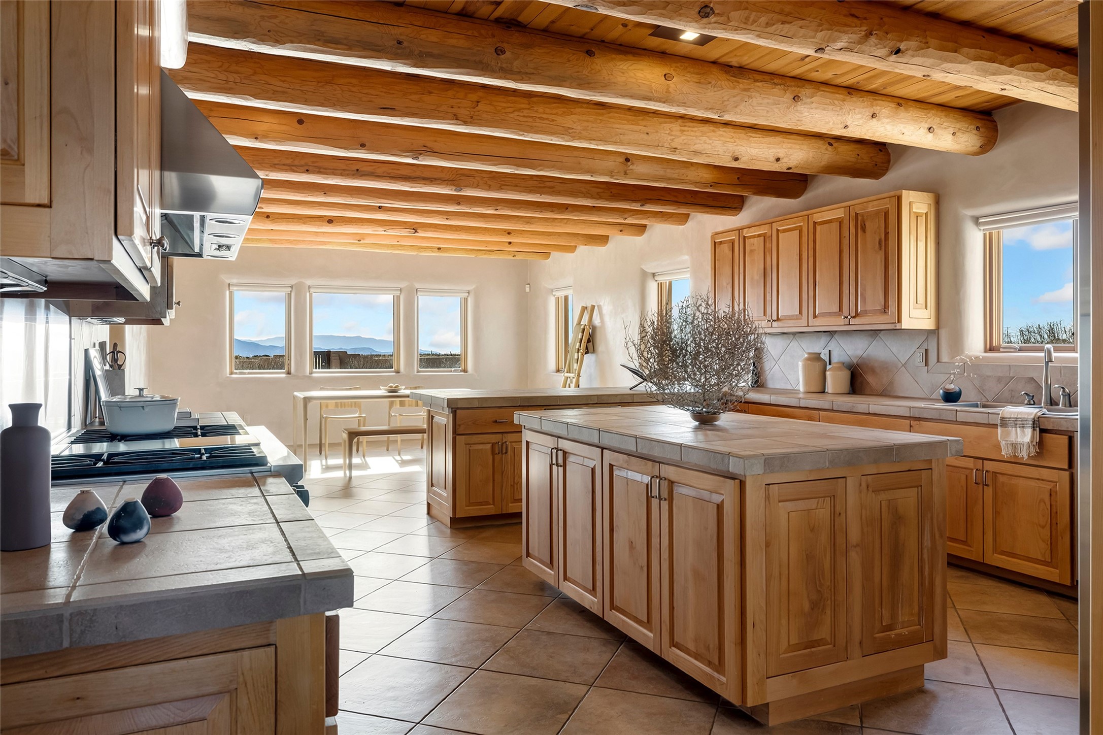 Inspired by the minimalist excellence of the famed Georgia O'Keefe, this 12.5-acre northern New Mexico estate, with horse privileges, is a living canvas where over 3,800 square feet of authentic Santa Fe architecture with an impressive main house and detached studio, captivates with one of most vibrant backdrops of vast mountain ranges and magnificent sunsets. Recently upgraded with quality improvements, this exceptional adobe-built Santa Fe sanctuary with 3 bedrooms and 2 baths within the main house and a private detached studio, sets itself apart with its quality craftsmanship, views, vast acreage, a superior outdoor living experience and flexible use of space. Design features include a stunning living room, anchored by a substantial fireplace, framed mountain views, endless walls for art and dual outdoor access to both courtyards. At its heart lies a professional epicurean kitchen which is well-appointed with Wolf and Sub-Zero appliances, excellent storage and a breakfast bar, all of which opens to the intimate dining room which overlooks the courtyard with expansive views. The luxurious, private owner's suite delights with a Kiva fireplace, French doors leading to the back portal, views and a spa-like bath. Two additional spacious guest bedrooms offer privacy, comfort and views and share an elegant full bath. The property's creative pulse is found in the custom detached studio which offers a light-drenched space with scored concrete floors, a wood-burning fireplace and offers endless possibilities for use. Additional highlights include quality windows which frame long-range mountain views, no interiors steps, warm plaster walls, authentic vigas and wood planked ceilings, neutral finishes throughout, fully enclosed front and back courtyards, a large 3-car garage, vibrant landscape and updated hardscape. ThisSanta Fe home is a rare find and offers a seamless blend of high desert luxury and the rugged, artistic spirit of the land.