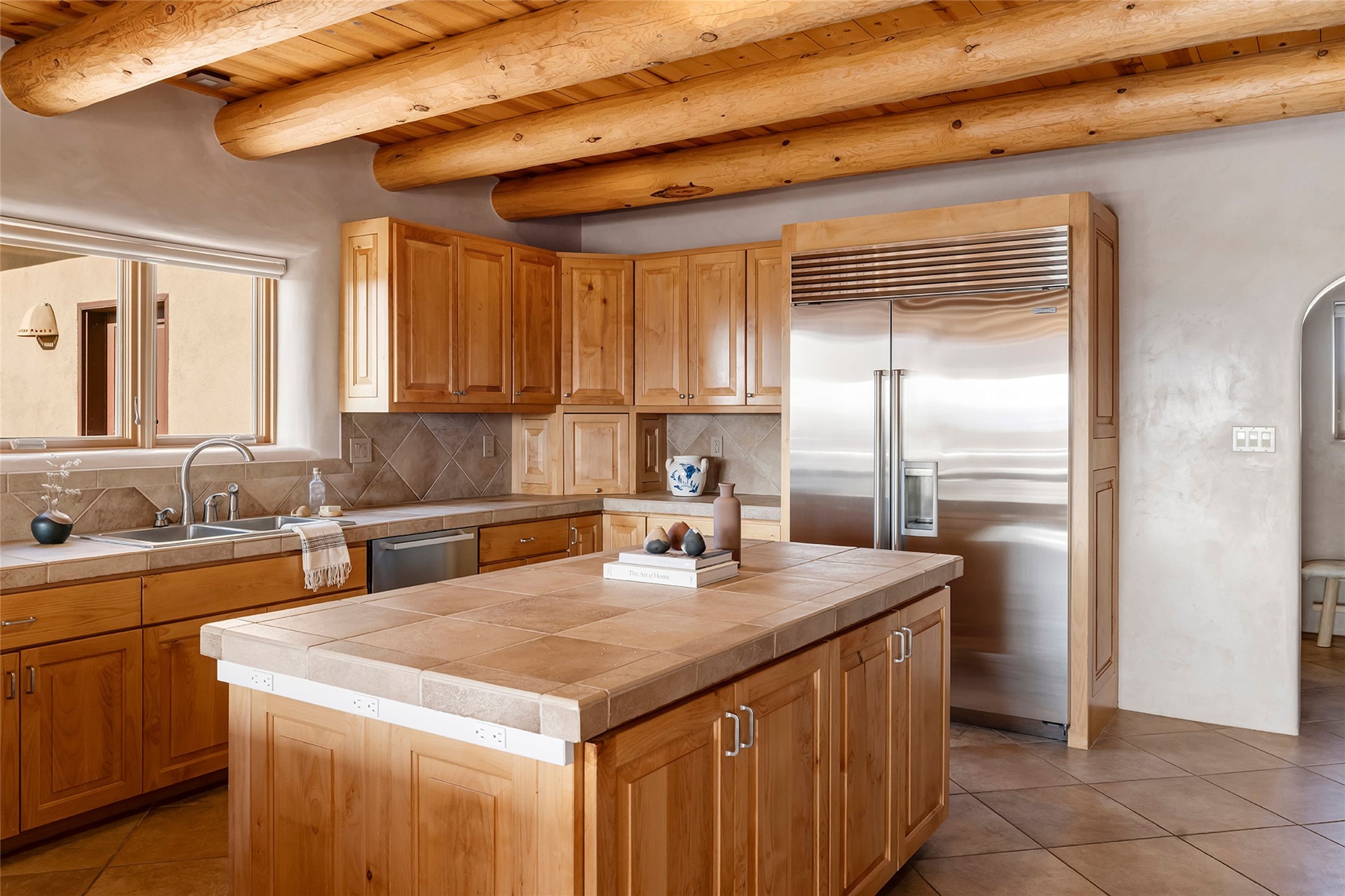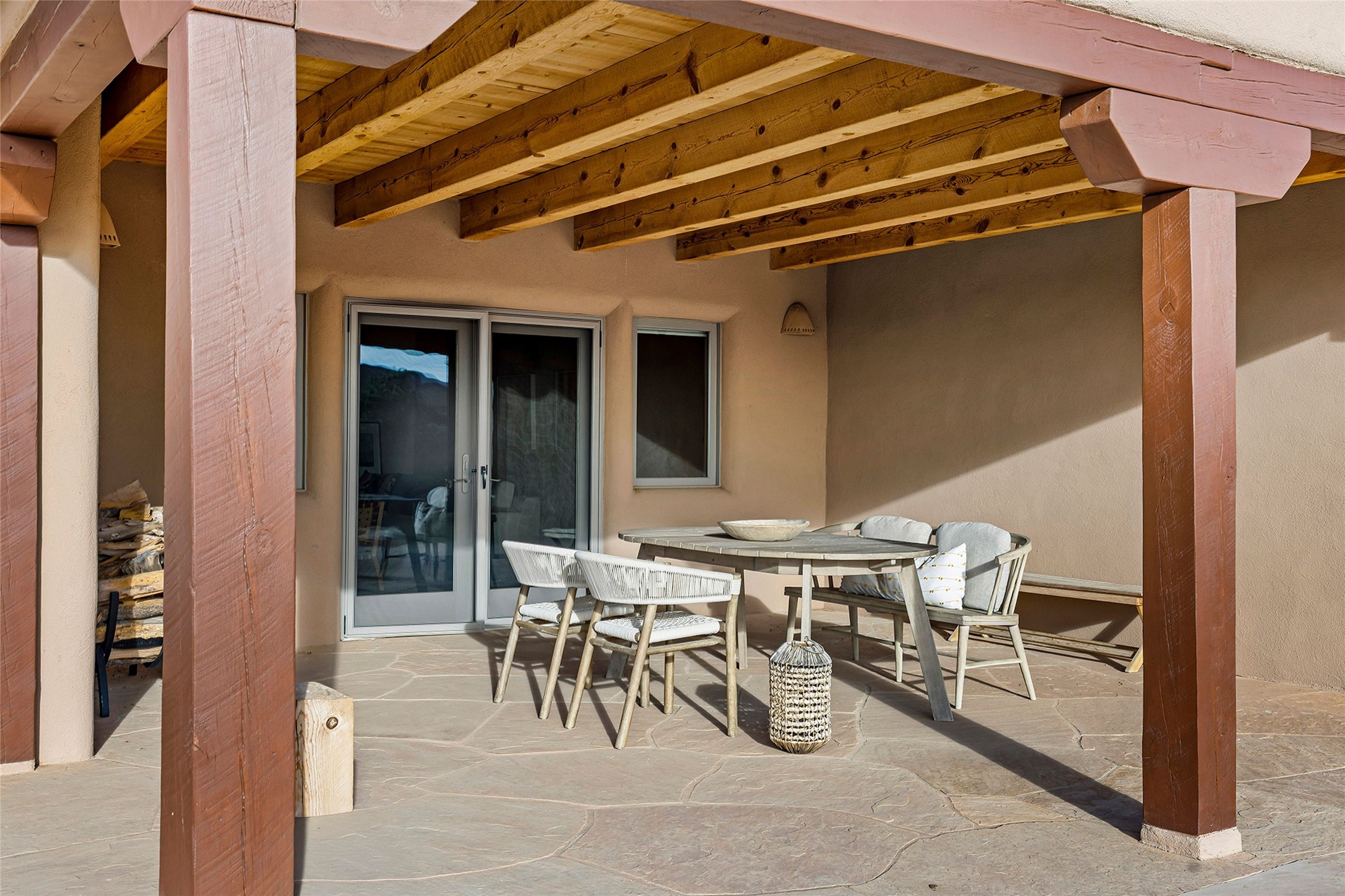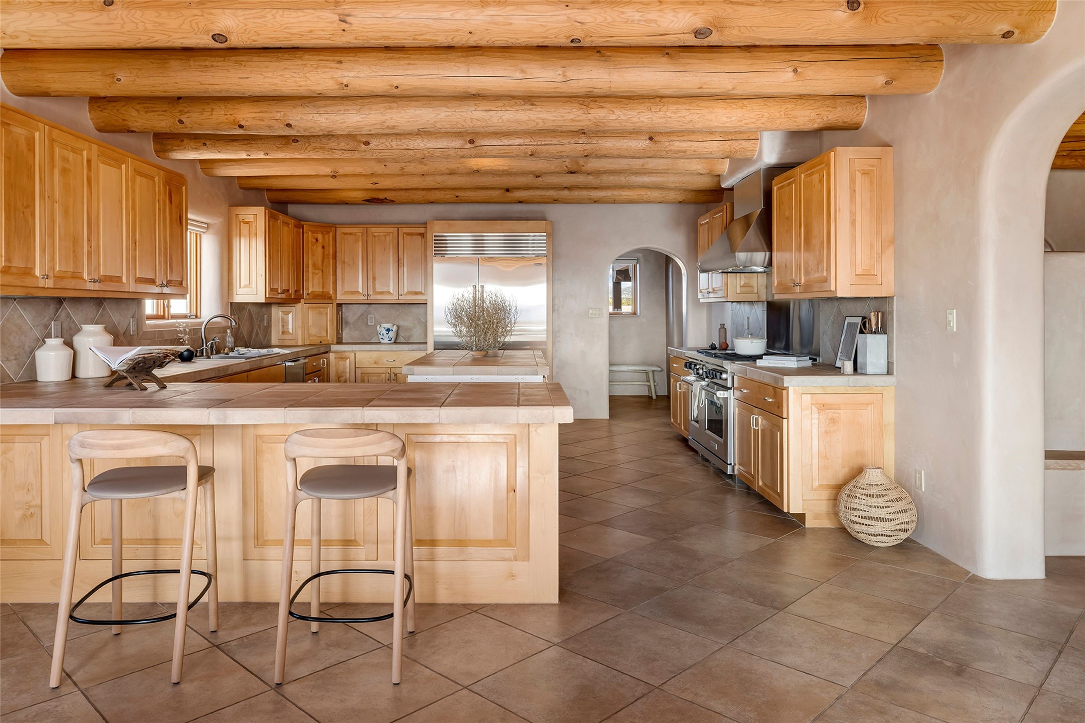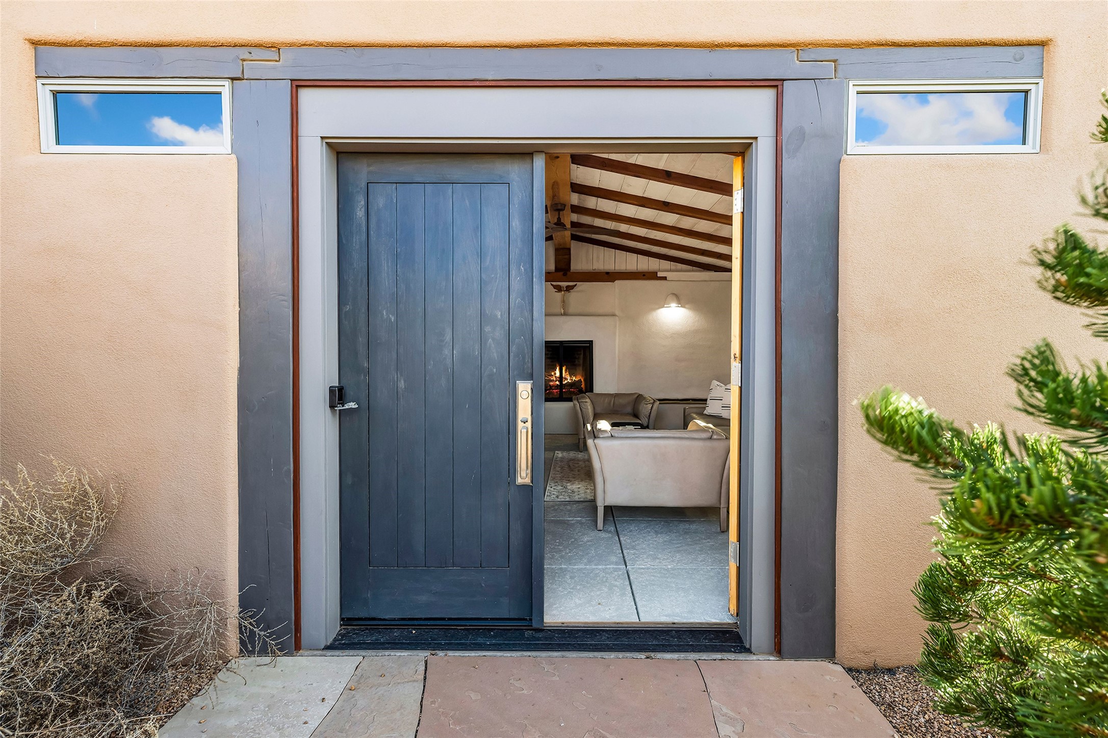 Inspired by the minimalist excellence of the famed Georgia O'Keefe, this 12.5-acre northern New Mexico estate, with horse privileges, is a living canvas where over 3,800 square feet of authentic Santa Fe architecture with an impressive main house and detached studio, captivates with one of most vibrant backdrops of vast mountain ranges and magnificent sunsets. Recently upgraded with quality improvements, this exceptional adobe-built Santa Fe sanctuary with 3 bedrooms and 2 baths within the main house and a private detached studio, sets itself apart with its quality craftsmanship, views, vast acreage, a superior outdoor living experience and flexible use of space. Design features include a stunning living room, anchored by a substantial fireplace, framed mountain views, endless walls for art and dual outdoor access to both courtyards. At its heart lies a professional epicurean kitchen which is well-appointed with Wolf and Sub-Zero appliances, excellent storage and a breakfast bar, all of which opens to the intimate dining room which overlooks the courtyard with expansive views. The luxurious, private owner's suite delights with a Kiva fireplace, French doors leading to the back portal, views and a spa-like bath. Two additional spacious guest bedrooms offer privacy, comfort and views and share an elegant full bath. The property's creative pulse is found in the custom detached studio which offers a light-drenched space with scored concrete floors, a wood-burning fireplace and offers endless possibilities for use. Additional highlights include quality windows which frame long-range mountain views, no interiors steps, warm plaster walls, authentic vigas and wood planked ceilings, neutral finishes throughout, fully enclosed front and back courtyards, a large 3-car garage, vibrant landscape and updated hardscape. ThisSanta Fe home is a rare find and offers a seamless blend of high desert luxury and the rugged, artistic spirit of the land.