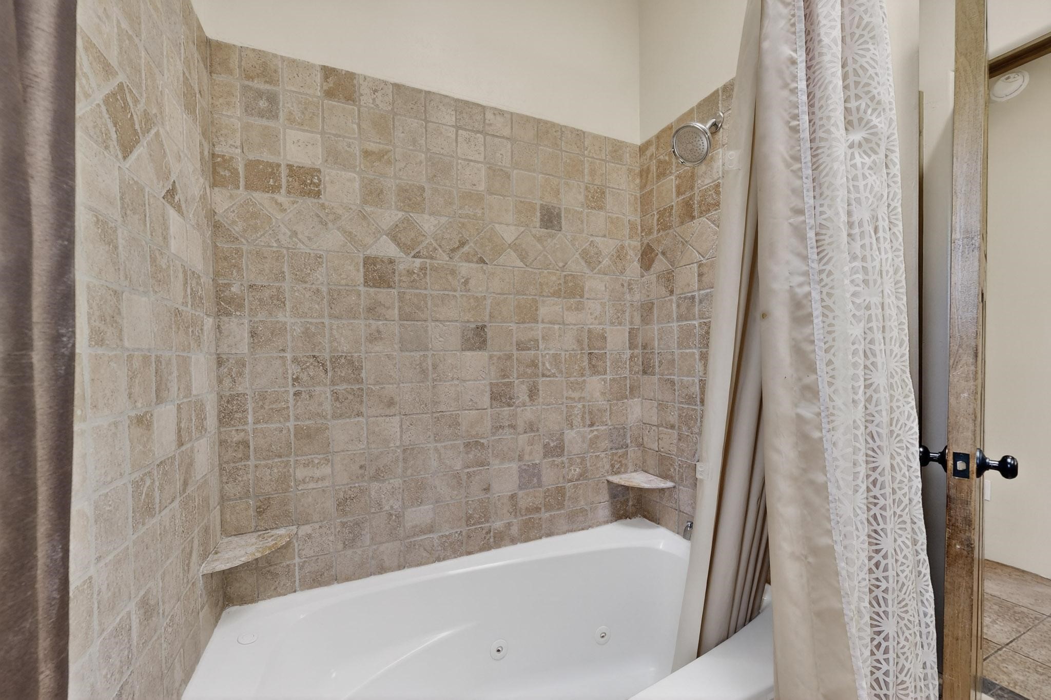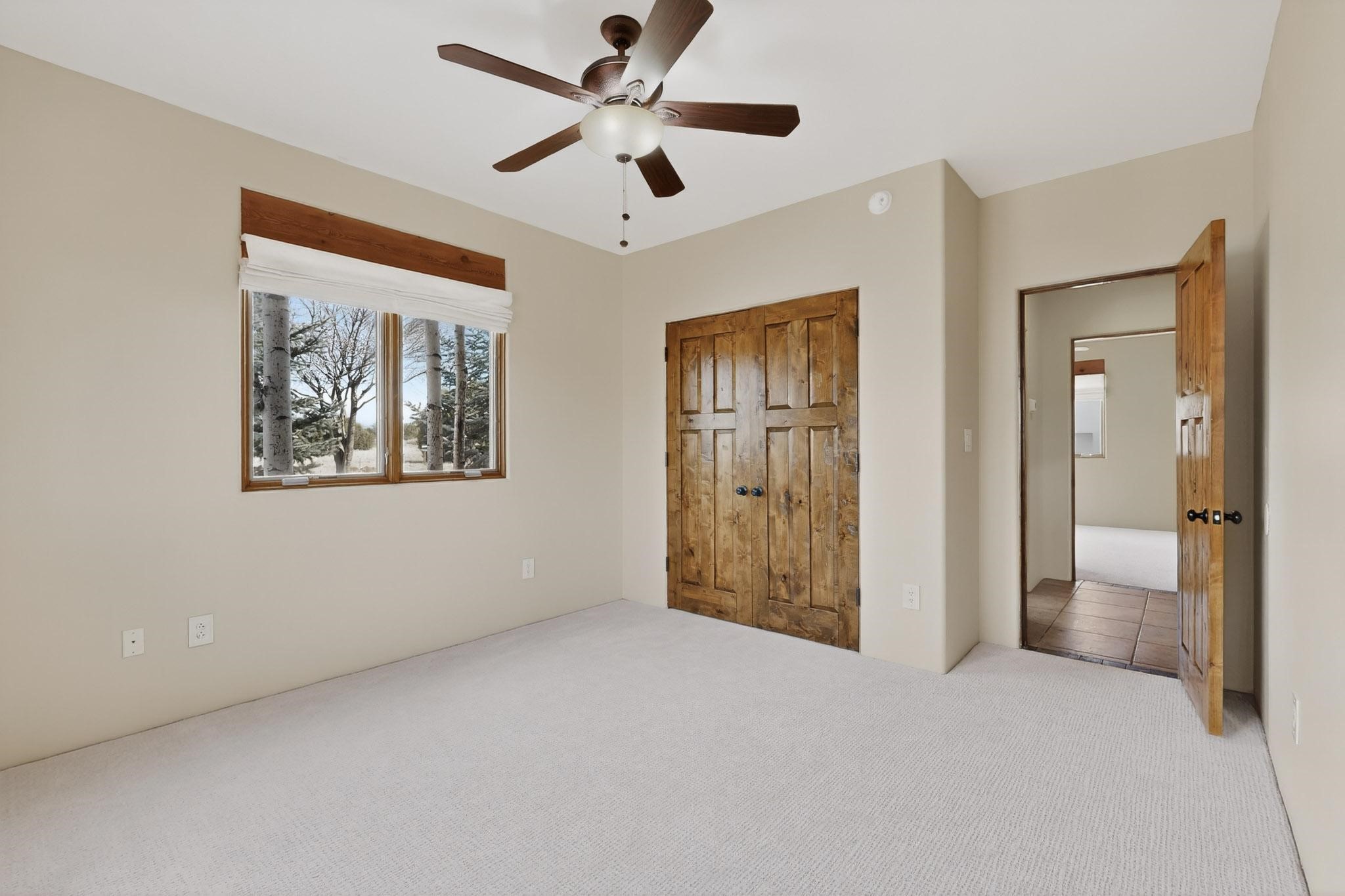This stunning home in La Pradera is one of the few custom-built homes in the neighborhood with upgraded southwestern finishes. This open-concept gem features authentic vigas and a magnificent handcrafted river rock wood-burning fireplace. The exquisite custom cabinetry and doors are meticulously handcrafted by a local Santa Fe artisan. The chef's kitchen boasts stone countertops, a skylight, a gas stove, a new fridge, and double smart ovens. Year-round comfort is guaranteed with radiant floor heat, central heating/cooling, and upgraded electrical panels. The smart layout offers great primary/guest separation from the 3 additional bedrooms, one of which has a private exterior entrance, perfect for an office or flex space. The 2 full bathrooms and one bathroom perfectly serve the home. Premium Pella windows let in tons of natural light. Step outside to a private backyard surrounded by beautiful trees perfect for entertaining, with traditional coyote fencing, mature aspens, and a dog run. Included is a 3-car finished garage. The home sits on an extra-large corner lot, which offers additional parking for your guests and unbeatable access to trails, shopping, and I-25!