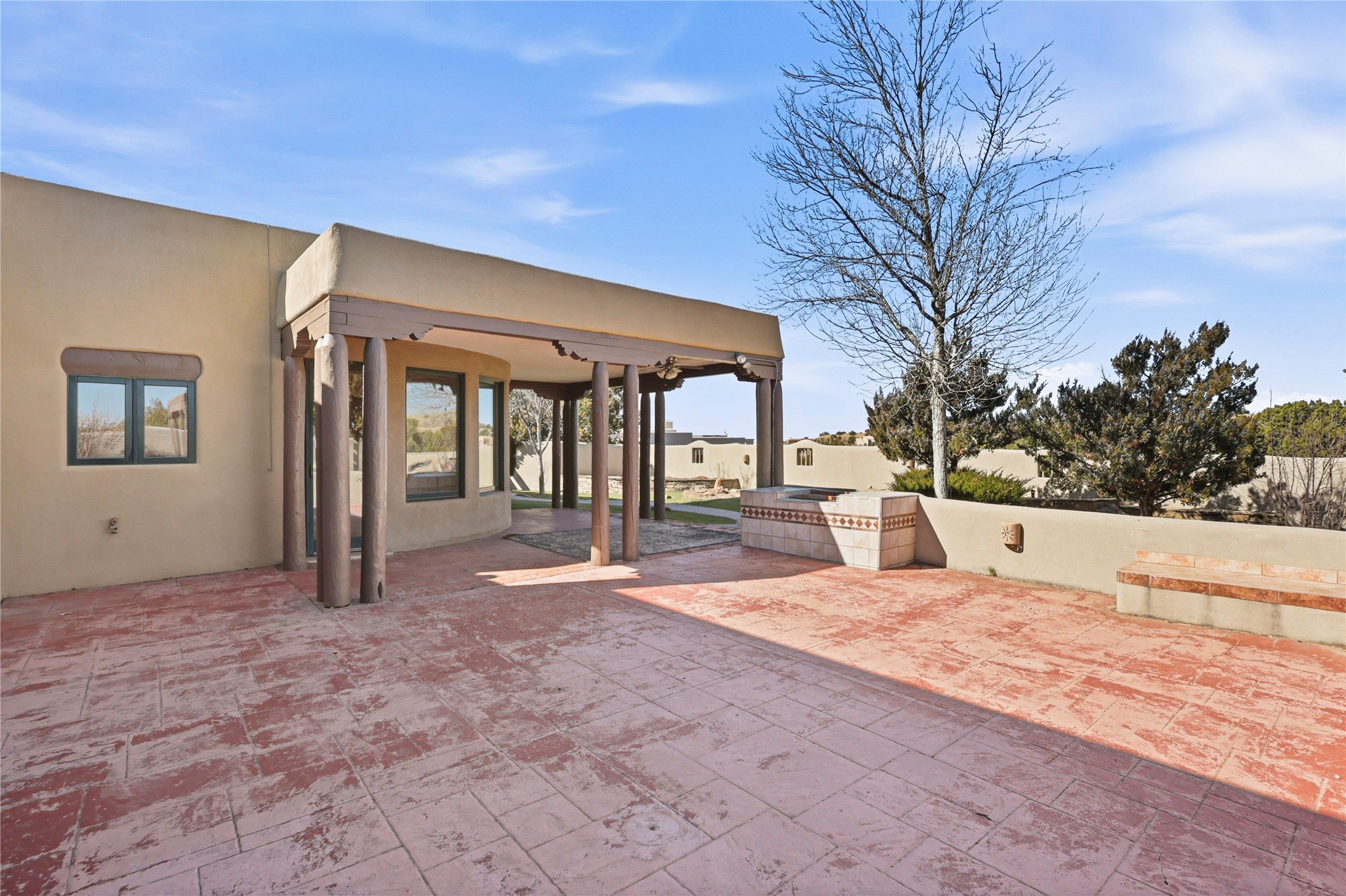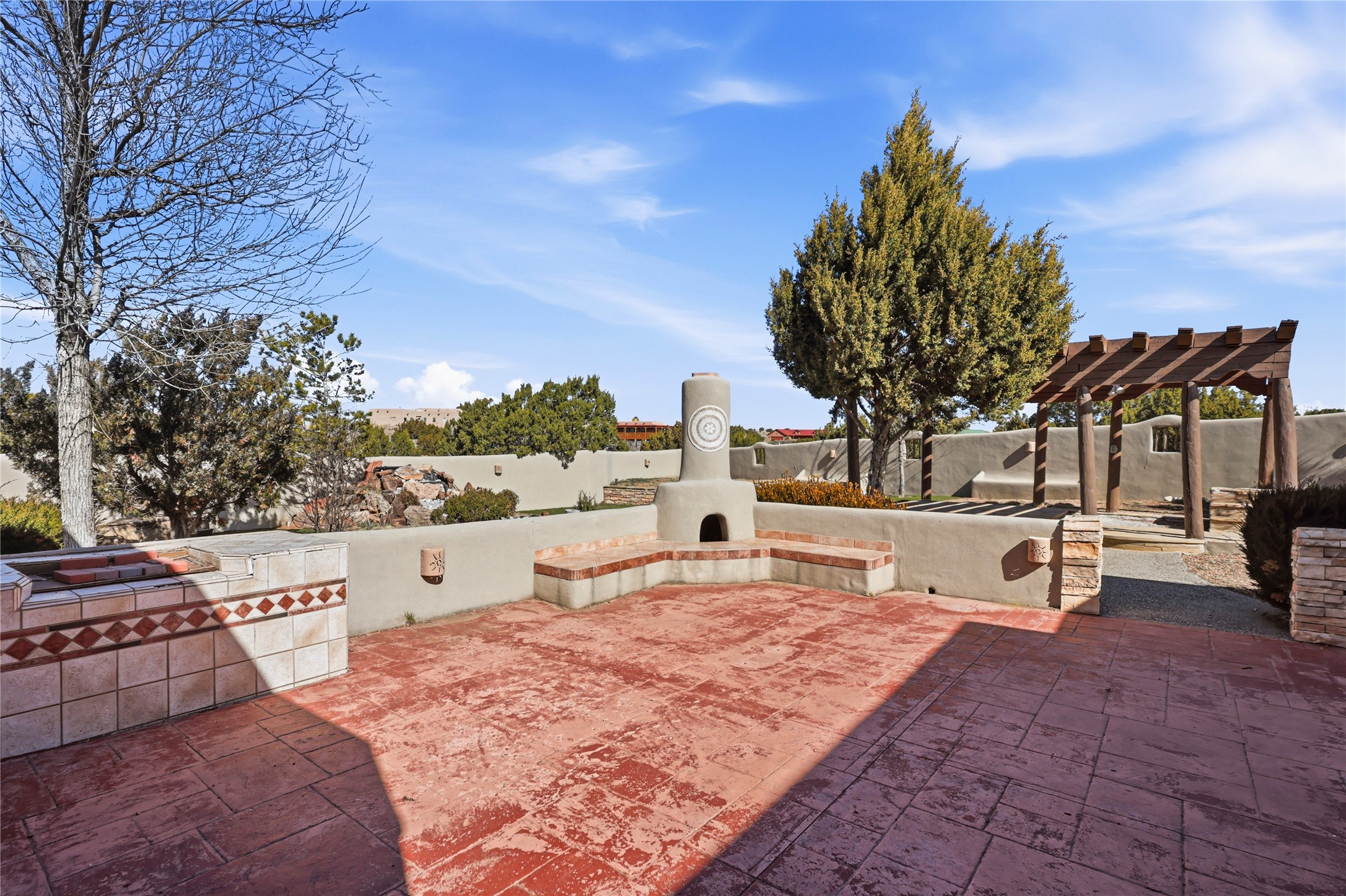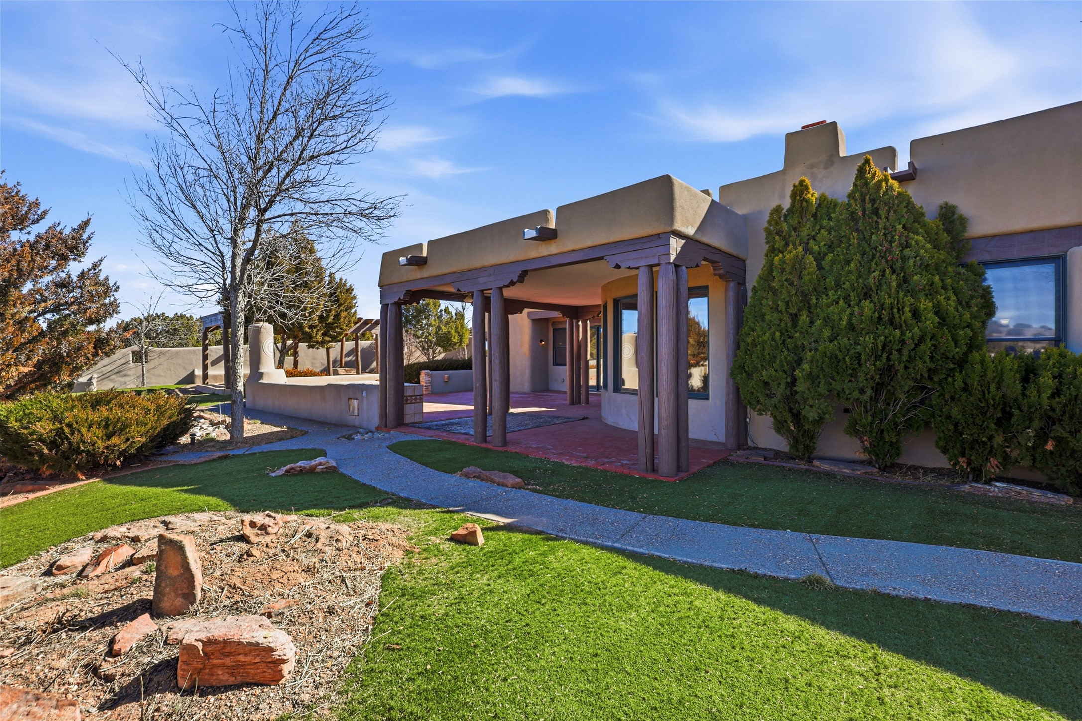 Spacious Southwestern retreat situated on a generous 1.3-acre lot, offering privacy and charm behind a classic stucco wall. The beautifully landscaped grounds create a serene setting, perfect for relaxing or entertaining on the expansive patio while taking in breathtaking New Mexico sunsets.Inside, the home blends warmth and character with modern updates. The expansive great room features a stunning tongue-and-groove ceiling, dramatic vigas, and a traditional kiva-style fireplace--creating a true Southwest ambiance. Fresh neutral paint and recently replaced carpet add a crisp, move-in-ready feel throughout.The primary suite offers a peaceful escape with an ensuite bath and walk-in closet. Two additional bedrooms provide ample space and generous closets. A well-appointed chef's kitchen flows seamlessly into the adjoining dining area, making it ideal for both everyday living and hosting gatherings.This private, beautifully maintained property captures the essence of Southwest living with space, style, and unforgettable sunsets.