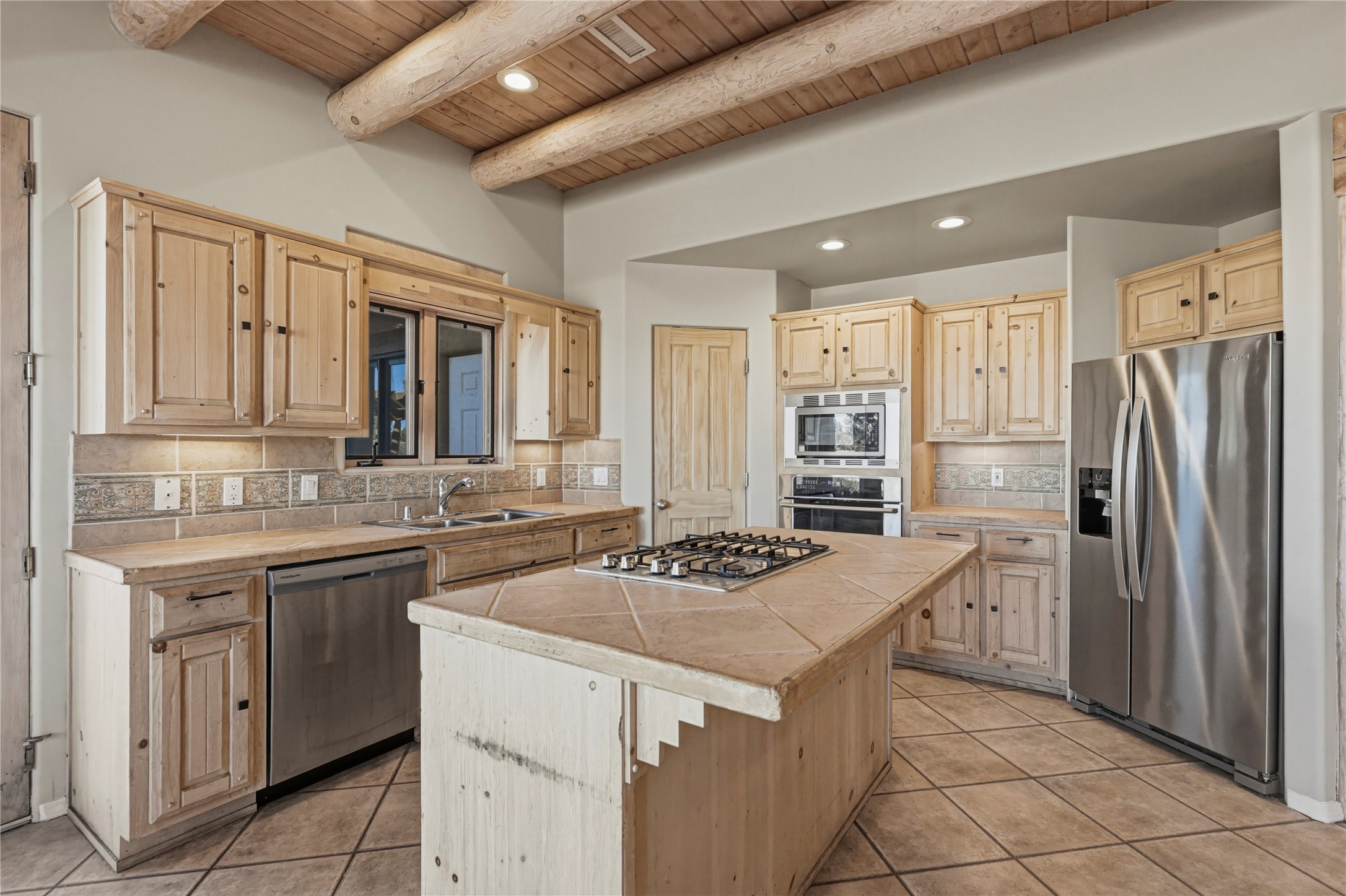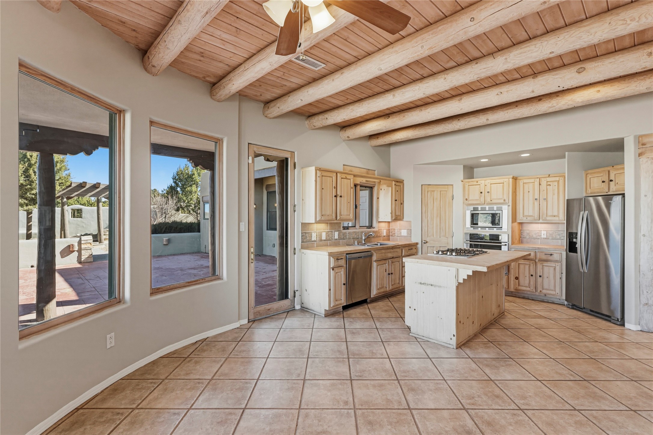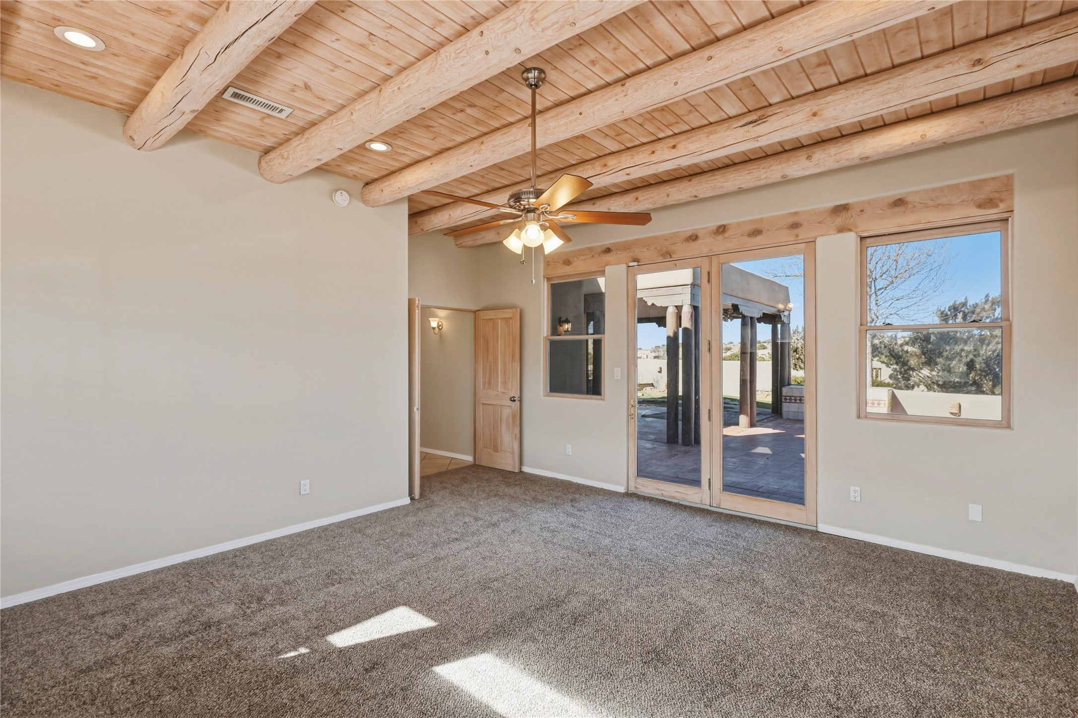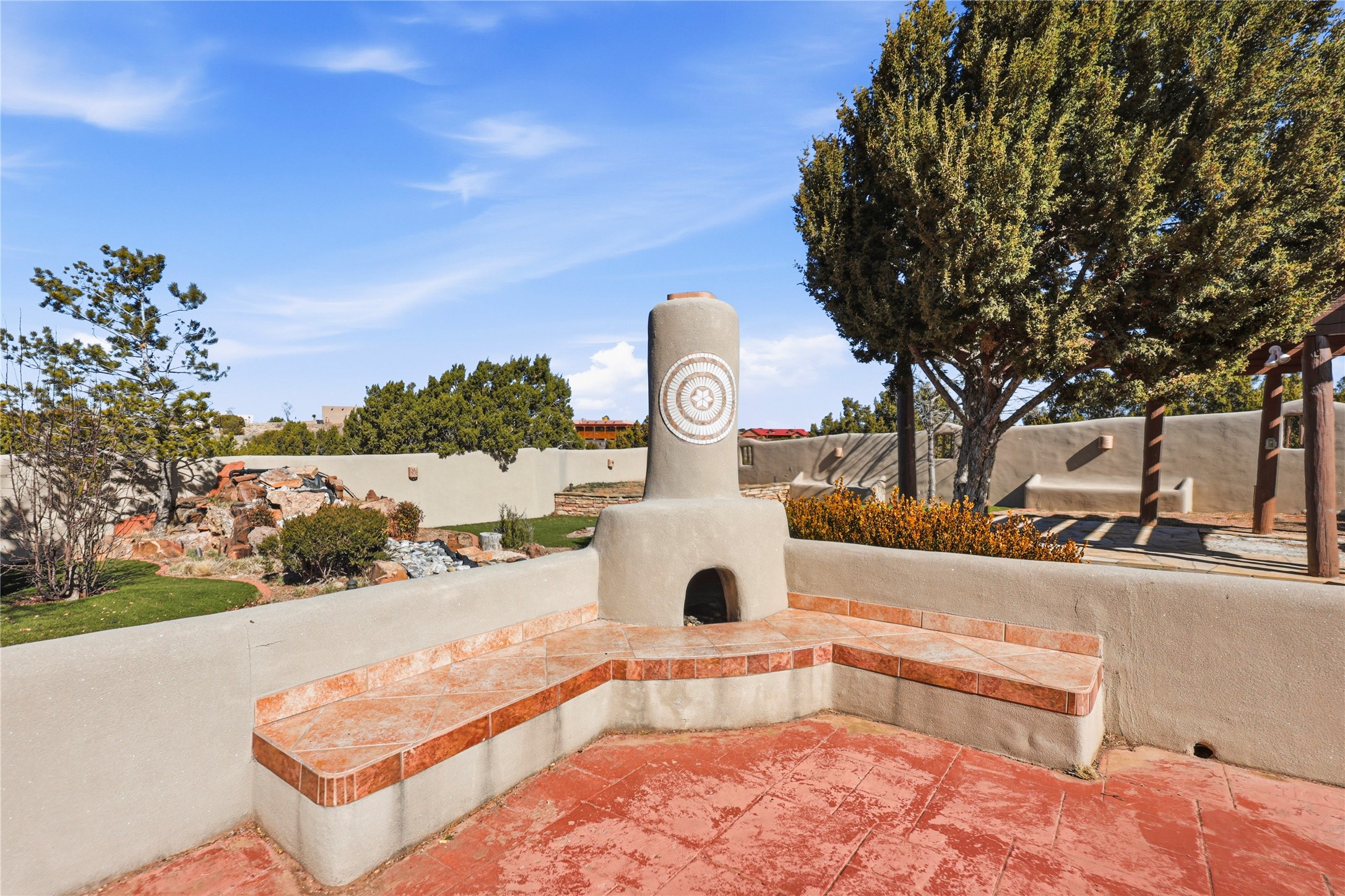 Spacious Southwestern retreat situated on a generous 1.3-acre lot, offering privacy and charm behind a classic stucco wall. The beautifully landscaped grounds create a serene setting, perfect for relaxing or entertaining on the expansive patio while taking in breathtaking New Mexico sunsets.Inside, the home blends warmth and character with modern updates. The expansive great room features a stunning tongue-and-groove ceiling, dramatic vigas, and a traditional kiva-style fireplace--creating a true Southwest ambiance. Fresh neutral paint and recently replaced carpet add a crisp, move-in-ready feel throughout.The primary suite offers a peaceful escape with an ensuite bath and walk-in closet. Two additional bedrooms provide ample space and generous closets. A well-appointed chef's kitchen flows seamlessly into the adjoining dining area, making it ideal for both everyday living and hosting gatherings.This private, beautifully maintained property captures the essence of Southwest living with space, style, and unforgettable sunsets.