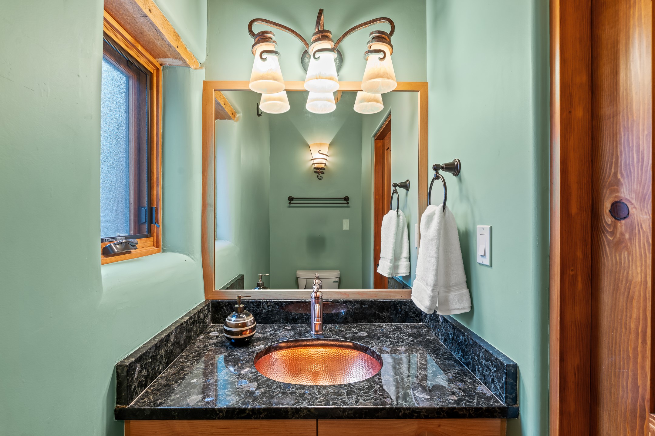 1300 Lejano Lane is a timeless Santa Fe retreat blending classic adobe charm with exceptional indoor-outdoor living. The 2,904-square-foot main residence, constructed of adobe and frame, showcases rich architectural detail and inviting spaces designed for both relaxation and entertaining. The spacious living room features knotty pine wood floors, exposed vigas, and a dramatic kiva fireplace, opening seamlessly to the kitchen. Just beyond, an outdoor deck overlooks the heated pool and hot tub, creating an effortless flow for gatherings. A separate dining room connects to the private guest wing and a light-filled sunroom with brick floors, beamed ceiling, kiva fireplace, and French doors leading to a bricked patio. The primary suite is a true sanctuary, complete with its own Owner's Lounge and kiva fireplace, Douglas fir floors, French doors to an enclosed patio, walk-in closet, double-sink vanity, walk-in shower, and mini-split for year-round comfort. The ensuite guest bedroom also offers a kiva fireplace and French doors to the back patio, near an exterior spiral staircase leading to a rooftop deck. A heated art studio/bonus room with cabinetry, utility sink and private entrance connects to the oversized two-car garage, offering ideal flex space for a gym or creative studio. The beautifully landscaped grounds include brick and natural landscaping, an orchard with apple, pear, apricot, cherry, and a jujube tree, plus two 2,500-gallon water catchment systems irrigating aspens and fruit trees. The heated pool (approx. 15' x 33') ranges from 3.5 to 8.5 feet deep. A charming teepee adds character. A separate all-adobe guesthouse, with it's own private gated entry, features vigas, Saltillo tile, kiva fireplace, full kitchen, dedicated laundry, one bedroom, and a full bath, perfect for guests or rental potential.