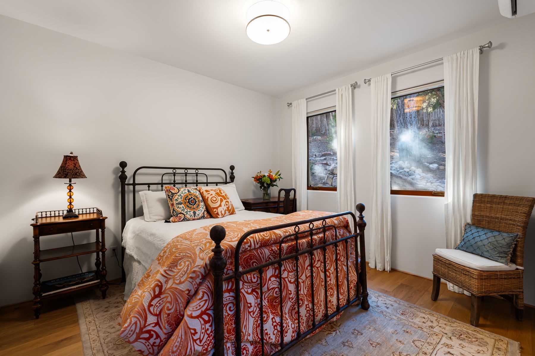 Tranquility and architectural grace define this polished, 3-bedroom, 2.5 bath residence on a quiet cul-de-sac in gated Santa Fe Summit. Step through handcrafted wood doors into the walled front courtyard with fountain and glorious seasonal roses. Inside, robust beams with splendid corbels and a floor-to-ceiling gas kiva add grandeur to the well-proportioned Great Room. The kitchen offers all stainless appliances, including a newer fridge, gas range and double-oven, plus granite counters, a tumbled marble backsplash and an operable window overlooking the backyard's mature pines and lichen-dappled rock work. A private den/office with exterior access introduces the Primary Suite. This true retreat features new wood flooring, soft natural light, and a professionally designed and remodeled en-suite bathroom with dual-vanity, quartzite counters, custom cabinetry, and a spacious walk-in shower. In the well-separated Guest Wing are two additional bedrooms, with newly installed wood floors, and a shared, full bathroom. Recent upgrades include 4 mini-splits for cooling, newer stucco (2022), a 2025 silicone coating on the 2019 roof, and a Navien Heating System (2023). Back yard is fully enclosed. The attached two-car garage is direct access. Enjoy sophisticated living in a refined mountain setting, minutes from the Ski Basin and Santa Fe's historic downtown.