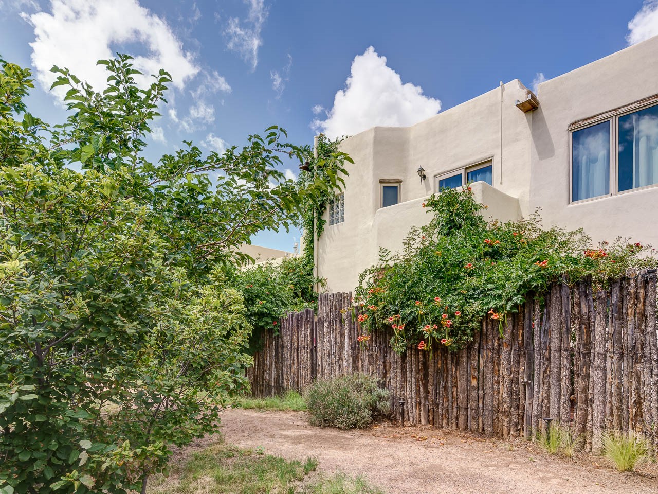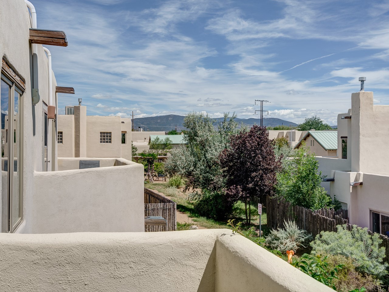 Experience the quintessential Santa Fe lifestyle in this light-filled condo, nestled in the peaceful and centrally located Villa de la Paz neighborhood. Step inside to discover a beautiful, open-concept living space with soaring ceilings, classic Saltillo tile floors, and a stunning kiva fireplace--perfect for cozy evenings. The charming kitchen and dining area flow seamlessly to a private courtyard, offering a tranquil outdoor retreat for al fresco dining or morning coffee. The main level also features a convenient powder room, stacked washer and dryer, and ample storage. Upstairs, the airy loft bedroom is a serene sanctuary, bathed in natural light and featuring a full en-suite bathroom, a generous walk-in closet, and a sweet balcony overlooking the courtyard and open space. This 1,206 sq ft home, built in 2002, embodies the best of Northern New Mexico style with its multi-level design and beamed ceilings. It also includes a private carport and access to the community's well-maintained common areas and trails. With its desirable location, you will be just moments from shopping, dining, and all the cultural amenities Santa Fe has to offer. This is a rare opportunity to own a piece of Santa Fe magic.