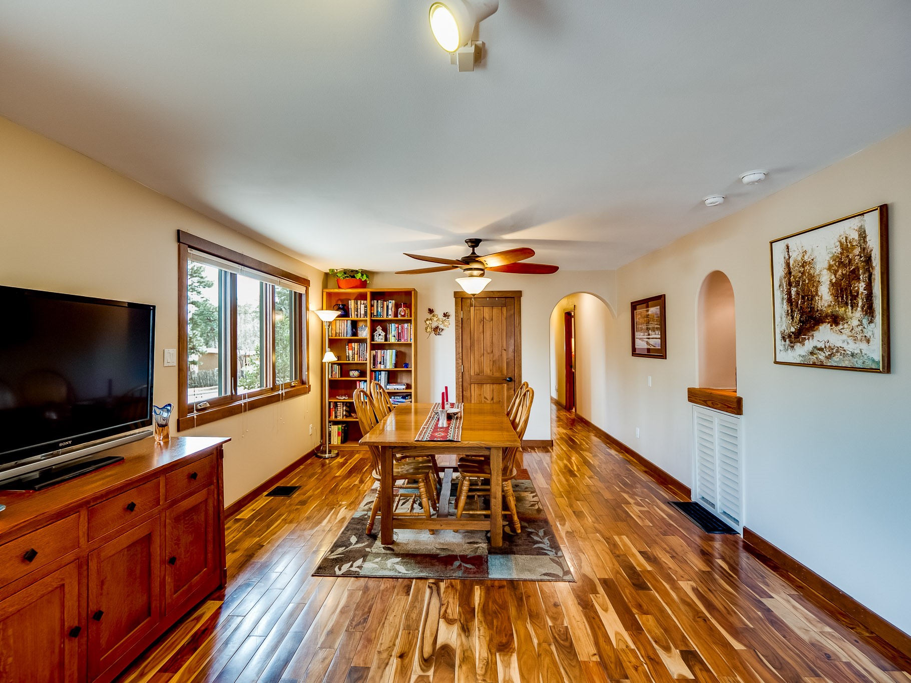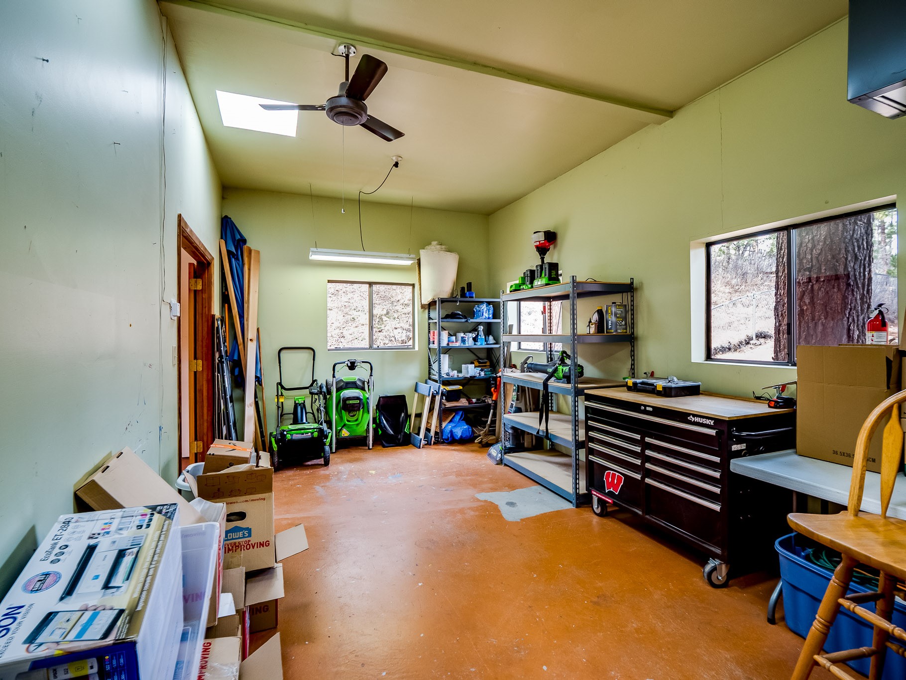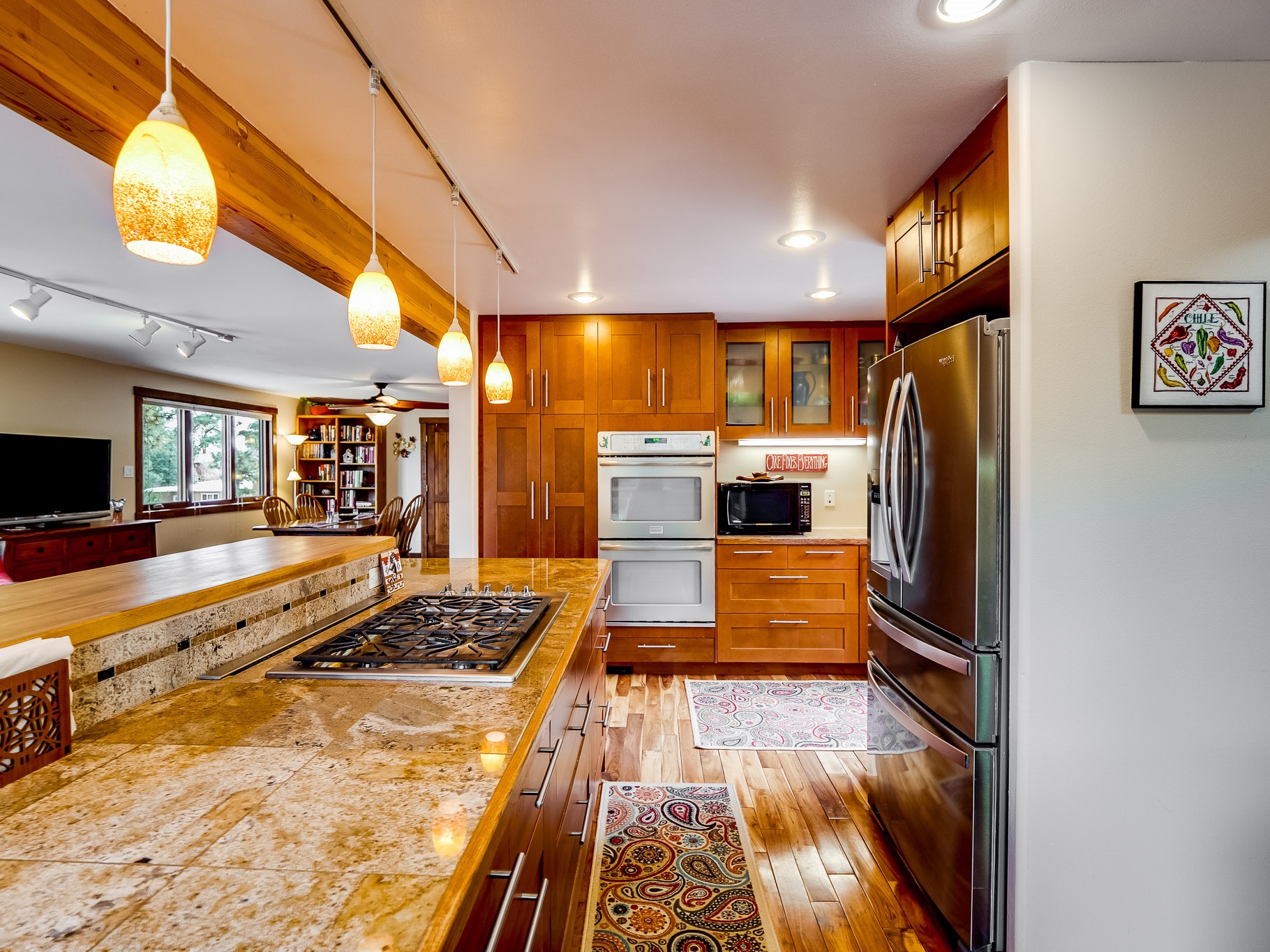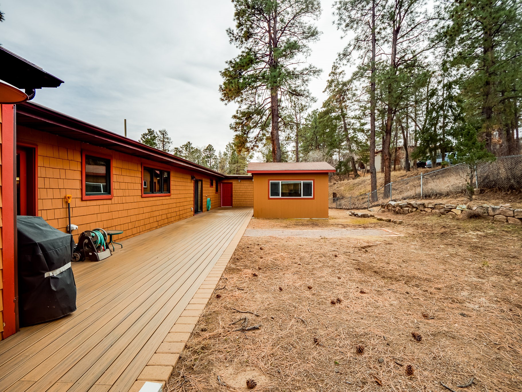 Gorgeous single-story home in N Community! A grass lawn and mature trees guide you to the inviting front porch and into the home's bright entry with tile flooring and convenient access to the laundry room. The spacious living room is warm and inviting, featuring rich wood floors, large windows that fill the space with natural light, and a cozy color palette that flows beautifully throughout the home. With plenty of room for multiple seating areas. Just off the living room is a functional mudroom with access to the two car garage, complete with a dedicated workshop and storage room. Down the hallway are two comfortable guest bedrooms and a stylish full guest bathroom featuring a single sink vanity with tile backsplash and a tiled tub/shower surround. The spacious primary en-suite provides a peaceful retreat with plush carpet flooring and sliding glass doors that open directly to the backyard deck, along with convenient access to the detached studio space, perfect for a home office, creative studio, or private fitness area. The walk-in closet with built-in organizers leads to the spa-inspired bathroom with dual vanities, tile backsplash, and a beautifully tiled walk-in shower. At the back of the home is the true centerpiece--a fabulous chef's kitchen designed for both everyday living and entertaining. Rich wood cabinetry with chrome hardware, granite tile countertops, stainless steel appliances, walk-in pantry and a center island with bar seating and a gas cooktop create a space that is as functional as it is beautiful. The kitchen overlooks a cozy family room with a charming wood-burning fireplace and flows seamlessly into the dining area, making gatherings effortless. Step outside to enjoy the large composite wood deck, perfect for relaxing or hosting while overlooking the expansive tree-lined backyard. With RV parking and close proximity to hiking trails and schools, this wonderful property blends comfort, charm, and convenience in a location you won't want to miss.