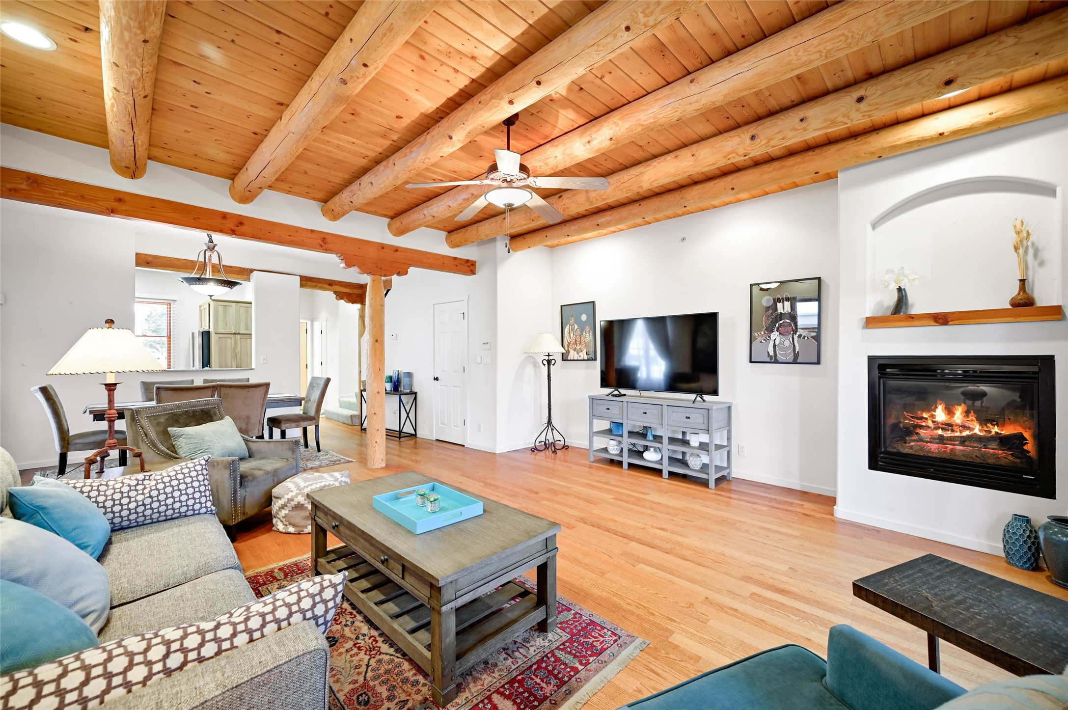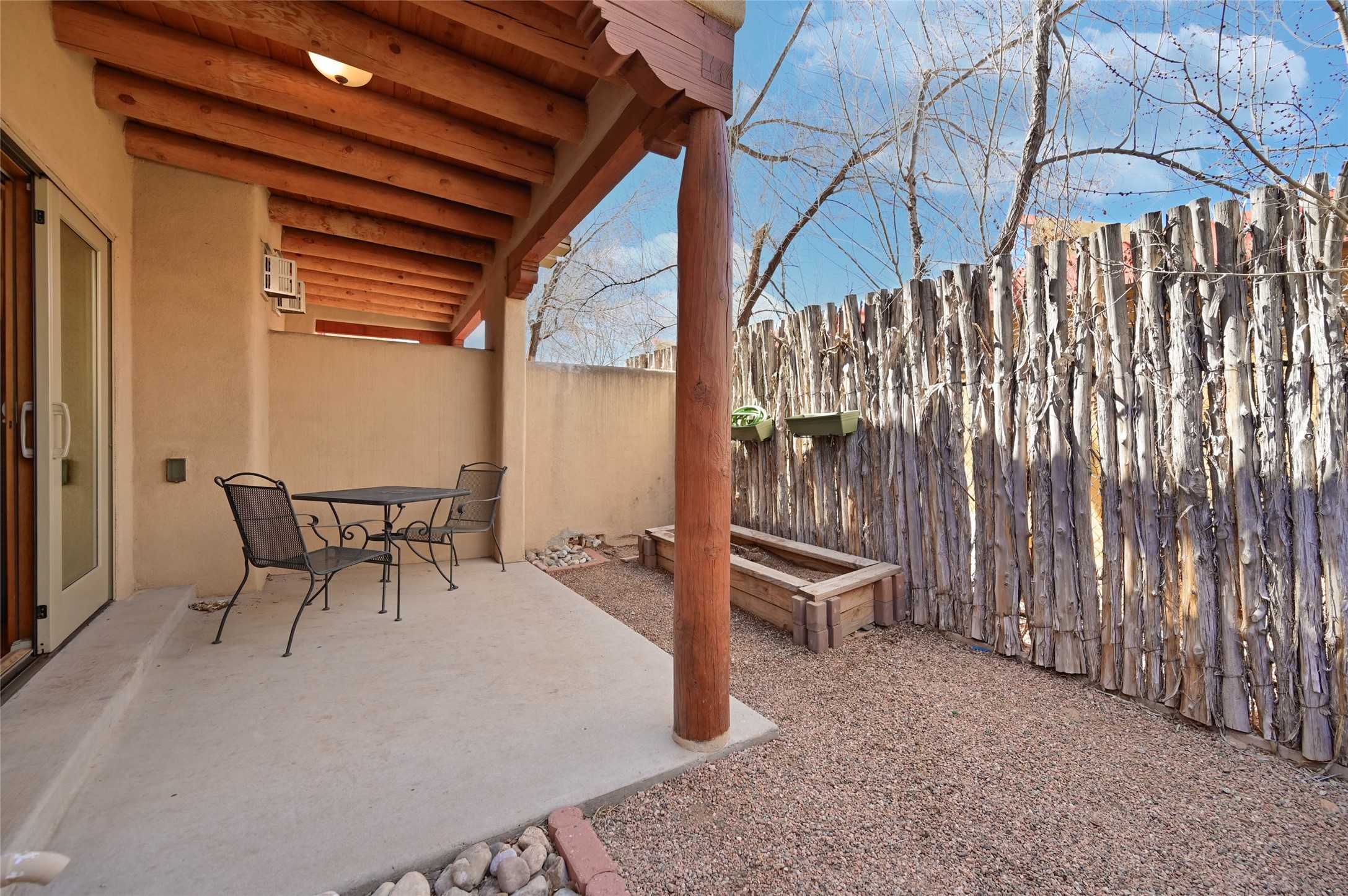 Centrally located condo! This fully furnished end unit features two bright bedrooms and a wonderful private patio. Unit #196 is being offered with all photographed items and would make a great investment property or ready to move in place to live. Tucked back near the amenities, the home has been carefully maintained and features thoughtful design touches including wood vigas, recessed nichos, and ample storage. The gated complex includes mature trees, grass, a community pool, clubhouse, and gym.