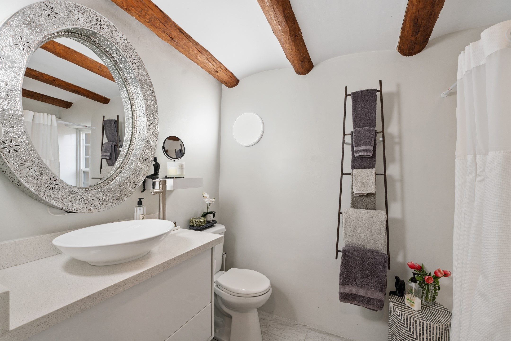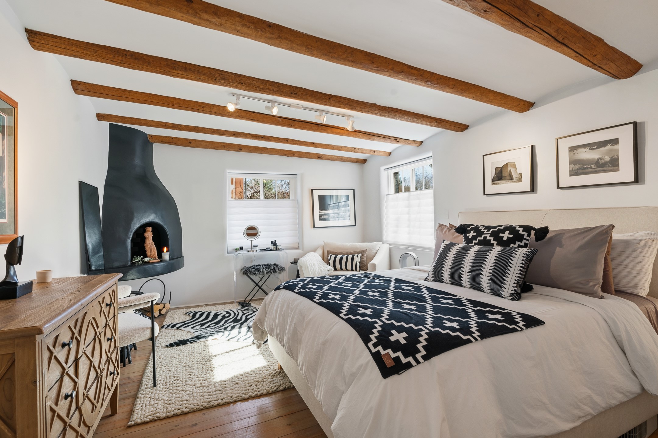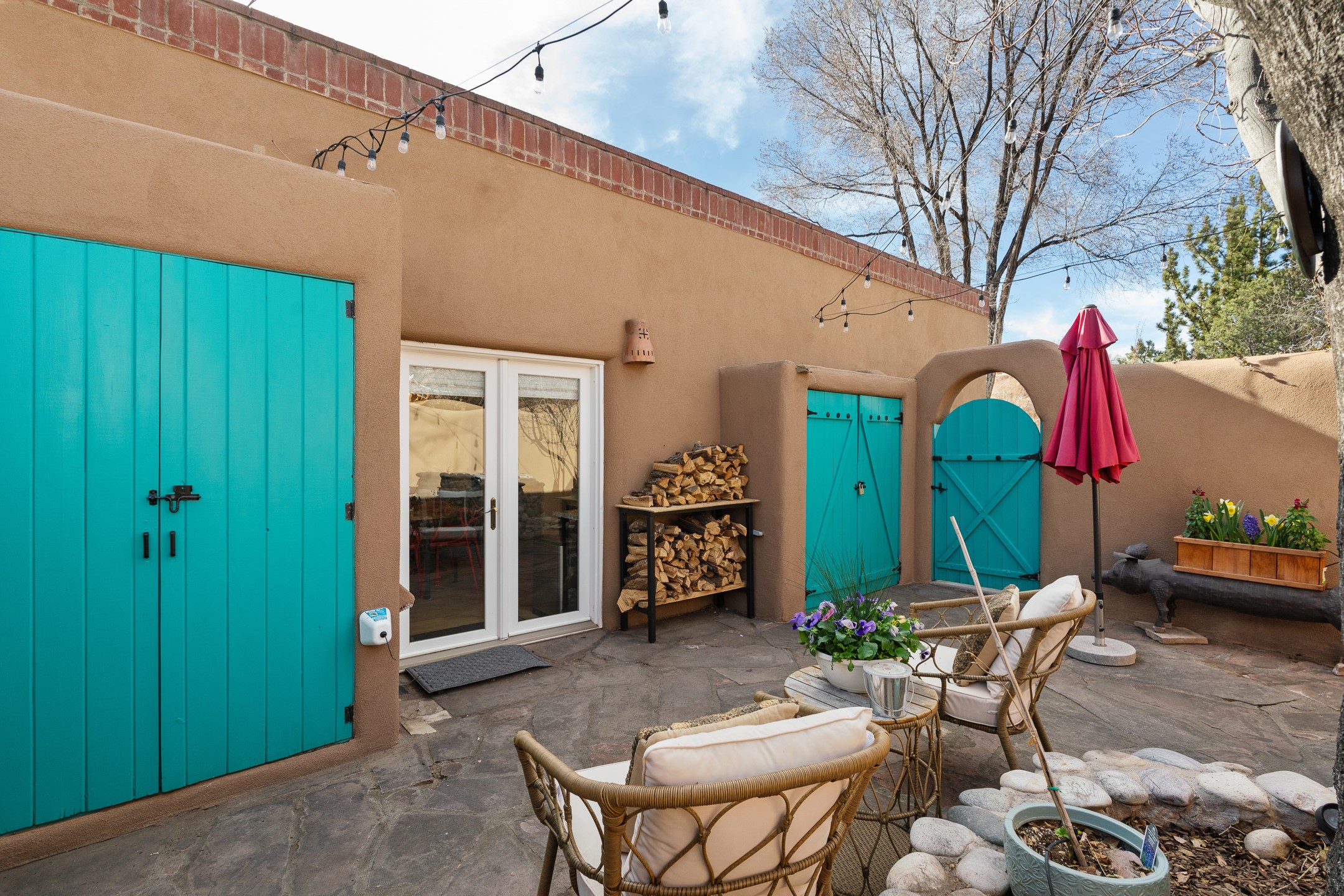 Casita De La Reina! A Perfectly positioned pied--terre in Santa Fe's coveted Historic Eastside, this charming 1-bedroom adobe condo is quite literally a stone's throw from bustling Canyon Road, the Plaza, the River Walk, and Patrick Smith Park. Enjoy effortless access to world-renowned galleries, museums, fine dining, and the vibrant cultural life that defines Santa Fe. This single-level adobe home offers classic Santa Fe style and true lock-and-leave convenience. Step inside to warm, inviting living spaces highlighted by coved ceilings and authentic vigas. Two wood burning fireplaces create a cozy ambiance ideal for relaxing evenings or intimate gatherings. The well-appointed gourmet kitchen features modern appliances, generous counter space, and an eat-in kitchen. French doors open to a spacious private courtyard--perfect for alfresco dining, entertaining guests, or enjoying peaceful mornings with coffee under the iconic New Mexico sky. Framed by river rock walls and flagstone, the courtyard is a secluded oasis designed for both beauty and privacy. Retreat to the serene bedroom, where natural light and thoughtful design elements create a calming, restorative atmosphere. Additional highlights include 2 designated off street parking spaces directly outside Unit #6--an exceptional amenity in this prime Eastside location. Santa Fe's distinctive adobe architecture, rich history, and thriving arts scene make it a city like no other. Immerse yourself in its cultural heritage, savor renowned Southwestern cuisine, and experience the warmth of a community that makes this extraordinary property not just a home, but a lifestyle.