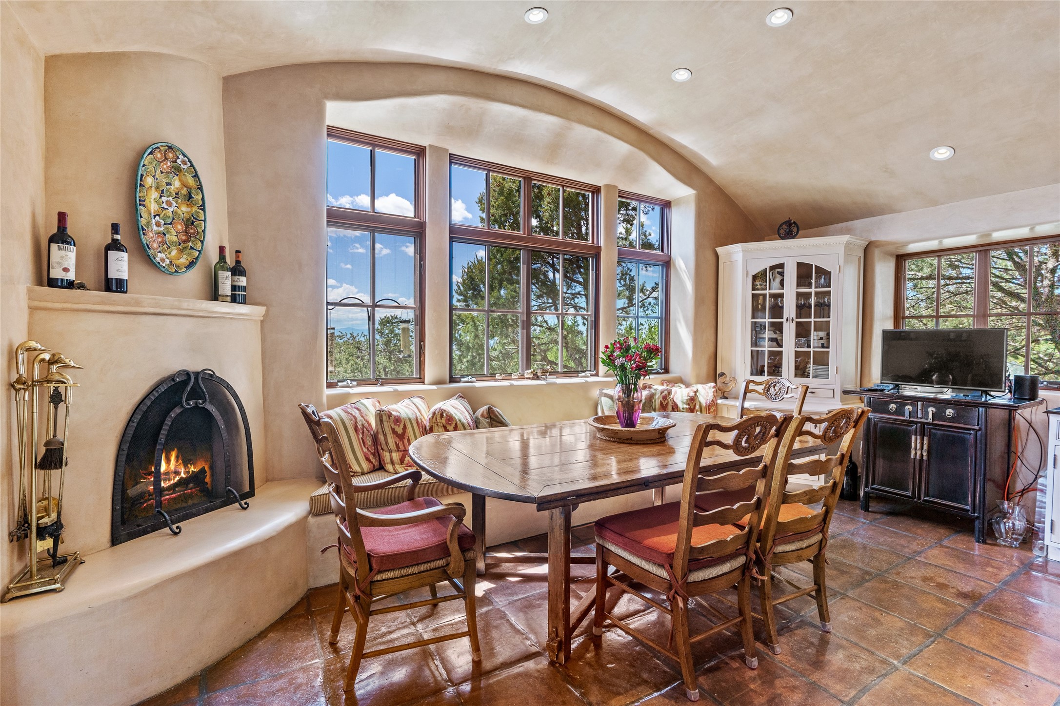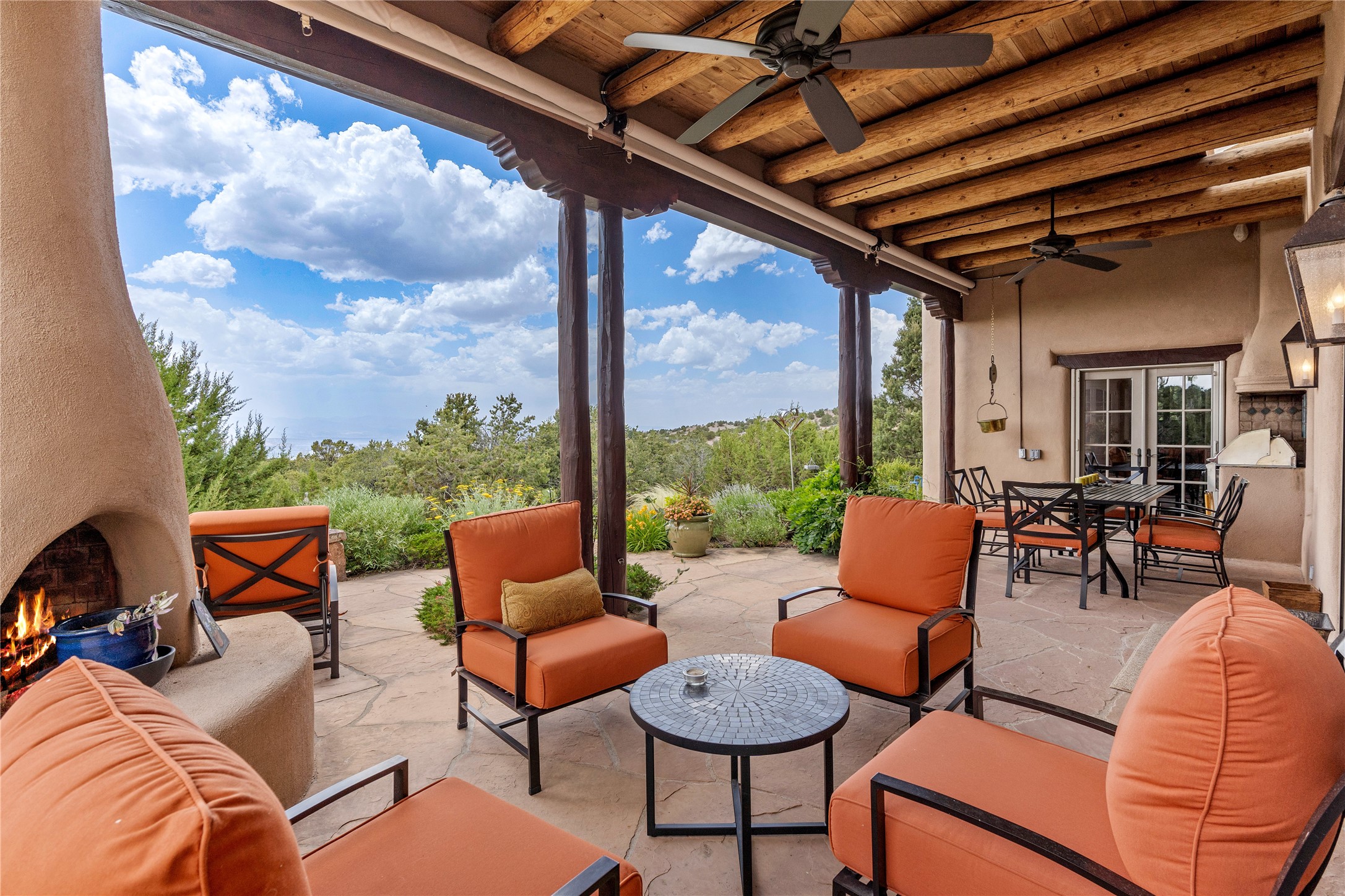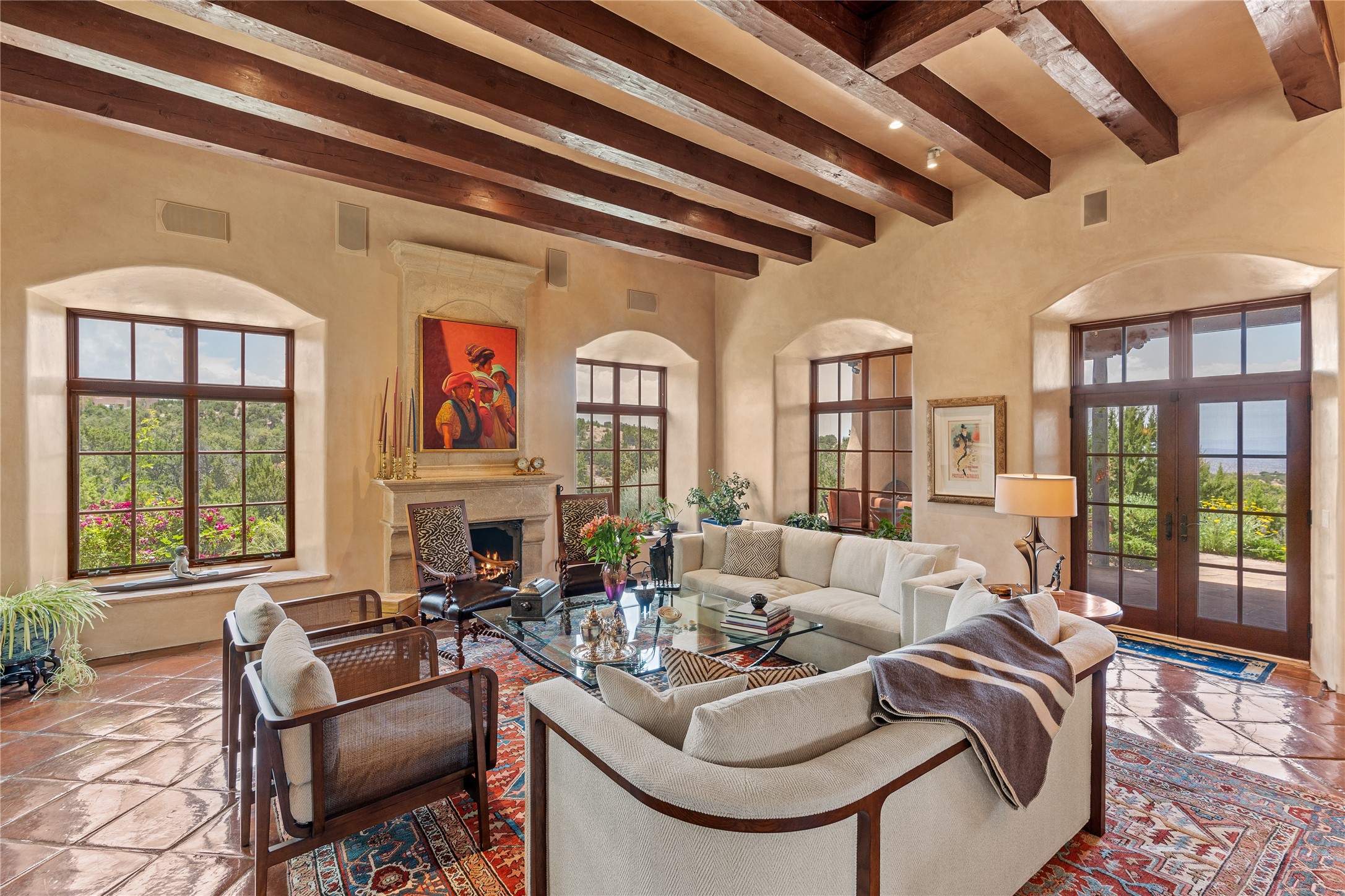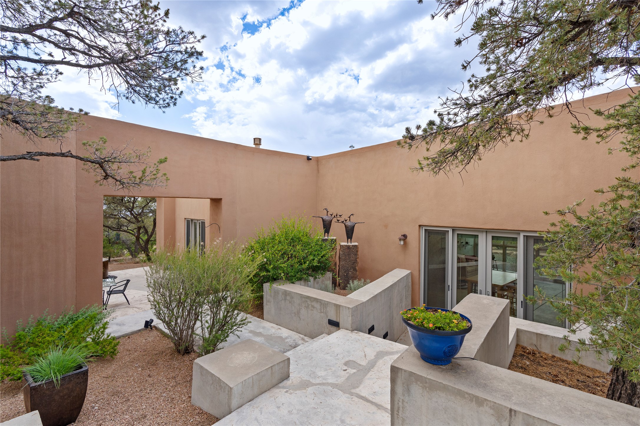 Welcome to a stunning Tesuque area compound in the prestigious gated Los Caminitos subdivision. On over 5 acres with a private well, fantastic Jemez and sunset views from main house built by Sharon Woods in 95'. The kitchen is stunning with doors to the portal with outdoor fireplace. Elegant living/dinning room surrounded on three sides by windows with upper end metal shades. Primary bedroom includes fireplace and access to rear patio. Two guest bedrooms have their own private deck with views of the Sangres. 3 car garage. Separate guest house with bath, as well as a large studio apartment and spacious studio with large north windows and new modern bathroom. Several owner upgrades including new entrance gate and septic field, new drip irrigation and pantry. Community pool and racquet courts. Lavender, roses, aspens, lilacs crab apple and peonies. 15 minutes from the plaza, adjacent to the Four Seasons resort, close to Tesuque Village Market and the world renowned Santa Fe Opera. If privacy, security and the New Mexico landscape is what you are looking for, come see.